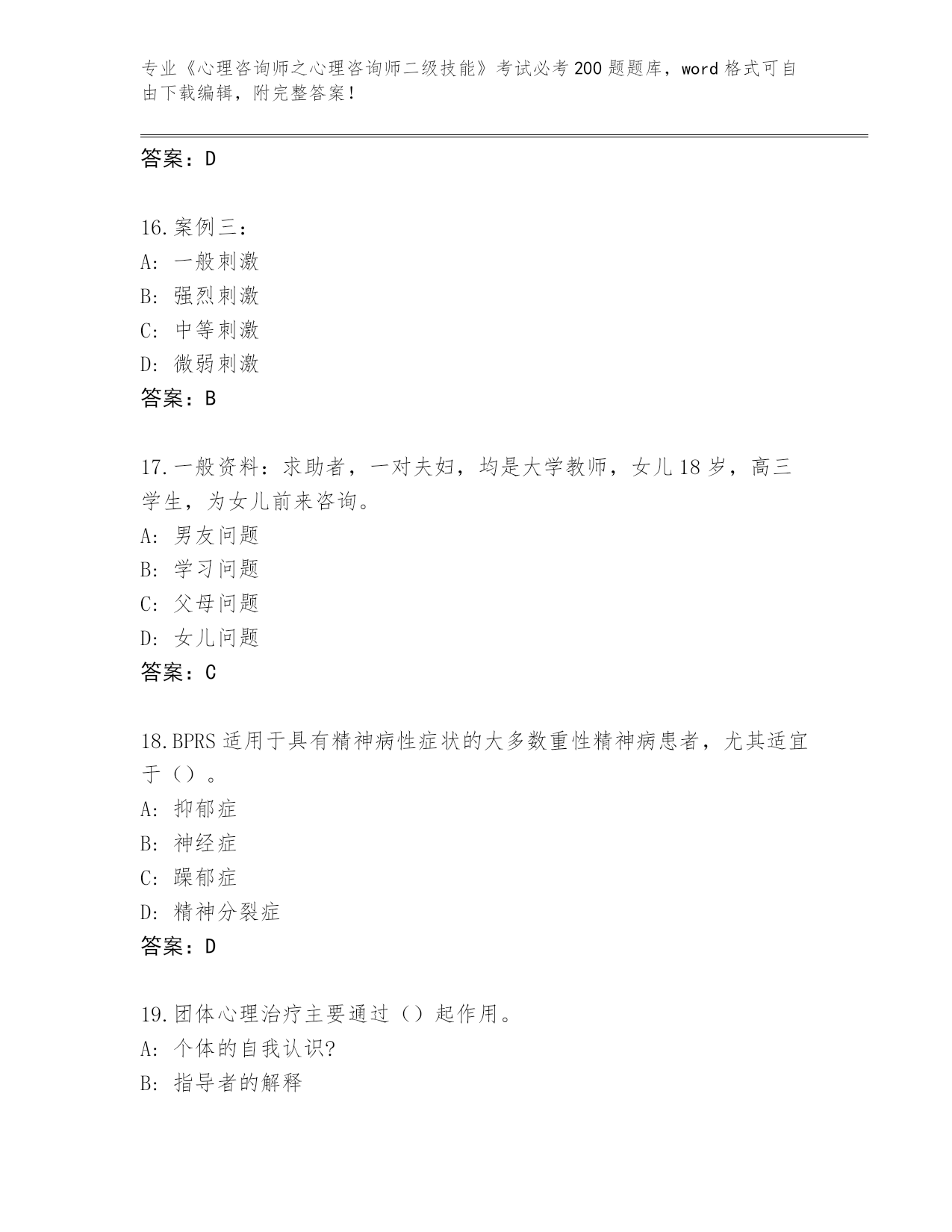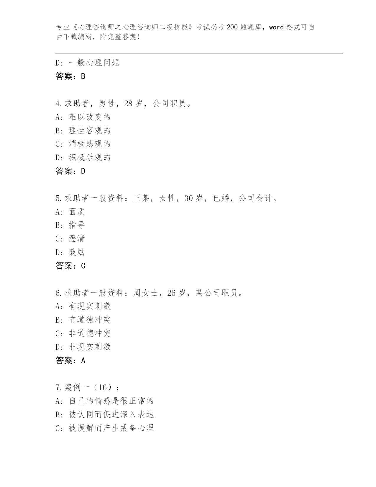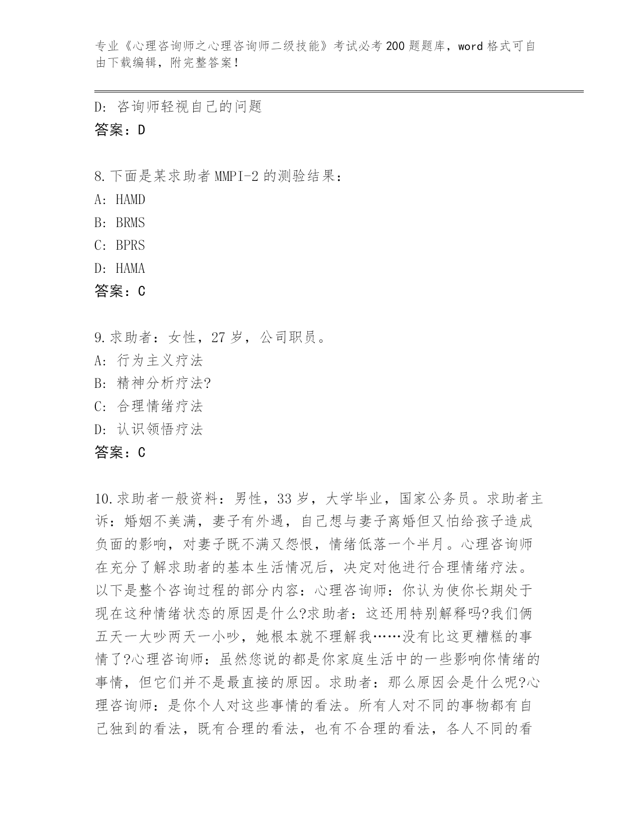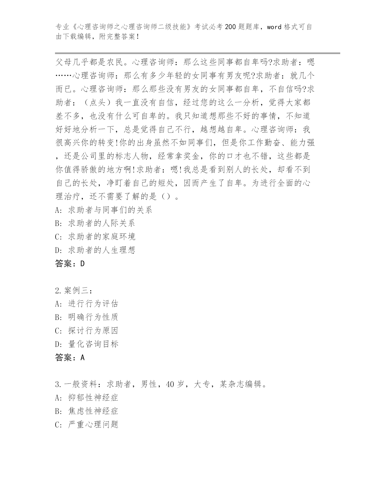 甘肃省2024《心理咨询师之心理咨询师二级技能》考试必考200题王牌题库及参考答案(培优)