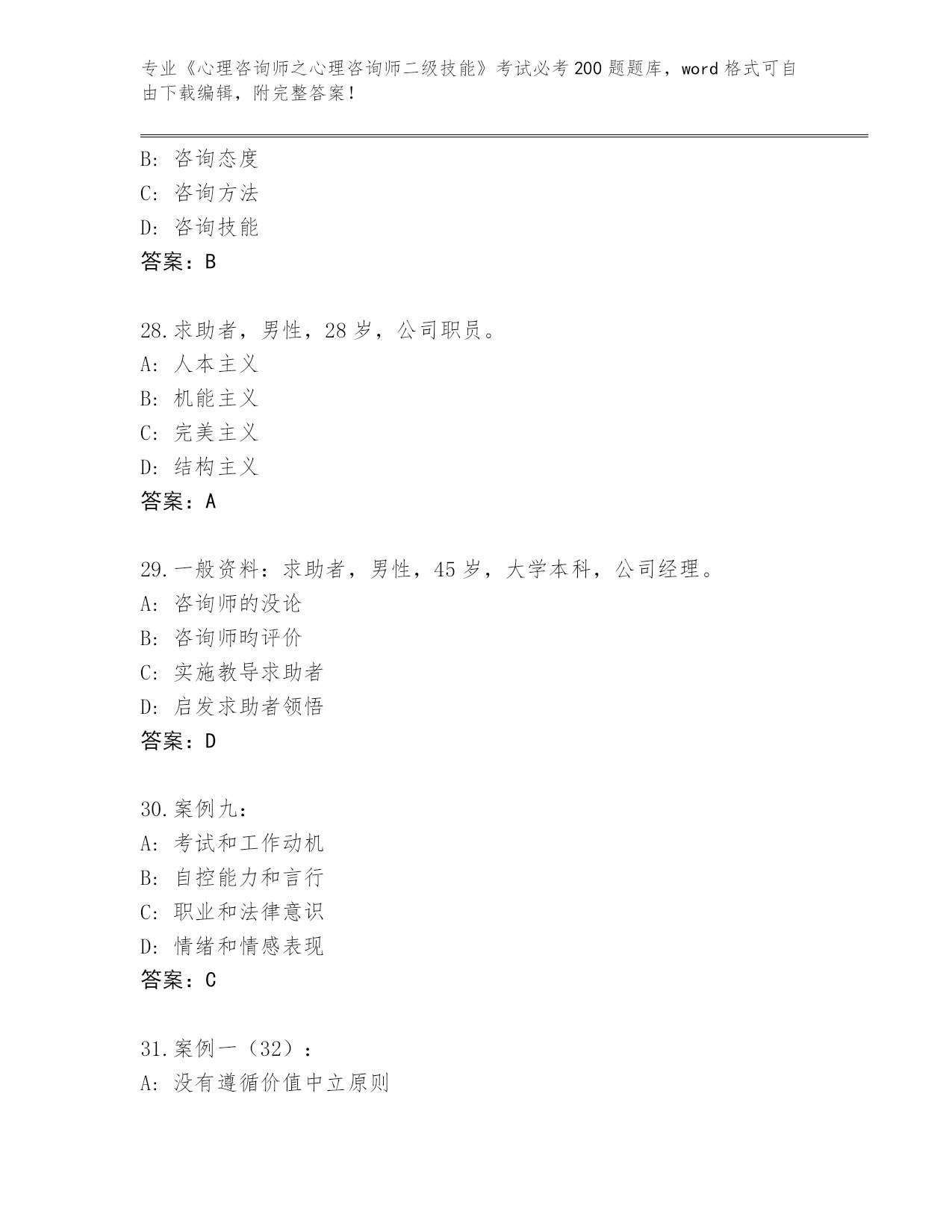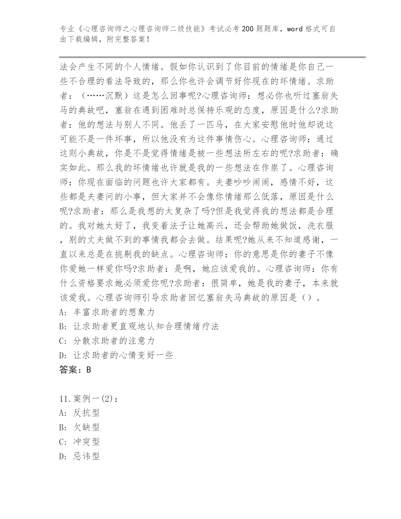 陕西省灞桥区2024《心理咨询师之心理咨询师二级技能》考试必考200题王牌题库【典型题】