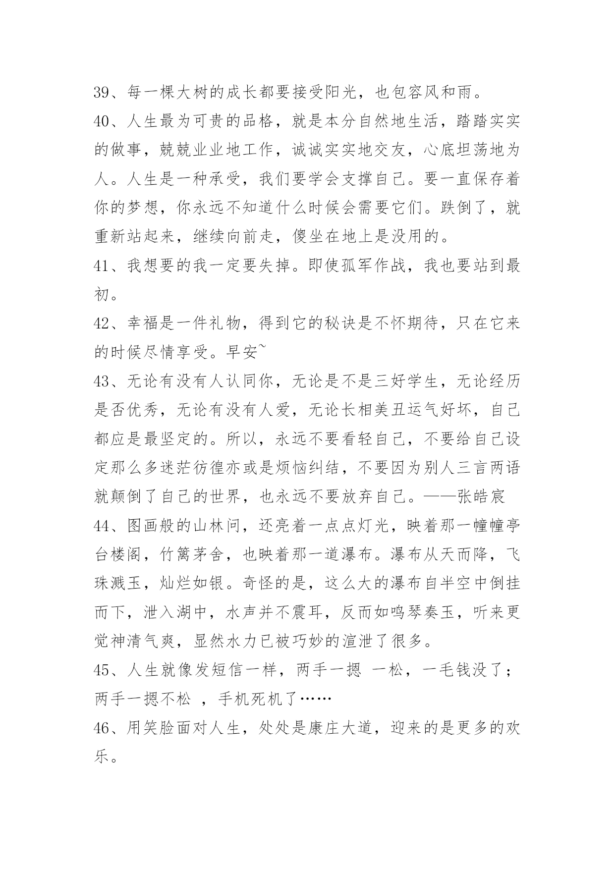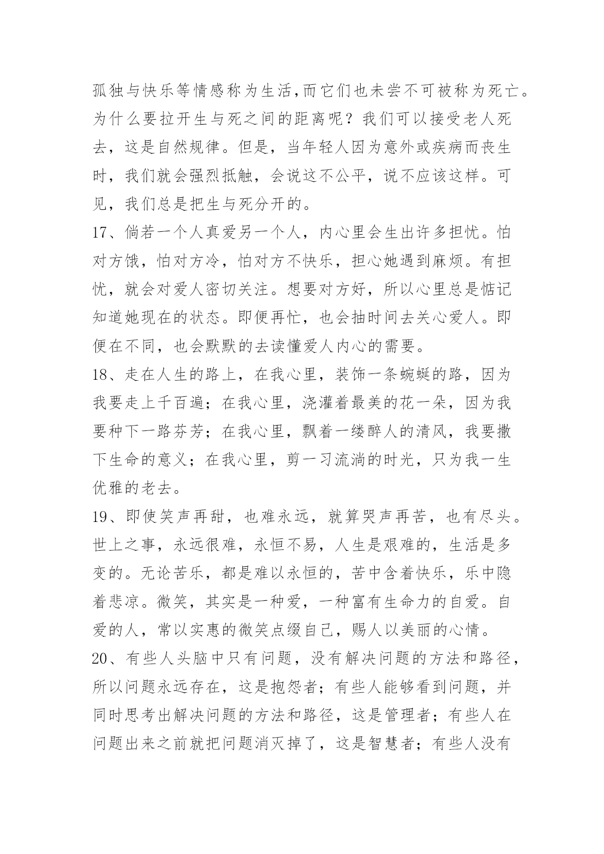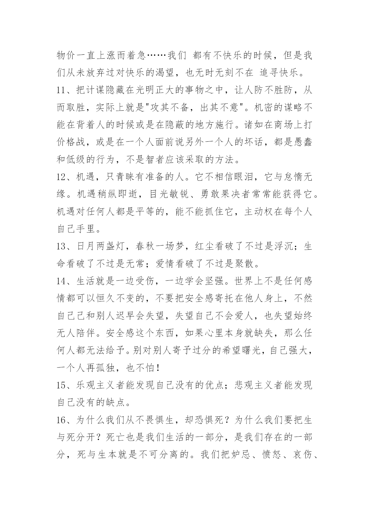 人生的语录摘录50条人生的语录摘录50条我们渴望命运的波澜,到最后才发现,人生最曼妙的风景,竟是内心的淡定与从容;我们期盼外界的认可,到最后才知道,世界是自己的,与他人毫无关系;我们曾如此计较付出的回报,到最后才懂得,一切得到的终将失去,只能空留一抹浮名。以下是小编为大家整理推荐的人生的语录50条,仅供参考,欢迎大家阅读。1、人的一生就像树一样平凡,但又像树一样不平凡。一颗幸运的种子在温暖的阳光下,充足的养分供给下,在土地里慢慢成长。2、一味地固执已见,不自反省,会使你离最终的目标越来越远。3、因我善良,脾气好,能忍,这些都成了我最后埋怨我自己的理由,真可笑。4、命运一直藏匿在我们的思想里。许多人走不出人生各个不同阶段或大或小的阴影,并非因为他们天生的个人条件比别人要差多远,而是因为他们没有想过要将"阴影纸龙"咬破,也没有耐心慢慢地找准一个方向,一步步地向前,直到眼前出现新的洞天。5、认知上也应该有保持一定的差距;我们常常犯的一个错误,就是把自己的想法强加给他人,以为对方的想法与自己一致,实际情况并不如此。每个人都是单独的个体,所接受的教育和所处的生活环境都是不同的。因此,与朋友交往时一定不要自以为是,以为自己所想就是朋友所想,这样做只能适得其反。6、那个我,浑身充满了莫名其妙的动力,生活被有序地分为了看到他的和看不到他的。看不到他的时候,我和我自己的幼稚的梦想一起并肩作战;看到他的时候,我会偷偷地想,他什么时候会从我的梦想变成和我一起并肩作战的人。7、我不流泪,过去的事情就让它过去。人活着要有长度、厚度、宽度和深度。长度是人的寿命,谁也无法决定长短;厚度是人的为人,要敦厚老实;宽度是人的肚量,要有广阔的胸怀;深度是人的能量,社会活动能量、精神的能量。8、感激伤害你的人,因为他磨炼了你的心态;感激绊倒你的人,因为他强化了你的双腿;感激欺骗你的人,因为他增进了你的智慧;感激蔑视你的人,因为他觉醒了你的自尊;感激遗弃你的人,因为他教会了你独立。凡事感激,学会感激,感激一切使你成长的人。9、生活是美好的,充实是一生,颓废是一生,为什么不选择充实呢?快乐是一生,伤心是一生,为什么不选择快乐呢?人生在世,我们要学会笑着面对,无论是苦涩还是无奈,无论是挫折还是失意,笑是一种勇气,一种处世方略,一种生存智慧。拥有微笑的人,能够心胸开阔、目光远大;拥有微笑的人,能够锲而不舍、不屈不挠。10、我们生活在一个焦躁的世界里,为时间流逝而懊悔,为挣不到更多钱而忧虑,为孩子学习成绩不提高而担心,为物价一直上涨而着急……我们都有不快乐的时候,但是我们从未放弃过对快乐的渴望,也无时无刻不在追寻快乐。11、把计谋隐藏在光明正大的事物之中,让人防不胜防,从而取胜,实际上就是"攻其不备,出其不意"。机密的谋略不能在背着人的时候或是在隐蔽的地方施行。诸如在商场上打价格战,或是在一个人面前说另外一个人的坏话,都是愚蠢和低级的行为,不是智者应该采取的方法。12、机遇,只青睐有准备的人。它不相信眼泪,它与怠惰无缘。机遇稍纵即逝,目光敏锐、勇敢果决者常常能获得它。机遇对任何人都是平等的,能不能抓住它,主动权在每个人自己手里。13、日月两盏灯,春秋一场梦,红尘看破了不过是浮沉;生命看破了不过是无常;爱情看破了不过是聚散。14、生活就是一边受伤,一边学会坚强。世界上不是任何感情都可以恒久不变的,不要把安全感寄托在他人身上,不然自己己和别人迟早会失望,失望自己不会爱人,也失望始终无人陪伴。安全感这个东西,如果心里本身就缺失,那么任何人都无法给予。别对别人寄予过分的希望曙光,自己强大,一个人再孤独,也不怕!15、乐观主义者能发现自己没有的优点;悲观主义者能发现自己没有的缺点。16、为什么我们从不畏惧生,却恐惧死?为什么我们要把生与死分开?死亡也是我们生活的一部分,是我们存在的一部分,死与生本就是不可分离的。我们把妒忌、愤怒、哀伤、孤独与快乐等情感称为生活,而它们也未尝不可被称为死亡。为什么要拉开生与死之间的距离呢?我们可以接受老人死去,这是自然规律。但是,当年轻人因为意外或疾病而丧生时,我们就会强烈抵触,会说这不公平,说不应该这样。可见,我们总是把生与死分开的。17、倘若一个人真爱另一个人,内心里会生出许多担忧。怕对方饿,怕对方冷,怕对方不快乐,担心她遇到麻烦。有担忧,就会对爱人密切关注。想要对方好,所以心里总是惦记知道她现在的状态。即便再忙,也会抽时间去关心爱人。即便在不同,也会默默的去读懂爱人内心的需要。18、走在人生的路上,在我心里,装饰一条蜿蜒的路,因为我要走上千百遍;在我心里,浇灌着最美的花一朵,因为我要种下一路芬芳;在我心里,飘着一缕醉人的清风,我要撒下生命的意义;在我心里,剪一习流淌的时光,只为我一生优雅的老去。19、即使笑声再甜,也难永远,就算哭声再苦,也有尽