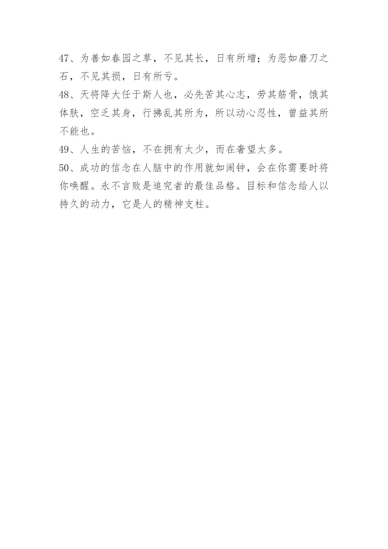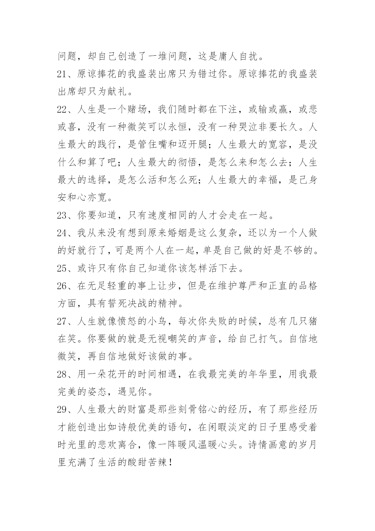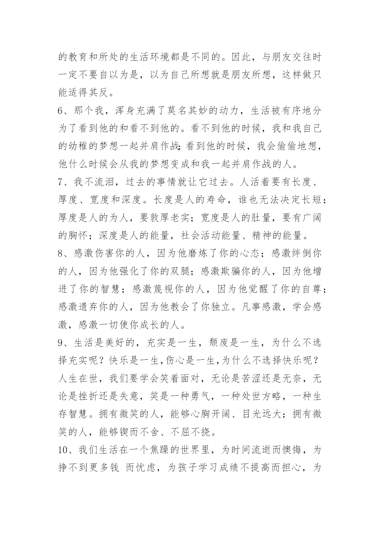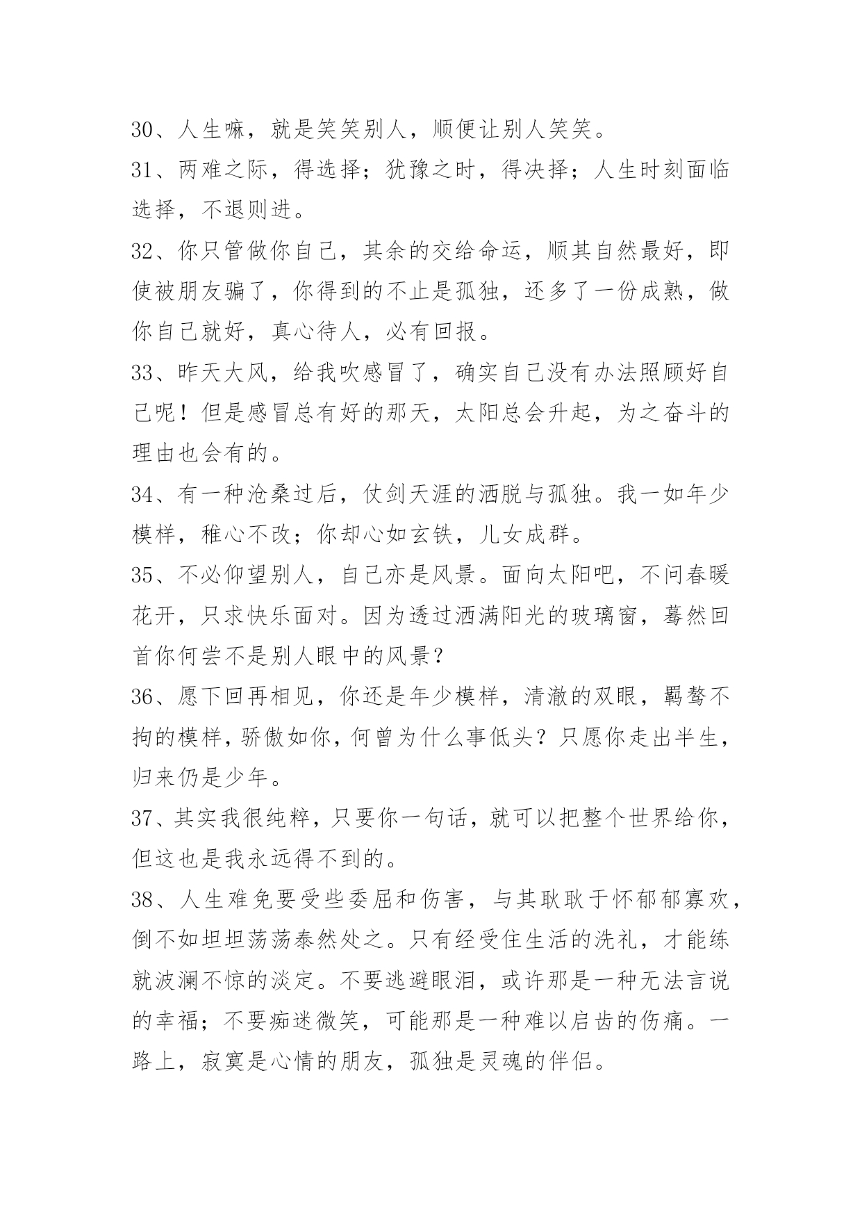 人生的语录摘录50条人生的语录摘录50条我们渴望命运的波澜,到最后才发现,人生最曼妙的风景,竟是内心的淡定与从容;我们期盼外界的认可,到最后才知道,世界是自己的,与他人毫无关系;我们曾如此计较付出的回报,到最后才懂得,一切得到的终将失去,只能空留一抹浮名。以下是小编为大家整理推荐的人生的语录50条,仅供参考,欢迎大家阅读。1、人的一生就像树一样平凡,但又像树一样不平凡。一颗幸运的种子在温暖的阳光下,充足的养分供给下,在土地里慢慢成长。2、一味地固执已见,不自反省,会使你离最终的目标越来越远。3、因我善良,脾气好,能忍,这些都成了我最后埋怨我自己的理由,真可笑。4、命运一直藏匿在我们的思想里。许多人走不出人生各个不同阶段或大或小的阴影,并非因为他们天生的个人条件比别人要差多远,而是因为他们没有想过要将"阴影纸龙"咬破,也没有耐心慢慢地找准一个方向,一步步地向前,直到眼前出现新的洞天。5、认知上也应该有保持一定的差距;我们常常犯的一个错误,就是把自己的想法强加给他人,以为对方的想法与自己一致,实际情况并不如此。每个人都是单独的个体,所接受的教育和所处的生活环境都是不同的。因此,与朋友交往时一定不要自以为是,以为自己所想就是朋友所想,这样做只能适得其反。6、那个我,浑身充满了莫名其妙的动力,生活被有序地分为了看到他的和看不到他的。看不到他的时候,我和我自己的幼稚的梦想一起并肩作战;看到他的时候,我会偷偷地想,他什么时候会从我的梦想变成和我一起并肩作战的人。7、我不流泪,过去的事情就让它过去。人活着要有长度、厚度、宽度和深度。长度是人的寿命,谁也无法决定长短;厚度是人的为人,要敦厚老实;宽度是人的肚量,要有广阔的胸怀;深度是人的能量,社会活动能量、精神的能量。8、感激伤害你的人,因为他磨炼了你的心态;感激绊倒你的人,因为他强化了你的双腿;感激欺骗你的人,因为他增进了你的智慧;感激蔑视你的人,因为他觉醒了你的自尊;感激遗弃你的人,因为他教会了你独立。凡事感激,学会感激,感激一切使你成长的人。9、生活是美好的,充实是一生,颓废是一生,为什么不选择充实呢?快乐是一生,伤心是一生,为什么不选择快乐呢?人生在世,我们要学会笑着面对,无论是苦涩还是无奈,无论是挫折还是失意,笑是一种勇气,一种处世方略,一种生存智慧。拥有微笑的人,能够心胸开阔、目光远大;拥有微笑的人,能够锲而不舍、不屈不挠。10、我们生活在一个焦躁的世界里,为时间流逝而懊悔,为挣不到更多钱而忧虑,为孩子学习成绩不提高而担心,为物价一直上涨而着急……我们都有不快乐的时候,但是我们从未放弃过对快乐的渴望,也无时无刻不在追寻快乐。11、把计谋隐藏在光明正大的事物之中,让人防不胜防,从而取胜,实际上就是"攻其不备,出其不意"。机密的谋略不能在背着人的时候或是在隐蔽的地方施行。诸如在商场上打价格战,或是在一个人面前说另外一个人的坏话,都是愚蠢和低级的行为,不是智者应该采取的方法。12、机遇,只青睐有准备的人。它不相信眼泪,它与怠惰无缘。机遇稍纵即逝,目光敏锐、勇敢果决者常常能获得它。机遇对任何人都是平等的,能不能抓住它,主动权在每个人自己手里。13、日月两盏灯,春秋一场梦,红尘看破了不过是浮沉;生命看破了不过是无常;爱情看破了不过是聚散。14、生活就是一边受伤,一边学会坚强。世界上不是任何感情都可以恒久不变的,不要把安全感寄托在他人身上,不然自己己和别人迟早会失望,失望自己不会爱人,也失望始终无人陪伴。安全感这个东西,如果心里本身就缺失,那么任何人都无法给予。别对别人寄予过分的希望曙光,自己强大,一个人再孤独,也不怕!15、乐观主义者能发现自己没有的优点;悲观主义者能发现自己没有的缺点。16、为什么我们从不畏惧生,却恐惧死?为什么我们要把生与死分开?死亡也是我们生活的一部分,是我们存在的一部分,死与生本就是不可分离的。我们把妒忌、愤怒、哀伤、孤独与快乐等情感称为生活,而它们也未尝不可被称为死亡。为什么要拉开生与死之间的距离呢?我们可以接受老人死去,这是自然规律。但是,当年轻人因为意外或疾病而丧生时,我们就会强烈抵触,会说这不公平,说不应该这样。可见,我们总是把生与死分开的。17、倘若一个人真爱另一个人,内心里会生出许多担忧。怕对方饿,怕对方冷,怕对方不快乐,担心她遇到麻烦。有担忧,就会对爱人密切关注。想要对方好,所以心里总是惦记知道她现在的状态。即便再忙,也会抽时间去关心爱人。即便在不同,也会默默的去读懂爱人内心的需要。18、走在人生的路上,在我心里,装饰一条蜿蜒的路,因为我要走上千百遍;在我心里,浇灌着最美的花一朵,因为我要种下一路芬芳;在我心里,飘着一缕醉人的清风,我要撒下生命的意义;在我心里,剪一习流淌的时光,只为我一生优雅的老去。19、即使笑声再甜,也难永远,就算哭声再苦,也有尽