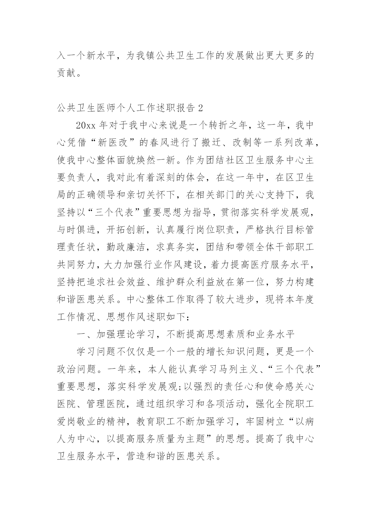 公共卫生医师个人工作述职报告公共卫生医师个人工作述职报告范文日子在弹指一挥间就毫无声息的流逝,回顾这段时间中有什么值得分享的经验吗?为此要写好述职报告了。为了让您在写述职报告时更加简单方便,以下是小编帮大家整理的公共卫生医师个人工作述职报告范文,希望对大家有所帮助。公共卫生医师个人工作述职报告120xx年即将结束,转眼我担任公共卫生工作4年过去了,在这几年工作中,感谢上级主管部门及院领导对我工作的支持、信任,感谢同事同仁们对我工作的帮助和指教,在院领导及同事们共同努力、团结协作下,我顺利完成2015年度各项公共卫生工作,现我对2015年工作总结如下:一、思想政治及职业道德。能够认真贯彻党的基本路线方针政策,认真履行党的群众路线教育实践活动,努力实现我的梦--健康梦。认真学习《基本公共卫生服务规范》,爱岗敬业,具有强烈的责任心和事业心,积极主动学习各项专业知识,工作态度端正,认真负责。二、专业知识、工作能力和工作成绩。1、专业知识。担任公共卫生工作后,继续认真学习理论知识,但理论知识还远远不能让我做好本职工作,因此,在学习理论知识的同时,我还认真学习业务相关知识和文件精神,积极参加各级培训,遇到问题虚心向领导和同事请教。通过向领导请教、向同事学习、自己摸索实践,在很短的时间内熟悉了相关工作,明确了工作的程序、方向,提高了工作能力,在具体的工作中形成了一个清晰的工作思路,能够顺利的开展工作并熟练圆满地完成本职工作。2、工作能力和工作成绩。自担任公共卫生工作以来,我从事计划免疫、慢病管理(高血压、糖尿病、重精病人)、卫生协管、健康教育、传染病及突发公共卫生事件处置与报告、老年人健康管理、0-6岁儿童健康管理等工作。对于各项工作均能熟练掌握工作程序及方法,认真贯彻落实指导村医及责任医生开展相关工作。三、工作态度和勤奋敬业方面。本人以千方百计保卫人们健康为己任。我希望所有人都能远离疾苦,不论在工作中还是在生活当中,我都向周围的人宣传健康生活方式,耐心的帮他们了解疾病,从而从源头上减少疾病的`发生。热爱自己的本职工作,能够正确认真的对待每一项工作,工作投入,热心为大家服务,认真遵守劳动纪律,保证按时出勤,出勤率高,有效利用工作时间,坚守岗位,需要加班完成工作按时加班加点,保证工作能按时完成。总结4年的工作,尽管有了一定的进步和成绩,但由于工作繁杂,还有很多方面还存在着不足。个别工作做的还不够完善,在今后的工作中有待改进。在今后的工作中,我将认真学习相关专业知识,努力使思想觉悟和工作效率全面进入一个新水平,为我镇公共卫生工作的发展做出更大更多的贡献。公共卫生医师个人工作述职报告220xx年对于我中心来说是一个转折之年,这一年,我中心凭借“新医改”的春风进行了搬迁、改制等一系列改革,使我中心整体面貌焕然一新。作为团结社区卫生服务中心主要负责人,我对此有着深刻的体会,在这一年中,在区卫生局的正确领导和亲切关怀下,在相关部门的关心支持下,我坚持以“三个代表”重要思想为指导,贯彻落实科学发展观,与时俱进,开拓创新,认真履行岗位职责,严格执行目标管理责任状,勤政廉洁,求真务实,团结和带领全体干部职工共同努力,大力加强行业作风建设,着力提高医疗服务水平,坚持把追求社会效益、维护群众利益放在第一位,努力构建和谐医患关系。中心整体工作取得了较大进步,现将本年度工作情况、思想作风述职如下:一、加强理论学习,不断提高思想素质和业务水平学习问题不仅仅是一个一般的增长知识问题,更是一个政治问题。一年来,本人能认真学习马列主义、“三个代表”重要思想,落实科学发展观;以强烈的责任心和使命感关心医院、管理医院,通过组织学习和各项活动,强化全院职工爱岗敬业的精神,教育职工不断加强学习,牢固树立“以病人为中心,以提高服务质量为主题”的思想。提高了我中心卫生服务水平,营造和谐的医患关系。二、认真履行职责,努力完成各项工作任务(一)认真做好社区卫生服务工作团结社区共有居民32587人,9752户,服务面积4平方公里,xx年,我们不断完善社区卫生“九项公共卫生服务”功能,积极探索,精心筹划,根据辖区人口居住区域组建了6组片医团队,分别负责辖区居民的健康档案建立、慢病管理、入户随访等项工作,采取定期或不定期的下社区活动方式,耐心细致地为辖区居民解疑答惑,变医患关系为朋友关系,工作中我们融入三级预防的理念。通过上述工作,提高辖区居民的自我保护意识,提高疾病的检出率,降低疾病的发病率和并发症及致残率。切实做到“点对点、零距离、全方位”的服务。规范传染病疫情报告,杜绝了漏报现象,坚持门诊登记和疫情自查制度;建立健全了疫情报告制度,并随时进行网络直报工作,使服务中心的传染病工作的登记、报告及时,共上报传染病11例,准确率达100%。(二)认真做好医疗卫生服务xx年是我中心发展的一年,随
