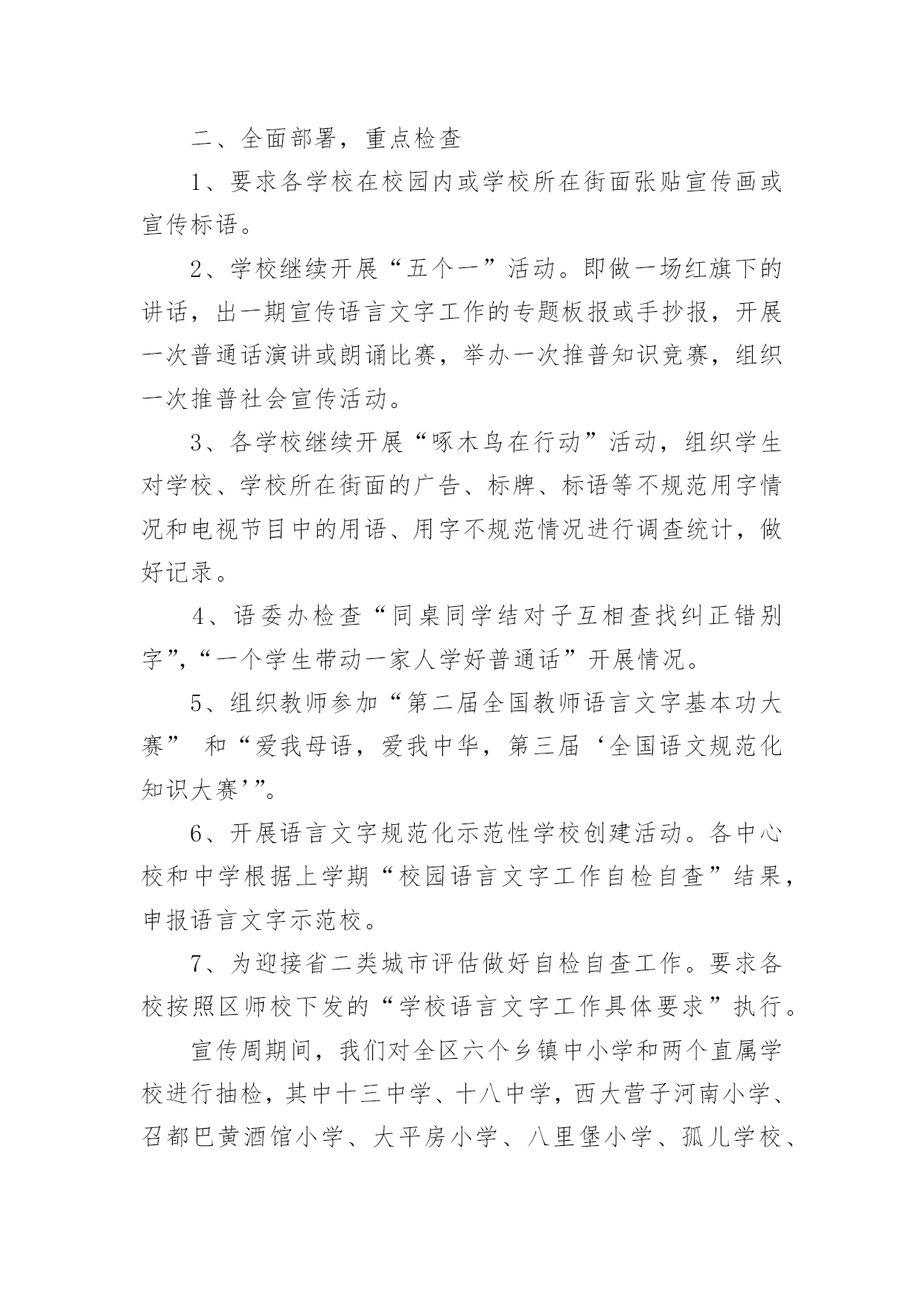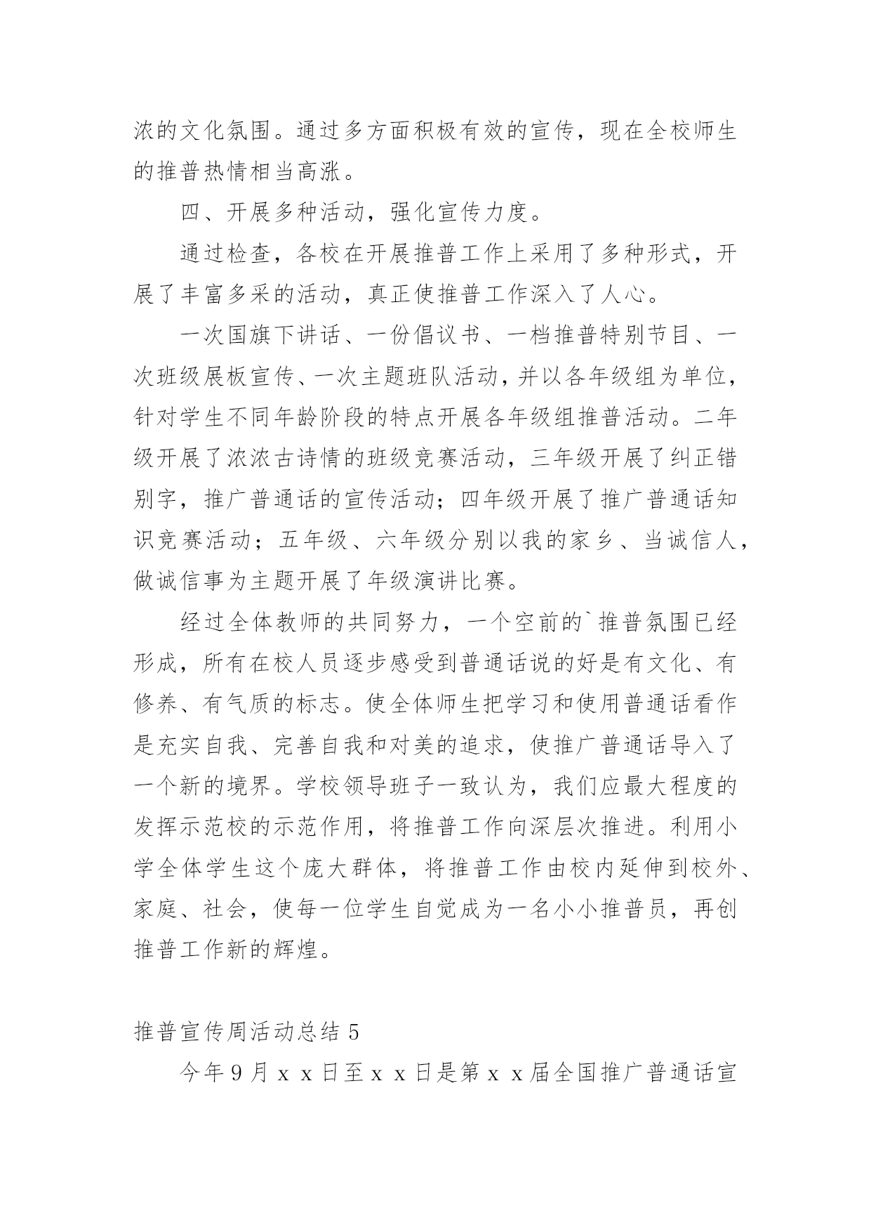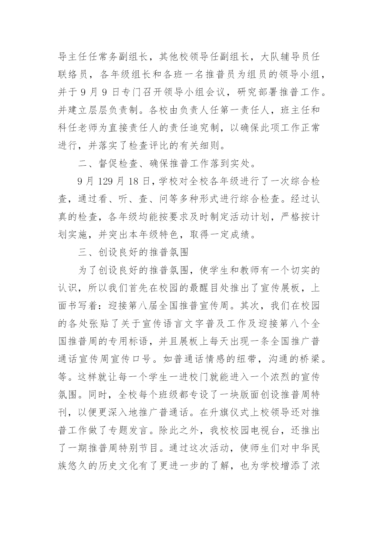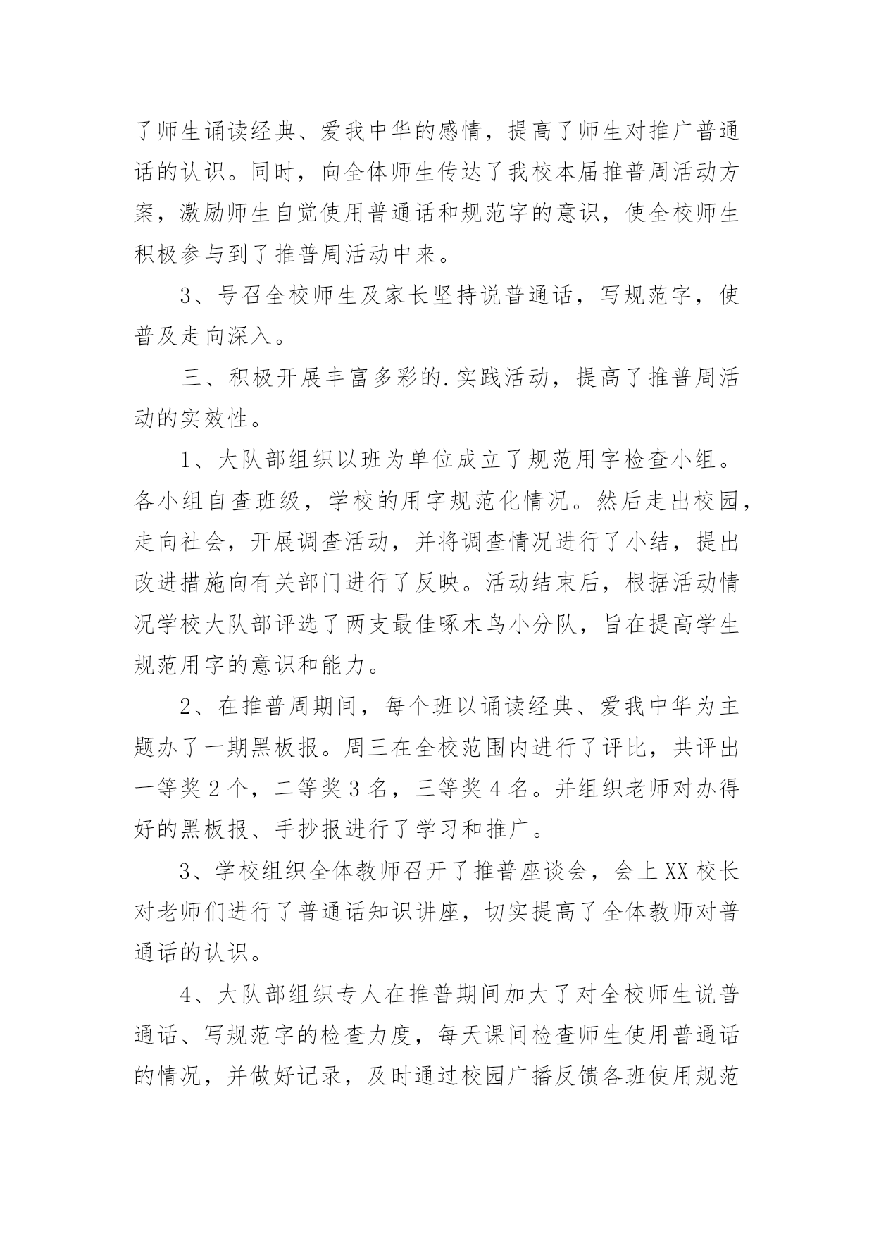 推普宣传周活动总结总结是事后对某一阶段的学习或工作情况作加以回顾检查并分析评价的书面材料,他能够提升我们的书面表达能力,快快来写一份总结吧。如何把总结做到重点突出呢?以下是小编整理的推普宣传周活动总结,仅供参考,欢迎大家阅读。推普宣传周活动总结1今年的全国推普宣传周,我校结合自身实际情况,开展了丰富多彩的推普活动,使我校的语言文字工作再上一个新的台阶。一、成立领导小组,责任分工到人。为使推普周活动落到实处,我校成立了推普周领导小组,由校长XX任组长,负责推普周工作指挥;教导主任XX为副组长,负责推普周工作总策划;教导主任和少先队大队部负责推普周活动方案的制定,具体负责推普周活动的开展。二、加大宣传力度,营造推普氛围。1、自9月13日开始,学校在校园宣传栏内张贴了第XX届推普周的宣传主题和宣传画等,进行积极有效的宣传,在校园内张贴宣传口号,并在校内悬挂语言文字宣传横幅,扩大推普周的宣传力度。2、学校利用9月13日周一国旗下讲话时间,对全体师生进行了以推广普通话为主题的宣传教育活动,进一步增进了师生诵读经典、爱我中华的感情,提高了师生对推广普通话的认识。同时,向全体师生传达了我校本届推普周活动方案,激励师生自觉使用普通话和规范字的意识,使全校师生积极参与到了推普周活动中来。3、号召全校师生及家长坚持说普通话,写规范字,使普及走向深入。三、积极开展丰富多彩的.实践活动,提高了推普周活动的实效性。1、大队部组织以班为单位成立了规范用字检查小组。各小组自查班级,学校的用字规范化情况。然后走出校园,走向社会,开展调查活动,并将调查情况进行了小结,提出改进措施向有关部门进行了反映。活动结束后,根据活动情况学校大队部评选了两支最佳啄木鸟小分队,旨在提高学生规范用字的意识和能力。2、在推普周期间,每个班以诵读经典、爱我中华为主题办了一期黑板报。周三在全校范围内进行了评比,共评出一等奖2个,二等奖3名,三等奖4名。并组织老师对办得好的黑板报、手抄报进行了学习和推广。3、学校组织全体教师召开了推普座谈会,会上XX校长对老师们进行了普通话知识讲座,切实提高了全体教师对普通话的认识。4、大队部组织专人在推普期间加大了对全校师生说普通话、写规范字的检查力度,每天课间检查师生使用普通话的情况,并做好记录,及时通过校园广播反馈各班使用规范字和普通话情况,另外,学校还将学生说普通话、写规范字情况作为评选优秀学生和优秀班集体的基本重要条件。在学校师生的共同努力、共同配合下,通过写、诵、宣、评、查等方式,推普周活动圆满地取得了成功。说准普通话,写好规范字在师生心里扎下了根,普通话也就理所当然的成为了教师言传身教的常用语言。我校也将以每次推普周活动为契机,继续加大宣传力度和监督力度,经常性地开展一些有益的活动,使学校推普工作走上长期、有效的途径。推普宣传周活动总结2在喜迎第二十二个教师节来临之际,第九届全国推广普通话宣传周活动也拉开了帷幕。我们围绕“五十年推广,新世纪普及”这一宣传主题,以“促进推广普通话和语言文字规范化工作不断深入并向小城镇和广大农村、少数民族地区拓展”为工作重点,积极开展第九届推普宣传周活动。现总结如下:一、宣传领导,强化认识召开各校语言文字工作领导小组组长会议,责任到人。区教育局和师校联合下发第九届宣传周活动方案并提出具体要求:各单位各学校由语言文字工作领导小组组织,宣传形式要灵活多样,推普周活动要和经常性工作联系起来,要与创建文明城市,行业文明建设、校园文明建设,城市语言文字工作评估活动联系起来,集中宣传和经常性宣传相结合,注重长效。二、全面部署,重点检查1、要求各学校在校园内或学校所在街面张贴宣传画或宣传标语。2、学校继续开展“五个一”活动。即做一场红旗下的讲话,出一期宣传语言文字工作的专题板报或手抄报,开展一次普通话演讲或朗诵比赛,举办一次推普知识竞赛,组织一次推普社会宣传活动。3、各学校继续开展“啄木鸟在行动”活动,组织学生对学校、学校所在街面的广告、标牌、标语等不规范用字情况和电视节目中的用语、用字不规范情况进行调查统计,做好记录。4、语委办检查“同桌同学结对子互相查找纠正错别字”,“一个学生带动一家人学好普通话”开展情况。5、组织教师参加“第二届全国教师语言文字基本功大赛”和“爱我母语,爱我中华,第三届‘全国语文规范化知识大赛’”。6、开展语言文字规范化示范性学校创建活动。各中心校和中学根据上学期“校园语言文字工作自检自查”结果,申报语言文字示范校。7、为迎接省二类城市评估做好自检自查工作。要求各校按照区师校下发的“学校语言文字工作具体要求”执行。宣传周期间,我们对全区六个乡镇中小学和两个直属学校进行抽检,其中十三中学、十八中学,西大营子河南小学、召都巴黄酒馆小学、大平房小学、八里堡小学、孤儿学校、七道泉子中心小学等行动快,工作