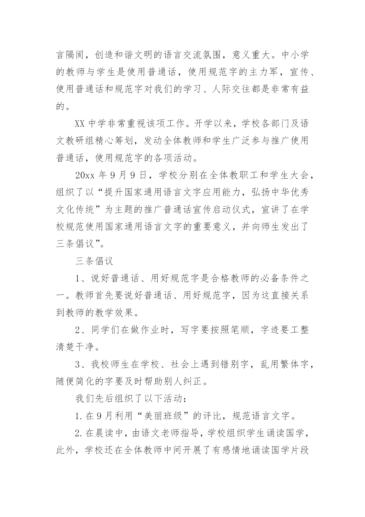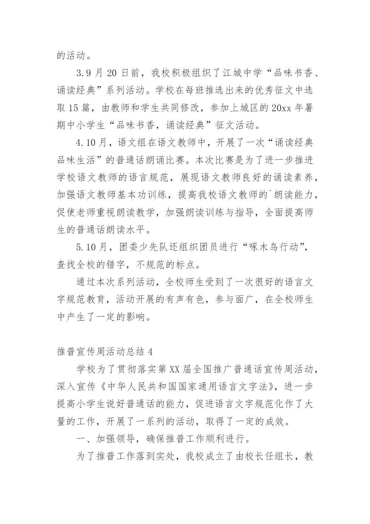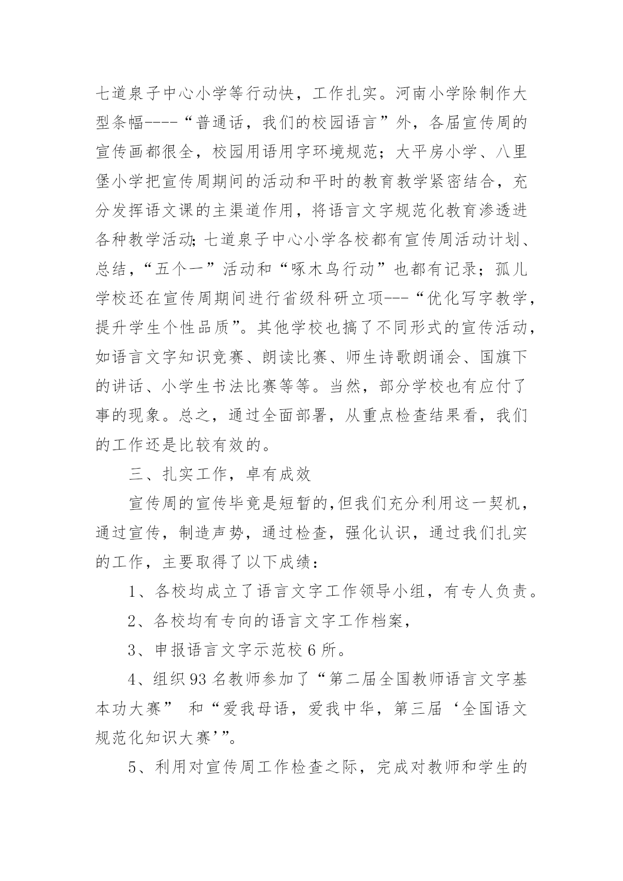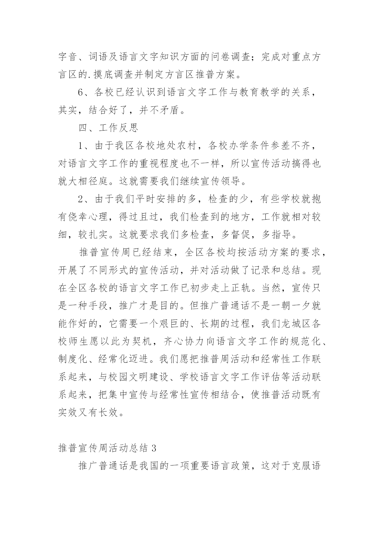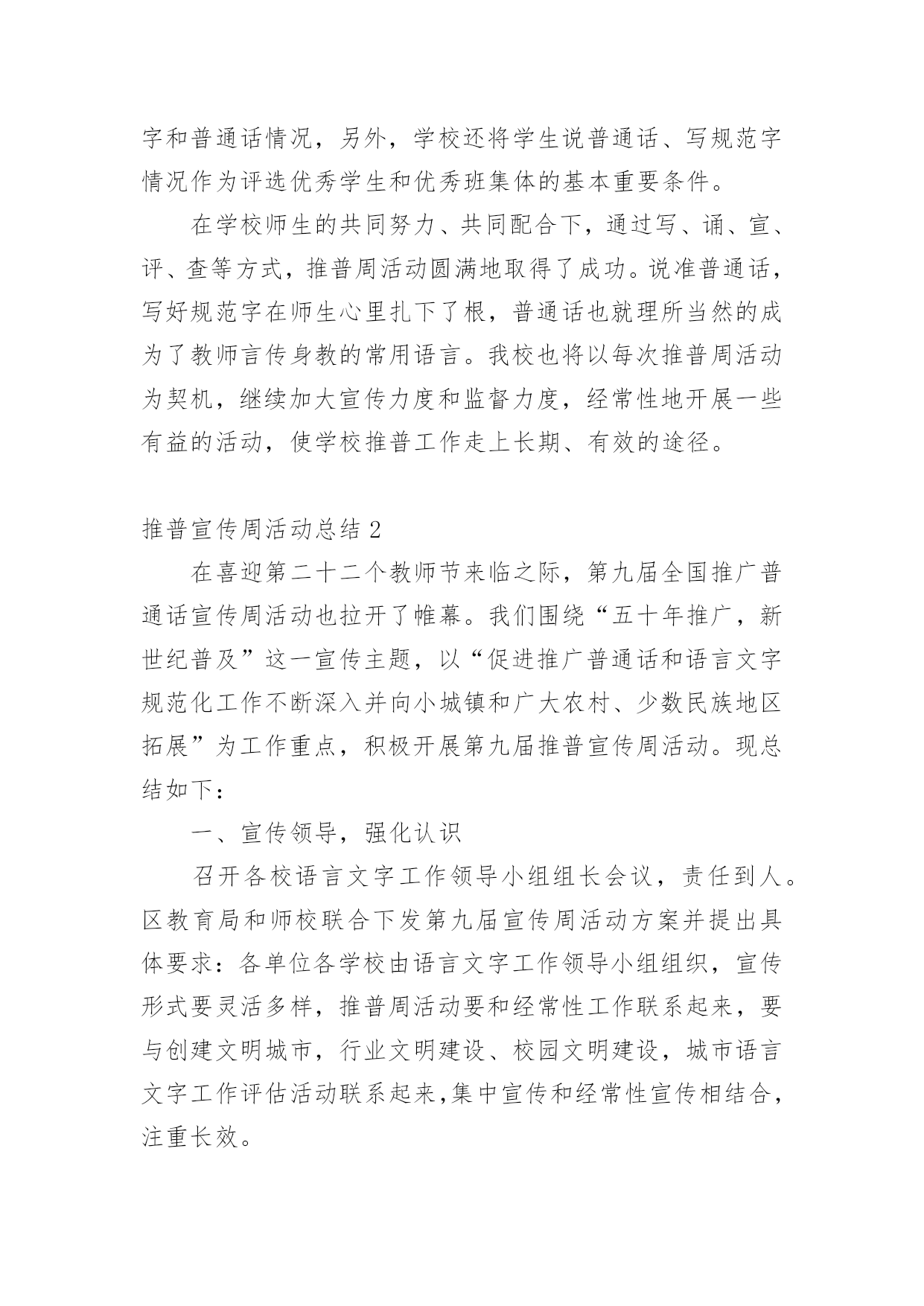 推普宣传周活动总结总结是事后对某一阶段的学习或工作情况作加以回顾检查并分析评价的书面材料,他能够提升我们的书面表达能力,快快来写一份总结吧。如何把总结做到重点突出呢?以下是小编整理的推普宣传周活动总结,仅供参考,欢迎大家阅读。推普宣传周活动总结1今年的全国推普宣传周,我校结合自身实际情况,开展了丰富多彩的推普活动,使我校的语言文字工作再上一个新的台阶。一、成立领导小组,责任分工到人。为使推普周活动落到实处,我校成立了推普周领导小组,由校长XX任组长,负责推普周工作指挥;教导主任XX为副组长,负责推普周工作总策划;教导主任和少先队大队部负责推普周活动方案的制定,具体负责推普周活动的开展。二、加大宣传力度,营造推普氛围。1、自9月13日开始,学校在校园宣传栏内张贴了第XX届推普周的宣传主题和宣传画等,进行积极有效的宣传,在校园内张贴宣传口号,并在校内悬挂语言文字宣传横幅,扩大推普周的宣传力度。2、学校利用9月13日周一国旗下讲话时间,对全体师生进行了以推广普通话为主题的宣传教育活动,进一步增进了师生诵读经典、爱我中华的感情,提高了师生对推广普通话的认识。同时,向全体师生传达了我校本届推普周活动方案,激励师生自觉使用普通话和规范字的意识,使全校师生积极参与到了推普周活动中来。3、号召全校师生及家长坚持说普通话,写规范字,使普及走向深入。三、积极开展丰富多彩的.实践活动,提高了推普周活动的实效性。1、大队部组织以班为单位成立了规范用字检查小组。各小组自查班级,学校的用字规范化情况。然后走出校园,走向社会,开展调查活动,并将调查情况进行了小结,提出改进措施向有关部门进行了反映。活动结束后,根据活动情况学校大队部评选了两支最佳啄木鸟小分队,旨在提高学生规范用字的意识和能力。2、在推普周期间,每个班以诵读经典、爱我中华为主题办了一期黑板报。周三在全校范围内进行了评比,共评出一等奖2个,二等奖3名,三等奖4名。并组织老师对办得好的黑板报、手抄报进行了学习和推广。3、学校组织全体教师召开了推普座谈会,会上XX校长对老师们进行了普通话知识讲座,切实提高了全体教师对普通话的认识。4、大队部组织专人在推普期间加大了对全校师生说普通话、写规范字的检查力度,每天课间检查师生使用普通话的情况,并做好记录,及时通过校园广播反馈各班使用规范字和普通话情况,另外,学校还将学生说普通话、写规范字情况作为评选优秀学生和优秀班集体的基本重要条件。在学校师生的共同努力、共同配合下,通过写、诵、宣、评、查等方式,推普周活动圆满地取得了成功。说准普通话,写好规范字在师生心里扎下了根,普通话也就理所当然的成为了教师言传身教的常用语言。我校也将以每次推普周活动为契机,继续加大宣传力度和监督力度,经常性地开展一些有益的活动,使学校推普工作走上长期、有效的途径。推普宣传周活动总结2在喜迎第二十二个教师节来临之际,第九届全国推广普通话宣传周活动也拉开了帷幕。我们围绕“五十年推广,新世纪普及”这一宣传主题,以“促进推广普通话和语言文字规范化工作不断深入并向小城镇和广大农村、少数民族地区拓展”为工作重点,积极开展第九届推普宣传周活动。现总结如下:一、宣传领导,强化认识召开各校语言文字工作领导小组组长会议,责任到人。区教育局和师校联合下发第九届宣传周活动方案并提出具体要求:各单位各学校由语言文字工作领导小组组织,宣传形式要灵活多样,推普周活动要和经常性工作联系起来,要与创建文明城市,行业文明建设、校园文明建设,城市语言文字工作评估活动联系起来,集中宣传和经常性宣传相结合,注重长效。二、全面部署,重点检查1、要求各学校在校园内或学校所在街面张贴宣传画或宣传标语。2、学校继续开展“五个一”活动。即做一场红旗下的讲话,出一期宣传语言文字工作的专题板报或手抄报,开展一次普通话演讲或朗诵比赛,举办一次推普知识竞赛,组织一次推普社会宣传活动。3、各学校继续开展“啄木鸟在行动”活动,组织学生对学校、学校所在街面的广告、标牌、标语等不规范用字情况和电视节目中的用语、用字不规范情况进行调查统计,做好记录。4、语委办检查“同桌同学结对子互相查找纠正错别字”,“一个学生带动一家人学好普通话”开展情况。5、组织教师参加“第二届全国教师语言文字基本功大赛”和“爱我母语,爱我中华,第三届‘全国语文规范化知识大赛’”。6、开展语言文字规范化示范性学校创建活动。各中心校和中学根据上学期“校园语言文字工作自检自查”结果,申报语言文字示范校。7、为迎接省二类城市评估做好自检自查工作。要求各校按照区师校下发的“学校语言文字工作具体要求”执行。宣传周期间,我们对全区六个乡镇中小学和两个直属学校进行抽检,其中十三中学、十八中学,西大营子河南小学、召都巴黄酒馆小学、大平房小学、八里堡小学、孤儿学校、七道泉子中心小学等行动快,工作