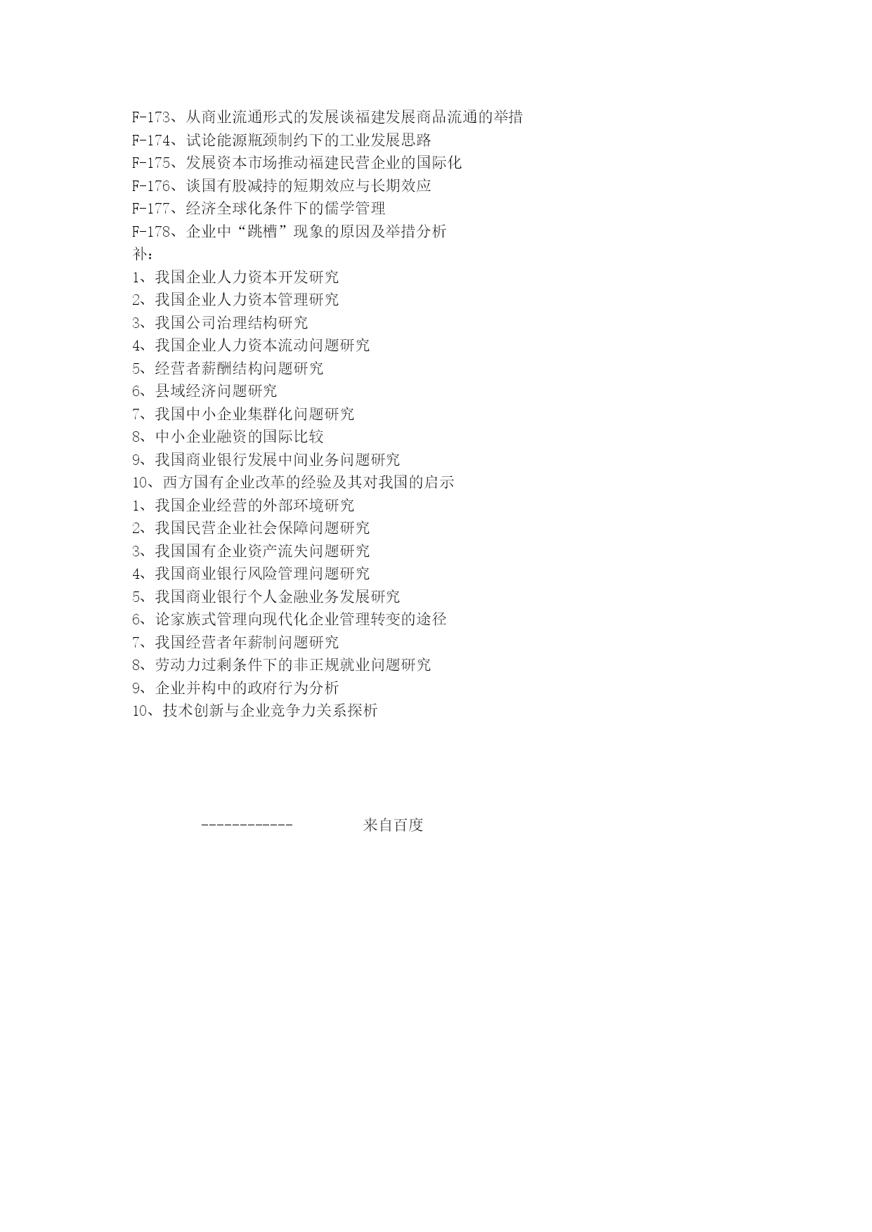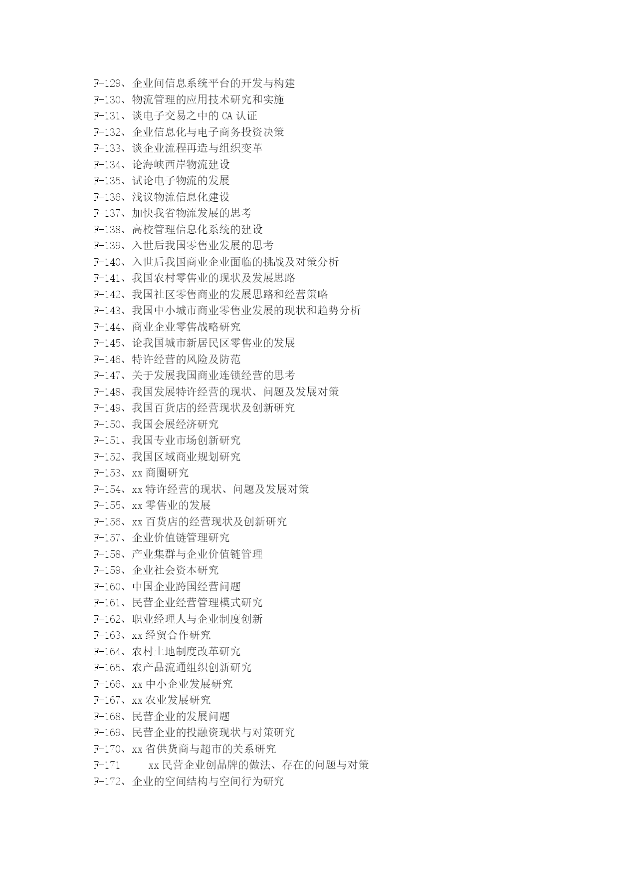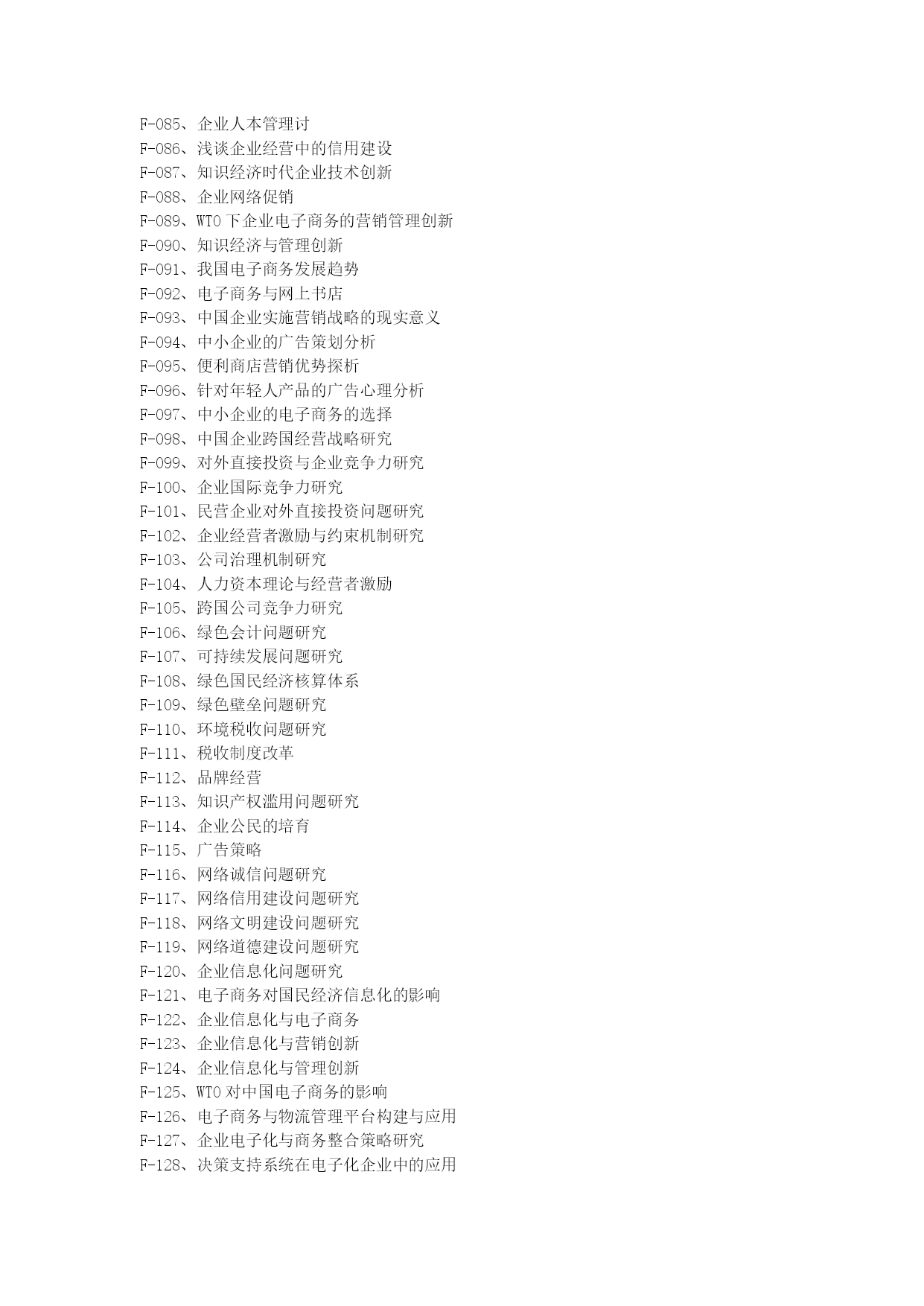 工商管理毕业论文题目汇总2012-1-411:55阅读(8)转载自HYPERLINK"http://user.qzone.qq.com/331461367"\t"_blank"Mr_Ma工商管理专业毕业论文题目汇总F-001、企业文化建设研究F-002、中国传统管理思想与现代企业管理F-003、现代公共关系在企业管理中的应用F-004、西方管理思想流变研究F-005、企业无形资产研究F-006、企业文化纵横谈F-007、精神劳动与精神产品生产的管理F-008、人本管理思想在企业管理中的应用研究F-009、科学管理思想在企业管理中的应用研究F-010、中外管理思想比较研究F-011、国有企业与国有资产管理研究F-012、中国证券市场发展的研究F-013、中国股市发展研究F-014、当前宏观政策的变动与我国经济结构调整F-015、民营银行发展的难点与对策F-016、民营经济的产业选择F-017、民营经济的制度创新F-018、民营企业与技术创新F-019、资本运营研究F-020、居民投资问题研究F-021、知识产权保护问题研究F-022、企业商标保护战略研究F-023、著作权保护问题研究F-024、消费者权益保护问题研究F-025、反不正当竞争难点与对策F-026、广告管理问题研究F-027、科学发展观与绿色经济F-028、科学发展观与生态环境保护F-029、科学发展观与绿色科技F-030、企业营销战略F-031、企业产品创新F-032、产品定价策划F-033、营销渠道策划F-034、广告策划F-035、企业战略策划F-036、农业现代化问题研究F-037、农业产业化问题研究F-038、企业战略策划F-039、企业市场研究F-040、市场经济研究F-041、农民增收问题研究F-042、农村经济发展问题研究F-043、电子商务与现代物流发展F-044、我国第四方物流发展决策支持F-045、6Sigma管理方法在现代企业管理的运用F-046、电子商务环境下顾客忠诚度的培养F-047、中国企业品牌管理研究F-048、企业内部控制制度研究F-049、建立企业全程信用管理系统研究F-050、加入WTO后我国农产品市场营销的对策F-051、企业人本管理研究F-052、电子商务条件下供应链管理的研究F-053、试论电子商务对第三方物流的要求F-054、试析数字产品的定价策略F-055、关于福建省发展物流业的几点思考F-056、电子商务环境下的第三方物流探讨F-057、我国第三方物流是社会分工发展的产物F-058、在线广告模式研究F-059、试析电子商务激活展会经济F-060、第四方物流在中国的发展现状F-061、我国第三方物流发展现状及对策F-062、3PL和4PL的协调发展F-063、基于企业生命周期的人力资源管理F-064、新经济下的人力资源管理F-065、浅谈国有企业的人力资源管理F-066、民营企业如何吸引、保留优秀人才F-067、对高校开设职业生涯规划课题的思考F-068、我国培训市场的现状及发展趋势F-069、如何激励知识型员工F-070、人力资源管理的发展进程及新趋势F-071、“入世”对我国人力资源管理和开发的挑战及对策F-072、企业如何开展员工的职业生涯管理工作F-073、企业变革中的阻力F-074、企业信息化中的组织问题F-075、企业信息化中的文化问题F-076、核心竞争力与企业文化F-077、如何培养企业核心竞争力F-078、有效克服信息化中的阻力F-079、高新技术企业的营销特点F-080、网络经济中的品牌F-081、企业生产过程中逆向物流管理F-082、电子商务时代网络物流建设F-083、电子商务产权问题F-084、精益生产模式在我国企业中的作用F-085、企业人本管理讨F-086、浅谈企业经营中的信用建设F-087、知识经济时代企业技术创新F-088、企业网络促销F-089、WTO下企业电子商务的营销管理创新F-090、知识经济与管理创新F-091、我国电子商务发展趋势F-092、电子商务与网上书店F-093、中国企业实施营销战略的现实意义F-094、中小企业的广告策划分析F-095、便利商店营销优势探析F-096、针对年轻人产品的广告心理分析F-097、中小企业的电子商务的选择F-098、中国企业跨国经营战略研究F-099、对外直接投资与企业竞争力研究F-100、企业国际竞争力研究F-101、民营企业对外直接投资问题研究F-102、企业经营者激励与约束机制研究F-103、公司治理机制研究F-104、人力资本理论与经营者激励F-105、跨国公司竞争力研究F-106、绿色会计问题研究F-107、可持续发展问题研究F-108、绿色国民经济核算体系F-109、绿色壁垒问题研究F-110、环境税收问题研究F-1
