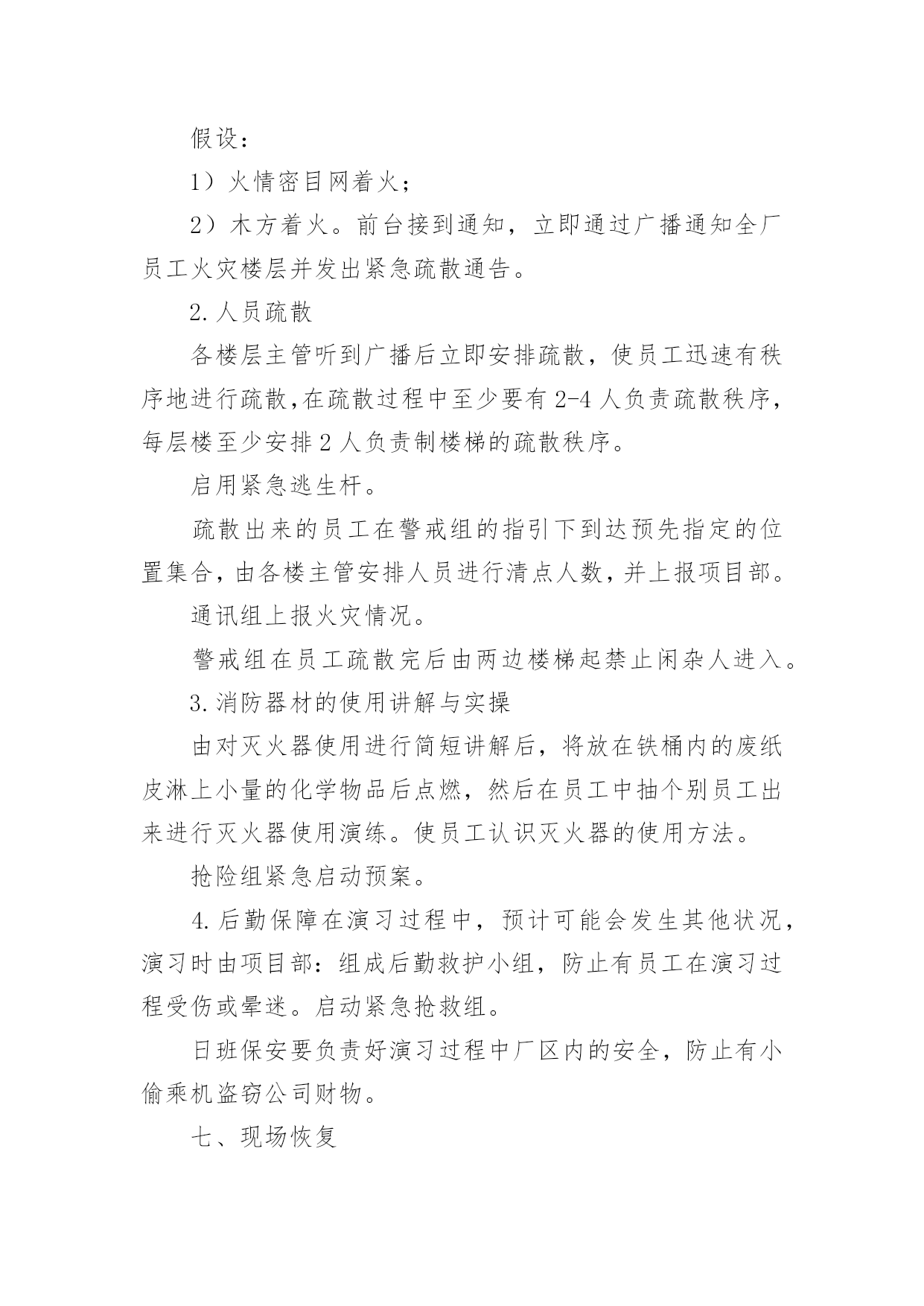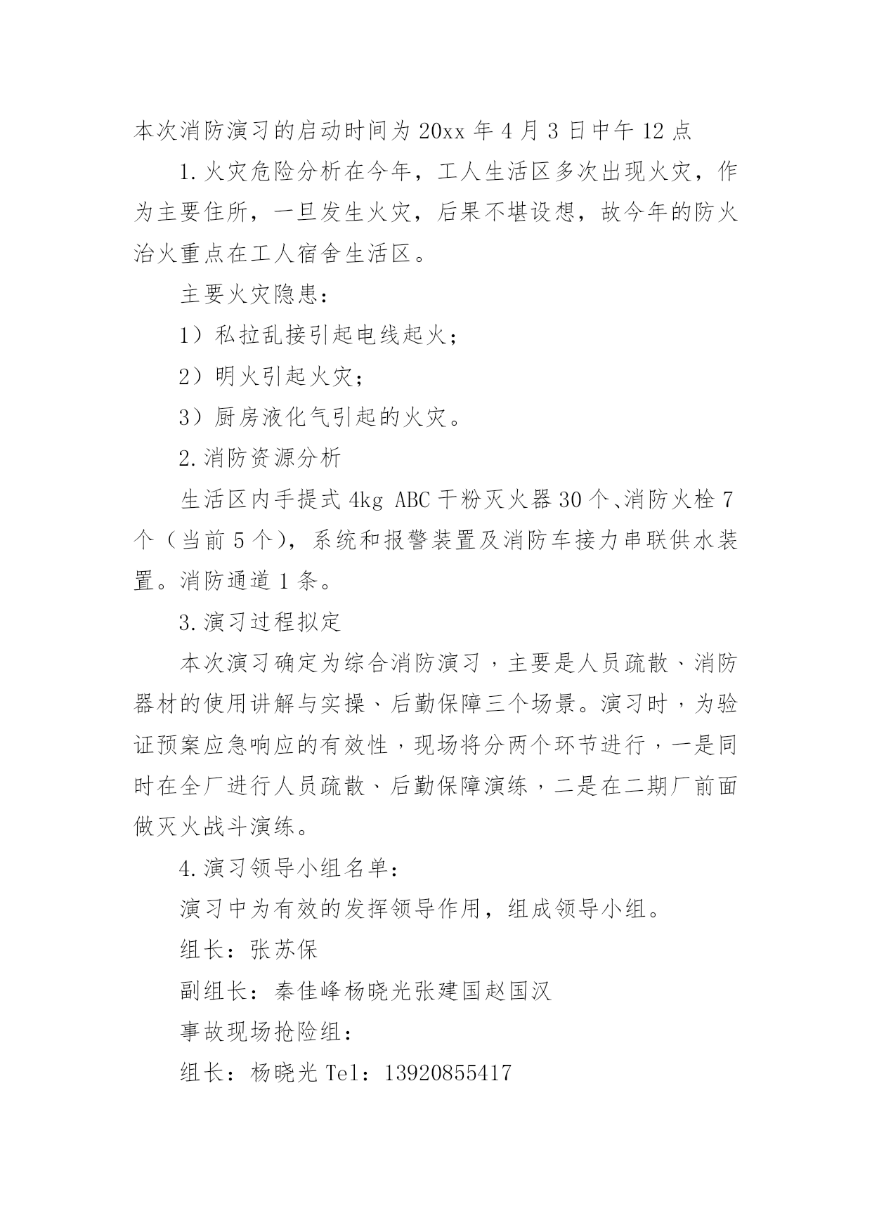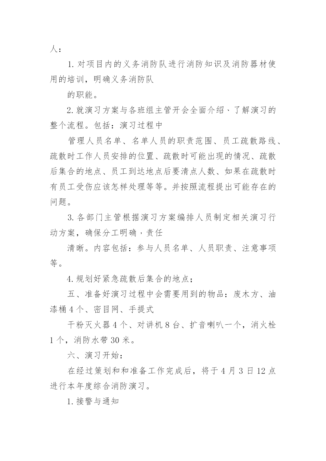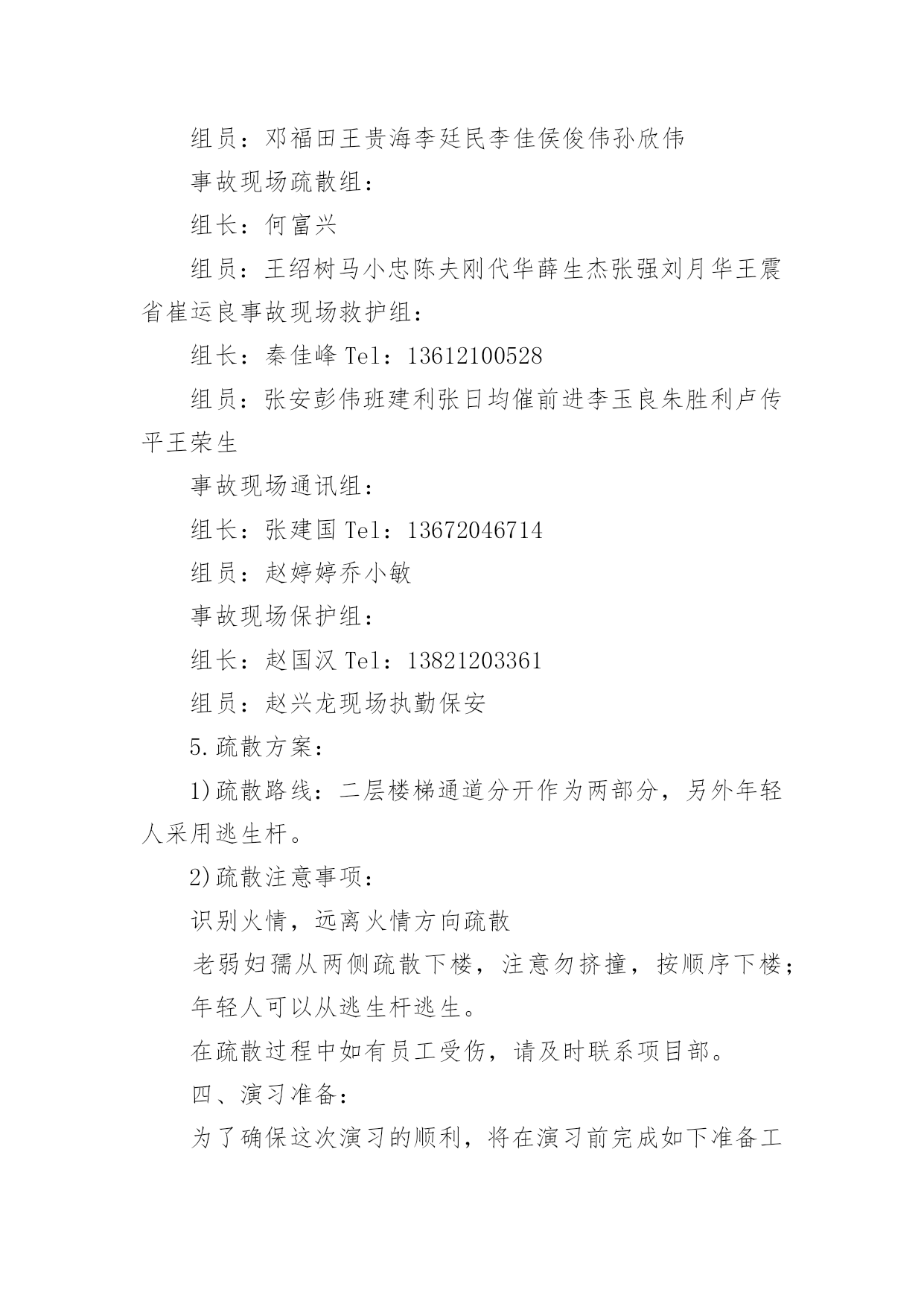 消防演练活动方案消防演练活动方案15篇(精)为了确保事情或工作扎实开展,往往需要预先进行方案制定工作,方案是从目的、要求、方式、方法、进度等都部署具体、周密,并有很强可操作性的计划。优秀的方案都具备一些什么特点呢?下面是小编为大家收集的消防演练活动方案,欢迎阅读与收藏。消防演练活动方案1一、消防演练内容:1、初期火灾的扑救、控制、火场协调指挥、物资转移演练;2、火场人员疏散引导和伤员救护演练;3、火场警戒及配合消防中队演练;4、灭火器材现场灭火演练;5、火灾事故处理教育及演习。二、火灾模拟设置20xx年x月xx日上午8点10分,公司二楼包装部骑钉某某工人在包装部作业时因操作不当电路发生火灾,火势蔓延,引燃车间违章堆放的`易燃品,成品违章堵塞,消防通道,火场被困人员3人。公司启动应急预案组织灭火自救并报119,将火扑灭。三、演习的组织指挥分工及参演人员1、总指挥:某某某副总指挥:某某某、某某某2、演习技术指导:青松傲骨3、参演组织及其成员A、灭火行动组(即公司一级义方消防队)组长:某某某消防演练活动方案2为了加强员工对消防知识的了解和认识,增强消防意识,体现“预防为主,防消结合”的消防方针,灌输群防,群治的意识,项目研究决定开展一次消防演习。演习时间:20xx年4月3日演习地点:二期生活区参加人员:全体应急小组成员及受教育班组演习负责人:张苏保一、演习目的:贯彻“预防为主,防消结合”,普及防火知识,做好项目的消防安全工作,保护项目的财产和工人的人身安全。增强工人的消防意识和提高员工在火灾现场的疏散/逃生的能力。二、方针与原则:预防为主,防消结合﹔统一指挥﹐高效协调﹔保护人员安全优先﹔防止和控制事故蔓延优先﹔保护环境优先。三、演习策划:本次演习是为有效地提高员工防火及逃生意识,加强冬季防火安全管理,切实做到群防,群治的良好防火措施而进行的消防演习。为使演习更加逼真﹐真正检验广大工人的.安全意识﹐本次消防演习的启动时间为20xx年4月3日中午12点1.火灾危险分析在今年,工人生活区多次出现火灾,作为主要住所,一旦发生火灾,后果不堪设想,故今年的防火治火重点在工人宿舍生活区。主要火灾隐患:1)私拉乱接引起电线起火;2)明火引起火灾;3)厨房液化气引起的火灾。2.消防资源分析生活区内手提式4kgABC干粉灭火器30个、消防火栓7个(当前5个),系统和报警装置及消防车接力串联供水装置。消防通道1条。3.演习过程拟定本次演习确定为综合消防演习﹐主要是人员疏散﹑消防器材的使用讲解与实操﹑后勤保障三个场景。演习时﹐为验证预案应急响应的有效性﹐现场将分两个环节进行﹐一是同时在全厂进行人员疏散﹑后勤保障演练﹐二是在二期厂前面做灭火战斗演练。4.演习领导小组名单:演习中为有效的发挥领导作用,组成领导小组。组长:张苏保副组长:秦佳峰杨晓光张建国赵国汉事故现场抢险组:组长:杨晓光Tel:13920855417组员:邓福田王贵海李廷民李佳侯俊伟孙欣伟事故现场疏散组:组长:何富兴组员:王绍树马小忠陈夫刚代华薛生杰张强刘月华王震省崔运良事故现场救护组:组长:秦佳峰Tel:13612100528组员:张安彭伟班建利张日均催前进李玉良朱胜利卢传平王荣生事故现场通讯组:组长:张建国Tel:13672046714组员:赵婷婷乔小敏事故现场保护组:组长:赵国汉Tel:13821203361组员:赵兴龙现场执勤保安5.疏散方案:1)疏散路线:二层楼梯通道分开作为两部分,另外年轻人采用逃生杆。2)疏散注意事项:识别火情,远离火情方向疏散老弱妇孺从两侧疏散下楼,注意勿挤撞,按顺序下楼;年轻人可以从逃生杆逃生。在疏散过程中如有员工受伤,请及时联系项目部。四、演习准备:为了确保这次演习的顺利,将在演习前完成如下准备工人:1.对项目内的义务消防队进行消防知识及消防器材使用的培训,明确义务消防队的职能。2.就演习方案与各班组主管开会全面介绍﹑了解演习的整个流程。包括:演习过程中管理人员名单、名单人员的职责范围、员工疏散路线、疏散时工作人员安排的位置、疏散时可能出现的情况、疏散后集合的地点、员工到达地点后要清点人数、如果在疏散时有员工受伤应该怎样处理等等。并按照流程提出可能存在的问题。3.各部门主管根据演习方案编排人员制定相关演习行动方案,确保分工明确﹐责任清晰。内容包括:参与人员名单、人员职责、注意事项等。4.规划好紧急疏散后集合的地点;五、准备好演习过程中会需要用到的物品:废木方、油漆桶4个、密目网、手提式干粉灭火器4个、对讲机8台、扩音喇叭一个,消火栓1个,消防水带30米。六、演习开始:在经过策划和和准备工作完成后,将于4月3日12点进行本年度综合消防演习。1.接警与通知假设:1)火情密目网着火;2)木方着火。前台接到通知,立即通过广播通知全厂员工火灾楼层并发出紧急疏散通告。