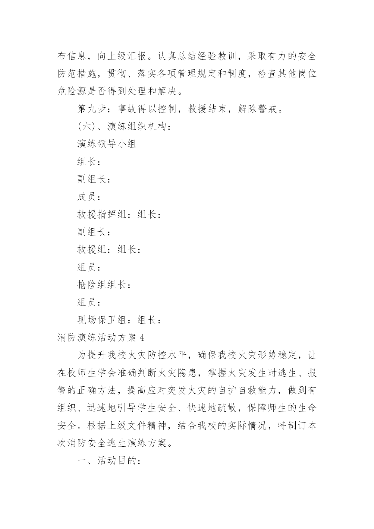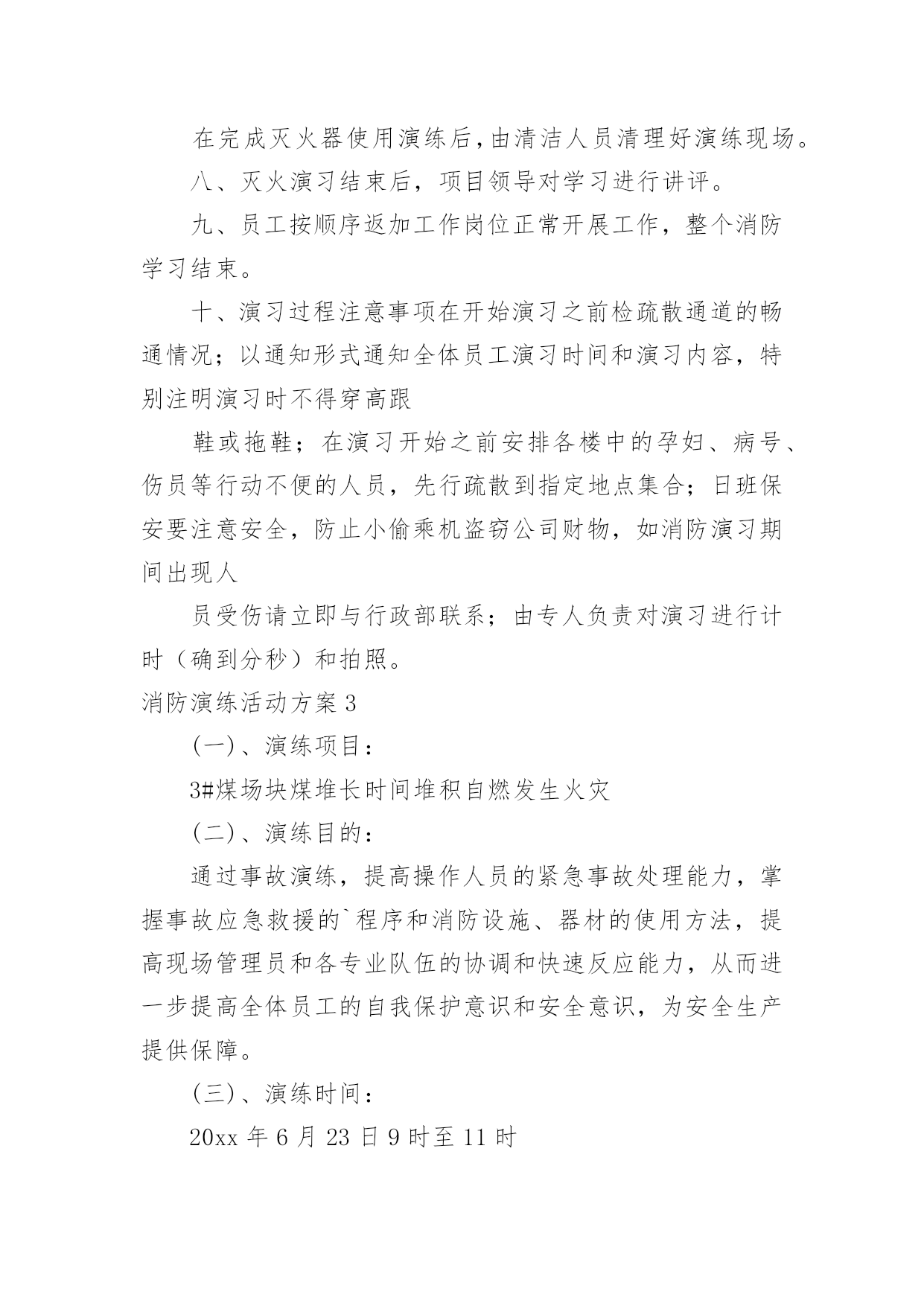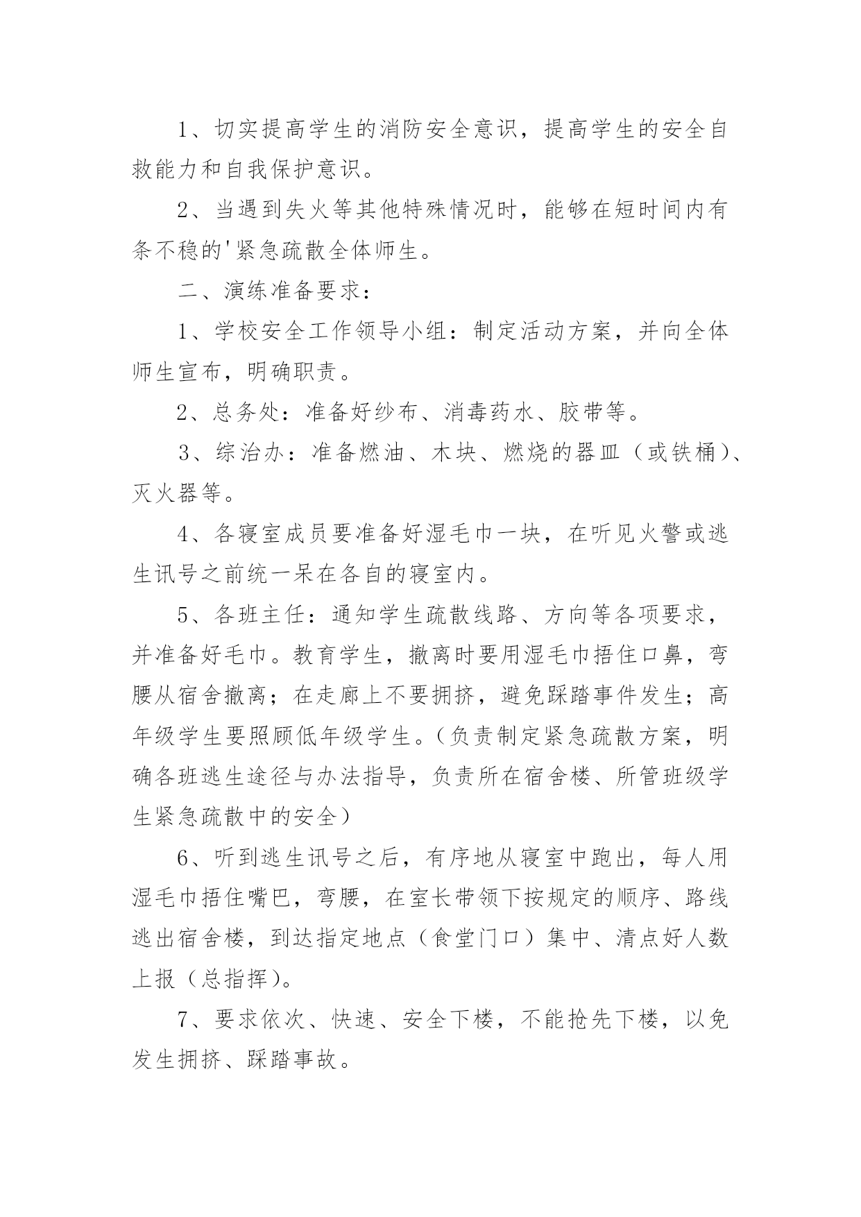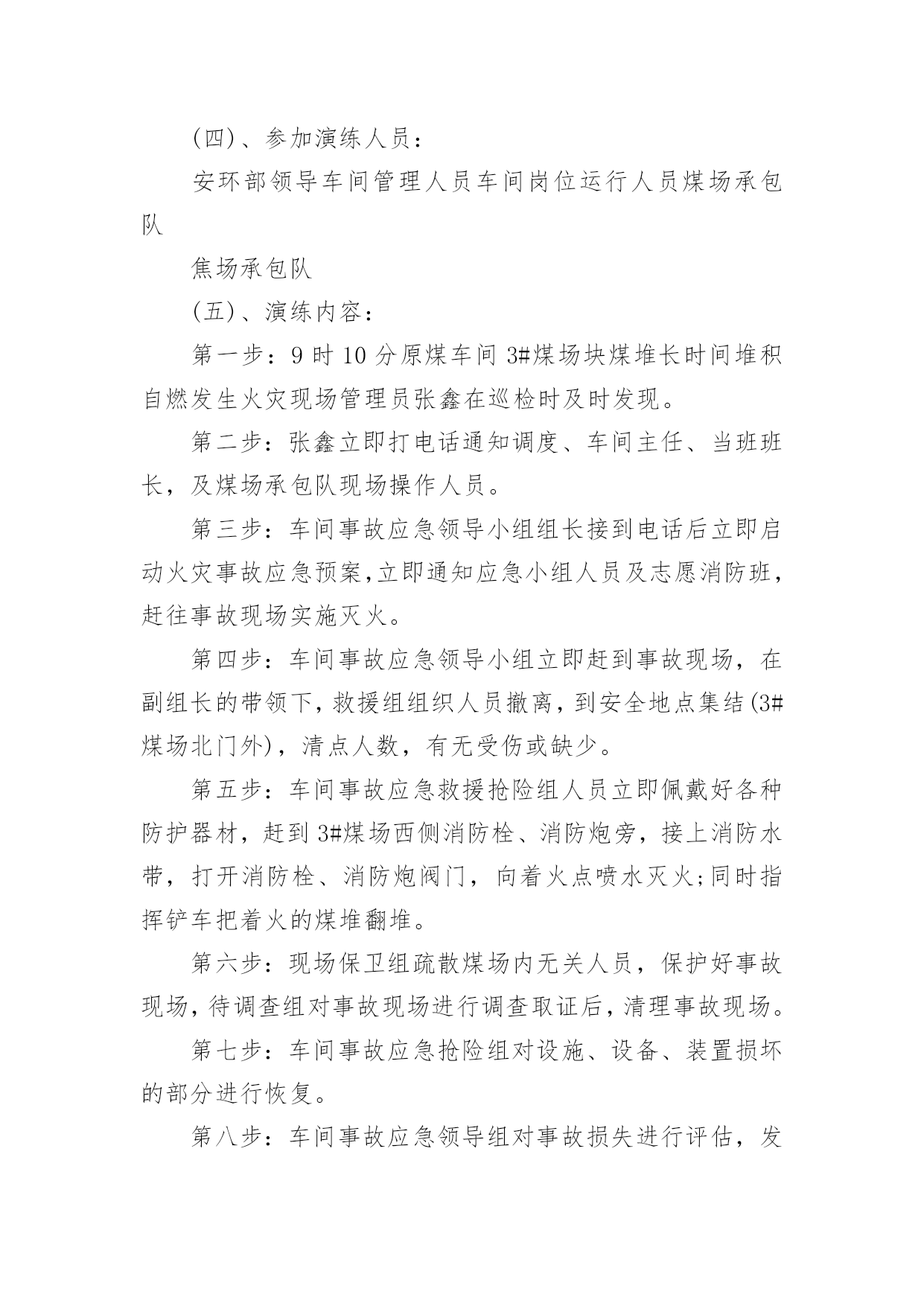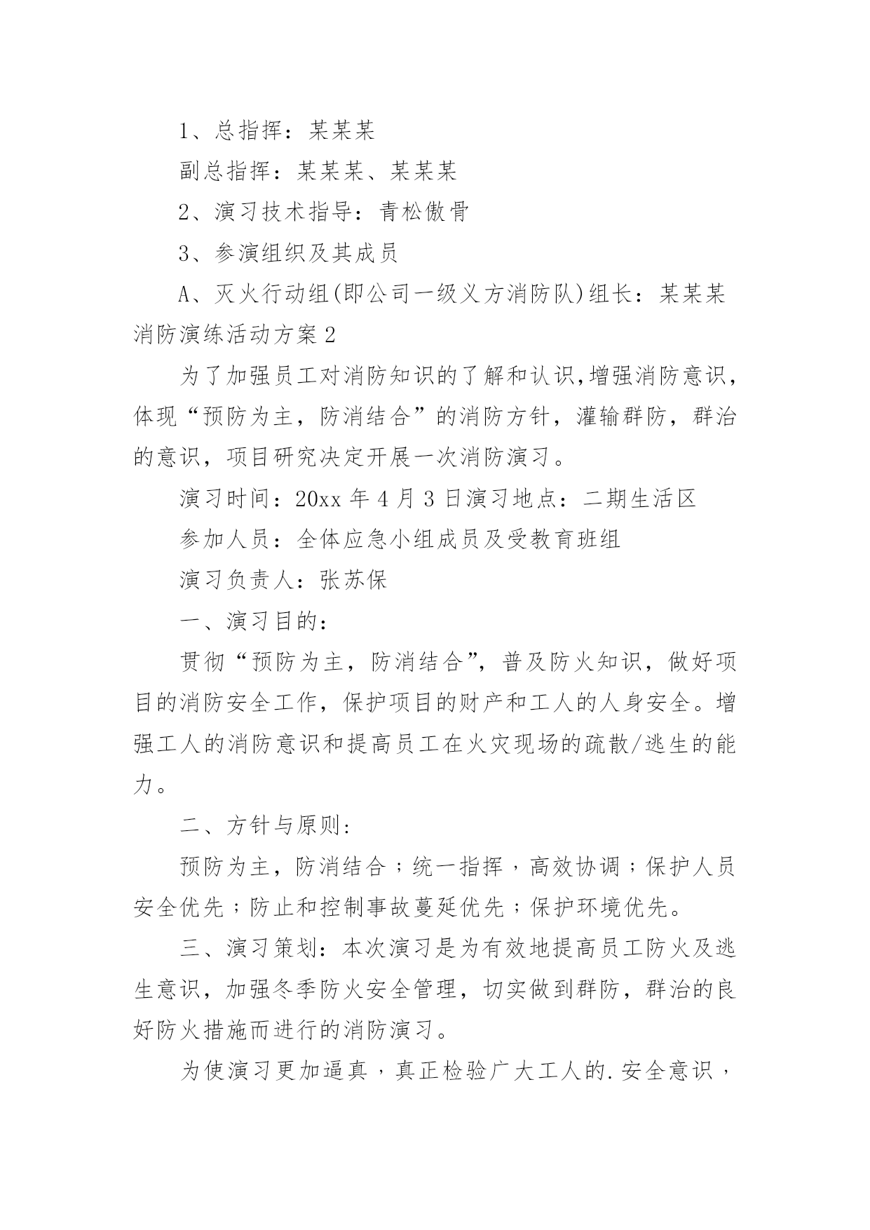 消防演练活动方案消防演练活动方案15篇(精)为了确保事情或工作扎实开展,往往需要预先进行方案制定工作,方案是从目的、要求、方式、方法、进度等都部署具体、周密,并有很强可操作性的计划。优秀的方案都具备一些什么特点呢?下面是小编为大家收集的消防演练活动方案,欢迎阅读与收藏。消防演练活动方案1一、消防演练内容:1、初期火灾的扑救、控制、火场协调指挥、物资转移演练;2、火场人员疏散引导和伤员救护演练;3、火场警戒及配合消防中队演练;4、灭火器材现场灭火演练;5、火灾事故处理教育及演习。二、火灾模拟设置20xx年x月xx日上午8点10分,公司二楼包装部骑钉某某工人在包装部作业时因操作不当电路发生火灾,火势蔓延,引燃车间违章堆放的`易燃品,成品违章堵塞,消防通道,火场被困人员3人。公司启动应急预案组织灭火自救并报119,将火扑灭。三、演习的组织指挥分工及参演人员1、总指挥:某某某副总指挥:某某某、某某某2、演习技术指导:青松傲骨3、参演组织及其成员A、灭火行动组(即公司一级义方消防队)组长:某某某消防演练活动方案2为了加强员工对消防知识的了解和认识,增强消防意识,体现“预防为主,防消结合”的消防方针,灌输群防,群治的意识,项目研究决定开展一次消防演习。演习时间:20xx年4月3日演习地点:二期生活区参加人员:全体应急小组成员及受教育班组演习负责人:张苏保一、演习目的:贯彻“预防为主,防消结合”,普及防火知识,做好项目的消防安全工作,保护项目的财产和工人的人身安全。增强工人的消防意识和提高员工在火灾现场的疏散/逃生的能力。二、方针与原则:预防为主,防消结合﹔统一指挥﹐高效协调﹔保护人员安全优先﹔防止和控制事故蔓延优先﹔保护环境优先。三、演习策划:本次演习是为有效地提高员工防火及逃生意识,加强冬季防火安全管理,切实做到群防,群治的良好防火措施而进行的消防演习。为使演习更加逼真﹐真正检验广大工人的.安全意识﹐本次消防演习的启动时间为20xx年4月3日中午12点1.火灾危险分析在今年,工人生活区多次出现火灾,作为主要住所,一旦发生火灾,后果不堪设想,故今年的防火治火重点在工人宿舍生活区。主要火灾隐患:1)私拉乱接引起电线起火;2)明火引起火灾;3)厨房液化气引起的火灾。2.消防资源分析生活区内手提式4kgABC干粉灭火器30个、消防火栓7个(当前5个),系统和报警装置及消防车接力串联供水装置。消防通道1条。3.演习过程拟定本次演习确定为综合消防演习﹐主要是人员疏散﹑消防器材的使用讲解与实操﹑后勤保障三个场景。演习时﹐为验证预案应急响应的有效性﹐现场将分两个环节进行﹐一是同时在全厂进行人员疏散﹑后勤保障演练﹐二是在二期厂前面做灭火战斗演练。4.演习领导小组名单:演习中为有效的发挥领导作用,组成领导小组。组长:张苏保副组长:秦佳峰杨晓光张建国赵国汉事故现场抢险组:组长:杨晓光Tel:13920855417组员:邓福田王贵海李廷民李佳侯俊伟孙欣伟事故现场疏散组:组长:何富兴组员:王绍树马小忠陈夫刚代华薛生杰张强刘月华王震省崔运良事故现场救护组:组长:秦佳峰Tel:13612100528组员:张安彭伟班建利张日均催前进李玉良朱胜利卢传平王荣生事故现场通讯组:组长:张建国Tel:13672046714组员:赵婷婷乔小敏事故现场保护组:组长:赵国汉Tel:13821203361组员:赵兴龙现场执勤保安5.疏散方案:1)疏散路线:二层楼梯通道分开作为两部分,另外年轻人采用逃生杆。2)疏散注意事项:识别火情,远离火情方向疏散老弱妇孺从两侧疏散下楼,注意勿挤撞,按顺序下楼;年轻人可以从逃生杆逃生。在疏散过程中如有员工受伤,请及时联系项目部。四、演习准备:为了确保这次演习的顺利,将在演习前完成如下准备工人:1.对项目内的义务消防队进行消防知识及消防器材使用的培训,明确义务消防队的职能。2.就演习方案与各班组主管开会全面介绍﹑了解演习的整个流程。包括:演习过程中管理人员名单、名单人员的职责范围、员工疏散路线、疏散时工作人员安排的位置、疏散时可能出现的情况、疏散后集合的地点、员工到达地点后要清点人数、如果在疏散时有员工受伤应该怎样处理等等。并按照流程提出可能存在的问题。3.各部门主管根据演习方案编排人员制定相关演习行动方案,确保分工明确﹐责任清晰。内容包括:参与人员名单、人员职责、注意事项等。4.规划好紧急疏散后集合的地点;五、准备好演习过程中会需要用到的物品:废木方、油漆桶4个、密目网、手提式干粉灭火器4个、对讲机8台、扩音喇叭一个,消火栓1个,消防水带30米。六、演习开始:在经过策划和和准备工作完成后,将于4月3日12点进行本年度综合消防演习。1.接警与通知假设:1)火情密目网着火;2)木方着火。前台接到通知,立即通过广播通知全厂员工火灾楼层并发出紧急疏散通告。