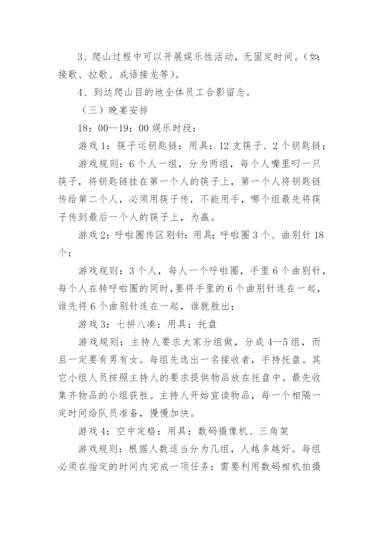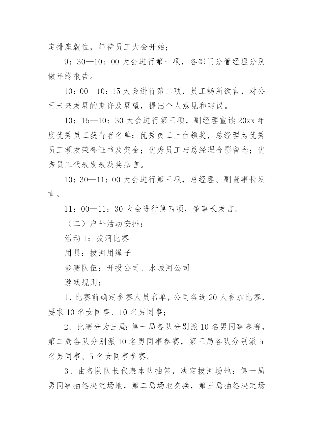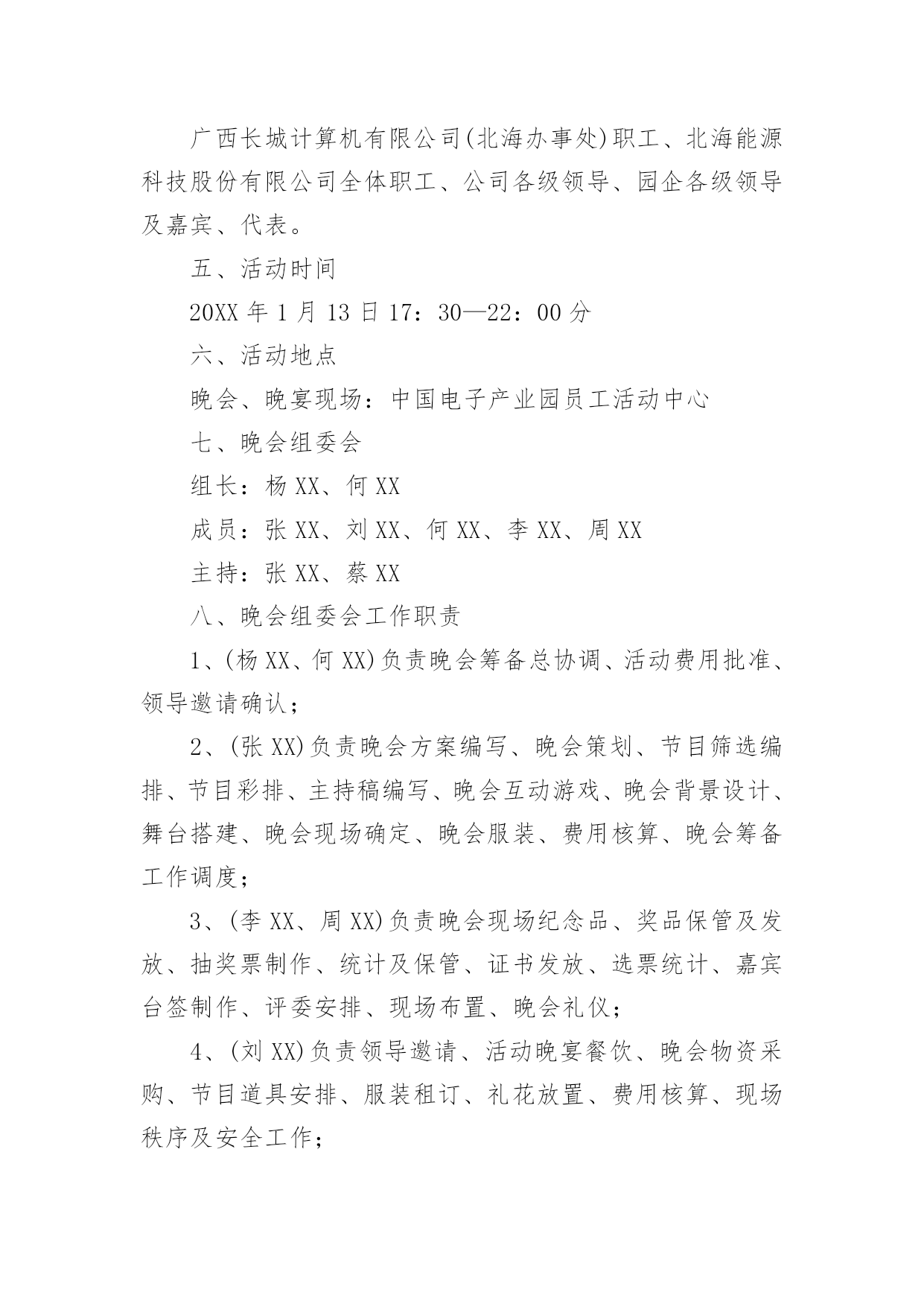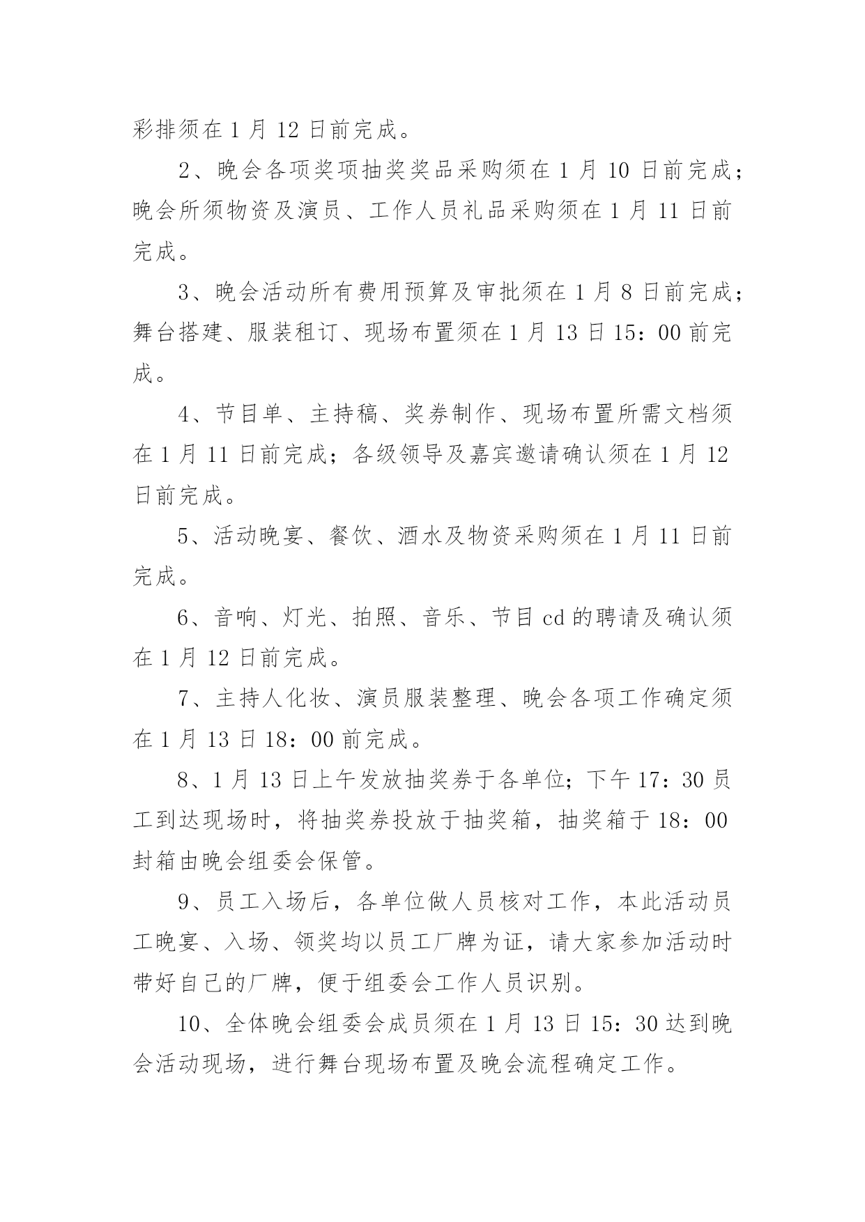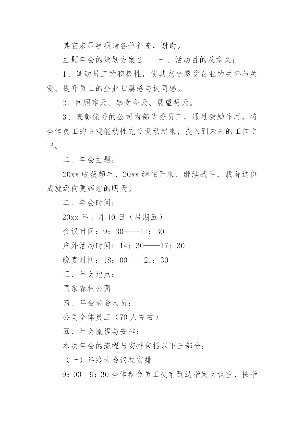 主题年会的策划方案主题年会的策划方案为保证事情或工作高起点、高质量、高水平开展,我们需要提前开始方案制定工作,方案是计划中内容最为复杂的一种。你知道什么样的方案才能切实地帮助到我们吗?以下是小编为大家收集的主题年会的策划方案,欢迎阅读,希望大家能够喜欢。主题年会的策划方案1为喜迎新年的到来,进一步丰富员工的业余文化生活,调动员工的积极性和工作热情,增强团队凝聚力,特组织迎新春活动,并与员工共渡新春佳节,喜迎龙年,经公司领导研究决定举办“XX能源XX年新春联欢晚会”活动,具体安排如下:一、活动主题龙聚首,再展翅---XX能源XX年新春联欢晚会二、活动目的1、提升公司凝聚力;2、加强员工的积极性和工作热情;3、增强公司员工的集体观念;4、展现员工风采,弘扬长城企业文化。三、活动主办XX能源科技股份有限公司四、参加对象广西长城计算机有限公司(北海办事处)职工、北海能源科技股份有限公司全体职工、公司各级领导、园企各级领导及嘉宾、代表。五、活动时间20XX年1月13日17:30—22:00分六、活动地点晚会、晚宴现场:中国电子产业园员工活动中心七、晚会组委会组长:杨XX、何XX成员:张XX、刘XX、何XX、李XX、周XX主持:张XX、蔡XX八、晚会组委会工作职责1、(杨XX、何XX)负责晚会筹备总协调、活动费用批准、领导邀请确认;2、(张XX)负责晚会方案编写、晚会策划、节目筛选编排、节目彩排、主持稿编写、晚会互动游戏、晚会背景设计、舞台搭建、晚会现场确定、晚会服装、费用核算、晚会筹备工作调度;3、(李XX、周XX)负责晚会现场纪念品、奖品保管及发放、抽奖票制作、统计及保管、证书发放、选票统计、嘉宾台签制作、评委安排、现场布置、晚会礼仪;4、(刘XX)负责领导邀请、活动晚宴餐饮、晚会物资采购、节目道具安排、服装租订、礼花放置、费用核算、现场秩序及安全工作;5、(何XX)负责晚会现场节目调度、舞台搭建、拍照、舞台设备、节目音乐、舞台现场布置、演员召集、晚会完毕清场工作(传媒公司人员协助);九、XX年度XX能源优秀员工表彰仪式年度优秀员工表彰总结公司XX年来取得的各项成就,突出员工爱岗敬业的精神,鼓舞员工在XX年保持良好的心态和工作激情,继续努力。也是借机展示公司的前景和良好的发展势头。十、晚会节目评选活动为了鼓舞员工辛勤的努力和高仰的激情,本评选活动特设订晚会节目部分奖项来鼓舞他们的工作热情、调动他们的积极性,使他们在以后的工作和活动中充分发挥自己的特长为长城服务。十一、活动内容及流程1、活动预备事项(9:00---17:00)3、活动晚宴(18:00---19:30)4、新春晚会开始(18:30)5、领导介绍及领导致词6、节目表演、互动游戏环节、各项奖项抽奖7、晚会节目评选活动及颁奖8、晚会结束(21:45)十二、活动注意事项1、本次晚会各单位推选的节目须在XX年1月10日截止;各节目的审核、筛选须在1月11日前完成;晚会整体彩排须在1月12日前完成。2、晚会各项奖项抽奖奖品采购须在1月10日前完成;晚会所须物资及演员、工作人员礼品采购须在1月11日前完成。3、晚会活动所有费用预算及审批须在1月8日前完成;舞台搭建、服装租订、现场布置须在1月13日15:00前完成。4、节目单、主持稿、奖券制作、现场布置所需文档须在1月11日前完成;各级领导及嘉宾邀请确认须在1月12日前完成。5、活动晚宴、餐饮、酒水及物资采购须在1月11日前完成。6、音响、灯光、拍照、音乐、节目cd的聘请及确认须在1月12日前完成。7、主持人化妆、演员服装整理、晚会各项工作确定须在1月13日18:00前完成。8、1月13日上午发放抽奖券于各单位;下午17:30员工到达现场时,将抽奖券投放于抽奖箱,抽奖箱于18:00封箱由晚会组委会保管。9、员工入场后,各单位做人员核对工作,本此活动员工晚宴、入场、领奖均以员工厂牌为证,请大家参加活动时带好自己的厂牌,便于组委会工作人员识别。10、全体晚会组委会成员须在1月13日15:30达到晚会活动现场,进行舞台现场布置及晚会流程确定工作。其它未尽事项请各位补充,谢谢。主题年会的策划方案2一、活动目的及意义:1、调动员工的积极性,使其充分感受企业的关怀与关爱、提升员工的企业归属感与认同感。2、回顾昨天、感受今天、展望明天。3、表彰优秀的公司内部优秀员工,通过激励作用,将全体员工的主观能动性充分调动起来,投入到未来的工作之中。二、年会主题:20xx收获颇丰,20xx继往开来、继续战斗,载着这份成就迈向更辉煌的明天。二、年会时间:20xx年1月10日(星期五)会议时间:9:30——11:30户外活动时间:14:30——17:30晚宴时间:18:00——21:30三、年会地点:国家森林公园四、年会参会人员:公司全体员工(70人左右)五、年