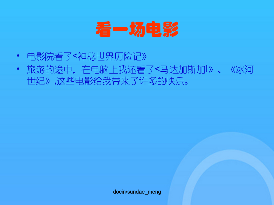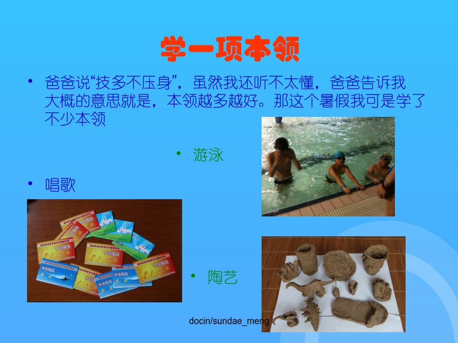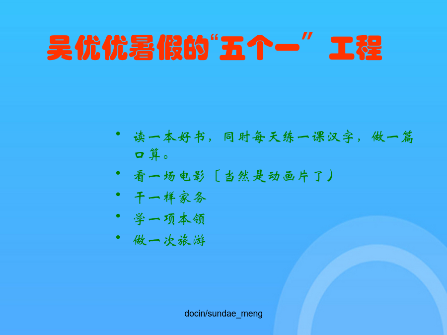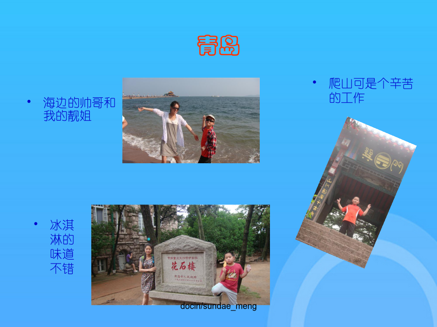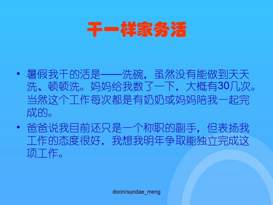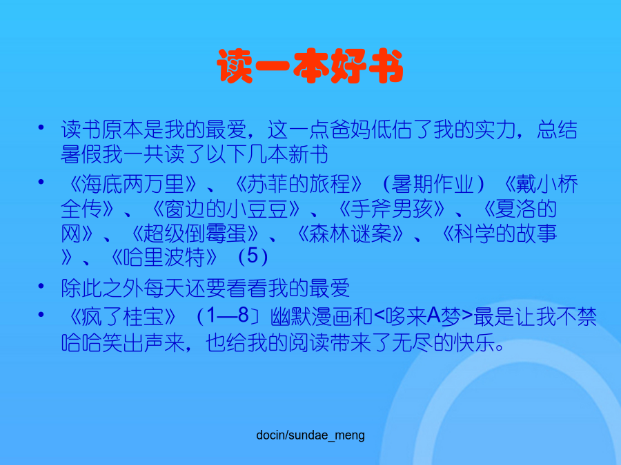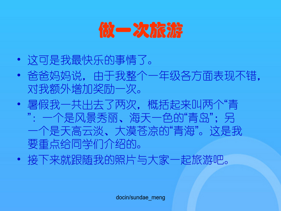 我的暑假生活吴优优暑假的“五个一〞工程读一本好书暑假生活已经临近尾声,对比一下暑假刚开始制订的计划是否实现,暑假生活是否快乐。贵德:王洛宾艺术馆、金银滩草原,游览原子城、黄河奇石苑、水车广场、转经广场、贵德国家地质公园〔丹霞地貌)爸爸妈妈说,由于我整个一年级各方面表现不错,对我额外增加奖励一次。爸爸妈妈说,由于我整个一年级各方面表现不错,对我额外增加奖励一次。另一个是天高云淡、大漠苍凉的“青海”。那这个暑假我可是学了不少本领行程:常州〔动车〕青岛爸爸说我目前还只是一个称职的副手,但表扬我工作的态度很好,我想我明年争取能独立完成这项工作。docin/sundae_meng爸爸说“技多不压身”,虽然我还听不太懂,爸爸告诉我大概的意思就是,本领越多越好。行程:常州〔动车〕青岛贵德:王洛宾艺术馆、金银滩草原,游览原子城、黄河奇石苑、水车广场、转经广场、贵德国家地质公园〔丹霞地貌)地区介绍:宁夏:沙湖旅游区、镇北堡西部影视城、西夏王陵、沙波头旅游区《海底两万里》、《苏菲的旅程》(暑期作业)《戴小桥全传》、《窗边的小豆豆》、《手斧男孩》、《夏洛的网》、《超级倒霉蛋》、《森林谜案》、《科学的故事》、《哈里波特》(5)海底世界那这个暑假我可是学了不少本领互助县北山国家森林地质公园、门源、祁连〔岗什卡雪峰、雄伟壮丽的祁连山脉、中国最美的六大草原之一的祁连大草原、鸳鸯花海)、卓尔山景区、日月山景区暑假生活已经临近尾声,对比一下暑假刚开始制订的计划是否实现,暑假生活是否快乐。两样小装备〔你们看到了吗?)背带上的右边银白色的是个小电筒,左边天蓝色是一个应急哨子,(让我遇到紧急情况吹的,如走散什么)海底世界行程:常州〔动车〕青岛妈妈给我数了一下,大概有30几次。docin/sundae_meng八大关别墅区docin/sundae_meng除此之外每天还要看看我的最爱《海底两万里》、《苏菲的旅程》(暑期作业)《戴小桥全传》、《窗边的小豆豆》、《手斧男孩》、《夏洛的网》、《超级倒霉蛋》、《森林谜案》、《科学的故事》、《哈里波特》(5)docin/sundae_meng这可是我最快乐的事情了。《海底两万里》、《苏菲的旅程》(暑期作业)《戴小桥全传》、《窗边的小豆豆》、《手斧男孩》、《夏洛的网》、《超级倒霉蛋》、《森林谜案》、《科学的故事》、《哈里波特》(5)《海底两万里》、《苏菲的旅程》(暑期作业)《戴小桥全传》、《窗边的小豆豆》、《手斧男孩》、《夏洛的网》、《超级倒霉蛋》、《森林谜案》、《科学的故事》、《哈里波特》(5)时间:7月17日——7月20日共计4天干一样家务活做一次旅游青岛的游程青岛宁夏——青海的游程宁夏——青海谢谢