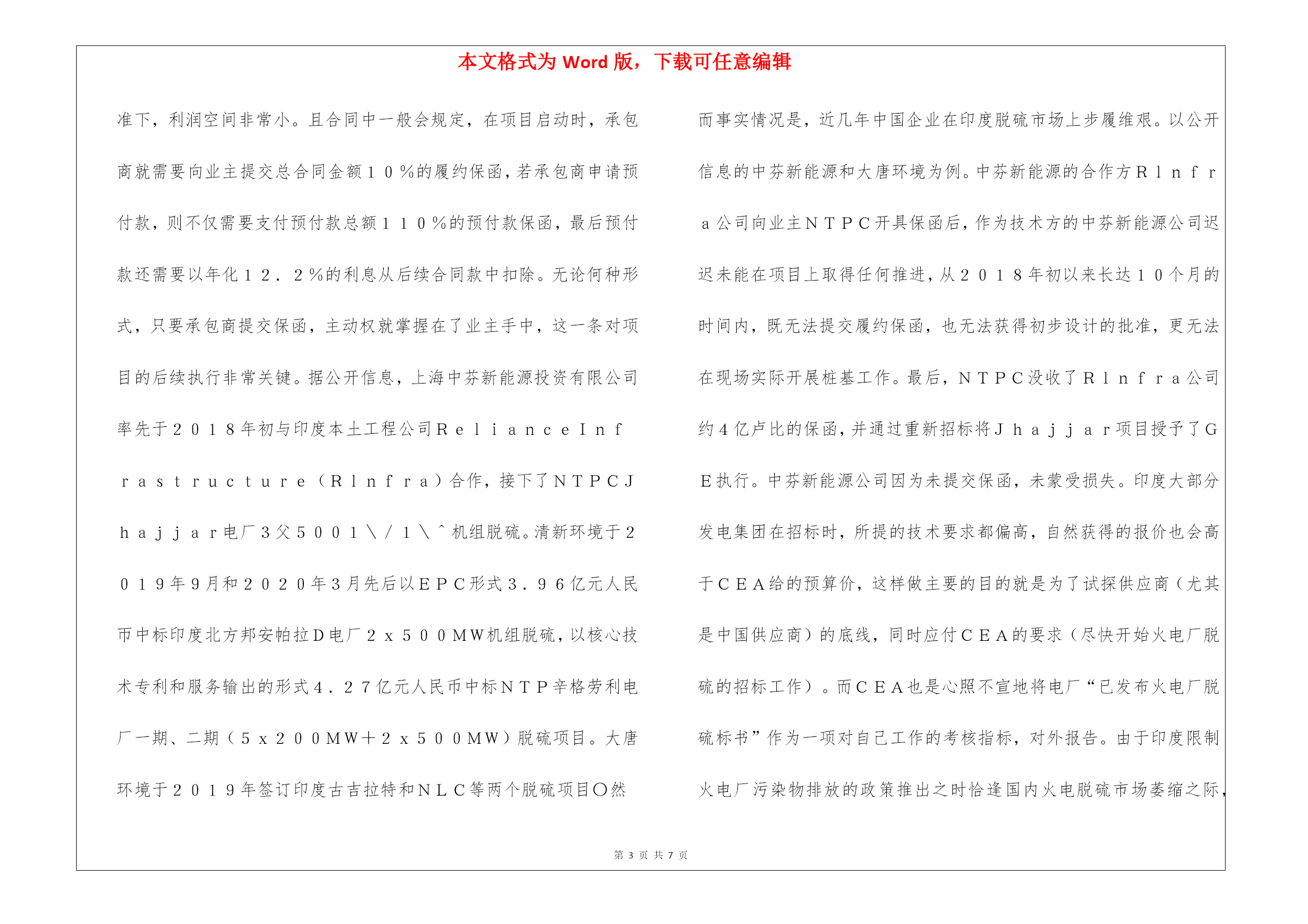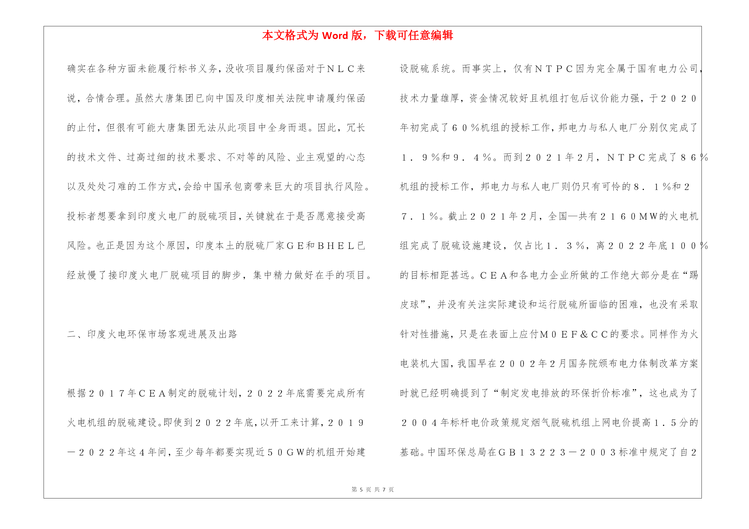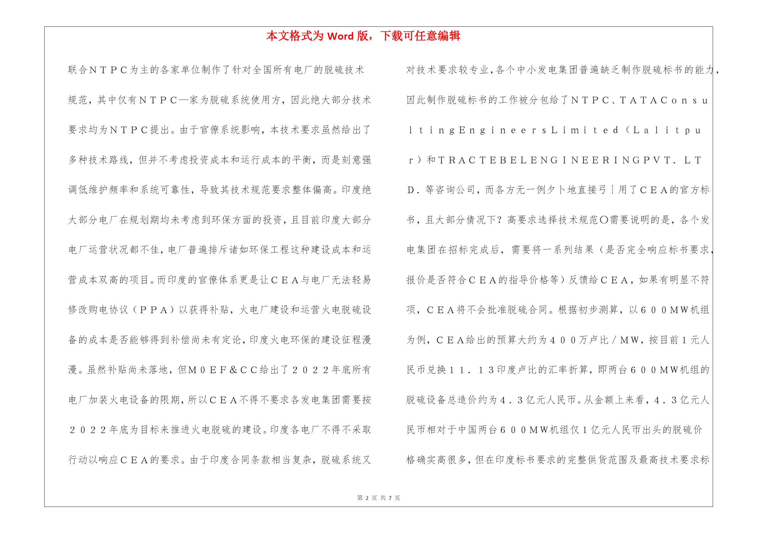 本文格式为Word版,下载可任意编辑第PAGE\*MERGEFORMAT7页共NUMPAGES\*MERGEFORMAT7页印度火电环保改造市场探析根据印度中央电力局(CEA)统计,截至到2021年2月,印度火电装机总量为201084.50MW,其中属于中央政府(NTPC)的容量有61250.00MW,属于各邦政府的容量有65661.50MW,属于私人的容量有74173.00MW。相较中国2020年底1245170MW的装机总量,印度的火电装机总量仅为中国的1/6。由于印度几乎所有火电厂均尚未建设烟气脱硫设备,其火电厂的S02排放量大大超过中国。印度燃煤电厂平均S02排放浓度约为1500mg/Nm3,而中国绝大部分燃煤电厂S02排放浓度低于35mg/Nm3,预计整个印度火电厂S02排放总量约为中国的7.1倍。巨大的火电厂502排放量给印度带来了严重的空气污染,造成了大量健康问题。印度环境、森林与气候变化部(MOEF&CC)于2015年颁布了火电厂环保相关法规,并要求印度所有火电厂执行。CEA_方面向下要求火电厂执行M0EF&CC的规定,另一方面向最高法院申诉,以时间紧迫及不符合印度现实情况为由,要求M0EF&CC修改环保法规并延长最终期限。一、印度业主火电脱硫招标、现状印度之前仅有两台火电机组配有石灰石石膏法脱硫设备,即Jhajjar电厂脱硫系统由远达设计,Cuddalore电厂脱硫系统由大唐环境设计,这两家电厂均属于私人企业。印度本土的国有电力集团NTPC、电力部CEA不具备火电厂脱硫系统审核、运行的经验,也缺乏完整的脱硫标书制作能力。NTPC旗下第一个火电脱硫机组为Vindhyachal电厂一合500MW机组的脱硫装置,由原Alstom(后被GE收购)提供,并于2018年完工。而在Vindhyachal电厂脱硫尚未成功投运的时候,CEA就联合NTPC为主的各家单位制作了针对全国所有电厂的脱硫技术规范,其中仅有NTPC—家为脱硫系统使用方,因此绝大部分技术要求均为NTPC提出。由于官僚系统影响,本技术要求虽然给出了多种技术路线,但并不考虑投资成本和运行成本的平衡,而是刻意强调低维护频率和系统可靠性,导致其技术规范要求整体偏高。印度绝大部分电厂在规划期均未考虑到环保方面的投资,且目前印度大部分电厂运营状况都不佳,电厂普遍排斥诸如环保工程这种建设成本和运营成本双高的项目。而印度的官僚体系更是让CEA与电厂无法轻易修改购电协议(PPA)以获得补贴,火电厂建设和运营火电脱硫设备的成本是否能够得到补偿尚未有定论,印度火电环保的建设征程漫漫。虽然补贴尚未落地,但M0EF&CC给出了2022年底所有电厂加装火电设备的限期,所以CEA不得不要求各发电集团需要按2022年底为目标来推进火电脱硫的建设。印度各电厂不得不采取行动以响应CEA的要求。由于印度合同条款相当复杂,脱硫系统又对技术要求较专业,各个中小发电集团普遍缺乏制作脱硫标书的能力,因此制作脱硫标书的工作被分包给了NTPC、TATAConsultingEngineersLimited(Lalitpur)和TRACTEBELENGINEERINGPVT.LTD.等咨询公司,而各方无一例夕卜地直接弓丨用了CEA的官方标书,且大部分倩况下?高要求选择技术规范〇需要说明的是,各个发电集团在招标完成后,需要将一系列结果(是否完全响应标书要求,报价是否符合CEA的指导价格等)反馈给CEA,如果有明显不符项,CEA将不会批准脱硫合同。根据初步测算,以600MW机组为例,CEA给出的预算大约为400万卢比/MW,按目前1元人民币兑换11.13印度卢比的汇率折算,即两台600MW机组的脱硫设备总造价约为4.3亿元人民帀。从金额上来看,4.3亿元人民帀相对于中国两台600MW机组仅1亿元人民帀出头的脱硫价格确实高很多,但在印度标书要求的完整供货范围及最高技术要求标准下,利润空间非常小。且合同中一般会规定,在项目启动时,承包商就需要向业主提交总合同金额10%的履约保函,若承包商申请预付款,则不仅需要支付预付款总额110%的预付款保函,最后预付款还需要以年化12.2%的利息从后续合同款中扣除。无论何种形式,只要承包商提交保函,主动权就掌握在了业主手中,这一条对项目的后续执行非常关键。据公开信息,上海中芬新能源投资有限公司率先于2018年初与印度本土工程公司RelianceInfrastructure(Rlnfra)合作,接下了NTPCJhajjar电厂3父5001\/1\^机组脱硫。清新环境于2019年9月和2020年3月先后以EPC形式3.96亿元人民帀中标印度北方邦安帕拉D电厂2x500MW机组脱硫,以核心技术专利和服务输出的形式4.27亿元人民币中标NTP辛格劳利电厂一期、二期(5x