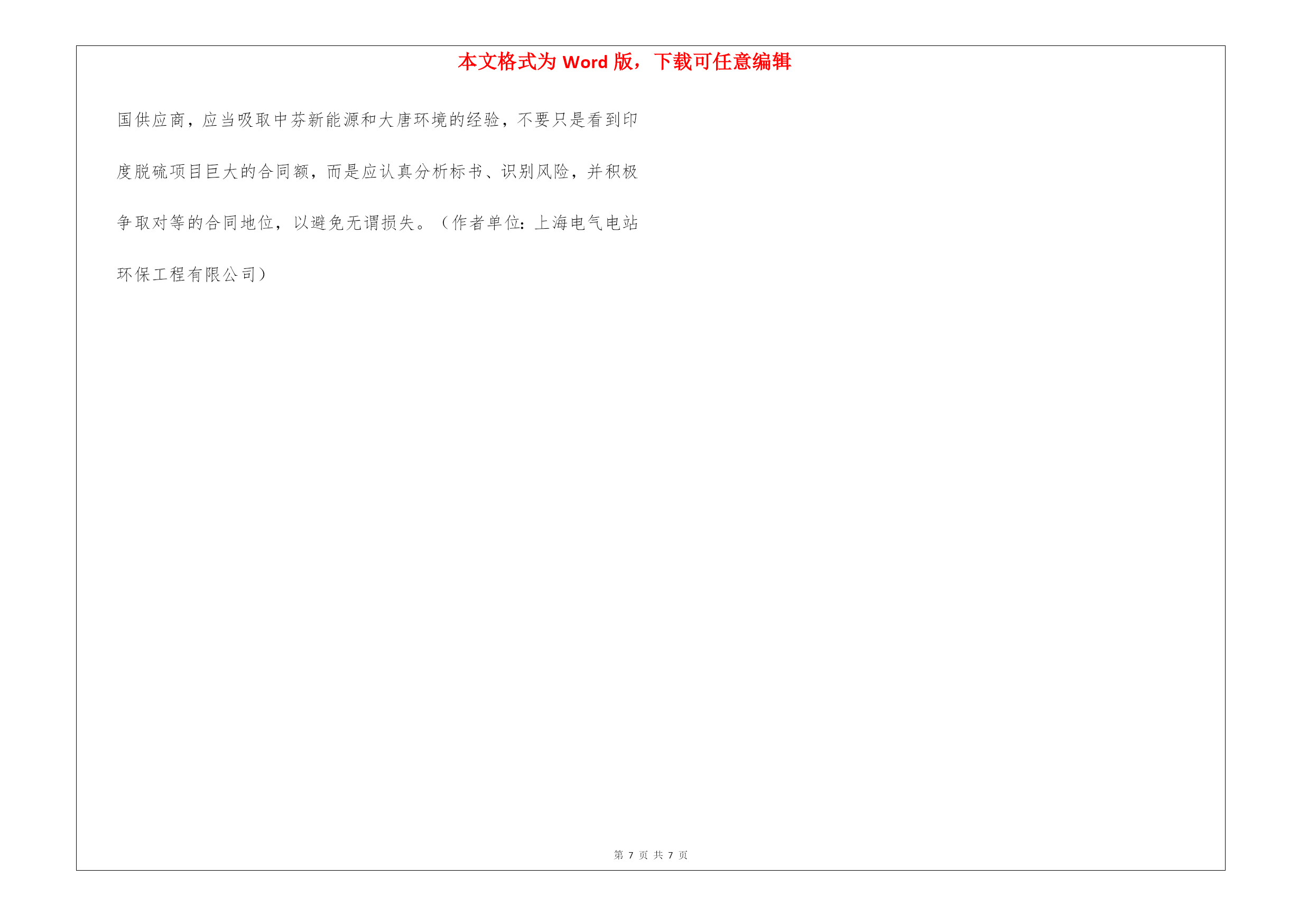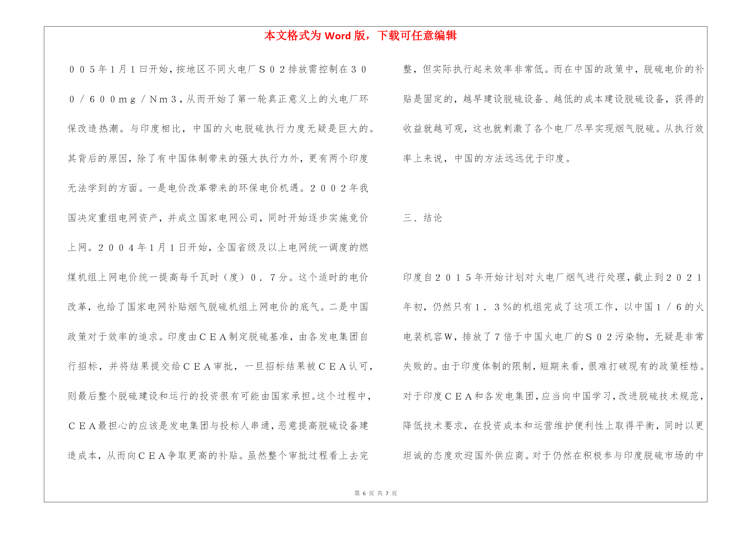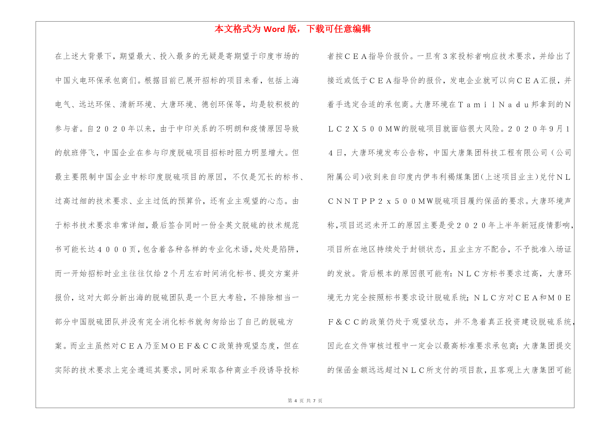 本文格式为Word版,下载可任意编辑第PAGE\*MERGEFORMAT7页共NUMPAGES\*MERGEFORMAT7页印度火电环保改造市场探析根据印度中央电力局(CEA)统计,截至到2021年2月,印度火电装机总量为201084.50MW,其中属于中央政府(NTPC)的容量有61250.00MW,属于各邦政府的容量有65661.50MW,属于私人的容量有74173.00MW。相较中国2020年底1245170MW的装机总量,印度的火电装机总量仅为中国的1/6。由于印度几乎所有火电厂均尚未建设烟气脱硫设备,其火电厂的S02排放量大大超过中国。印度燃煤电厂平均S02排放浓度约为1500mg/Nm3,而中国绝大部分燃煤电厂S02排放浓度低于35mg/Nm3,预计整个印度火电厂S02排放总量约为中国的7.1倍。巨大的火电厂502排放量给印度带来了严重的空气污染,造成了大量健康问题。印度环境、森林与气候变化部(MOEF&CC)于2015年颁布了火电厂环保相关法规,并要求印度所有火电厂执行。CEA_方面向下要求火电厂执行M0EF&CC的规定,另一方面向最高法院申诉,以时间紧迫及不符合印度现实情况为由,要求M0EF&CC修改环保法规并延长最终期限。一、印度业主火电脱硫招标、现状印度之前仅有两台火电机组配有石灰石石膏法脱硫设备,即Jhajjar电厂脱硫系统由远达设计,Cuddalore电厂脱硫系统由大唐环境设计,这两家电厂均属于私人企业。印度本土的国有电力集团NTPC、电力部CEA不具备火电厂脱硫系统审核、运行的经验,也缺乏完整的脱硫标书制作能力。NTPC旗下第一个火电脱硫机组为Vindhyachal电厂一合500MW机组的脱硫装置,由原Alstom(后被GE收购)提供,并于2018年完工。而在Vindhyachal电厂脱硫尚未成功投运的时候,CEA就联合NTPC为主的各家单位制作了针对全国所有电厂的脱硫技术规范,其中仅有NTPC—家为脱硫系统使用方,因此绝大部分技术要求均为NTPC提出。由于官僚系统影响,本技术要求虽然给出了多种技术路线,但并不考虑投资成本和运行成本的平衡,而是刻意强调低维护频率和系统可靠性,导致其技术规范要求整体偏高。印度绝大部分电厂在规划期均未考虑到环保方面的投资,且目前印度大部分电厂运营状况都不佳,电厂普遍排斥诸如环保工程这种建设成本和运营成本双高的项目。而印度的官僚体系更是让CEA与电厂无法轻易修改购电协议(PPA)以获得补贴,火电厂建设和运营火电脱硫设备的成本是否能够得到补偿尚未有定论,印度火电环保的建设征程漫漫。虽然补贴尚未落地,但M0EF&CC给出了2022年底所有电厂加装火电设备的限期,所以CEA不得不要求各发电集团需要按2022年底为目标来推进火电脱硫的建设。印度各电厂不得不采取行动以响应CEA的要求。由于印度合同条款相当复杂,脱硫系统又对技术要求较专业,各个中小发电集团普遍缺乏制作脱硫标书的能力,因此制作脱硫标书的工作被分包给了NTPC、TATAConsultingEngineersLimited(Lalitpur)和TRACTEBELENGINEERINGPVT.LTD.等咨询公司,而各方无一例夕卜地直接弓丨用了CEA的官方标书,且大部分倩况下?高要求选择技术规范〇需要说明的是,各个发电集团在招标完成后,需要将一系列结果(是否完全响应标书要求,报价是否符合CEA的指导价格等)反馈给CEA,如果有明显不符项,CEA将不会批准脱硫合同。根据初步测算,以600MW机组为例,CEA给出的预算大约为400万卢比/MW,按目前1元人民币兑换11.13印度卢比的汇率折算,即两台600MW机组的脱硫设备总造价约为4.3亿元人民帀。从金额上来看,4.3亿元人民帀相对于中国两台600MW机组仅1亿元人民帀出头的脱硫价格确实高很多,但在印度标书要求的完整供货范围及最高技术要求标准下,利润空间非常小。且合同中一般会规定,在项目启动时,承包商就需要向业主提交总合同金额10%的履约保函,若承包商申请预付款,则不仅需要支付预付款总额110%的预付款保函,最后预付款还需要以年化12.2%的利息从后续合同款中扣除。无论何种形式,只要承包商提交保函,主动权就掌握在了业主手中,这一条对项目的后续执行非常关键。据公开信息,上海中芬新能源投资有限公司率先于2018年初与印度本土工程公司RelianceInfrastructure(Rlnfra)合作,接下了NTPCJhajjar电厂3父5001\/1\^机组脱硫。清新环境于2019年9月和2020年3月先后以EPC形式3.96亿元人民帀中标印度北方邦安帕拉D电厂2x500MW机组脱硫,以核心技术专利和服务输出的形式4.27亿元人民币中标NTP辛格劳利电厂一期、二期(5x