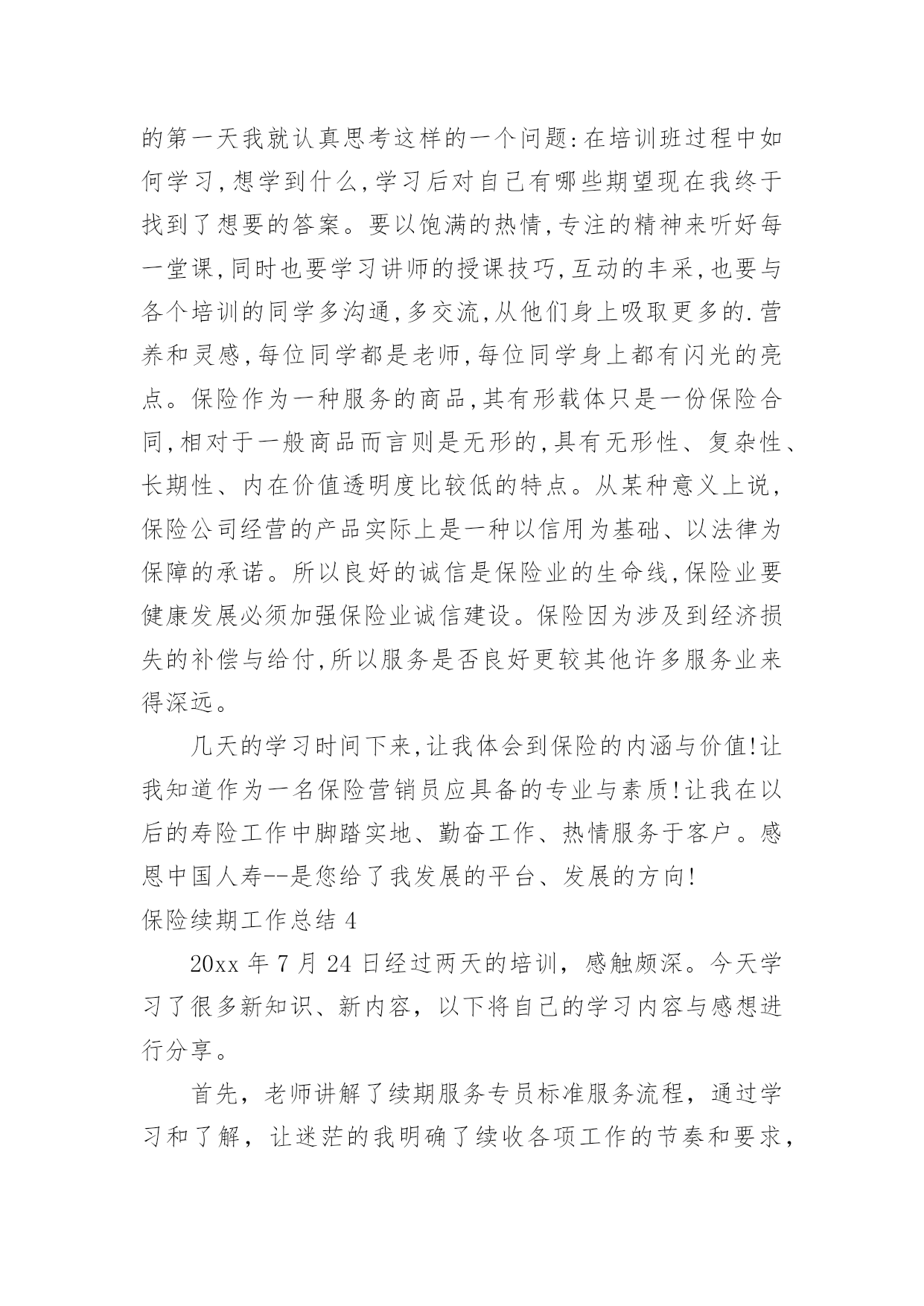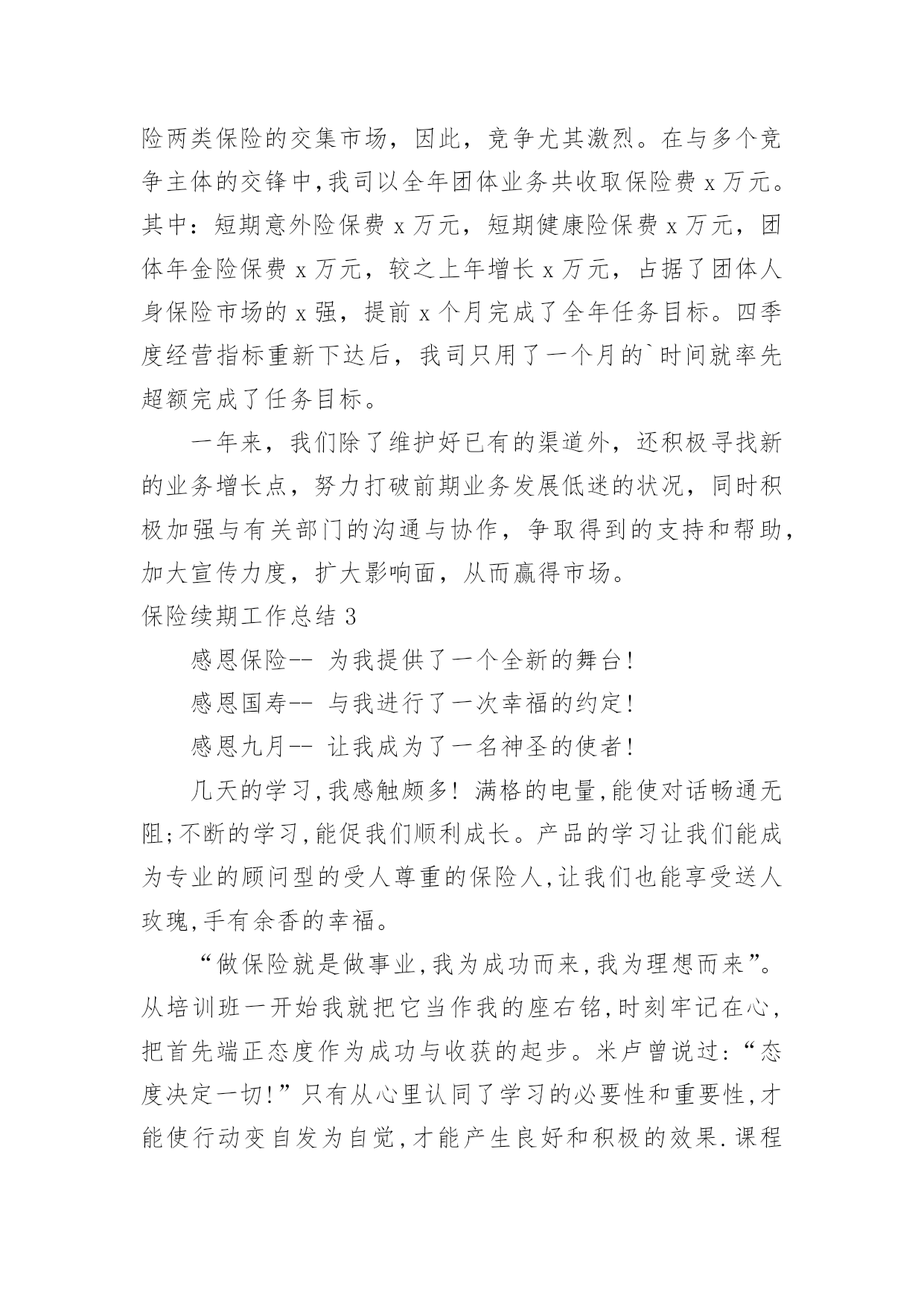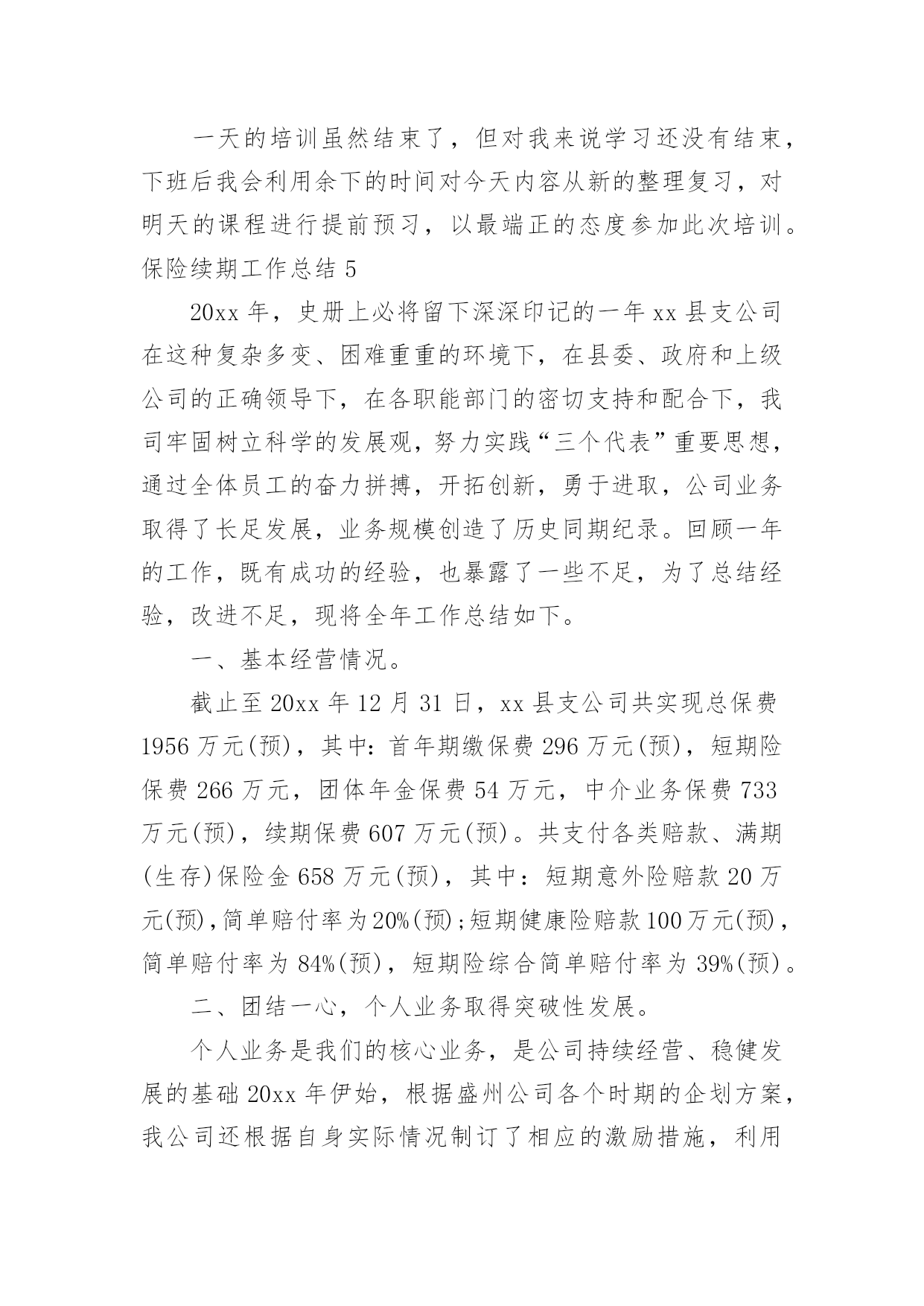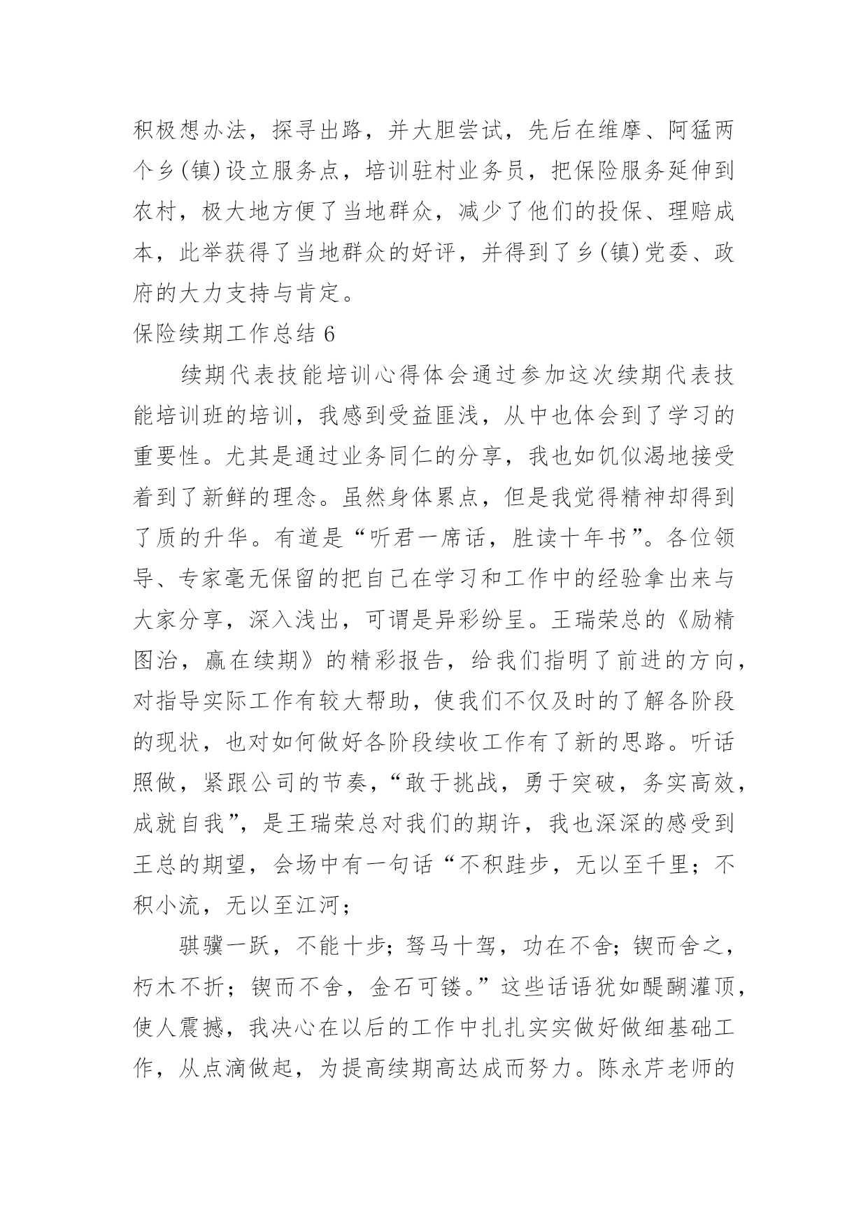 保险续期工作总结保险续期工作总结总结是把一定阶段内的有关情况分析研究,做出有指导性的经验方法以及结论的书面材料,它能帮我们理顺知识结构,突出重点,突破难点,为此我们要做好回顾,写好总结。我们该怎么去写总结呢?以下是小编为大家整理的保险续期工作总结,仅供参考,大家一起来看看吧。保险续期工作总结120xx年7月23日我有幸参加了太平人寿保险有限公司牡丹江支公司的续期专员学习培训。在今天的培训中,我感受深刻,收获极大。首先,从课程的安排上我觉得十分合理,针对性极强,为即将入司的我安排了为期半个月的学习。学习内容由浅入深,有公司发展现状、达成率与继续率的计算、产品学习、基本保全知识、续期服务专员标准服务流程、面访流程等全面的学习课程。让我对自己即将着手的工作有了一个整体的定位和梳理。其次,老师生动的讲解也给我带来了生动、轻松的感觉。即学到了知识,又感觉到了一种愉快的氛围。在本次培训中,学习了这么多,我感受最深的几点分享一下,一是公司的发展现状与前景展望,公司的发展史让我深入的了解了太平人寿的品牌历史、发展愿景及经营理念。认真学习之后我感到即将成为太平人寿保险有限公司这样的央企之中的一员非常的荣幸,十分坚信太平会为我提供一个非常好的平台,让我在这个舞台上发挥自己的所长。二是学习了续期的基础知识,学习并掌握了达成率与继续率的计算方法,代理人继续率奖金的计算。通过讲解,体会到了续期的真正含义。对续期的认识又提高了一个层次,让我对续期工作产生了浓重的兴趣,同时也给我指明了工作方向,对即将接手的工作有了一个新的理解。三是学习了续期的定位、发展历程及工作模式的分析和讲解,课件非常精彩,看过了黑分公司续收系列的发展历程及各位续收精英的努力成果,让我对于从事续期服务专员增加了很大的信心,从而在心里非常认同此次学习的重要性和必要性。希望在接下来几天的学习中理论结合实践、不断扎实自己,查缺补漏这样才能帮助我在后期的续期服务工作中奠定良好的基础,点滴良好的习惯养成至关重要,因此我决定在今后的学习工作中不断的自我提高,端正自己的.工作态度,虚心学习各位前辈总结的经验,扎扎实实的学习,从点滴做起,为提高续期达成而努力。今天的学习虽然结束了,但是学习后让我迸发的对工作的激情,感受到对未来蓬勃的希望,我愿意做一个有想法、有激情、有追求的太平人,感谢公司给了我这次学习的机会,学习能让人进步,工作能让人自信。很庆幸自己能有一次这样的学习机会,希望能够更快的融入这个续收团队中来,从而胜任续期工作。保险续期工作总结2一、团结一心,个人业务取得突破性发展个人业务是我们的核心业务,是公司持续经营、稳健发展的基础。20xx年伊始,根据省、州公司各个时期的企划方案,我公司还根据自身实际情况制订了相应的激励措施,利用“产说会”、“客户答谢会”等多种销售模式,抓住“金彩明天”等新险种强势上市的有利契机,全体员工斗志昂扬、挥洒汗水,经过辛勤的耕耘,终于取得了丰硕的成果。四季度,全体营销干将更是鼓足干劲,振奋精神,奋勇前进。有2位伙伴更是跻身全省前200名销售精英的行列,获得了省公司笔记本电脑大奖,这不仅仅是物质上的奖励,更是对我们辛勤付出的肯定,为我们树立了新的榜样。核心业务的迅猛发展,背后要有一支强有力的核心队伍作为支撑。公司一开始就加大了队伍建设力度,邀请全国销售精英进行技能提升培训、重金聘请北京专家进行增员指导,把展业和增员结合起来,通过增员来推动业务发展,通过业务发展带来的实惠来带动增员。我们各级主管也付出了大量辛勤的劳动,他们无时无刻不在关注着自己的属员,帮其解困、助其成长、让其心安,正是他们无私而伟大的博爱精神,让我们的员工感觉到了公司的温暖,做到了有爱留人。目前,全司员工已达x人,为历年之最,并且我们队伍仍然在继续发展壮大。二、奋勇拼搏,团体业务稳中有升团体业务是公司经营成效体现的重要指标,也是产、寿险两类保险的交集市场,因此,竞争尤其激烈。在与多个竞争主体的交锋中,我司以全年团体业务共收取保险费x万元。其中:短期意外险保费x万元,短期健康险保费x万元,团体年金险保费x万元,较之上年增长x万元,占据了团体人身保险市场的x强,提前x个月完成了全年任务目标。四季度经营指标重新下达后,我司只用了一个月的`时间就率先超额完成了任务目标。一年来,我们除了维护好已有的渠道外,还积极寻找新的业务增长点,努力打破前期业务发展低迷的状况,同时积极加强与有关部门的沟通与协作,争取得到的支持和帮助,加大宣传力度,扩大影响面,从而赢得市场。保险续期工作总结3感恩保险--为我提供了一个全新的舞台!感恩国寿--与我进行了一次幸福的约定!感恩九月--让我成为了一名神圣的使者!几天的学习,我感触颇多!满格的电量,能使对话畅通无阻;不断的学习,能促我们顺利成长。产品的学习让我们能成为专业的顾问型的受人