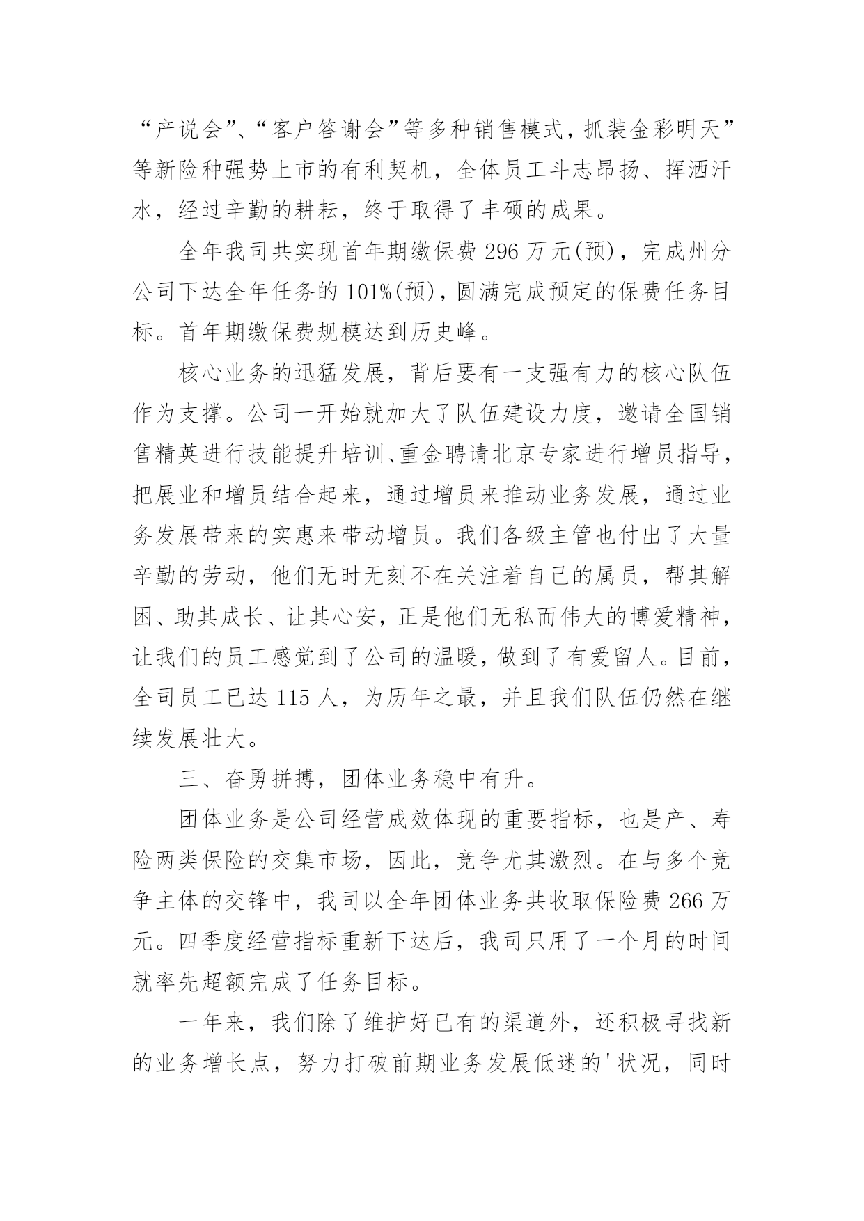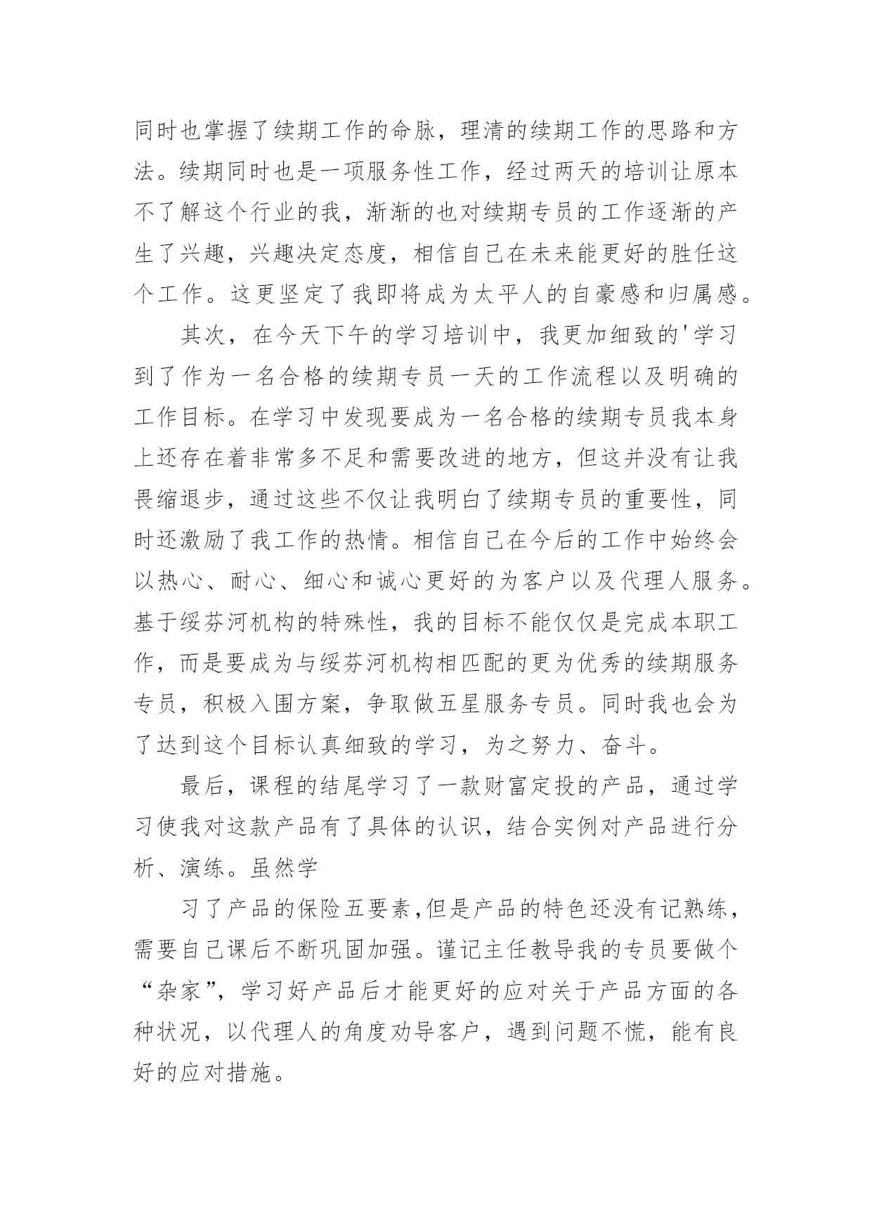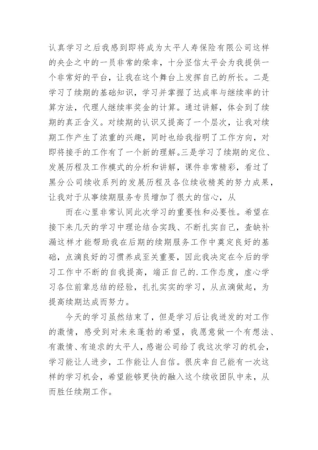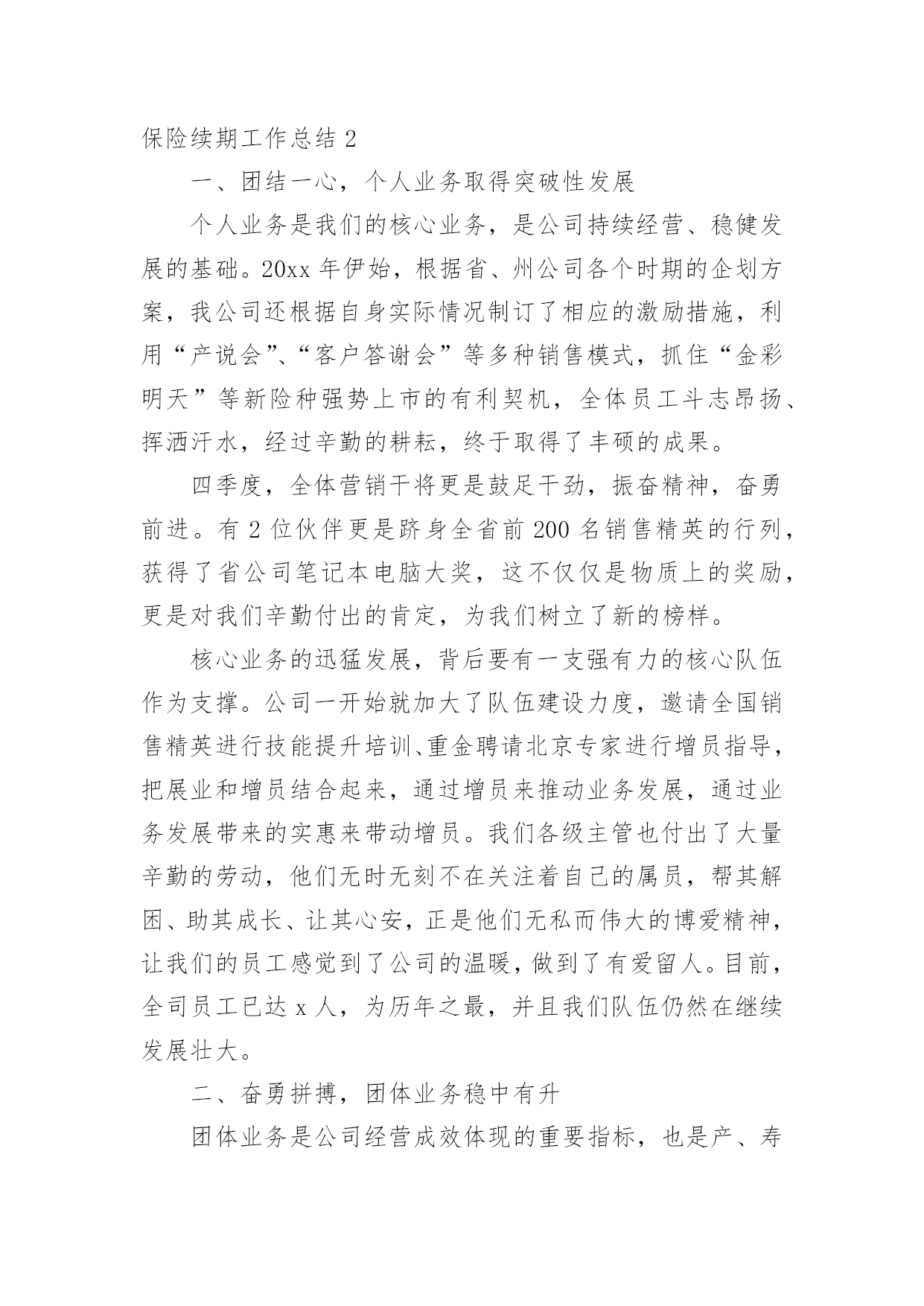 保险续期工作总结保险续期工作总结总结是把一定阶段内的有关情况分析研究,做出有指导性的经验方法以及结论的书面材料,它能帮我们理顺知识结构,突出重点,突破难点,为此我们要做好回顾,写好总结。我们该怎么去写总结呢?以下是小编为大家整理的保险续期工作总结,仅供参考,大家一起来看看吧。保险续期工作总结120xx年7月23日我有幸参加了太平人寿保险有限公司牡丹江支公司的续期专员学习培训。在今天的培训中,我感受深刻,收获极大。首先,从课程的安排上我觉得十分合理,针对性极强,为即将入司的我安排了为期半个月的学习。学习内容由浅入深,有公司发展现状、达成率与继续率的计算、产品学习、基本保全知识、续期服务专员标准服务流程、面访流程等全面的学习课程。让我对自己即将着手的工作有了一个整体的定位和梳理。其次,老师生动的讲解也给我带来了生动、轻松的感觉。即学到了知识,又感觉到了一种愉快的氛围。在本次培训中,学习了这么多,我感受最深的几点分享一下,一是公司的发展现状与前景展望,公司的发展史让我深入的了解了太平人寿的品牌历史、发展愿景及经营理念。认真学习之后我感到即将成为太平人寿保险有限公司这样的央企之中的一员非常的荣幸,十分坚信太平会为我提供一个非常好的平台,让我在这个舞台上发挥自己的所长。二是学习了续期的基础知识,学习并掌握了达成率与继续率的计算方法,代理人继续率奖金的计算。通过讲解,体会到了续期的真正含义。对续期的认识又提高了一个层次,让我对续期工作产生了浓重的兴趣,同时也给我指明了工作方向,对即将接手的工作有了一个新的理解。三是学习了续期的定位、发展历程及工作模式的分析和讲解,课件非常精彩,看过了黑分公司续收系列的发展历程及各位续收精英的努力成果,让我对于从事续期服务专员增加了很大的信心,从而在心里非常认同此次学习的重要性和必要性。希望在接下来几天的学习中理论结合实践、不断扎实自己,查缺补漏这样才能帮助我在后期的续期服务工作中奠定良好的基础,点滴良好的习惯养成至关重要,因此我决定在今后的学习工作中不断的自我提高,端正自己的.工作态度,虚心学习各位前辈总结的经验,扎扎实实的学习,从点滴做起,为提高续期达成而努力。今天的学习虽然结束了,但是学习后让我迸发的对工作的激情,感受到对未来蓬勃的希望,我愿意做一个有想法、有激情、有追求的太平人,感谢公司给了我这次学习的机会,学习能让人进步,工作能让人自信。很庆幸自己能有一次这样的学习机会,希望能够更快的融入这个续收团队中来,从而胜任续期工作。保险续期工作总结2一、团结一心,个人业务取得突破性发展个人业务是我们的核心业务,是公司持续经营、稳健发展的基础。20xx年伊始,根据省、州公司各个时期的企划方案,我公司还根据自身实际情况制订了相应的激励措施,利用“产说会”、“客户答谢会”等多种销售模式,抓住“金彩明天”等新险种强势上市的有利契机,全体员工斗志昂扬、挥洒汗水,经过辛勤的耕耘,终于取得了丰硕的成果。四季度,全体营销干将更是鼓足干劲,振奋精神,奋勇前进。有2位伙伴更是跻身全省前200名销售精英的行列,获得了省公司笔记本电脑大奖,这不仅仅是物质上的奖励,更是对我们辛勤付出的肯定,为我们树立了新的榜样。核心业务的迅猛发展,背后要有一支强有力的核心队伍作为支撑。公司一开始就加大了队伍建设力度,邀请全国销售精英进行技能提升培训、重金聘请北京专家进行增员指导,把展业和增员结合起来,通过增员来推动业务发展,通过业务发展带来的实惠来带动增员。我们各级主管也付出了大量辛勤的劳动,他们无时无刻不在关注着自己的属员,帮其解困、助其成长、让其心安,正是他们无私而伟大的博爱精神,让我们的员工感觉到了公司的温暖,做到了有爱留人。目前,全司员工已达x人,为历年之最,并且我们队伍仍然在继续发展壮大。二、奋勇拼搏,团体业务稳中有升团体业务是公司经营成效体现的重要指标,也是产、寿险两类保险的交集市场,因此,竞争尤其激烈。在与多个竞争主体的交锋中,我司以全年团体业务共收取保险费x万元。其中:短期意外险保费x万元,短期健康险保费x万元,团体年金险保费x万元,较之上年增长x万元,占据了团体人身保险市场的x强,提前x个月完成了全年任务目标。四季度经营指标重新下达后,我司只用了一个月的`时间就率先超额完成了任务目标。一年来,我们除了维护好已有的渠道外,还积极寻找新的业务增长点,努力打破前期业务发展低迷的状况,同时积极加强与有关部门的沟通与协作,争取得到的支持和帮助,加大宣传力度,扩大影响面,从而赢得市场。保险续期工作总结3感恩保险--为我提供了一个全新的舞台!感恩国寿--与我进行了一次幸福的约定!感恩九月--让我成为了一名神圣的使者!几天的学习,我感触颇多!满格的电量,能使对话畅通无阻;不断的学习,能促我们顺利成长。产品的学习让我们能成为专业的顾问型的受人