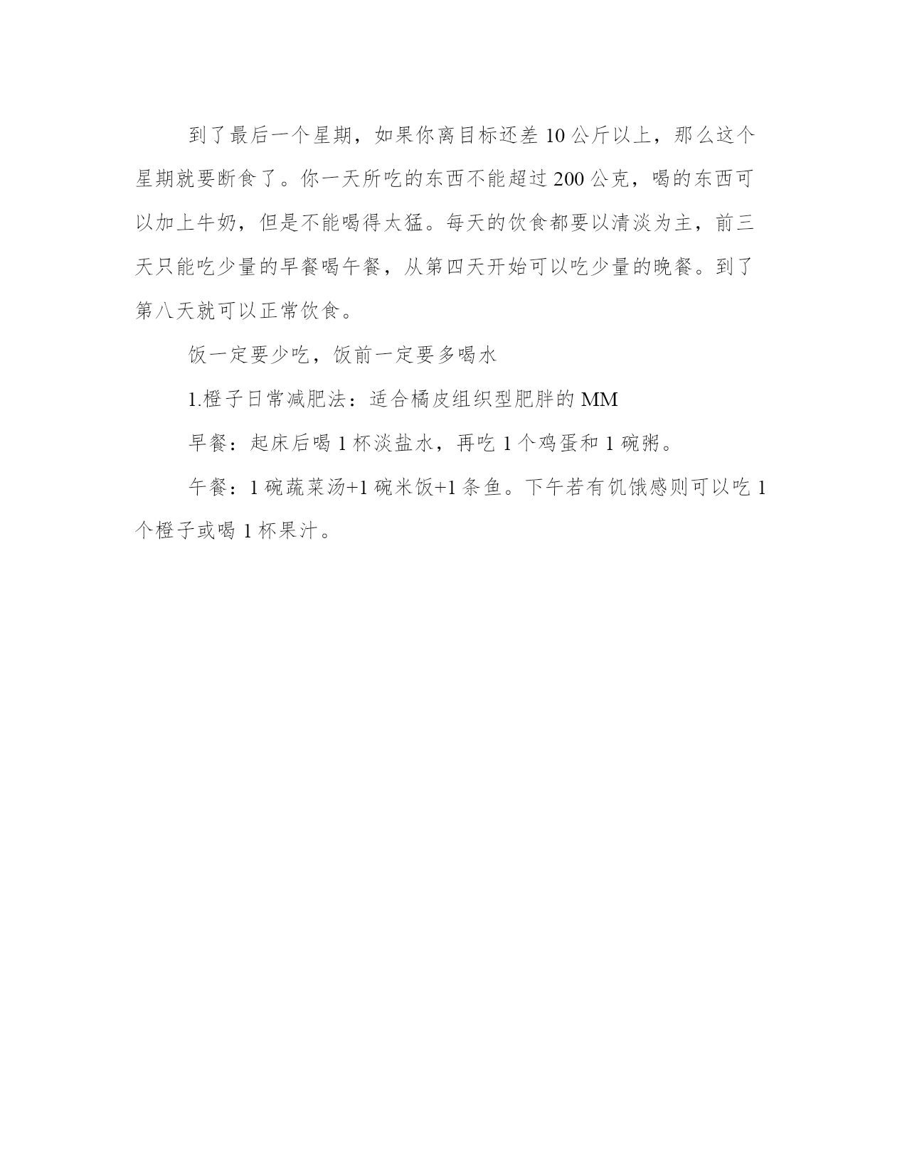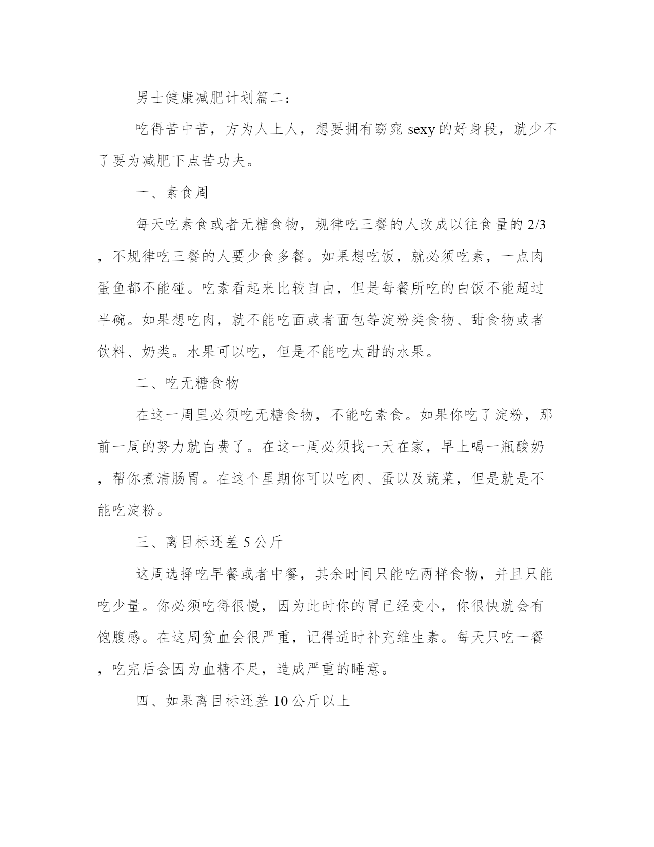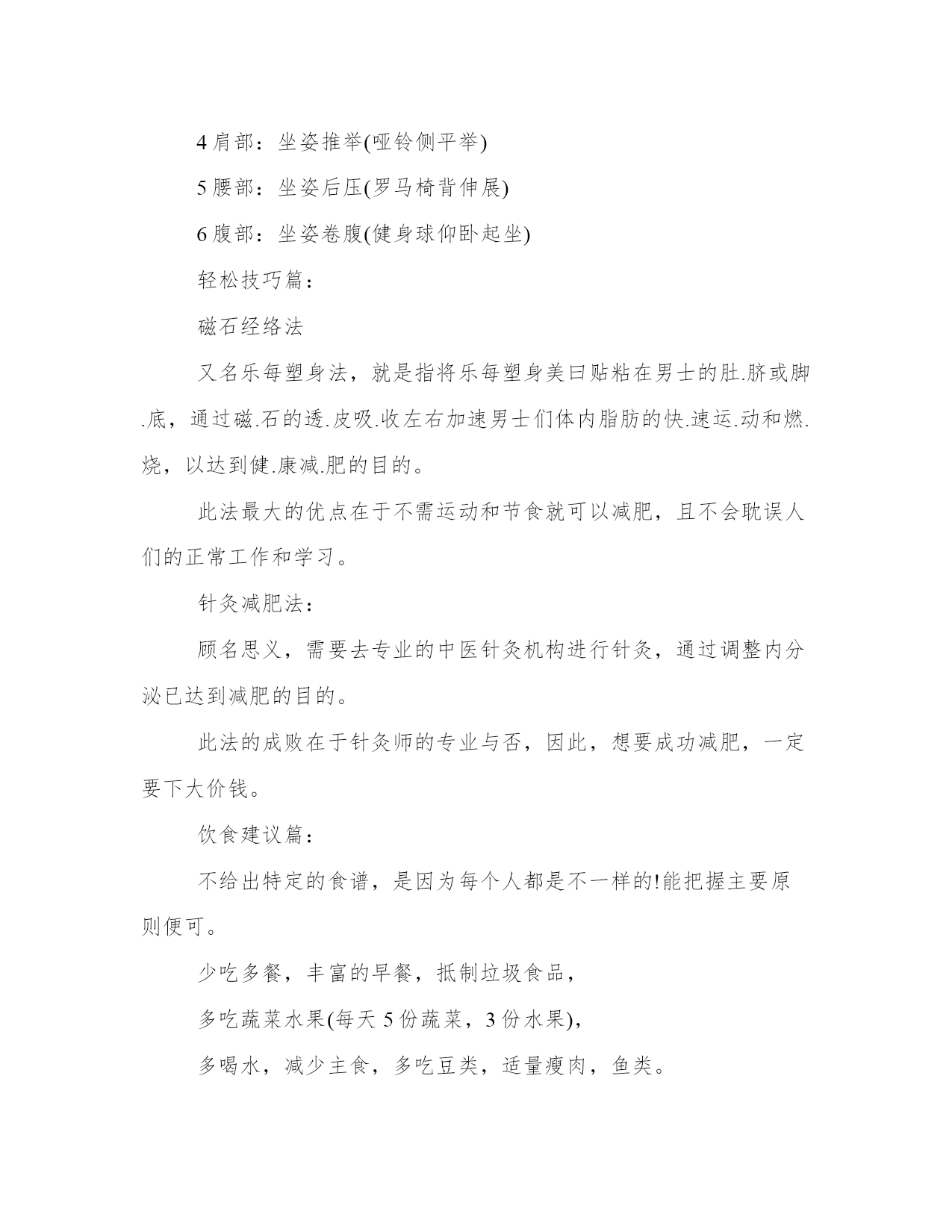 男士健康减肥计划男士健康减肥计划篇一:实打实运动篇:健身训练:1热身运动:5到10分钟,微微有些出汗即可,可采用:固定自行车;2力量训练:30分钟,增加热量消耗,提高新陈代谢,采用:组合器械(详见力量训练);3有氧训练:20分钟,这时直接调动脂肪燃烧,采用:在跑步机上快走,心率达到133下;4抻拉放松:5到10分钟,柔韧性训练,放松全身肌肉,让心率恢复正常,采用:垫上动作.注:上面的计划1周3次,隔天进行,每次1个小时左右即可(紧凑高效).力量训练:控制在30分钟左右,每个部位1个动作,每个动作做3组,每组15次,括号里为备选动作.1胸部:坐姿推胸(俯卧撑)2背部:坐姿划船(颈前下拉)3腿部:坐姿蹬腿(坐姿腿屈伸)4肩部:坐姿推举(哑铃侧平举)5腰部:坐姿后压(罗马椅背伸展)6腹部:坐姿卷腹(健身球仰卧起坐)轻松技巧篇:磁石经络法又名乐每塑身法,就是指将乐每塑身美曰贴粘在男士的肚.脐或脚.底,通过磁.石的透.皮吸.收左右加速男士们体内脂肪的快.速运.动和燃.烧,以达到健.康减.肥的目的。此法最大的优点在于不需运动和节食就可以减肥,且不会耽误人们的正常工作和学习。针灸减肥法:顾名思义,需要去专业的中医针灸机构进行针灸,通过调整内分泌已达到减肥的目的。此法的成败在于针灸师的专业与否,因此,想要成功减肥,一定要下大价钱。饮食建议篇:不给出特定的食谱,是因为每个人都是不一样的!能把握主要原则便可。少吃多餐,丰富的早餐,抵制垃圾食品,多吃蔬菜水果(每天5份蔬菜,3份水果),多喝水,减少主食,多吃豆类,适量瘦肉,鱼类。男士健康减肥计划篇二:吃得苦中苦,方为人上人,想要拥有窈窕sexy的好身段,就少不了要为减肥下点苦功夫。一、素食周每天吃素食或者无糖食物,规律吃三餐的人改成以往食量的2/3,不规律吃三餐的人要少食多餐。如果想吃饭,就必须吃素,一点肉蛋鱼都不能碰。吃素看起来比较自由,但是每餐所吃的白饭不能超过半碗。如果想吃肉,就不能吃面或者面包等淀粉类食物、甜食物或者饮料、奶类。水果可以吃,但是不能吃太甜的水果。二、吃无糖食物在这一周里必须吃无糖食物,不能吃素食。如果你吃了淀粉,那前一周的努力就白费了。在这一周必须找一天在家,早上喝一瓶酸奶,帮你煮清肠胃。在这个星期你可以吃肉、蛋以及蔬菜,但是就是不能吃淀粉。三、离目标还差5公斤这周选择吃早餐或者中餐,其余时间只能吃两样食物,并且只能吃少量。你必须吃得很慢,因为此时你的胃已经变小,你很快就会有饱腹感。在这周贫血会很严重,记得适时补充维生素。每天只吃一餐,吃完后会因为血糖不足,造成严重的睡意。四、如果离目标还差10公斤以上到了最后一个星期,如果你离目标还差10公斤以上,那么这个星期就要断食了。你一天所吃的东西不能超过200公克,喝的东西可以加上牛奶,但是不能喝得太猛。每天的饮食都要以清淡为主,前三天只能吃少量的早餐喝午餐,从第四天开始可以吃少量的晚餐。到了第八天就可以正常饮食。饭一定要少吃,饭前一定要多喝水1.橙子日常减肥法:适合橘皮组织型肥胖的MM早餐:起床后喝1杯淡盐水,再吃1个鸡蛋和1碗粥。午餐:1碗蔬菜汤+1碗米饭+1条鱼。下午若有饥饿感则可以吃1个橙子或喝1杯果汁。