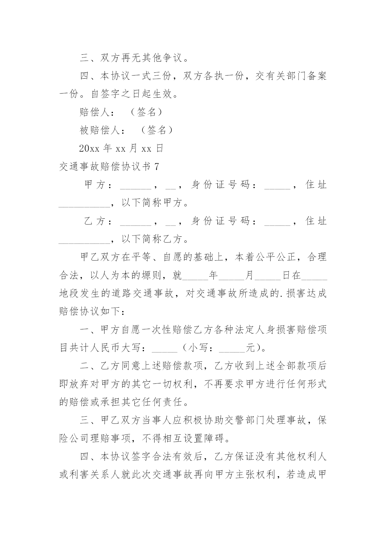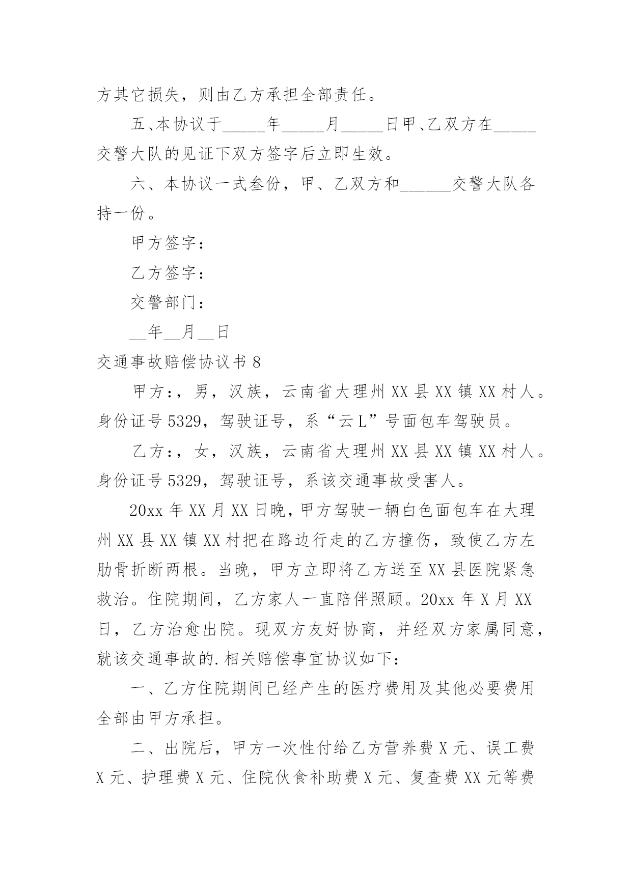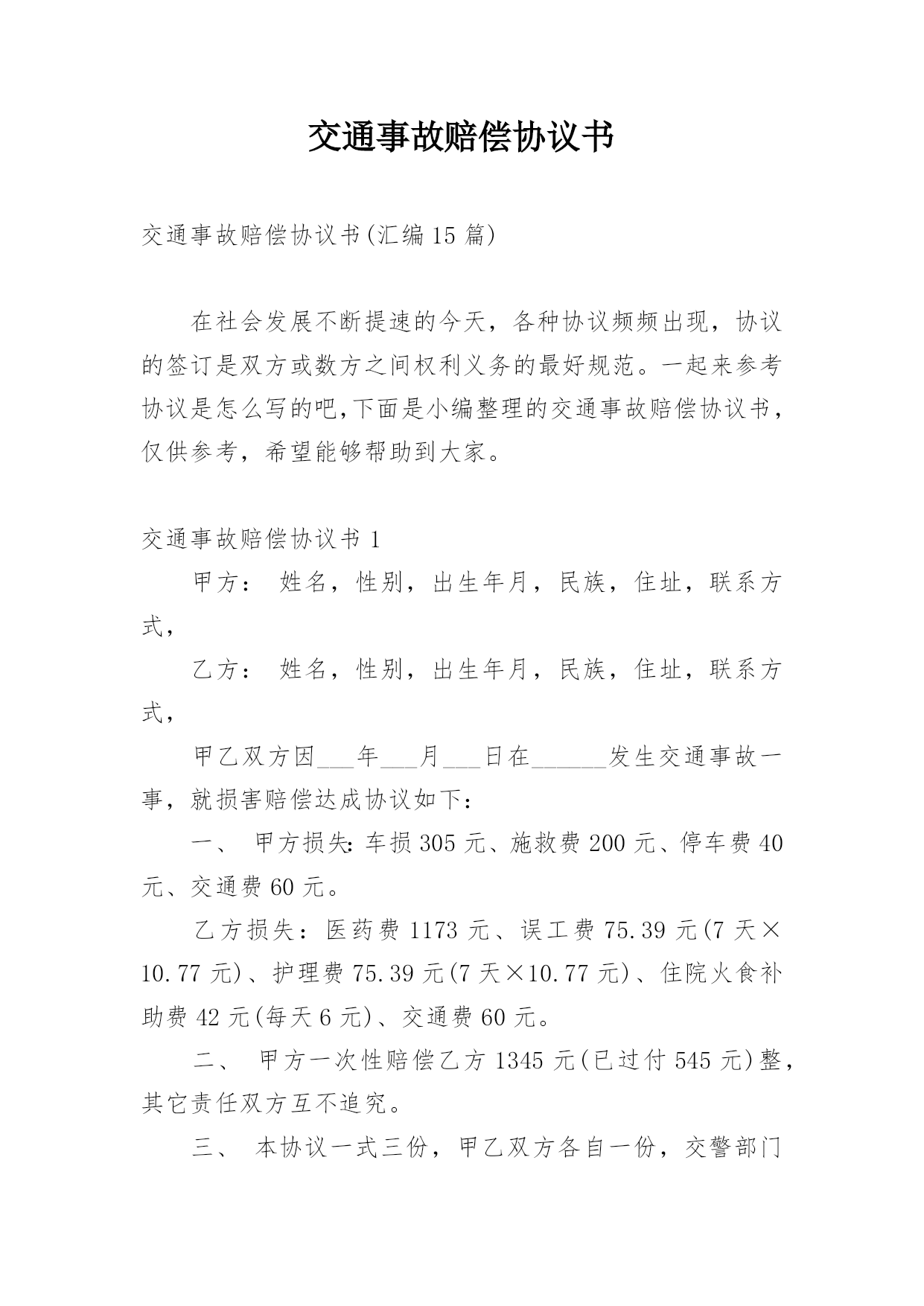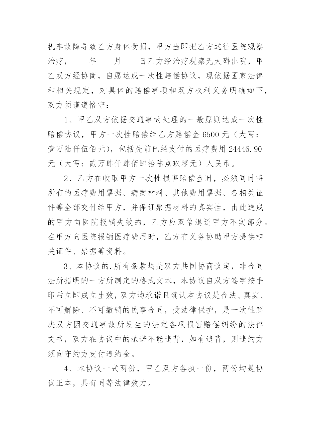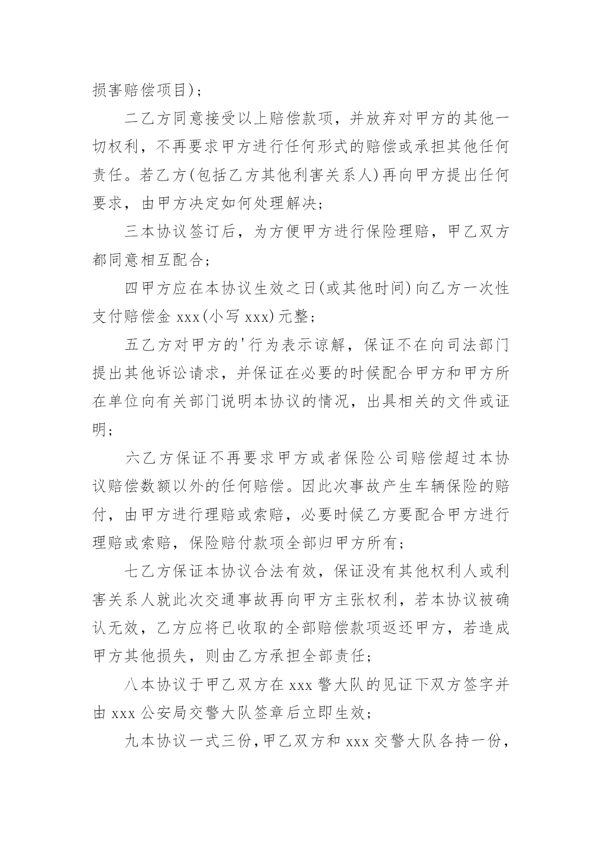 交通事故赔偿协议书交通事故赔偿协议书(汇编15篇)在社会发展不断提速的今天,各种协议频频出现,协议的签订是双方或数方之间权利义务的最好规范。一起来参考协议是怎么写的吧,下面是小编整理的交通事故赔偿协议书,仅供参考,希望能够帮助到大家。交通事故赔偿协议书1甲方:姓名,性别,出生年月,民族,住址,联系方式,乙方:姓名,性别,出生年月,民族,住址,联系方式,甲乙双方因___年___月___日在______发生交通事故一事,就损害赔偿达成协议如下:一、甲方损失:车损305元、施救费200元、停车费40元、交通费60元。乙方损失:医药费1173元、误工费75.39元(7天×10.77元)、护理费75.39元(7天×10.77元)、住院火食补助费42元(每天6元)、交通费60元。二、甲方一次性赔偿乙方1345元(已过付545元)整,其它责任双方互不追究。三、本协议一式三份,甲乙双方各自一份,交警部门备案一份。本协议经双方代表签字后生效。甲方:签字(身份证号)乙方:签字(身份证号)____年___月___日交通事故赔偿协议书2甲方(赔偿义务人):姓名性别年龄现住址身份证号码乙方(赔偿权利人):姓名性别年龄住址身份证号码年月日,甲方驾驶xxx车辆到xxx路段(可详细说明)与受害人乙方发生碰撞,至受害人xxx。甲乙双方在平等自愿的基础上于审理人身损害赔偿案件适用法律若干问题的解释》的规定,xxx公安局xxx交警大队的见证下,就交通事故所造成的损害达成赔偿协议如下:一甲方自愿一次性赔偿乙方各种法定人身损害赔偿项目共计xxx元(小写xxx元)整。(可写明具体各项法定人身损害赔偿项目);二乙方同意接受以上赔偿款项,并放弃对甲方的其他一切权利,不再要求甲方进行任何形式的赔偿或承担其他任何责任。若乙方(包括乙方其他利害关系人)再向甲方提出任何要求,由甲方决定如何处理解决;三本协议签订后,为方便甲方进行保险理赔,甲乙双方都同意相互配合;四甲方应在本协议生效之日(或其他时间)向乙方一次性支付赔偿金xxx(小写xxx)元整;五乙方对甲方的'行为表示谅解,保证不在向司法部门提出其他诉讼请求,并保证在必要的时候配合甲方和甲方所在单位向有关部门说明本协议的情况,出具相关的文件或证明;六乙方保证不再要求甲方或者保险公司赔偿超过本协议赔偿数额以外的任何赔偿。因此次事故产生车辆保险的赔付,由甲方进行理赔或索赔,必要时候乙方要配合甲方进行理赔或索赔,保险赔付款项全部归甲方所有;七乙方保证本协议合法有效,保证没有其他权利人或利害关系人就此次交通事故再向甲方主张权利,若本协议被确认无效,乙方应将已收取的全部赔偿款项返还甲方,若造成甲方其他损失,则由乙方承担全部责任;八本协议于甲乙双方在xxx警大队的见证下双方签字并由xxx公安局交警大队签章后立即生效;九本协议一式三份,甲乙双方和xxx交警大队各持一份,同等效力。甲方:乙方:年月日交通事故赔偿协议书3交通事故死亡赔偿协议书范本甲方:乙方:(以上均写明、姓名、性别、出生年月日、民族、职业、住址、电话)年月日时分,于xx驾驶小客车(内乘王XX、王x)由西向东行至xxxx市xx区xx与xx国道交叉口西xxx公里处时,车辆驶入路北侧与路树相撞,造成xxxx抢救无效死亡。现XX(甲方)与XX(乙方)的.xxx名近亲属(乙方)就XX死亡赔偿事宜,本着平等、自愿、公平原则,经友好协商,达成如下协议:一、甲方一次性支付给乙方六人死亡赔偿金、被扶养人生活费等共计xxxx万元(未包括丧葬费,丧葬费壹万五仟元已经在本协议签定前由甲方XX支付给了乙方XX的哥哥XX)。二、甲方将上述xxxx万元于本协议签订后日内汇入乙方六人共同指定的银行帐号。帐号为:三、上述费用支付给乙方六人后,由乙方六人内部自行分配、处理,其分配、处理的方式、后果与甲方无关。四、甲方履行汇款义务后,乙方任何一人就此事保证不以任何形式、任何理由就xx死亡一事向甲方要求其他任何费用。五、甲方履行汇款义务后,就此事处理即告终结,甲乙双方之间不再有任何权利、义务。以后因此事衍生的结果亦由乙方自行承担,甲方对此不再承担任何职责。六、本协议为双方平等、自愿协商之结果,是双方真实意思表示,且公平、合理。七、本协议资料甲乙双方共七人已经全文阅读并理解无误,甲乙双方共七人明白本协议所涉及后果,甲乙双方对此协议处理结果完全满意。八、本协议为一次性终结处理协议,九、本协议自甲乙双方共七人签字时生效。本协议一式七份,甲乙双方每人各执一份。甲方:乙方:年月日交通事故赔偿协议书4甲方:_____,男,汉族,云南省大理州_____县_____镇_____村人。身份证号__________驾驶证号_____。乙方:_____,女,汉族,云南省大理州_____县_____镇_____村人。身份证号________