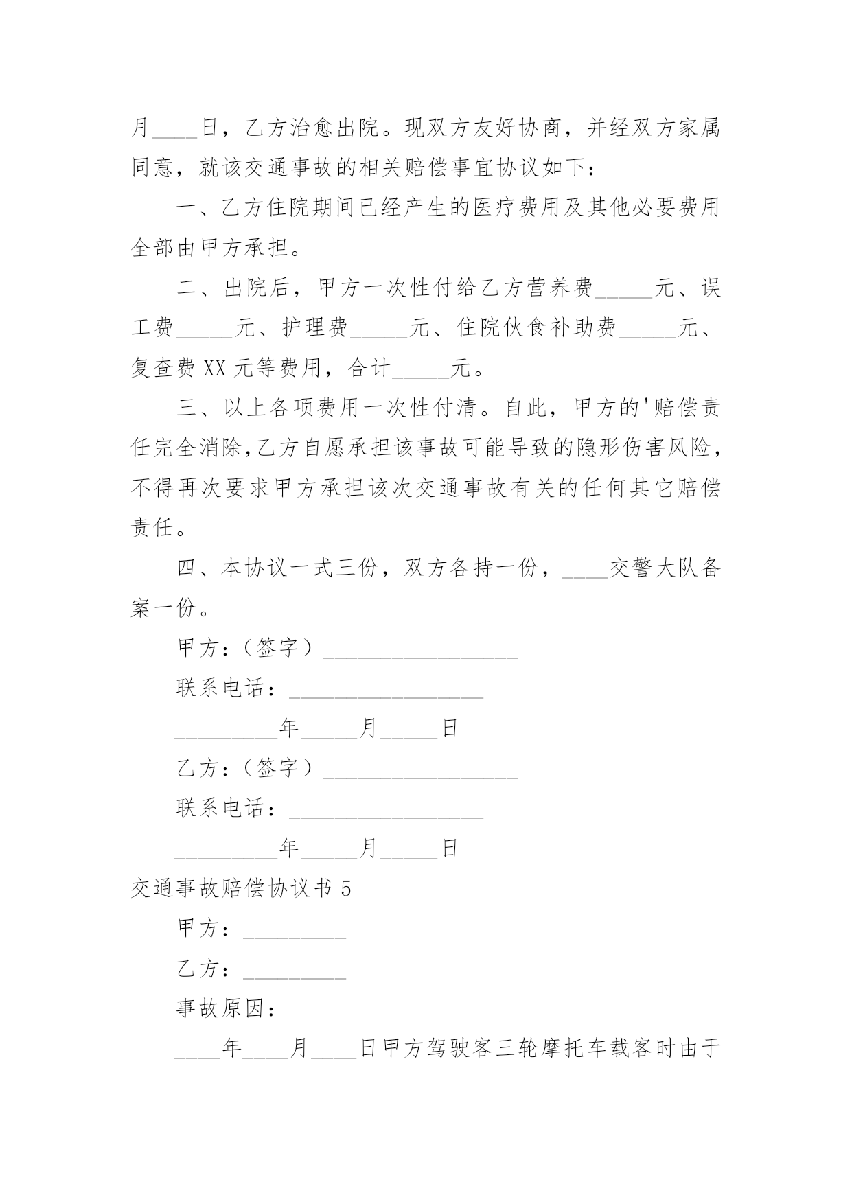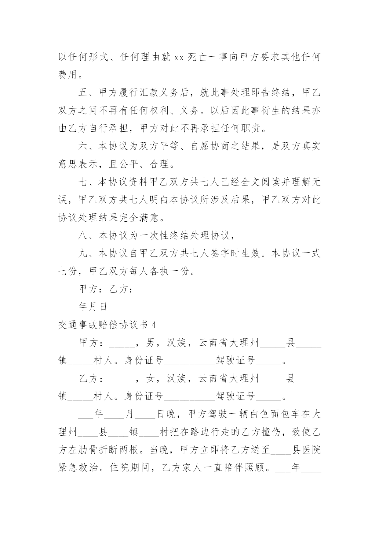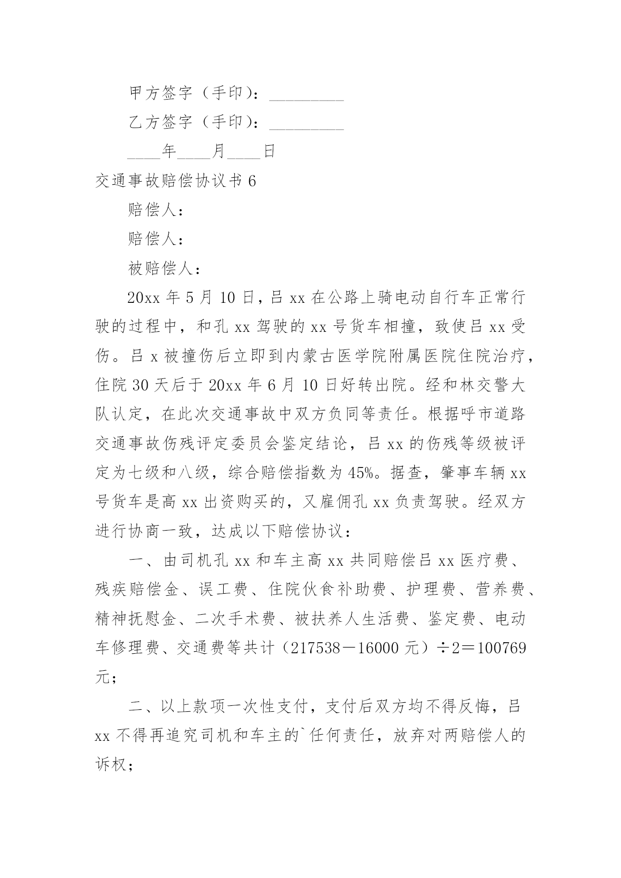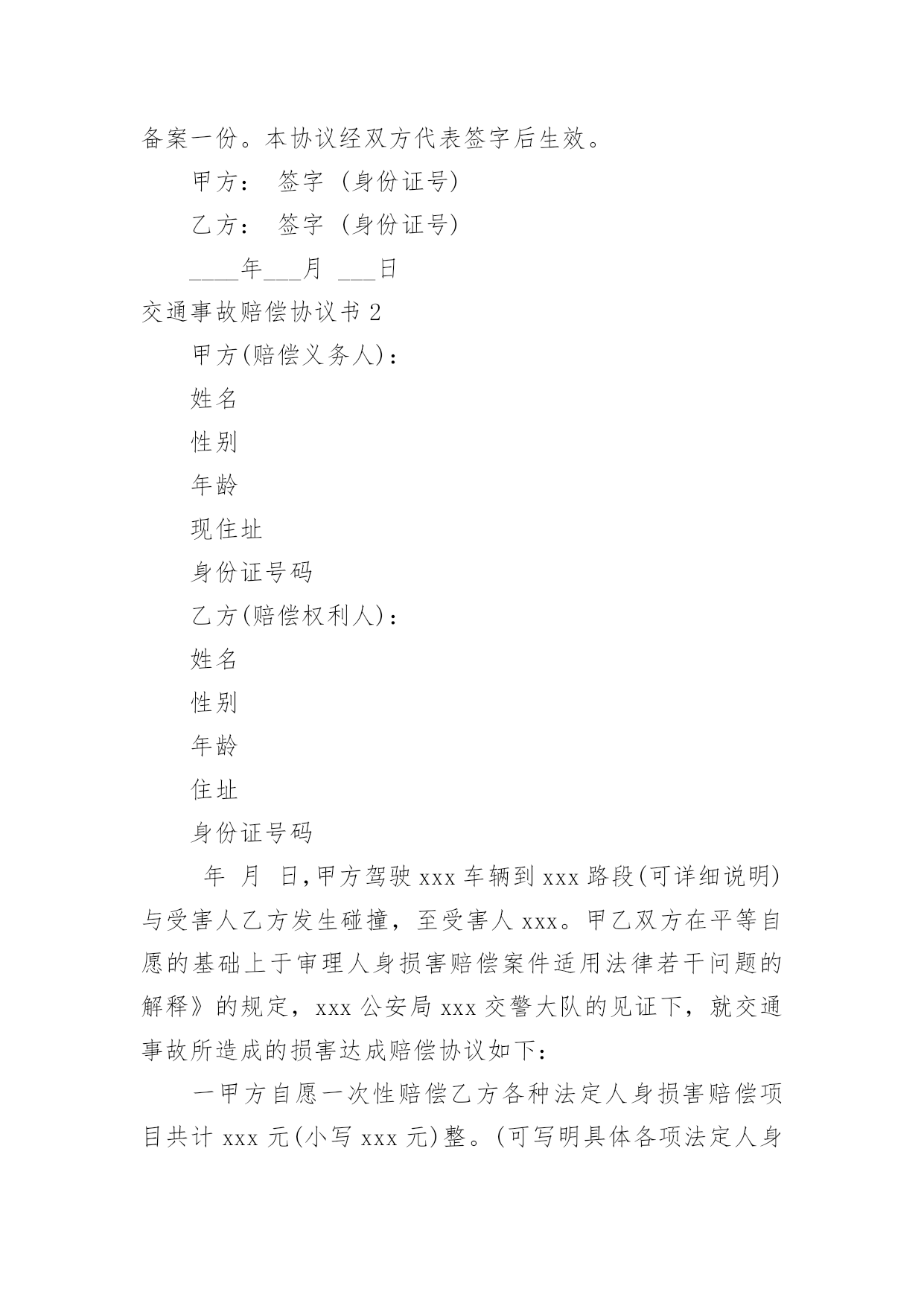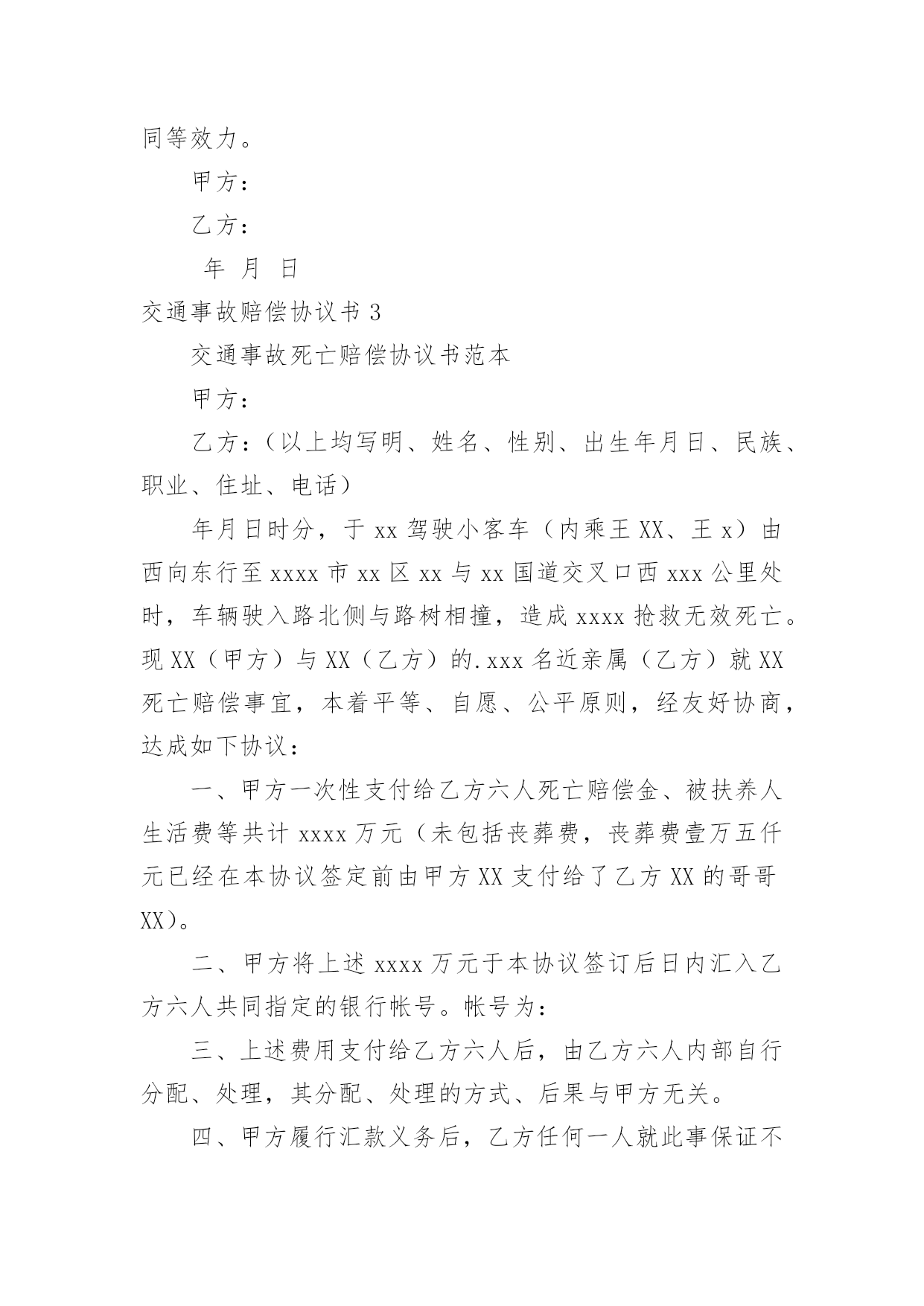 交通事故赔偿协议书交通事故赔偿协议书(汇编15篇)在社会发展不断提速的今天,各种协议频频出现,协议的签订是双方或数方之间权利义务的最好规范。一起来参考协议是怎么写的吧,下面是小编整理的交通事故赔偿协议书,仅供参考,希望能够帮助到大家。交通事故赔偿协议书1甲方:姓名,性别,出生年月,民族,住址,联系方式,乙方:姓名,性别,出生年月,民族,住址,联系方式,甲乙双方因___年___月___日在______发生交通事故一事,就损害赔偿达成协议如下:一、甲方损失:车损305元、施救费200元、停车费40元、交通费60元。乙方损失:医药费1173元、误工费75.39元(7天×10.77元)、护理费75.39元(7天×10.77元)、住院火食补助费42元(每天6元)、交通费60元。二、甲方一次性赔偿乙方1345元(已过付545元)整,其它责任双方互不追究。三、本协议一式三份,甲乙双方各自一份,交警部门备案一份。本协议经双方代表签字后生效。甲方:签字(身份证号)乙方:签字(身份证号)____年___月___日交通事故赔偿协议书2甲方(赔偿义务人):姓名性别年龄现住址身份证号码乙方(赔偿权利人):姓名性别年龄住址身份证号码年月日,甲方驾驶xxx车辆到xxx路段(可详细说明)与受害人乙方发生碰撞,至受害人xxx。甲乙双方在平等自愿的基础上于审理人身损害赔偿案件适用法律若干问题的解释》的规定,xxx公安局xxx交警大队的见证下,就交通事故所造成的损害达成赔偿协议如下:一甲方自愿一次性赔偿乙方各种法定人身损害赔偿项目共计xxx元(小写xxx元)整。(可写明具体各项法定人身损害赔偿项目);二乙方同意接受以上赔偿款项,并放弃对甲方的其他一切权利,不再要求甲方进行任何形式的赔偿或承担其他任何责任。若乙方(包括乙方其他利害关系人)再向甲方提出任何要求,由甲方决定如何处理解决;三本协议签订后,为方便甲方进行保险理赔,甲乙双方都同意相互配合;四甲方应在本协议生效之日(或其他时间)向乙方一次性支付赔偿金xxx(小写xxx)元整;五乙方对甲方的'行为表示谅解,保证不在向司法部门提出其他诉讼请求,并保证在必要的时候配合甲方和甲方所在单位向有关部门说明本协议的情况,出具相关的文件或证明;六乙方保证不再要求甲方或者保险公司赔偿超过本协议赔偿数额以外的任何赔偿。因此次事故产生车辆保险的赔付,由甲方进行理赔或索赔,必要时候乙方要配合甲方进行理赔或索赔,保险赔付款项全部归甲方所有;七乙方保证本协议合法有效,保证没有其他权利人或利害关系人就此次交通事故再向甲方主张权利,若本协议被确认无效,乙方应将已收取的全部赔偿款项返还甲方,若造成甲方其他损失,则由乙方承担全部责任;八本协议于甲乙双方在xxx警大队的见证下双方签字并由xxx公安局交警大队签章后立即生效;九本协议一式三份,甲乙双方和xxx交警大队各持一份,同等效力。甲方:乙方:年月日交通事故赔偿协议书3交通事故死亡赔偿协议书范本甲方:乙方:(以上均写明、姓名、性别、出生年月日、民族、职业、住址、电话)年月日时分,于xx驾驶小客车(内乘王XX、王x)由西向东行至xxxx市xx区xx与xx国道交叉口西xxx公里处时,车辆驶入路北侧与路树相撞,造成xxxx抢救无效死亡。现XX(甲方)与XX(乙方)的.xxx名近亲属(乙方)就XX死亡赔偿事宜,本着平等、自愿、公平原则,经友好协商,达成如下协议:一、甲方一次性支付给乙方六人死亡赔偿金、被扶养人生活费等共计xxxx万元(未包括丧葬费,丧葬费壹万五仟元已经在本协议签定前由甲方XX支付给了乙方XX的哥哥XX)。二、甲方将上述xxxx万元于本协议签订后日内汇入乙方六人共同指定的银行帐号。帐号为:三、上述费用支付给乙方六人后,由乙方六人内部自行分配、处理,其分配、处理的方式、后果与甲方无关。四、甲方履行汇款义务后,乙方任何一人就此事保证不以任何形式、任何理由就xx死亡一事向甲方要求其他任何费用。五、甲方履行汇款义务后,就此事处理即告终结,甲乙双方之间不再有任何权利、义务。以后因此事衍生的结果亦由乙方自行承担,甲方对此不再承担任何职责。六、本协议为双方平等、自愿协商之结果,是双方真实意思表示,且公平、合理。七、本协议资料甲乙双方共七人已经全文阅读并理解无误,甲乙双方共七人明白本协议所涉及后果,甲乙双方对此协议处理结果完全满意。八、本协议为一次性终结处理协议,九、本协议自甲乙双方共七人签字时生效。本协议一式七份,甲乙双方每人各执一份。甲方:乙方:年月日交通事故赔偿协议书4甲方:_____,男,汉族,云南省大理州_____县_____镇_____村人。身份证号__________驾驶证号_____。乙方:_____,女,汉族,云南省大理州_____县_____镇_____村人。身份证号________