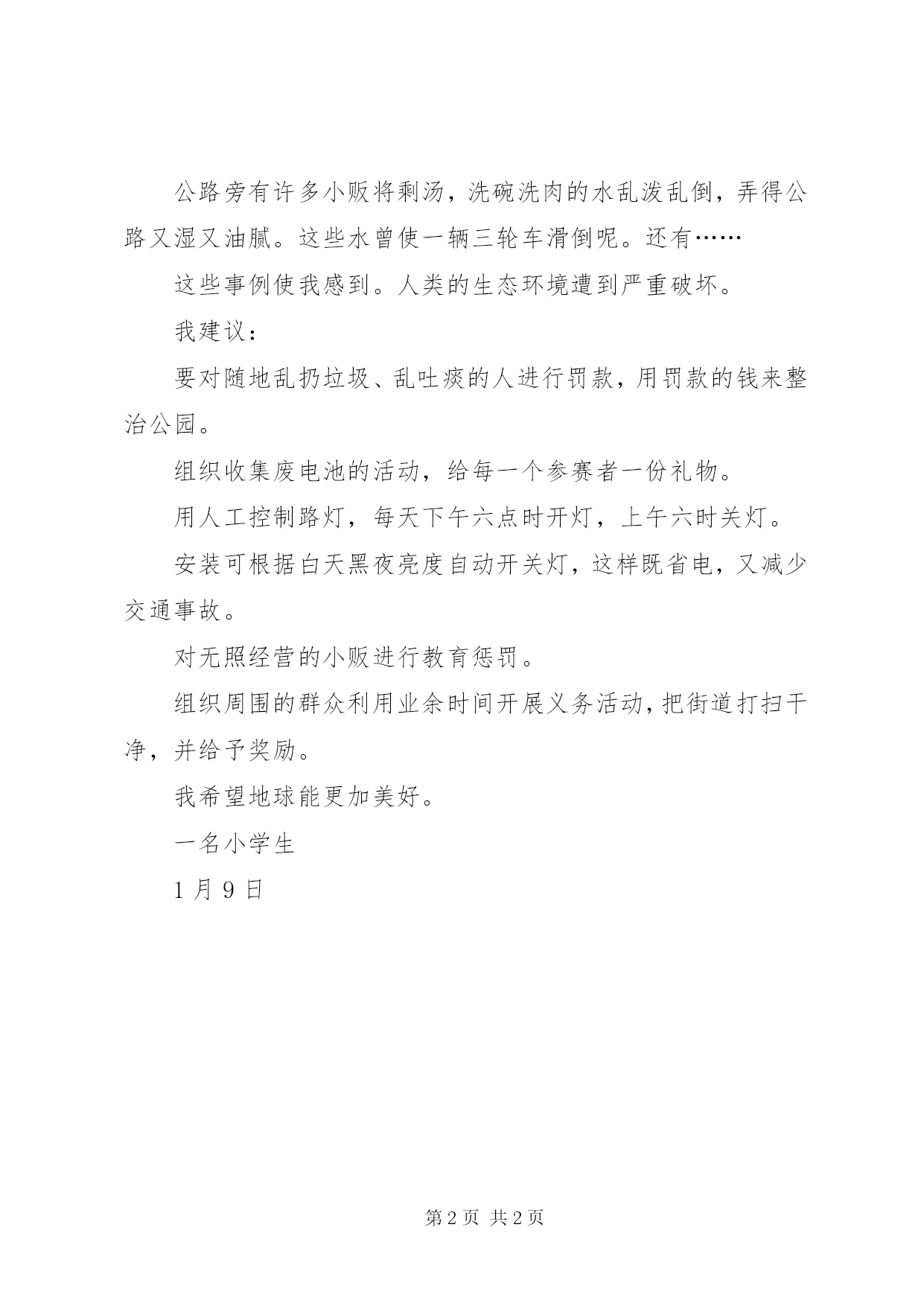 第PAGE\*Arabic\*MERGEFORMAT2页共NUMPAGES\*MERGEFORMAT2页给政府的环保倡议书范本尊敬的政府官员:你好。我是一名小学生,学了十三课后深有感悟。一个科技发达的国家,不仅要有发达的科学技术,还要有强烈的环保意识。可是,事与愿违。我发现了许多问题与现象。在一个个美丽的公园,在一个个风景迷人的地方,虽然充满诗情画意和现代化气息,但是隐藏着许多不为人知的秘密。真是不查不知道,一查吓一跳。在一些看似翠绿的河中飘浮着许多花花绿绿的塑料袋。走近一看,才知道那绿不是天然绿是污染绿。一些鱼翻着肚皮,大瞪着两眼,好像在诉说自己的不白之冤;好像在指责人类的重罪。夏天一到,太阳一晒,一阵臭味扑鼻而来,引得路人捂着嘴巴跑到另一边。看完了生病的河流,旁边的草地也奄奄一息,草丛中藏着废电池,废纸片,口香糖。垃圾箱旁堆满了垃圾,只差一步之遥,就可以投进垃圾桶。一本崭新的草稿本,只用了两页就被撕成几半丢弃在垃圾箱里。下水道里塞满了“琳琅满目”的“商品”。路旁的灯不分昼夜的亮光。我粗略的算了一下:每隔20米有一柱灯,从公园开头到终点大概有1公里,共50个灯柱,每柱灯2000瓦/时。如果白天少开8个小时,就可节省八百度电,如果每度电7角计算,这些灯每天可省560元,一个560元虽然不起眼,但一个月,一年后将是一个大数目。公路旁有许多小贩将剩汤,洗碗洗肉的水乱泼乱倒,弄得公路又湿又油腻。这些水曾使一辆三轮车滑倒呢。还有……这些事例使我感到。人类的生态环境遭到严重破坏。我建议:要对随地乱扔垃圾、乱吐痰的人进行罚款,用罚款的钱来整治公园。组织收集废电池的活动,给每一个参赛者一份礼物。用人工控制路灯,每天下午六点时开灯,上午六时关灯。安装可根据白天黑夜亮度自动开关灯,这样既省电,又减少交通事故。对无照经营的小贩进行教育惩罚。组织周围的群众利用业余时间开展义务活动,把街道打扫干净,并给予奖励。我希望地球能更加美好。一名小学生1月9日