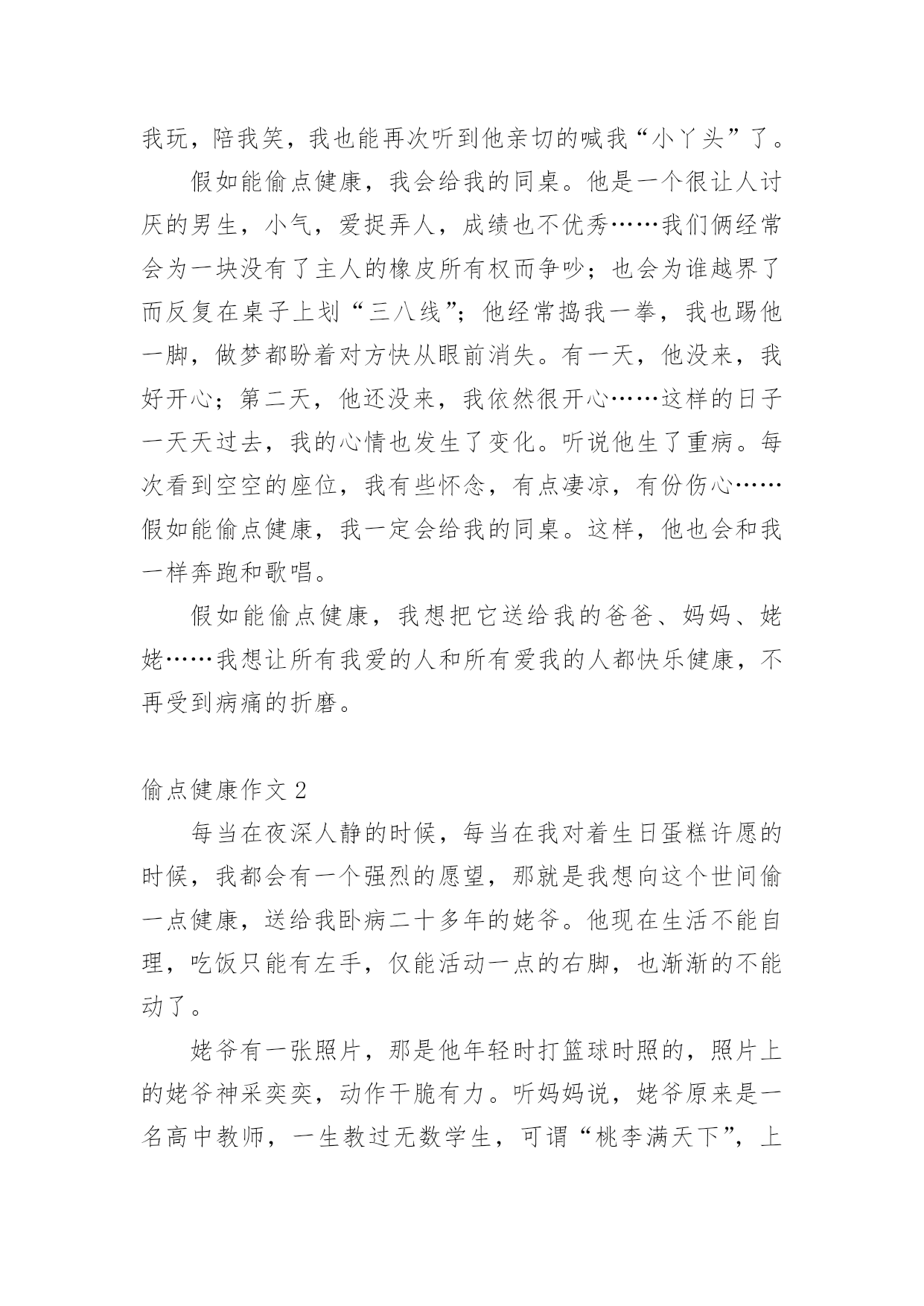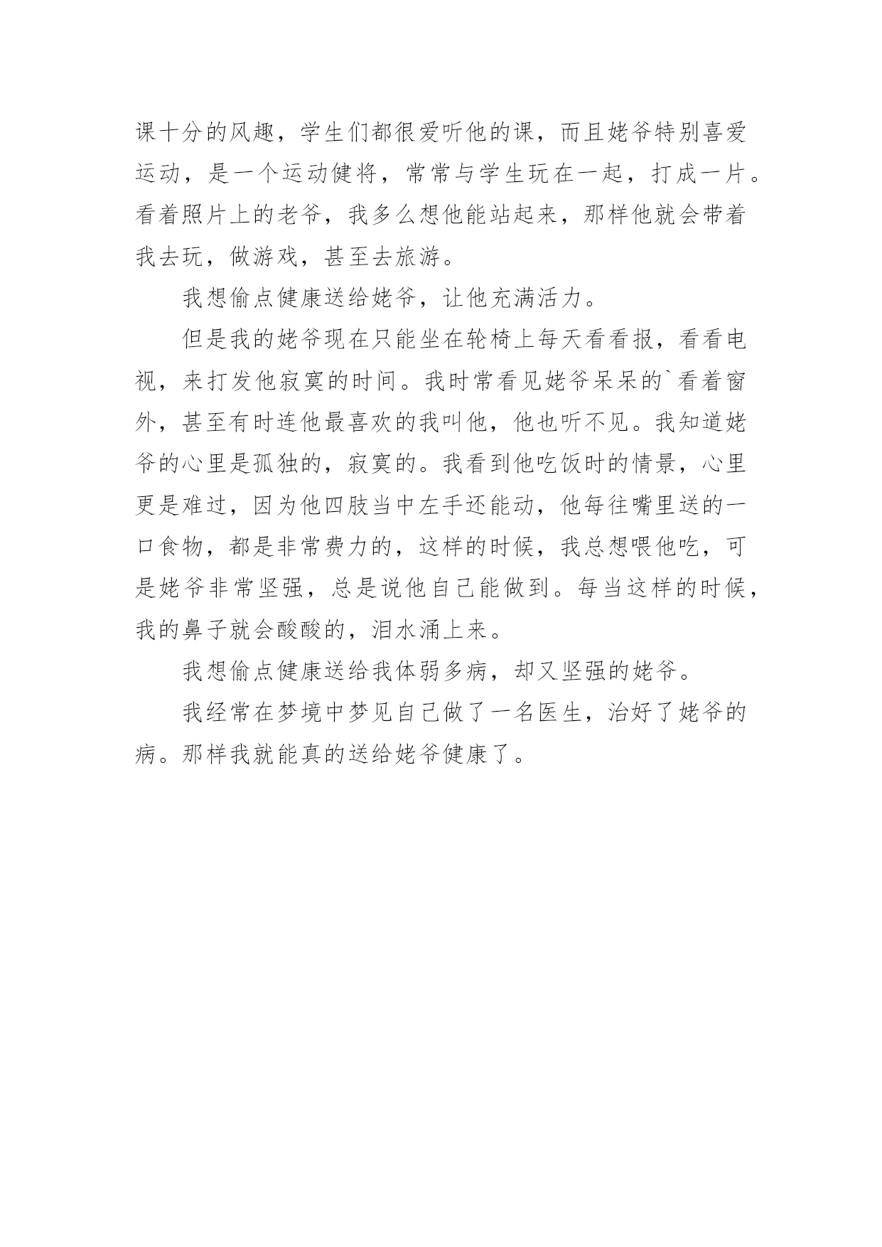 偷点健康作文在平平淡淡的日常中,许多人都有过写作文的经历,对作文都不陌生吧,作文是从内部言语向外部言语的过渡,即从经过压缩的简要的、自己能明白的语言,向开展的、具有规范语法结构的、能为他人所理解的外部语言形式的转化。为了让您在写作文时更加简单方便,以下是小编为大家整理的偷点健康作文,欢迎阅读与收藏。偷点健康作文1每年的清明节我都要和父母去上坟。因为那里有我的太奶奶和外公。在人头攒动的公墓,太阳暖洋洋的,然而气氛却异常肃穆,我的心也被哀伤包围。那时我常常幻想:假如能偷点健康给我的家人和朋友,那该有多么的好!假如能偷点健康,我会给我的太奶奶。在一个寒冷的夜晚,她因突发脑溢血,一个人无声无息地离开了我们。我常常想:当死亡来临时,她是否感到害怕和遗憾:没能最后看孩子们一眼,还有那么多的话没有交代,不能看到重孙女的出生……有时想起太奶奶,我就想象着她的长相和脾气。听说她是一个脾气直爽的老人。我真想给她偷点健康。假如能偷点健康,我会给我的外公。在外公被病痛折磨的`最后一年,我的记忆里全是白大褂、盐水瓶和外公化疗后的痛苦。我想:如果能偷点健康给外公,那么,他又能陪我玩,陪我笑,我也能再次听到他亲切的喊我“小丫头”了。假如能偷点健康,我会给我的同桌。他是一个很让人讨厌的男生,小气,爱捉弄人,成绩也不优秀……我们俩经常会为一块没有了主人的橡皮所有权而争吵;也会为谁越界了而反复在桌子上划“三八线”;他经常捣我一拳,我也踢他一脚,做梦都盼着对方快从眼前消失。有一天,他没来,我好开心;第二天,他还没来,我依然很开心……这样的日子一天天过去,我的心情也发生了变化。听说他生了重病。每次看到空空的座位,我有些怀念,有点凄凉,有份伤心……假如能偷点健康,我一定会给我的同桌。这样,他也会和我一样奔跑和歌唱。假如能偷点健康,我想把它送给我的爸爸、妈妈、姥姥……我想让所有我爱的人和所有爱我的人都快乐健康,不再受到病痛的折磨。偷点健康作文2每当在夜深人静的时候,每当在我对着生日蛋糕许愿的时候,我都会有一个强烈的愿望,那就是我想向这个世间偷一点健康,送给我卧病二十多年的姥爷。他现在生活不能自理,吃饭只能有左手,仅能活动一点的右脚,也渐渐的不能动了。姥爷有一张照片,那是他年轻时打篮球时照的,照片上的姥爷神采奕奕,动作干脆有力。听妈妈说,姥爷原来是一名高中教师,一生教过无数学生,可谓“桃李满天下”,上课十分的风趣,学生们都很爱听他的课,而且姥爷特别喜爱运动,是一个运动健将,常常与学生玩在一起,打成一片。看着照片上的老爷,我多么想他能站起来,那样他就会带着我去玩,做游戏,甚至去旅游。我想偷点健康送给姥爷,让他充满活力。但是我的姥爷现在只能坐在轮椅上每天看看报,看看电视,来打发他寂寞的时间。我时常看见姥爷呆呆的`看着窗外,甚至有时连他最喜欢的我叫他,他也听不见。我知道姥爷的心里是孤独的,寂寞的。我看到他吃饭时的情景,心里更是难过,因为他四肢当中左手还能动,他每往嘴里送的一口食物,都是非常费力的,这样的时候,我总想喂他吃,可是姥爷非常坚强,总是说他自己能做到。每当这样的时候,我的鼻子就会酸酸的,泪水涌上来。我想偷点健康送给我体弱多病,却又坚强的姥爷。我经常在梦境中梦见自己做了一名医生,治好了姥爷的病。那样我就能真的送给姥爷健康了。