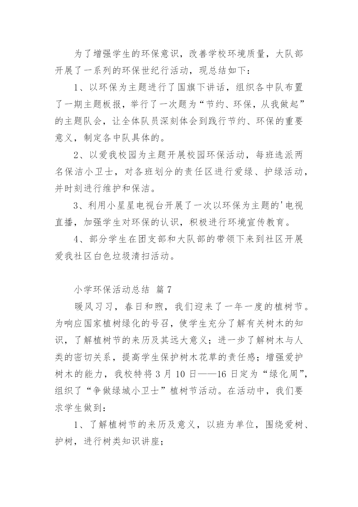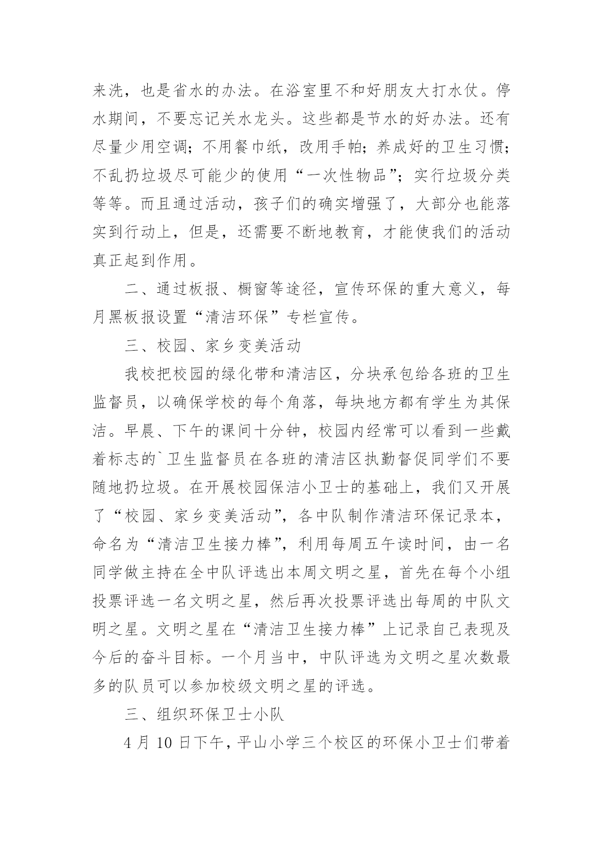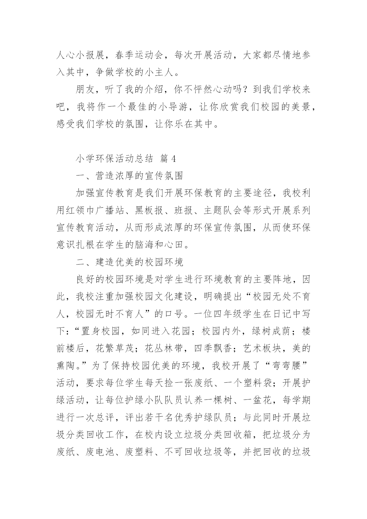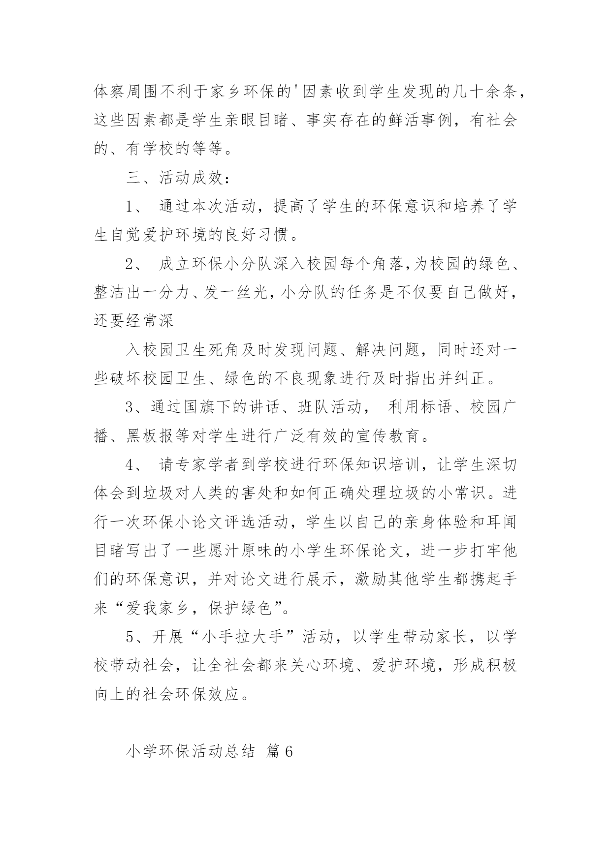 小学环保活动总结小学环保活动总结【合集14篇】总结是在某一特定时间段对学习和工作生活或其完成情况,包括取得的成绩、存在的问题及得到的经验和教训加以回顾和分析的书面材料,它是增长才干的一种好办法,不妨坐下来好好写写总结吧。那么我们该怎么去写总结呢?以下是小编收集整理的小学环保活动总结,供大家参考借鉴,希望可以帮助到有需要的朋友。小学环保活动总结篇1保护环境,维护生态平衡,为人类造福,是现代人必须具有的环境意识。今天的小学生是祖国未来的建设者和接班人,因此从小培养学生的环境保护意识十分必要。为了给孩子们灌输了节约资源,重复利用资源,不破坏环境的观念,从一点一滴入手,从身边的小事做起,增强环保意识。大队部开展了一系列的活动:一、利用红领巾广播站向学生宣传环保的重要意义,并激励学生在家长的启发下想出了很多生活中环保的计策。如,在澡盆洗澡,要注意:放水不要满,1/3-1/4盆足够用了。用收集的家庭废水冲厕所,可以一水多用,节约清水。洗脸水用后可以洗脚,然后冲厕所。淘米水、煮过面条的水,用来洗碗筷,去油又节水。衣服太少不洗,等多了以后集中起来洗,也是省水的办法。在浴室里不和好朋友大打水仗。停水期间,不要忘记关水龙头。这些都是节水的好办法。还有尽量少用空调;不用餐巾纸,改用手帕;养成好的卫生习惯;不乱扔垃圾尽可能少的使用“一次性物品”;实行垃圾分类等等。而且通过活动,孩子们的确实增强了,大部分也能落实到行动上,但是,还需要不断地教育,才能使我们的活动真正起到作用。二、通过板报、橱窗等途径,宣传环保的重大意义,每月黑板报设置“清洁环保”专栏宣传。三、校园、家乡变美活动我校把校园的绿化带和清洁区,分块承包给各班的卫生监督员,以确保学校的每个角落,每块地方都有学生为其保洁。早晨、下午的课间十分钟,校园内经常可以看到一些戴着标志的`卫生监督员在各班的清洁区执勤督促同学们不要随地扔垃圾。在开展校园保洁小卫士的基础上,我们又开展了“校园、家乡变美活动”,各中队制作清洁环保记录本,命名为“清洁卫生接力棒”,利用每周五午读时间,由一名同学做主持在全中队评选出本周文明之星,首先在每个小组投票评选一名文明之星,然后再次投票评选出每周的中队文明之星。文明之星在“清洁卫生接力棒”上记录自己表现及今后的奋斗目标。一个月当中,中队评选为文明之星次数最多的队员可以参加校级文明之星的评选。三、组织环保卫士小队4月10日下午,平山小学三个校区的环保小卫士们带着铁钳、铲子、铁刷、清洁袋,利用课外时间走出校门、走上街头、走进社区与象山区城管的叔叔们一起开展“捡白色垃圾、清除牛皮癣、树清洁环保意识”的大清扫活动。少先队员分头在学校周边巷道、社区、居民区捡拾白色垃圾、清除城市“牛皮癣”——非法广告,用自己的双手净化环境,扮美家乡,增强环保意识的同时以自身的文明行为感染市民,号召成年人一起行动起来保护好生活环境。四、学校修补、添加环保设施。小学环保活动总结篇2为了增强学生的环保意识,改善学校环境质量,大队部开展了一系列的环保世纪行活动,现总结如下:1、以环保为主题进行了国旗下讲话,组织各中队布置了一期主题板报,举行了一次题为“节约、环保,从我做起”的主题队会,让全体队员深刻体会到践行节约、环保的重要意义,制定各中队具体的活动方案。2、以爱我校园为主题开展校园环保活动,每班选派两名保洁小卫士,对各班划分的'责任区进行爱绿、护绿活动,并时刻进行维护和保洁。3、利用小星星电视台开展了一次以环保为主题的电视直播,加强学生对环保的认识,积极进行环境宣传教育。4、部分学生在团支部和大队部的带领下来到社区开展爱我社区白色垃圾清扫活动。小学环保活动总结篇3晨曦徐徐的拉开了夜的帷幕,又是一个绚丽的早晨,带着清新降临在了人间里,随着人们的早起,我也骑着自行车飞快的赶往校园。走进学校大门,两棵松柏矗立在大门两边,好像两名军士,守卫着校园。沿着柏油路往前走,左边是儿童们的天堂幼儿园;右边就是我们的乐园,我们的天地操场。操场前面是一根直插云霄的旗杆,星期一的早晨,五星红旗跟着冉冉上升的红日,升到了旗杆顶端。旗杆前面就是我们天天都要来学习的教学楼了。我们的教学楼有前后两排,每栋教学楼分三层,每层有四个教室,一个办公室。教室里,书声琅琅,同学们正在读书呢!办公室里,老师们正在认真地批改作业,备课。教学楼后面是美丽的花园,花园中间屹立着一棵大雪松,像一个忠诚的卫士一年四季,不辞辛苦的守卫着校园,从不掉以轻心。雪松周围有许多桃树。春天,桃花开了,花园里姹紫嫣红。桃树上的一朵朵小桃花,好像调皮的小孩子们在窃窃私语。微风徐来,桃花枝轻轻的摇摆,好像在像我们招手,欢迎,欢迎!花园周围是一圈花坛,花坛里面的草可漂亮呢,在夏天的早晨,你会看见小草上有许许多多的露珠,在阳光的映照下闪闪发光,像一颗颗亮晶晶的.钻石宝珠。我们的