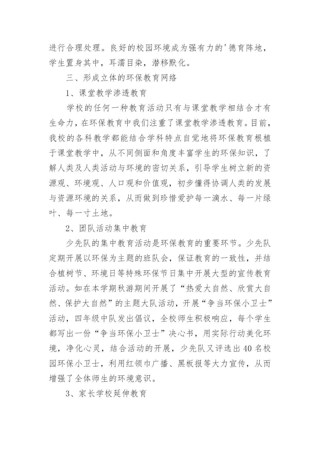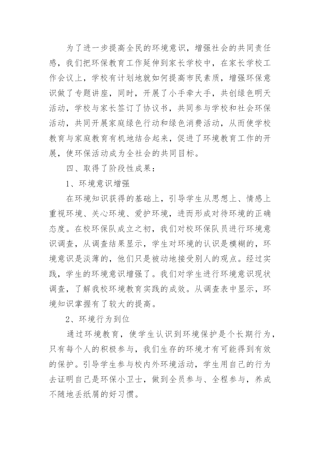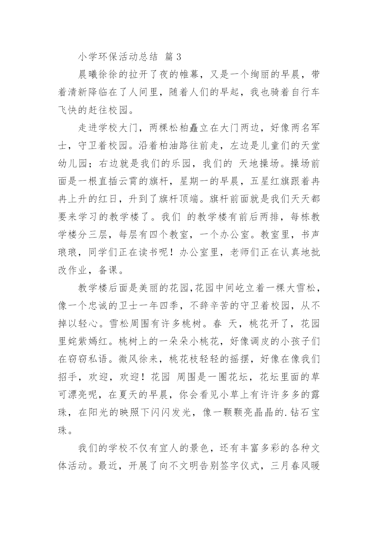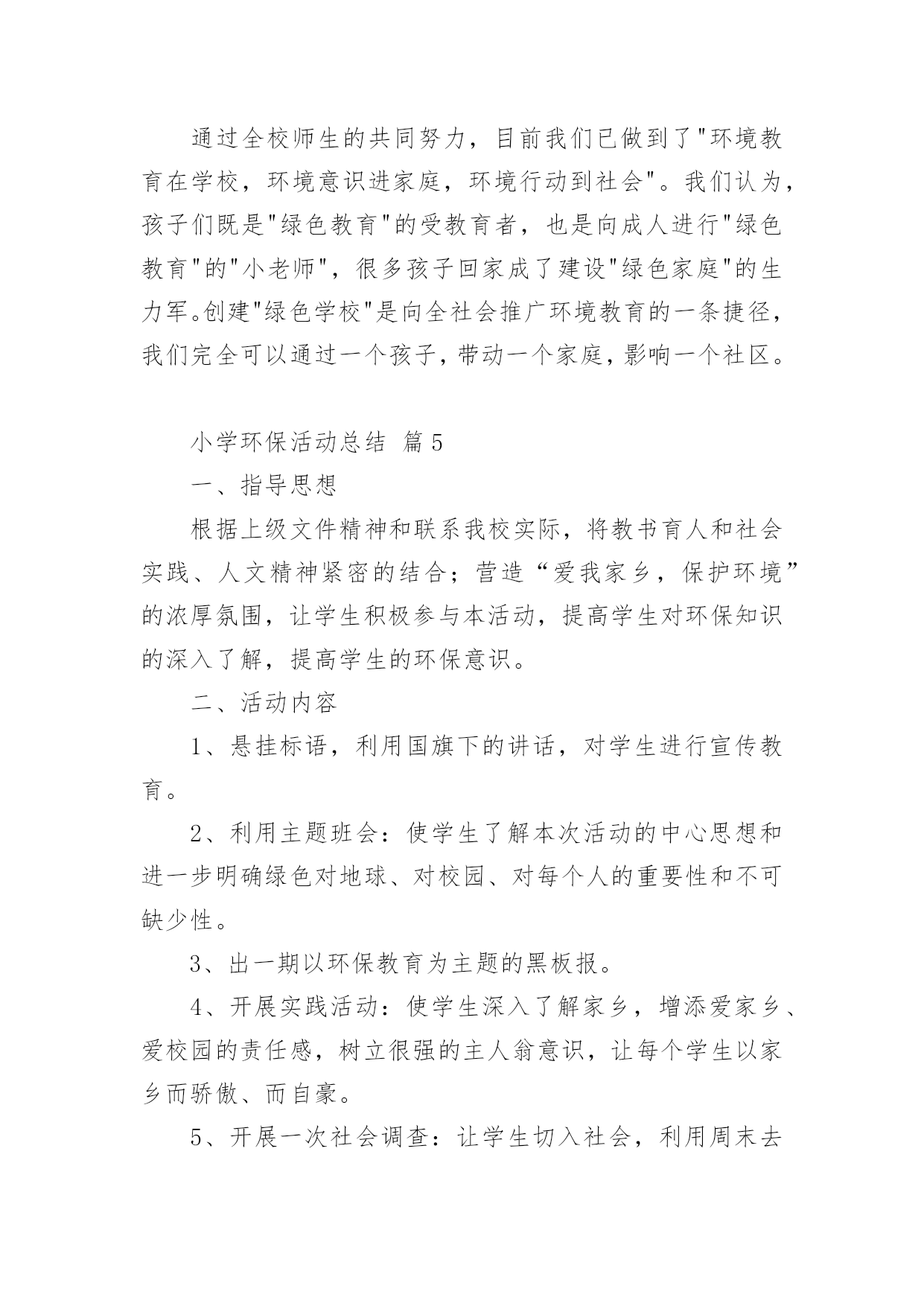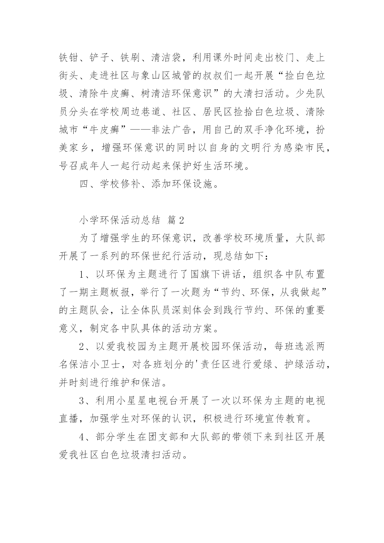 小学环保活动总结小学环保活动总结【合集14篇】总结是在某一特定时间段对学习和工作生活或其完成情况,包括取得的成绩、存在的问题及得到的经验和教训加以回顾和分析的书面材料,它是增长才干的一种好办法,不妨坐下来好好写写总结吧。那么我们该怎么去写总结呢?以下是小编收集整理的小学环保活动总结,供大家参考借鉴,希望可以帮助到有需要的朋友。小学环保活动总结篇1保护环境,维护生态平衡,为人类造福,是现代人必须具有的环境意识。今天的小学生是祖国未来的建设者和接班人,因此从小培养学生的环境保护意识十分必要。为了给孩子们灌输了节约资源,重复利用资源,不破坏环境的观念,从一点一滴入手,从身边的小事做起,增强环保意识。大队部开展了一系列的活动:一、利用红领巾广播站向学生宣传环保的重要意义,并激励学生在家长的启发下想出了很多生活中环保的计策。如,在澡盆洗澡,要注意:放水不要满,1/3-1/4盆足够用了。用收集的家庭废水冲厕所,可以一水多用,节约清水。洗脸水用后可以洗脚,然后冲厕所。淘米水、煮过面条的水,用来洗碗筷,去油又节水。衣服太少不洗,等多了以后集中起来洗,也是省水的办法。在浴室里不和好朋友大打水仗。停水期间,不要忘记关水龙头。这些都是节水的好办法。还有尽量少用空调;不用餐巾纸,改用手帕;养成好的卫生习惯;不乱扔垃圾尽可能少的使用“一次性物品”;实行垃圾分类等等。而且通过活动,孩子们的确实增强了,大部分也能落实到行动上,但是,还需要不断地教育,才能使我们的活动真正起到作用。二、通过板报、橱窗等途径,宣传环保的重大意义,每月黑板报设置“清洁环保”专栏宣传。三、校园、家乡变美活动我校把校园的绿化带和清洁区,分块承包给各班的卫生监督员,以确保学校的每个角落,每块地方都有学生为其保洁。早晨、下午的课间十分钟,校园内经常可以看到一些戴着标志的`卫生监督员在各班的清洁区执勤督促同学们不要随地扔垃圾。在开展校园保洁小卫士的基础上,我们又开展了“校园、家乡变美活动”,各中队制作清洁环保记录本,命名为“清洁卫生接力棒”,利用每周五午读时间,由一名同学做主持在全中队评选出本周文明之星,首先在每个小组投票评选一名文明之星,然后再次投票评选出每周的中队文明之星。文明之星在“清洁卫生接力棒”上记录自己表现及今后的奋斗目标。一个月当中,中队评选为文明之星次数最多的队员可以参加校级文明之星的评选。三、组织环保卫士小队4月10日下午,平山小学三个校区的环保小卫士们带着铁钳、铲子、铁刷、清洁袋,利用课外时间走出校门、走上街头、走进社区与象山区城管的叔叔们一起开展“捡白色垃圾、清除牛皮癣、树清洁环保意识”的大清扫活动。少先队员分头在学校周边巷道、社区、居民区捡拾白色垃圾、清除城市“牛皮癣”——非法广告,用自己的双手净化环境,扮美家乡,增强环保意识的同时以自身的文明行为感染市民,号召成年人一起行动起来保护好生活环境。四、学校修补、添加环保设施。小学环保活动总结篇2为了增强学生的环保意识,改善学校环境质量,大队部开展了一系列的环保世纪行活动,现总结如下:1、以环保为主题进行了国旗下讲话,组织各中队布置了一期主题板报,举行了一次题为“节约、环保,从我做起”的主题队会,让全体队员深刻体会到践行节约、环保的重要意义,制定各中队具体的活动方案。2、以爱我校园为主题开展校园环保活动,每班选派两名保洁小卫士,对各班划分的'责任区进行爱绿、护绿活动,并时刻进行维护和保洁。3、利用小星星电视台开展了一次以环保为主题的电视直播,加强学生对环保的认识,积极进行环境宣传教育。4、部分学生在团支部和大队部的带领下来到社区开展爱我社区白色垃圾清扫活动。小学环保活动总结篇3晨曦徐徐的拉开了夜的帷幕,又是一个绚丽的早晨,带着清新降临在了人间里,随着人们的早起,我也骑着自行车飞快的赶往校园。走进学校大门,两棵松柏矗立在大门两边,好像两名军士,守卫着校园。沿着柏油路往前走,左边是儿童们的天堂幼儿园;右边就是我们的乐园,我们的天地操场。操场前面是一根直插云霄的旗杆,星期一的早晨,五星红旗跟着冉冉上升的红日,升到了旗杆顶端。旗杆前面就是我们天天都要来学习的教学楼了。我们的教学楼有前后两排,每栋教学楼分三层,每层有四个教室,一个办公室。教室里,书声琅琅,同学们正在读书呢!办公室里,老师们正在认真地批改作业,备课。教学楼后面是美丽的花园,花园中间屹立着一棵大雪松,像一个忠诚的卫士一年四季,不辞辛苦的守卫着校园,从不掉以轻心。雪松周围有许多桃树。春天,桃花开了,花园里姹紫嫣红。桃树上的一朵朵小桃花,好像调皮的小孩子们在窃窃私语。微风徐来,桃花枝轻轻的摇摆,好像在像我们招手,欢迎,欢迎!花园周围是一圈花坛,花坛里面的草可漂亮呢,在夏天的早晨,你会看见小草上有许许多多的露珠,在阳光的映照下闪闪发光,像一颗颗亮晶晶的.钻石宝珠。我们的