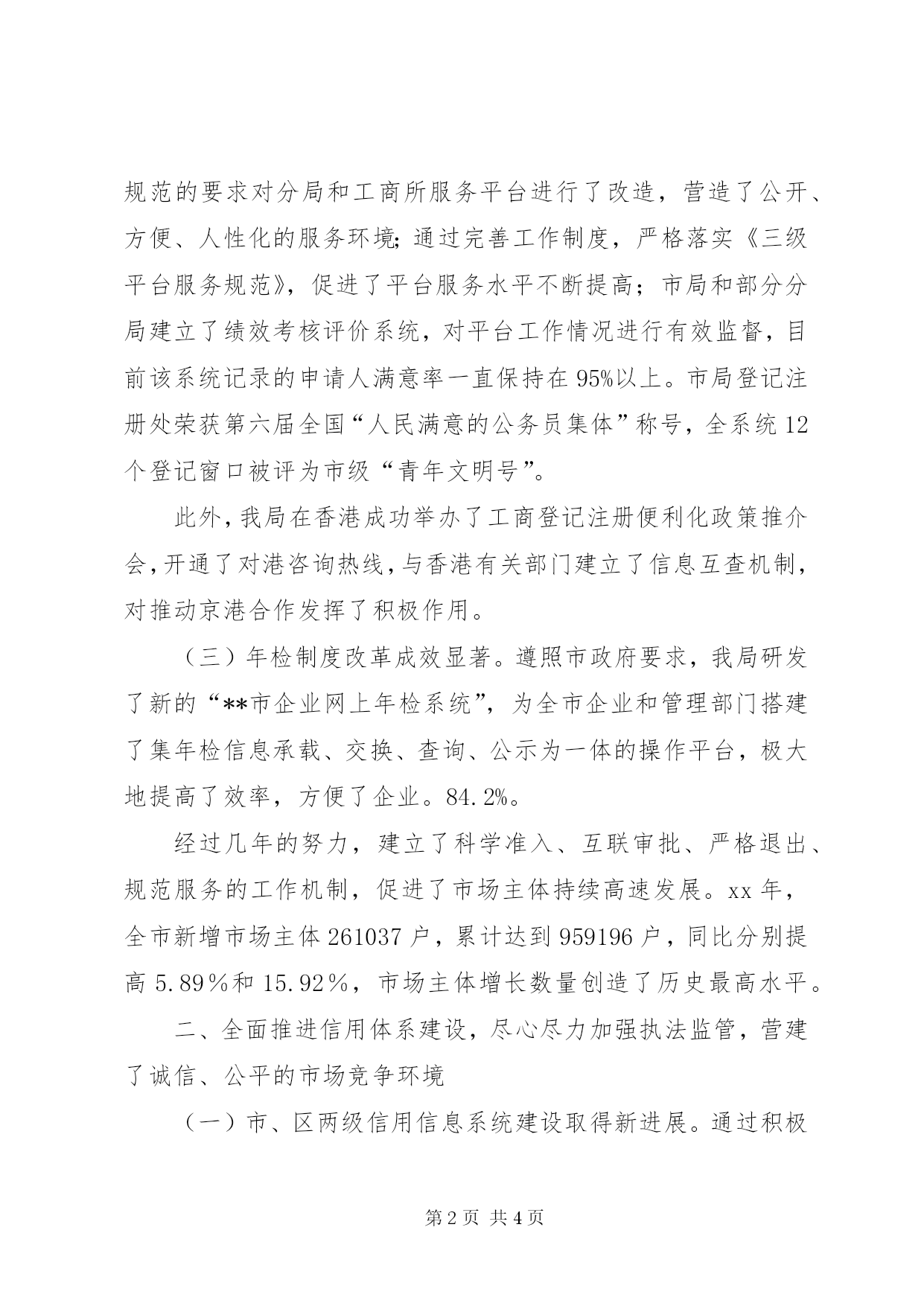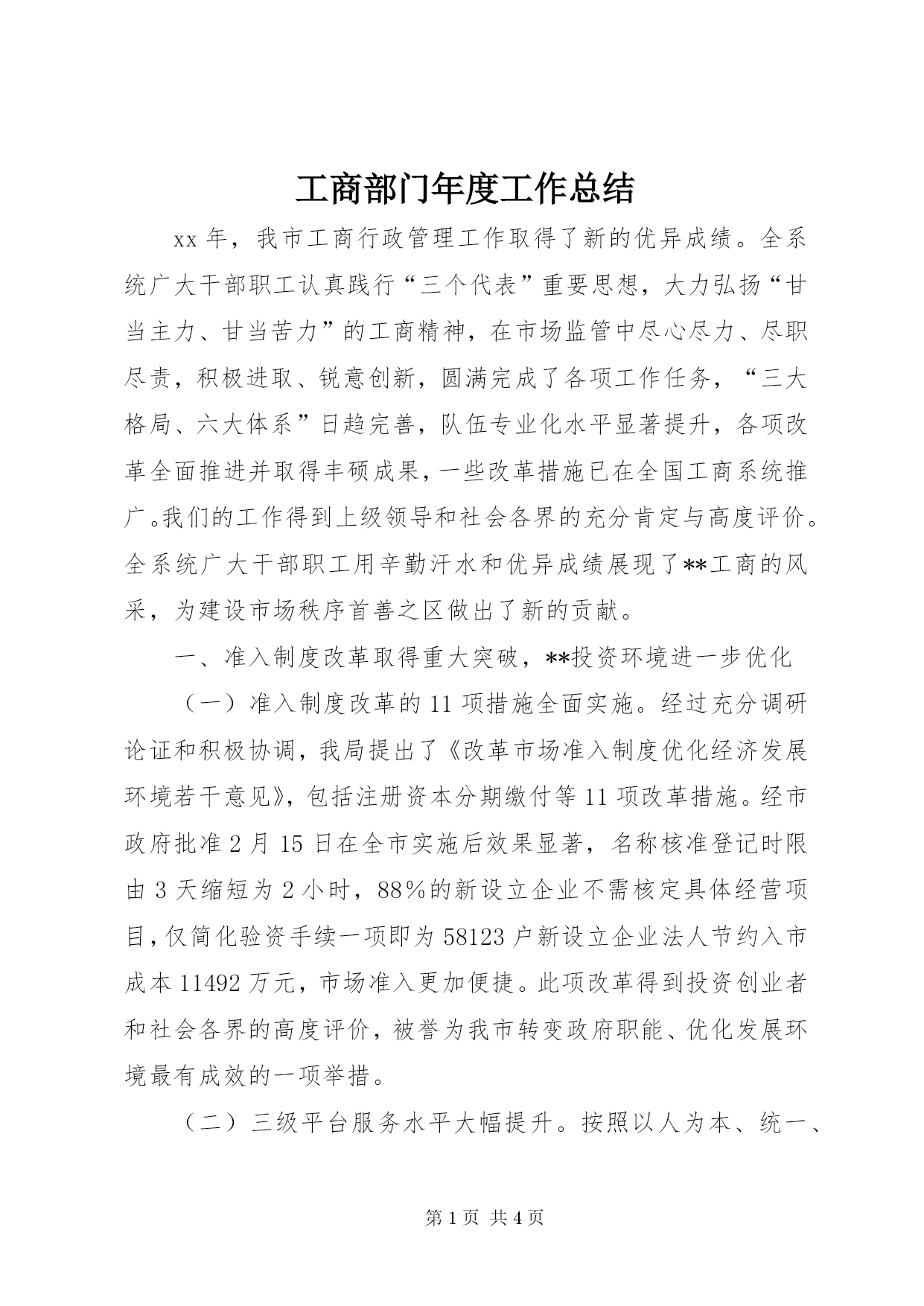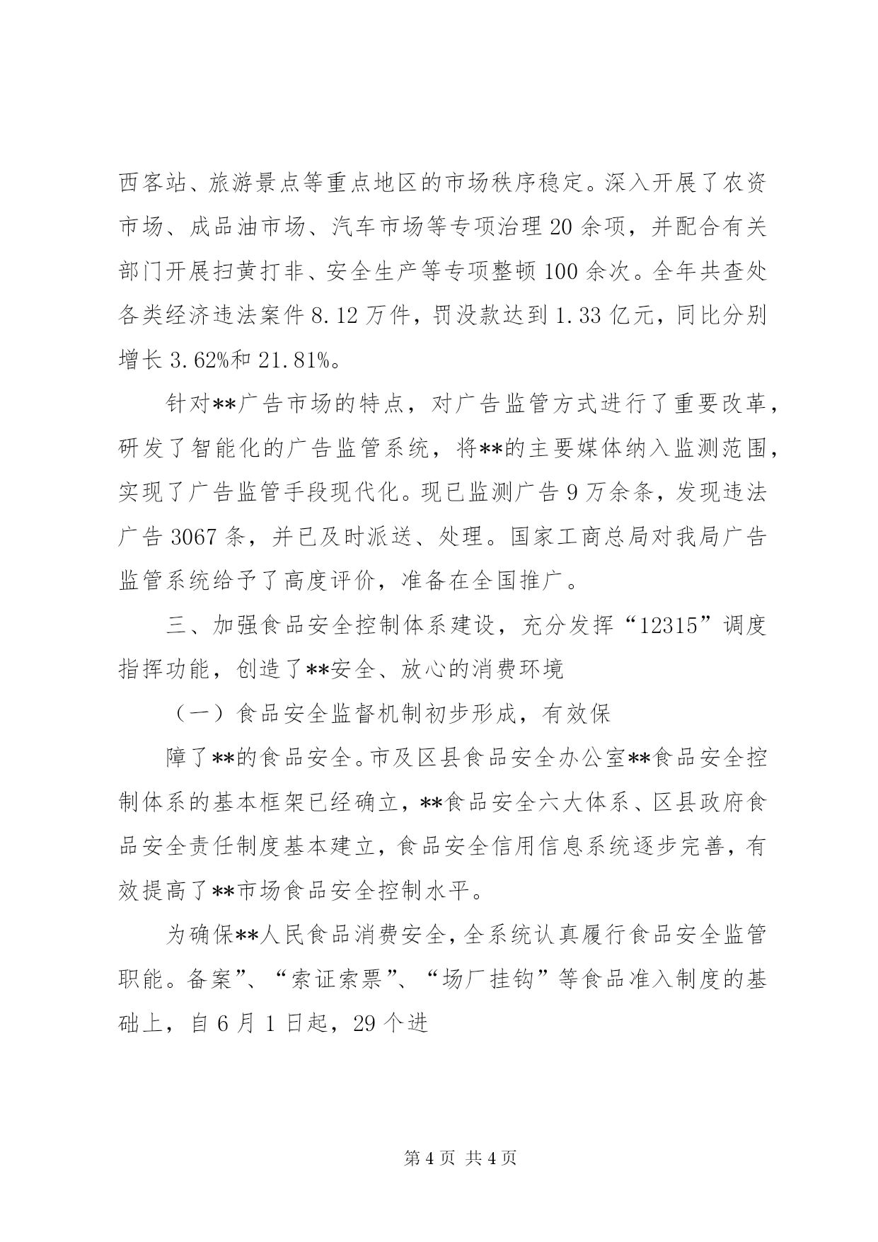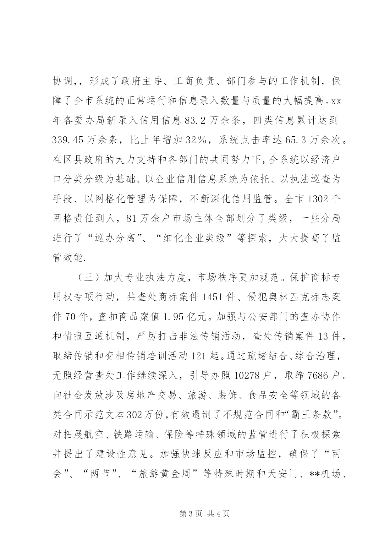 第PAGE\*Arabic\*MERGEFORMAT4页共NUMPAGES\*MERGEFORMAT4页工商部门年度工作总结xx年,我市工商行政管理工作取得了新的优异成绩。全系统广大干部职工认真践行“三个代表”重要思想,大力弘扬“甘当主力、甘当苦力”的工商精神,在市场监管中尽心尽力、尽职尽责,积极进取、锐意创新,圆满完成了各项工作任务,“三大格局、六大体系”日趋完善,队伍专业化水平显著提升,各项改革全面推进并取得丰硕成果,一些改革措施已在全国工商系统推广。我们的工作得到上级领导和社会各界的充分肯定与高度评价。全系统广大干部职工用辛勤汗水和优异成绩展现了**工商的风采,为建设市场秩序首善之区做出了新的贡献。一、准入制度改革取得重大突破,**投资环境进一步优化(一)准入制度改革的11项措施全面实施。经过充分调研论证和积极协调,我局提出了《改革市场准入制度优化经济发展环境若干意见》,包括注册资本分期缴付等11项改革措施。经市政府批准2月15日在全市实施后效果显著,名称核准登记时限由3天缩短为2小时,88%的新设立企业不需核定具体经营项目,仅简化验资手续一项即为58123户新设立企业法人节约入市成本11492万元,市场准入更加便捷。此项改革得到投资创业者和社会各界的高度评价,被誉为我市转变政府职能、优化发展环境最有成效的一项举措。(二)三级平台服务水平大幅提升。按照以人为本、统一、规范的要求对分局和工商所服务平台进行了改造,营造了公开、方便、人性化的服务环境;通过完善工作制度,严格落实《三级平台服务规范》,促进了平台服务水平不断提高;市局和部分分局建立了绩效考核评价系统,对平台工作情况进行有效监督,目前该系统记录的申请人满意率一直保持在95%以上。市局登记注册处荣获第六届全国“人民满意的公务员集体”称号,全系统12个登记窗口被评为市级“青年文明号”。此外,我局在香港成功举办了工商登记注册便利化政策推介会,开通了对港咨询热线,与香港有关部门建立了信息互查机制,对推动京港合作发挥了积极作用。(三)年检制度改革成效显著。遵照市政府要求,我局研发了新的“**市企业网上年检系统”,为全市企业和管理部门搭建了集年检信息承载、交换、查询、公示为一体的操作平台,极大地提高了效率,方便了企业。84.2%。经过几年的努力,建立了科学准入、互联审批、严格退出、规范服务的工作机制,促进了市场主体持续高速发展。xx年,全市新增市场主体261037户,累计达到959196户,同比分别提高5.89%和15.92%,市场主体增长数量创造了历史最高水平。二、全面推进信用体系建设,尽心尽力加强执法监管,营建了诚信、公平的市场竞争环境(一)市、区两级信用信息系统建设取得新进展。通过积极协调,,形成了政府主导、工商负责、部门参与的工作机制,保障了全市系统的正常运行和信息录入数量与质量的大幅提高。xx年各委办局新录入信用信息83.2万余条,四类信息累计达到339.45万余条,比上年增加32%,系统点击率达65.3万余次。在区县政府的大力支持和各部门的共同努力下,全系统以经济户口分类分级为基础、以企业信用信息系统为依托、以执法巡查为手段、以网格化管理为保障,不断深化信用监管。全市1302个网格责任到人,81万余户市场主体全部划分了类级,一些分局进行了“巡办分离”、“细化企业类级”等探索,大大提高了监管效能.(三)加大专业执法力度,市场秩序更加规范。保护商标专用权专项行动,共查处商标案件1451件、侵犯奥林匹克标志案件70件,查扣商品案值1.95亿元。加强与公安部门的查办协作和情报互通机制,严厉打击非法传销活动,查处传销案件13件,取缔传销和变相传销培训活动121起。通过疏堵结合、综合治理,无照经营查处工作继续深入,引导办照10278户,取缔7686户。向社会发放涉及房地产交易、旅游、装饰、食品安全等领域的各类合同示范文本302万份,有效遏制了不规范合同和“霸王条款”。对拓展航空、铁路运输、保险等特殊领域的监管进行了积极探索并提出了建设性意见。加强快速反应和市场监控,确保了“两会”、“两节”、“旅游黄金周”等特殊时期和天安门、**机场、西客站、旅游景点等重点地区的市场秩序稳定。深入开展了农资市场、成品油市场、汽车市场等专项治理20余项,并配合有关部门开展扫黄打非、安全生产等专项整顿100余次。全年共查处各类经济违法案件8.12万件,罚没款达到1.33亿元,同比分别增长3.62%和21.81%。针对**广告市场的特点,对广告监管方式进行了重要改革,研发了智能化的广告监管系统,将**的主要媒体纳入监测范围,实现了广告监管手段现代化。现已监测广告9万余条,发现违法广告3067条,并已及时派送、处理。国家工商总局对我局广告监管系统给予了高度评价,准备在全国推广。