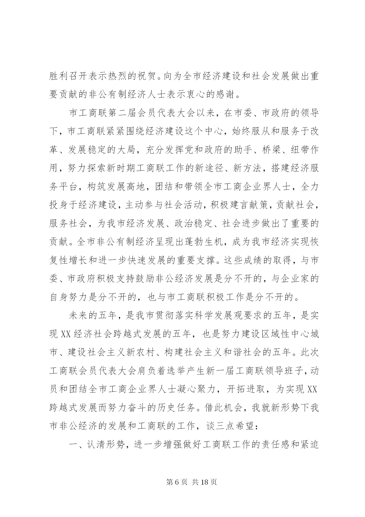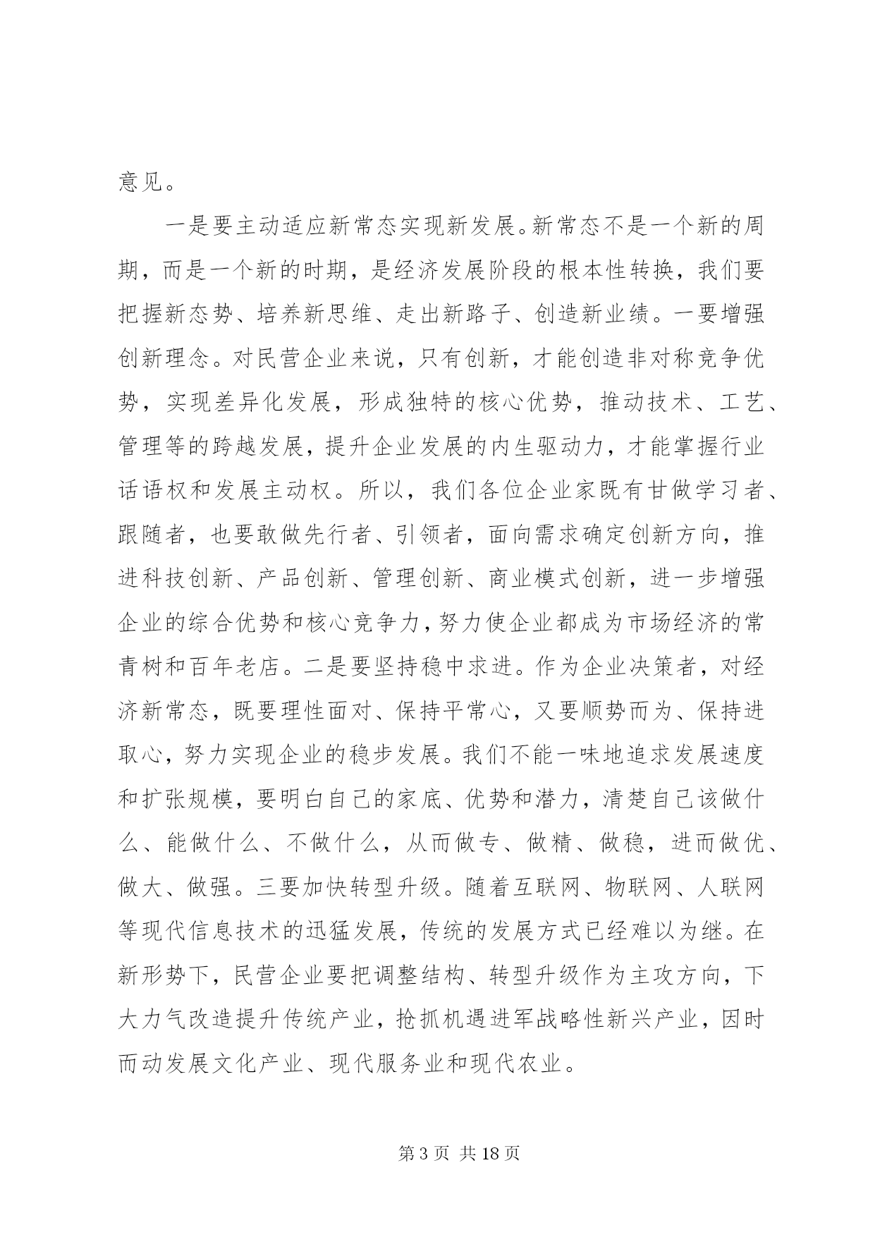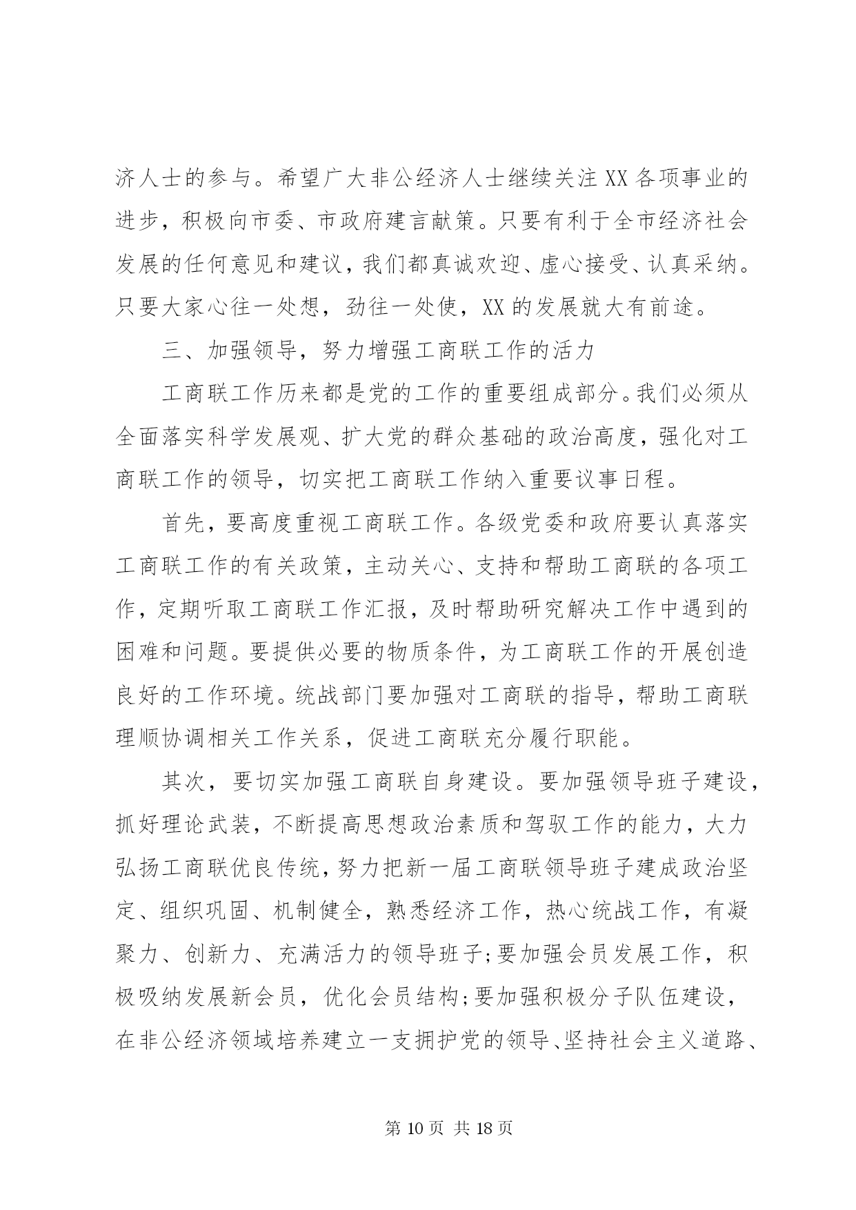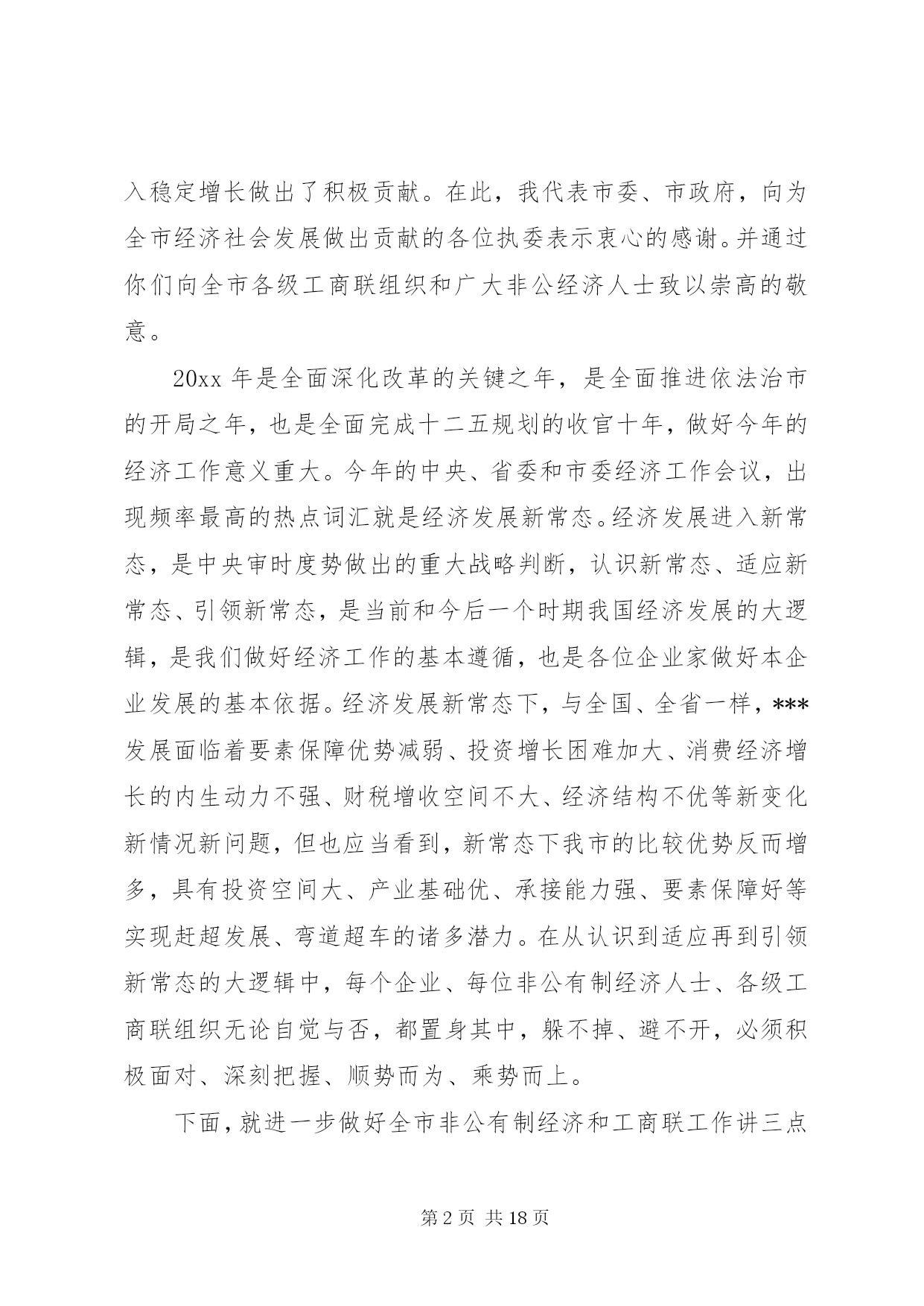 第PAGE\*Arabic\*MERGEFORMAT18页共NUMPAGES\*MERGEFORMAT18页市工商联会议讲话稿范文市工商联会议讲话稿范文篇1各位执委、同志们、朋友们:很高兴参加市工商联*届*次执委会议。这次会议是在全市上下深入学习贯彻党的十八届四中全会、全国两会及市委经济工作会议精神,努力为***建设奋力拼搏之际召开的。在此,我谨代表市委、市政府对市工商联*届*次执委会的召开表示热烈的祝贺。刚刚过去的20xx年,是我市发展进程中极不平凡的一年,也是我市经济社会各项事业取得长足发展的一年,是工商联工作做出较大成绩的一年。在国内外形势复杂多变、面临各方面压力的情况下,全市各级各部门深入贯彻党的和十八届三中、四中全会精神,有效克服各种不利因素影响,实现了全市经济社会持续健康发展。预计全年完成生产总值**亿元,增长**%;规模以上工业增加值**亿元,增长**%;固定资产投资**亿元,增长**%;社会消费品零售总额**亿元,增长**%;地方公共财政预算收入**亿元,增长**%。这是全市各级各部门共同奋斗的结果,是全市广大干部群众奉献拼搏的结果,也饱含着各级工商联和非公有制经济人士的辛勤汗水。在过去的一年里,全市各级工商联在市委、市政府的正确领导下,紧紧围绕中心工作,积极践行两个健康工作主题,团结全体会员和广大工商界人士,积极发挥党委政府联系非公有制经济人士的桥梁纽带和政府管理非公有制经济的助手作用,各项工作取得了新成绩,为全市经济平稳较快发展、人民收入稳定增长做出了积极贡献。在此,我代表市委、市政府,向为全市经济社会发展做出贡献的各位执委表示衷心的感谢。并通过你们向全市各级工商联组织和广大非公经济人士致以崇高的敬意。20xx年是全面深化改革的关键之年,是全面推进依法治市的开局之年,也是全面完成十二五规划的收官十年,做好今年的经济工作意义重大。今年的中央、省委和市委经济工作会议,出现频率最高的热点词汇就是经济发展新常态。经济发展进入新常态,是中央审时度势做出的重大战略判断,认识新常态、适应新常态、引领新常态,是当前和今后一个时期我国经济发展的大逻辑,是我们做好经济工作的基本遵循,也是各位企业家做好本企业发展的基本依据。经济发展新常态下,与全国、全省一样,***发展面临着要素保障优势减弱、投资增长困难加大、消费经济增长的内生动力不强、财税增收空间不大、经济结构不优等新变化新情况新问题,但也应当看到,新常态下我市的比较优势反而增多,具有投资空间大、产业基础优、承接能力强、要素保障好等实现赶超发展、弯道超车的诸多潜力。在从认识到适应再到引领新常态的大逻辑中,每个企业、每位非公有制经济人士、各级工商联组织无论自觉与否,都置身其中,躲不掉、避不开,必须积极面对、深刻把握、顺势而为、乘势而上。下面,就进一步做好全市非公有制经济和工商联工作讲三点意见。一是要主动适应新常态实现新发展。新常态不是一个新的周期,而是一个新的时期,是经济发展阶段的根本性转换,我们要把握新态势、培养新思维、走出新路子、创造新业绩。一要增强创新理念。对民营企业来说,只有创新,才能创造非对称竞争优势,实现差异化发展,形成独特的核心优势,推动技术、工艺、管理等的跨越发展,提升企业发展的内生驱动力,才能掌握行业话语权和发展主动权。所以,我们各位企业家既有甘做学习者、跟随者,也要敢做先行者、引领者,面向需求确定创新方向,推进科技创新、产品创新、管理创新、商业模式创新,进一步增强企业的综合优势和核心竞争力,努力使企业都成为市场经济的常青树和百年老店。二是要坚持稳中求进。作为企业决策者,对经济新常态,既要理性面对、保持平常心,又要顺势而为、保持进取心,努力实现企业的稳步发展。我们不能一味地追求发展速度和扩张规模,要明白自己的家底、优势和潜力,清楚自己该做什么、能做什么、不做什么,从而做专、做精、做稳,进而做优、做大、做强。三要加快转型升级。随着互联网、物联网、人联网等现代信息技术的迅猛发展,传统的发展方式已经难以为继。在新形势下,民营企业要把调整结构、转型升级作为主攻方向,下大力气改造提升传统产业,抢抓机遇进军战略性新兴产业,因时而动发展文化产业、现代服务业和现代农业。二是要积极树立法治思维增强新动力。十八届四中全会对全面推进依法治国进行了总体部署,全市各级工商联组织、商会和非公有制经济人士应树立法治思维,牢固树立法治思维和法治理念,真正学习法律、信赖法律、敬畏法律,严格按法律规范行事,守住底线,不触红线,不碰高压线。一要依法合规经营。守法才最安全,才是最大的自我保护;诚实才有信誉,才是最大的金字招牌。民营企业和民营企业家要强化责任意识,积极承担照章纳税、安全生产、产品质量、资源节约、保护环境等方面的法律责任,把企业健康发展、依法诚信经营、承担社会责