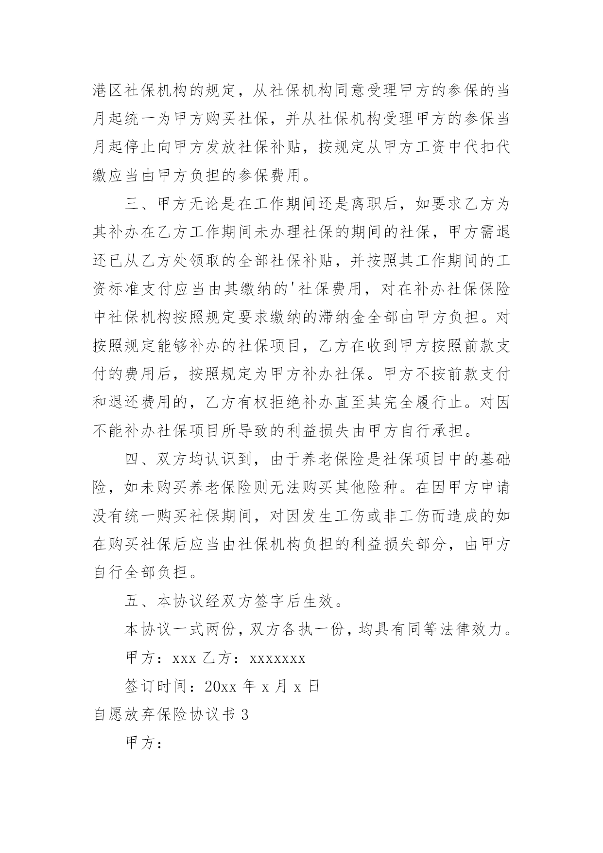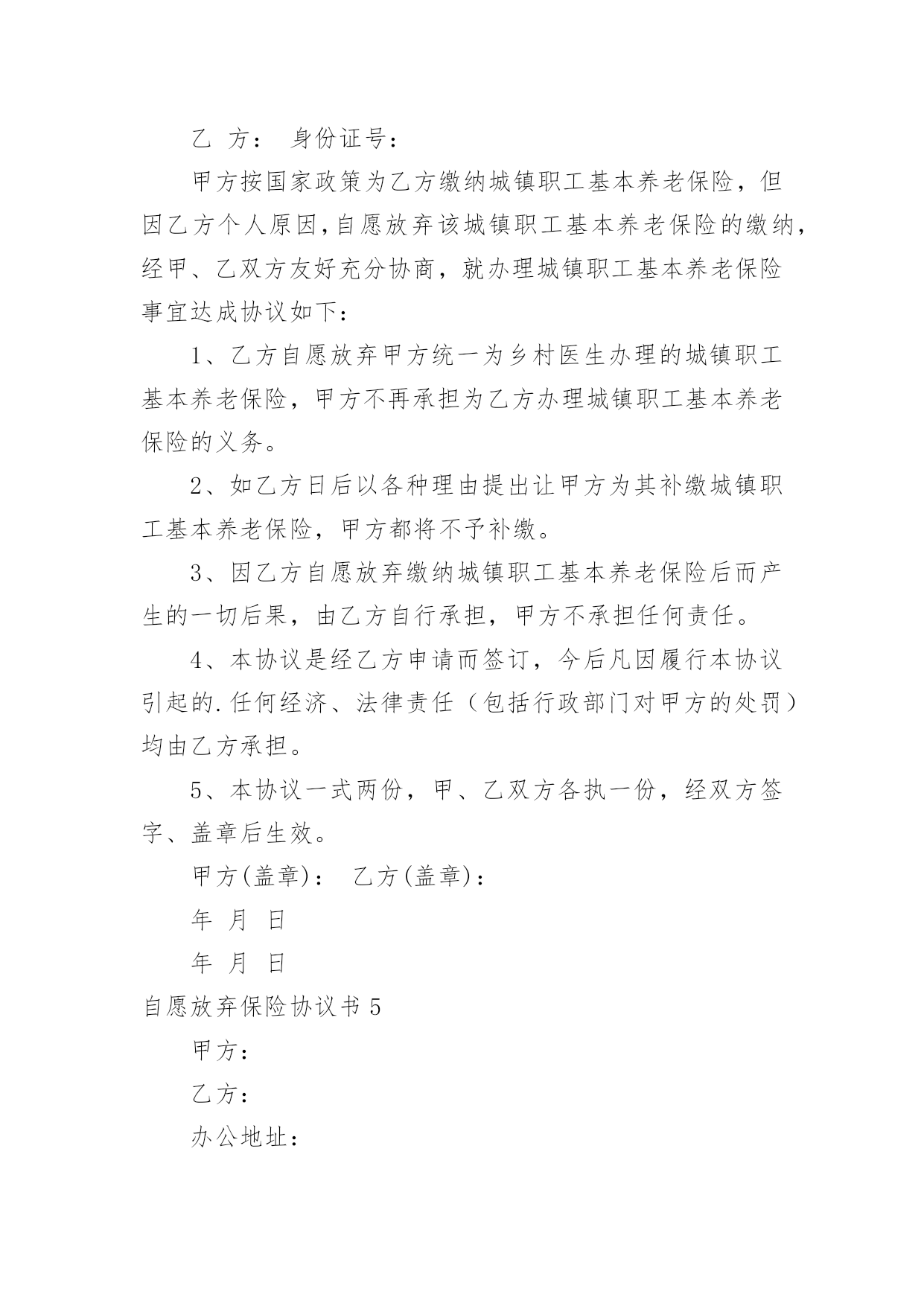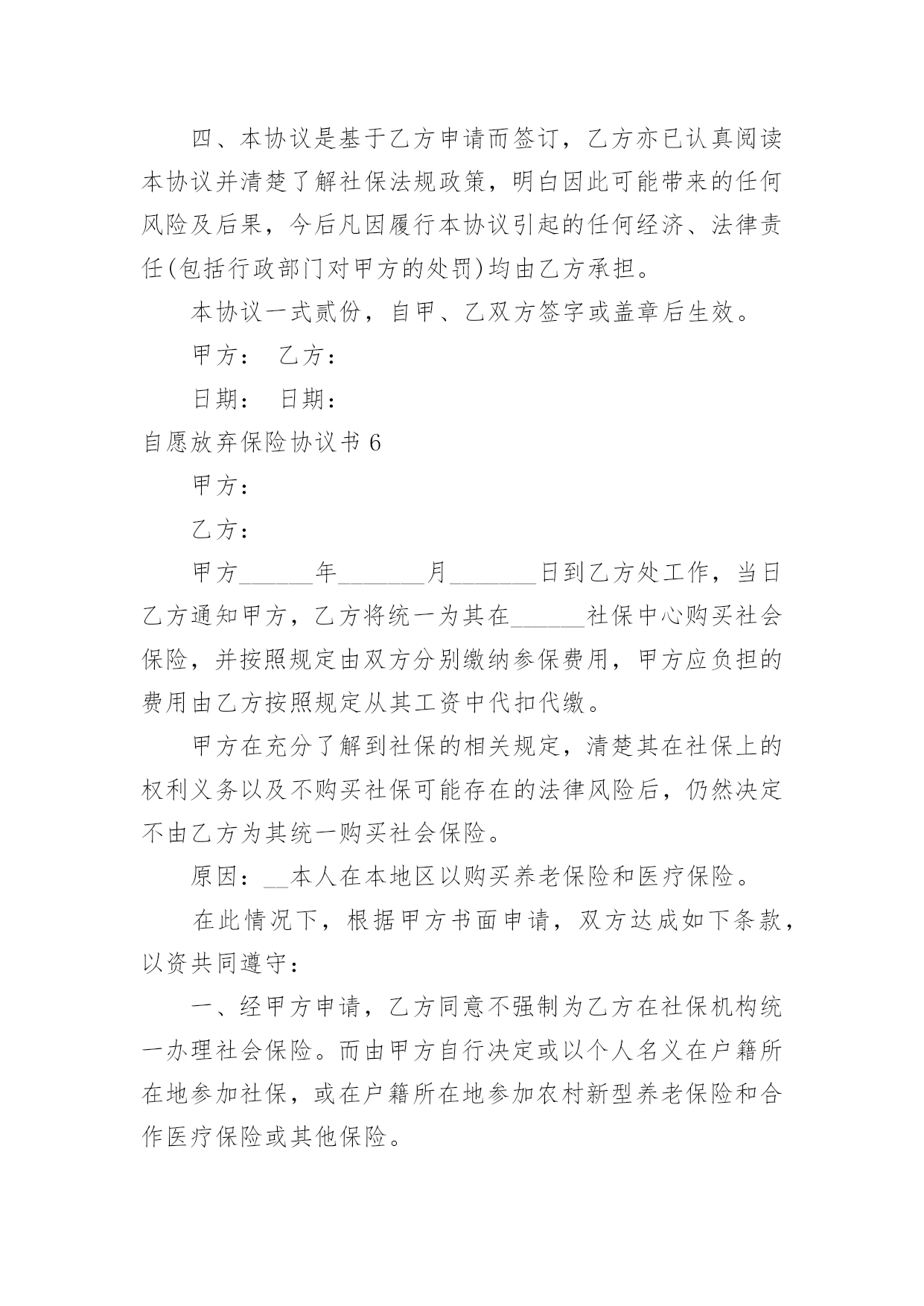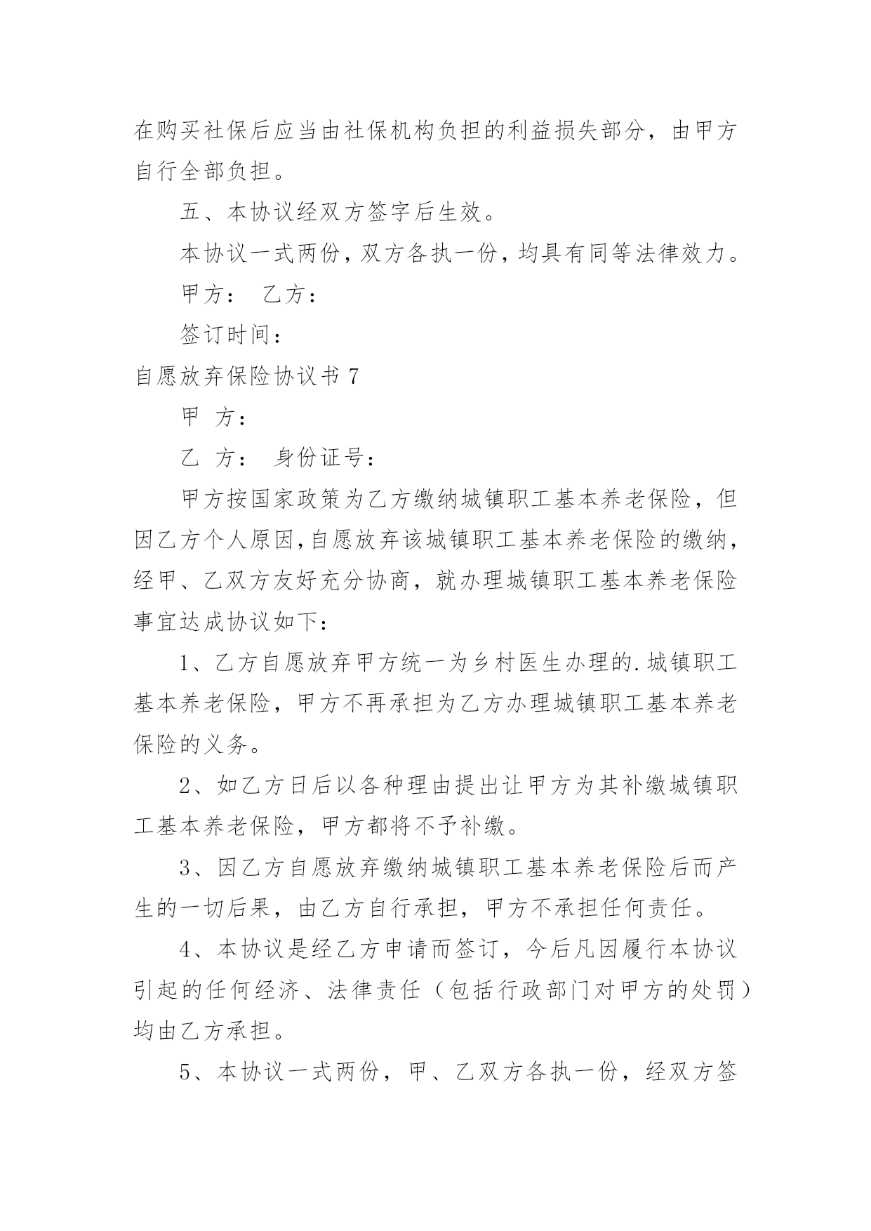 自愿放弃保险协议书自愿放弃保险协议书(7篇)在不断进步的社会中,人们运用到协议的场合不断增多,签订协议是提高经济效益的手段。想写协议却不知道该请教谁?以下是小编收集整理的自愿放弃保险协议书,希望对大家有所帮助。自愿放弃保险协议书1甲方:乙方:身份证号:甲方同意乙方缴纳养老保险、失业保险、工伤及医疗等社会保险,因乙方考虑从工资中扣除个人承担的缴交部分会影响工资收入,经双方协商,乙方自愿放弃甲方为乙方办理社保,甲方按济南市社保缴费标准给予乙方一定的`社保补贴,社保补贴每月随本人工资一同发放,如日后员工反悔要求单位补交社保的,单位有权不予办理,如员工已领取社保补贴而未参加其他形式的社保或商业保险,造成社保无法享受的后果由员工自行承担。员工已仔细阅读并充分理解说明内容的,请签字确认。特立此协议,协议书一式两份,甲乙双方各执一份。本协议未尽事宜由双方协商解决。甲方签字:乙方签字:日期:日期:自愿放弃保险协议书2甲方:xxx乙方:xxxxxxx甲方20xx年x月x日到乙方处工作,当日乙方通知甲方,乙方将统一为其在xx社保中心购买社会保险,并按照规定由双方分别缴纳参保费用,甲方应负担的费用由乙方按照规定从其工资中代扣代缴。甲方在充分了解到社保的相关规定,清楚其在社保上的权利义务以及不购买社保可能存在的法律风险后,仍然决定不由乙方为其统一购买社会保险。原因:xx本人在本地区以购买养老保险和医疗保险。在此情况下,根据甲方书面申请,双方达成如下条款,以资共同遵守:一、经甲方申请,乙方同意不强制为乙方在社保机构统一办理社会保险。而由甲方自行决定或以个人名义在户籍所在地参加社保,或在户籍所在地参加农村新型养老保险和合作医疗保险或其他保险。乙方将因购买社会保险而应当由单位缴纳的参保费用直接支付给乙方。该费用由乙方根据泰州市高港区社保机构公布的上一年度参保基数确定,每年核定,并按月与工资一并发放给甲方。二、在工作期间,如有需要,甲方可以重新书面申请乙方为其办理社保参保手续。甲方接到申请后,按照泰州市高港区社保机构的规定,从社保机构同意受理甲方的参保的当月起统一为甲方购买社保,并从社保机构受理甲方的参保当月起停止向甲方发放社保补贴,按规定从甲方工资中代扣代缴应当由甲方负担的参保费用。三、甲方无论是在工作期间还是离职后,如要求乙方为其补办在乙方工作期间未办理社保的期间的社保,甲方需退还已从乙方处领取的全部社保补贴,并按照其工作期间的工资标准支付应当由其缴纳的'社保费用,对在补办社保保险中社保机构按照规定要求缴纳的滞纳金全部由甲方负担。对按照规定能够补办的社保项目,乙方在收到甲方按照前款支付的费用后,按照规定为甲方补办社保。甲方不按前款支付和退还费用的,乙方有权拒绝补办直至其完全履行止。对因不能补办社保项目所导致的利益损失由甲方自行承担。四、双方均认识到,由于养老保险是社保项目中的基础险,如未购买养老保险则无法购买其他险种。在因甲方申请没有统一购买社保期间,对因发生工伤或非工伤而造成的如在购买社保后应当由社保机构负担的利益损失部分,由甲方自行全部负担。五、本协议经双方签字后生效。本协议一式两份,双方各执一份,均具有同等法律效力。甲方:xxx乙方:xxxxxxx签订时间:20xx年x月x日自愿放弃保险协议书3甲方:乙方:身份证号:甲方按国家政策为乙方缴纳城镇职工基本养老保险,但因乙方个人原因,自愿放弃该城镇职工基本养老保险的缴纳,经甲、乙双方友好充分协商,就办理城镇职工基本养老保险事宜达成协议如下:1、乙方自愿放弃甲方统一为乡村医生办理的.城镇职工基本养老保险,甲方不再承担为乙方办理城镇职工基本养老保险的义务。2、如乙方日后以各种理由提出让甲方为其补缴城镇职工基本养老保险,甲方都将不予补缴。3、因乙方自愿放弃缴纳城镇职工基本养老保险后而产生的一切后果,由乙方自行承担,甲方不承担任何责任。4、本协议是经乙方申请而签订,今后凡因履行本协议引起的任何经济、法律责任(包括行政部门对甲方的处罚)均由乙方承担。5、本协议一式两份,甲、乙双方各执一份,经双方签字、盖章后生效。甲方(盖章):乙方(盖章):年月日年月日自愿放弃保险协议书4甲方:乙方:身份证号:甲方按国家政策为乙方缴纳城镇职工基本养老保险,但因乙方个人原因,自愿放弃该城镇职工基本养老保险的缴纳,经甲、乙双方友好充分协商,就办理城镇职工基本养老保险事宜达成协议如下:1、乙方自愿放弃甲方统一为乡村医生办理的城镇职工基本养老保险,甲方不再承担为乙方办理城镇职工基本养老保险的义务。2、如乙方日后以各种理由提出让甲方为其补缴城镇职工基本养老保险,甲方都将不予补缴。3、因乙方自愿放弃缴纳城镇职工基本养老保险后而产生的一切后果,由乙方自行承担,甲方不承担任何责任。4、本协议是经乙方申请而签订,今后凡因履行本协议引起的.任何经