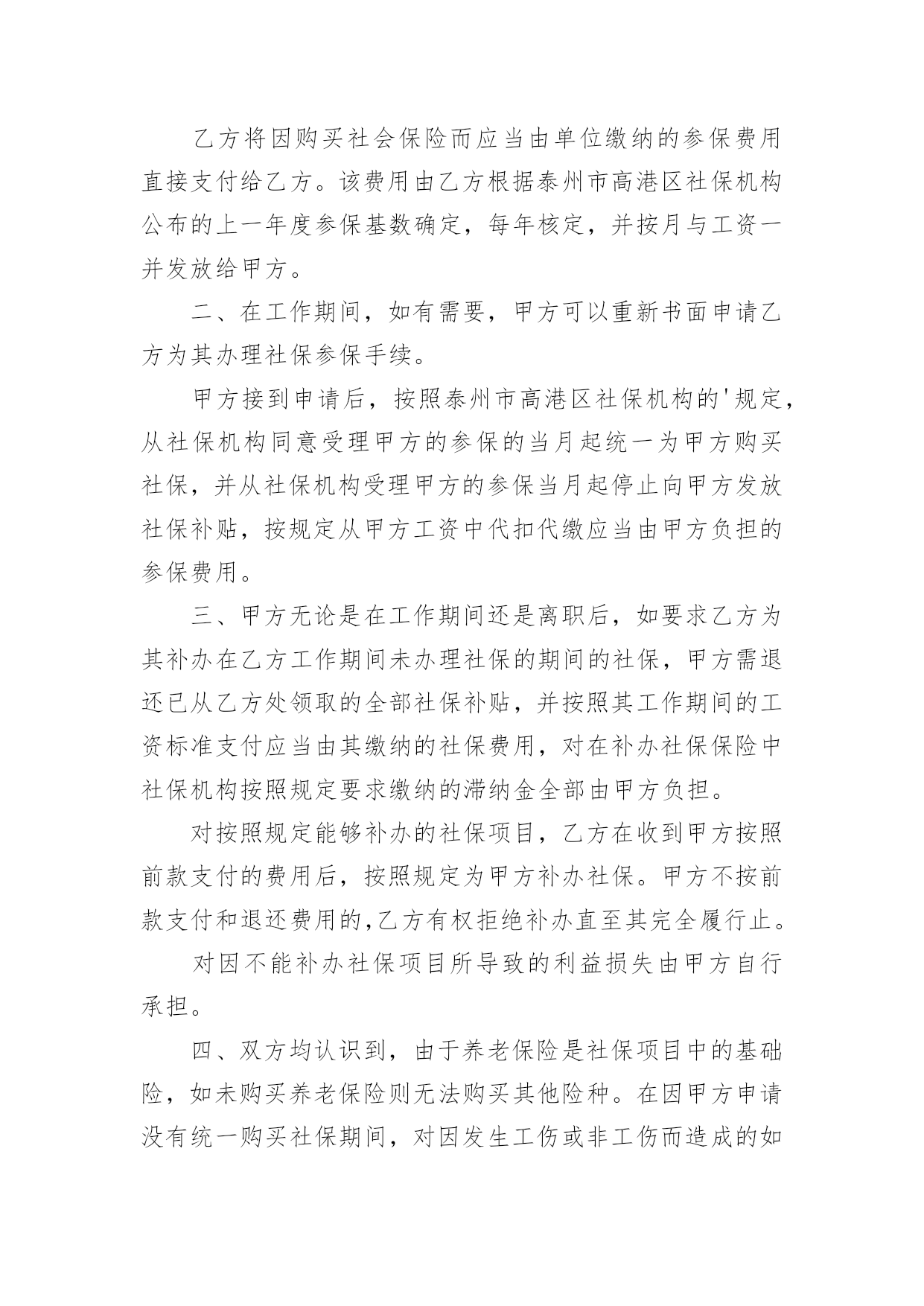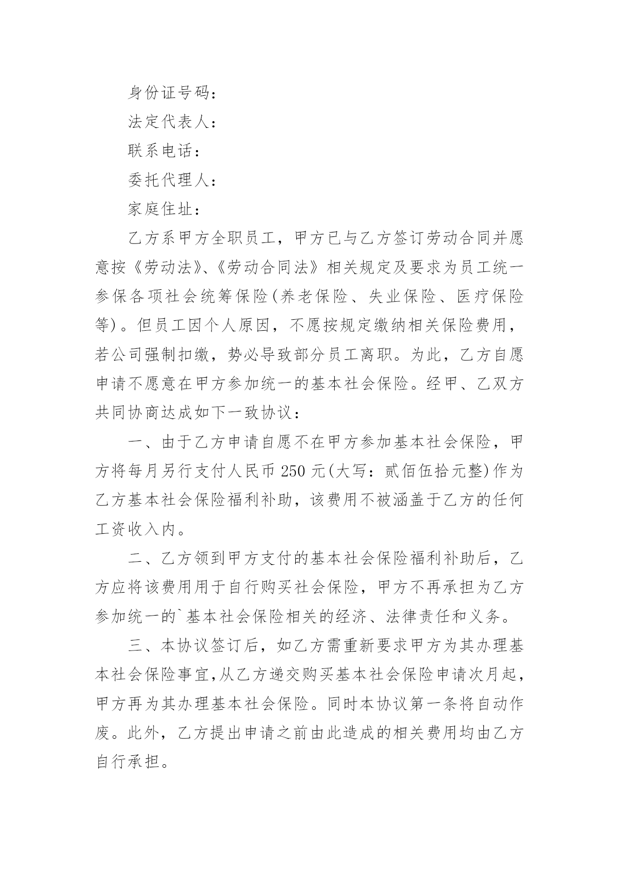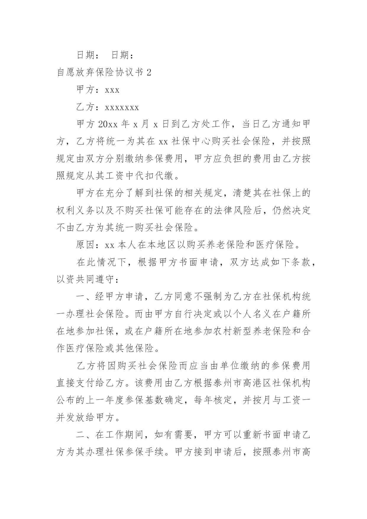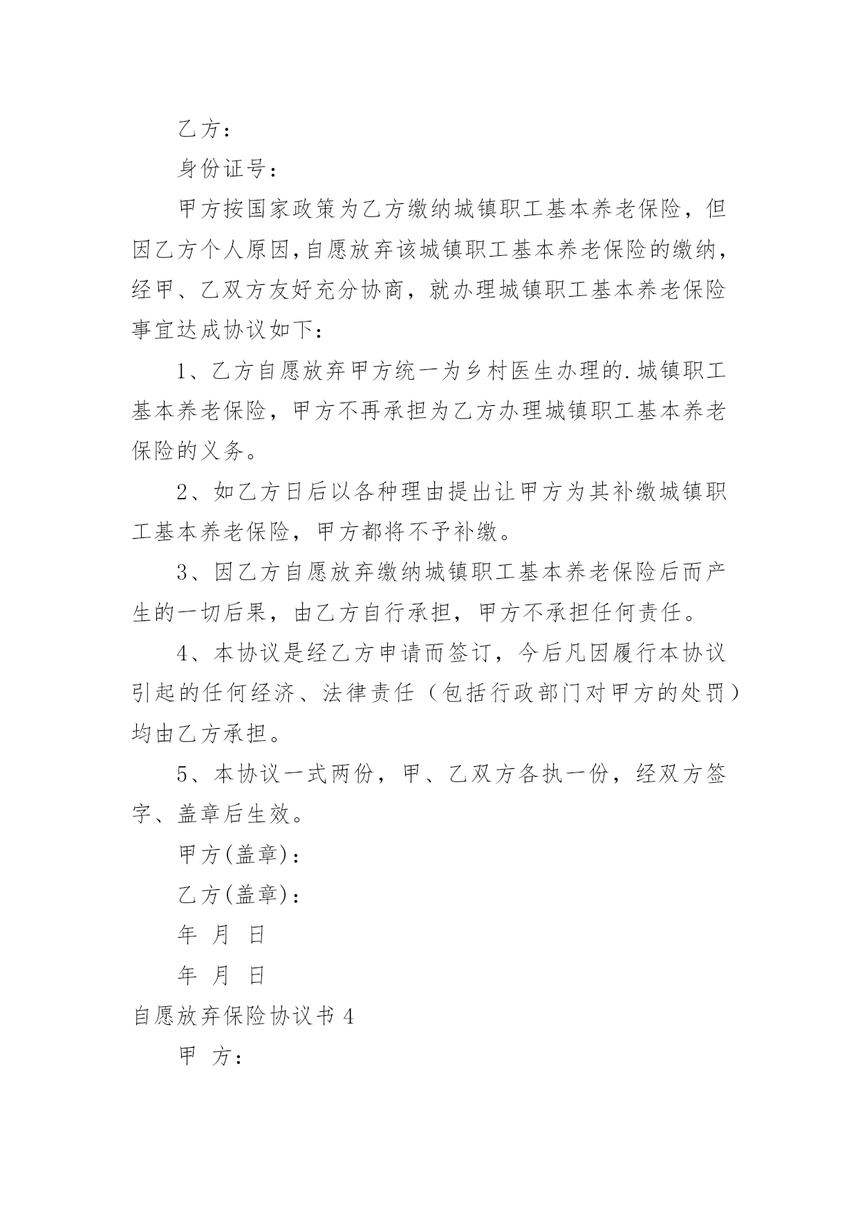 自愿放弃保险协议书自愿放弃保险协议书(7篇)在不断进步的社会中,人们运用到协议的场合不断增多,签订协议是提高经济效益的手段。想写协议却不知道该请教谁?以下是小编收集整理的自愿放弃保险协议书,希望对大家有所帮助。自愿放弃保险协议书1甲方:乙方:身份证号:甲方同意乙方缴纳养老保险、失业保险、工伤及医疗等社会保险,因乙方考虑从工资中扣除个人承担的缴交部分会影响工资收入,经双方协商,乙方自愿放弃甲方为乙方办理社保,甲方按济南市社保缴费标准给予乙方一定的`社保补贴,社保补贴每月随本人工资一同发放,如日后员工反悔要求单位补交社保的,单位有权不予办理,如员工已领取社保补贴而未参加其他形式的社保或商业保险,造成社保无法享受的后果由员工自行承担。员工已仔细阅读并充分理解说明内容的,请签字确认。特立此协议,协议书一式两份,甲乙双方各执一份。本协议未尽事宜由双方协商解决。甲方签字:乙方签字:日期:日期:自愿放弃保险协议书2甲方:xxx乙方:xxxxxxx甲方20xx年x月x日到乙方处工作,当日乙方通知甲方,乙方将统一为其在xx社保中心购买社会保险,并按照规定由双方分别缴纳参保费用,甲方应负担的费用由乙方按照规定从其工资中代扣代缴。甲方在充分了解到社保的相关规定,清楚其在社保上的权利义务以及不购买社保可能存在的法律风险后,仍然决定不由乙方为其统一购买社会保险。原因:xx本人在本地区以购买养老保险和医疗保险。在此情况下,根据甲方书面申请,双方达成如下条款,以资共同遵守:一、经甲方申请,乙方同意不强制为乙方在社保机构统一办理社会保险。而由甲方自行决定或以个人名义在户籍所在地参加社保,或在户籍所在地参加农村新型养老保险和合作医疗保险或其他保险。乙方将因购买社会保险而应当由单位缴纳的参保费用直接支付给乙方。该费用由乙方根据泰州市高港区社保机构公布的上一年度参保基数确定,每年核定,并按月与工资一并发放给甲方。二、在工作期间,如有需要,甲方可以重新书面申请乙方为其办理社保参保手续。甲方接到申请后,按照泰州市高港区社保机构的规定,从社保机构同意受理甲方的参保的当月起统一为甲方购买社保,并从社保机构受理甲方的参保当月起停止向甲方发放社保补贴,按规定从甲方工资中代扣代缴应当由甲方负担的参保费用。三、甲方无论是在工作期间还是离职后,如要求乙方为其补办在乙方工作期间未办理社保的期间的社保,甲方需退还已从乙方处领取的全部社保补贴,并按照其工作期间的工资标准支付应当由其缴纳的'社保费用,对在补办社保保险中社保机构按照规定要求缴纳的滞纳金全部由甲方负担。对按照规定能够补办的社保项目,乙方在收到甲方按照前款支付的费用后,按照规定为甲方补办社保。甲方不按前款支付和退还费用的,乙方有权拒绝补办直至其完全履行止。对因不能补办社保项目所导致的利益损失由甲方自行承担。四、双方均认识到,由于养老保险是社保项目中的基础险,如未购买养老保险则无法购买其他险种。在因甲方申请没有统一购买社保期间,对因发生工伤或非工伤而造成的如在购买社保后应当由社保机构负担的利益损失部分,由甲方自行全部负担。五、本协议经双方签字后生效。本协议一式两份,双方各执一份,均具有同等法律效力。甲方:xxx乙方:xxxxxxx签订时间:20xx年x月x日自愿放弃保险协议书3甲方:乙方:身份证号:甲方按国家政策为乙方缴纳城镇职工基本养老保险,但因乙方个人原因,自愿放弃该城镇职工基本养老保险的缴纳,经甲、乙双方友好充分协商,就办理城镇职工基本养老保险事宜达成协议如下:1、乙方自愿放弃甲方统一为乡村医生办理的.城镇职工基本养老保险,甲方不再承担为乙方办理城镇职工基本养老保险的义务。2、如乙方日后以各种理由提出让甲方为其补缴城镇职工基本养老保险,甲方都将不予补缴。3、因乙方自愿放弃缴纳城镇职工基本养老保险后而产生的一切后果,由乙方自行承担,甲方不承担任何责任。4、本协议是经乙方申请而签订,今后凡因履行本协议引起的任何经济、法律责任(包括行政部门对甲方的处罚)均由乙方承担。5、本协议一式两份,甲、乙双方各执一份,经双方签字、盖章后生效。甲方(盖章):乙方(盖章):年月日年月日自愿放弃保险协议书4甲方:乙方:身份证号:甲方按国家政策为乙方缴纳城镇职工基本养老保险,但因乙方个人原因,自愿放弃该城镇职工基本养老保险的缴纳,经甲、乙双方友好充分协商,就办理城镇职工基本养老保险事宜达成协议如下:1、乙方自愿放弃甲方统一为乡村医生办理的城镇职工基本养老保险,甲方不再承担为乙方办理城镇职工基本养老保险的义务。2、如乙方日后以各种理由提出让甲方为其补缴城镇职工基本养老保险,甲方都将不予补缴。3、因乙方自愿放弃缴纳城镇职工基本养老保险后而产生的一切后果,由乙方自行承担,甲方不承担任何责任。4、本协议是经乙方申请而签订,今后凡因履行本协议引起的.任何经