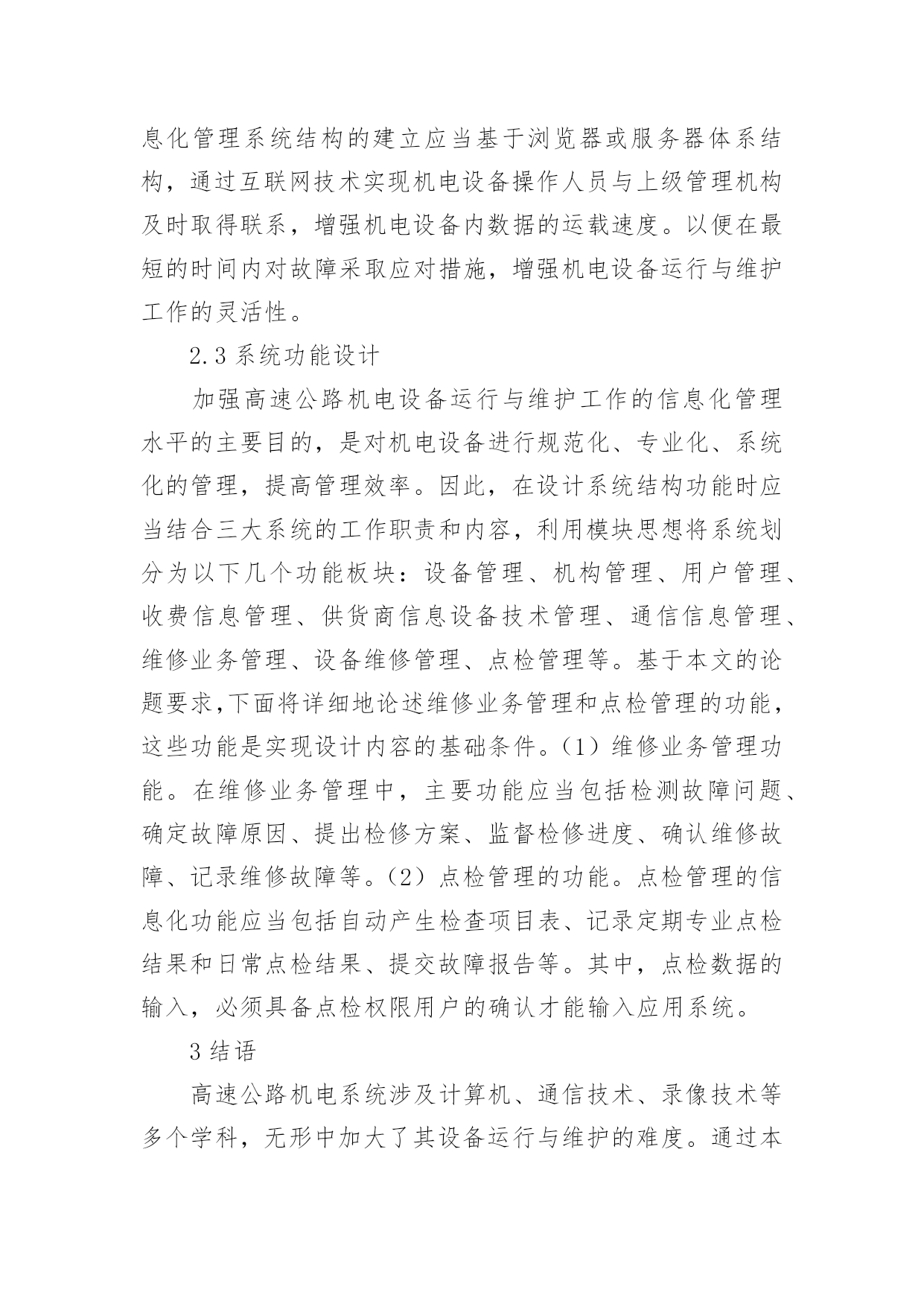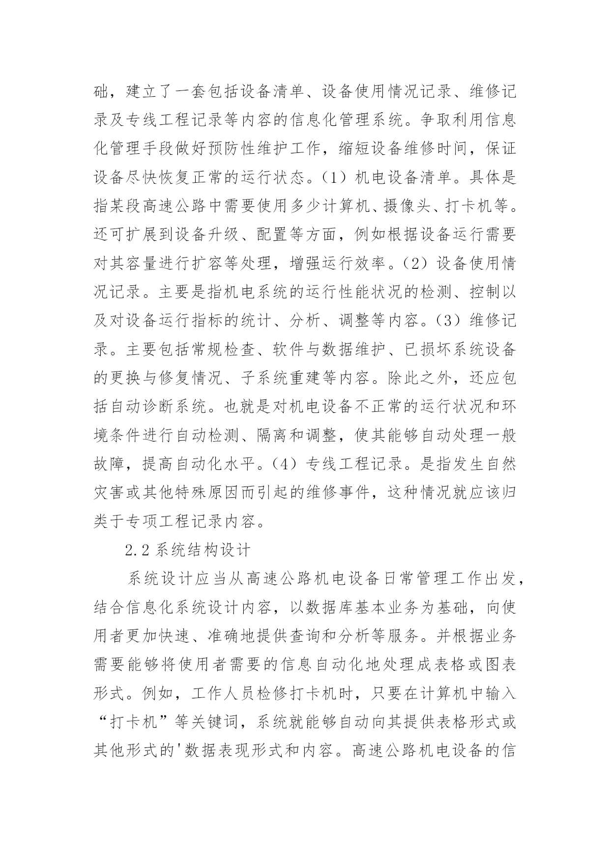 机电设备信息化监管体系设计论文机电设备信息化监管体系设计论文随着高速公路车流量的逐渐增大,对公路安全、快速、舒适、高效等使用性能的要求也越来越高。机电系统作为高速公路管理的指挥中心和中枢,其信息化建设水平对其使用性能的实现有着至关重要的联系。为了保证机电系统能够更好地服务于高速公路管理,有必要较为详细地研究与分析其运行与维护工作的信息化管理,提高数据运输系统的自动化水平,进而保证机电设备长期处于高质、高效的工作状态。1高速公路机电设备信息化管理的必要性高速公路的机电系统主要包括三大运行系统:收费系统、通讯系统和监控系统。三大系统各司其职,互为补充,发挥着各自的不同功能以保证高速公路使用性能的实现。从这三大系统可知机电设备涉及计算机、电子通信、电视摄像、录像广播等多种学科,是对智能化和自动化水平要求特别高的一种系统工程。在运行中一旦发生微小的差错都有可能造成非常严重的破坏性影响。因此,需要利用信息化手段管理机电设备的运行和维护工作,满足故障处理及时、反映迅速、管理效率高等要求,最大程度地保证其工作质量与效率。2机电设备信息化管理系统设计2.1系统内容设计以高速公路机电设备运行与维护工作的主要内容为基础,建立了一套包括设备清单、设备使用情况记录、维修记录及专线工程记录等内容的信息化管理系统。争取利用信息化管理手段做好预防性维护工作,缩短设备维修时间,保证设备尽快恢复正常的运行状态。(1)机电设备清单。具体是指某段高速公路中需要使用多少计算机、摄像头、打卡机等。还可扩展到设备升级、配置等方面,例如根据设备运行需要对其容量进行扩容等处理,增强运行效率。(2)设备使用情况记录。主要是指机电系统的运行性能状况的检测、控制以及对设备运行指标的统计、分析、调整等内容。(3)维修记录。主要包括常规检查、软件与数据维护、已损坏系统设备的更换与修复情况、子系统重建等内容。除此之外,还应包括自动诊断系统。也就是对机电设备不正常的运行状况和环境条件进行自动检测、隔离和调整,使其能够自动处理一般故障,提高自动化水平。(4)专线工程记录。是指发生自然灾害或其他特殊原因而引起的维修事件,这种情况就应该归类于专项工程记录内容。2.2系统结构设计系统设计应当从高速公路机电设备日常管理工作出发,结合信息化系统设计内容,以数据库基本业务为基础,向使用者更加快速、准确地提供查询和分析等服务。并根据业务需要能够将使用者需要的信息自动化地处理成表格或图表形式。例如,工作人员检修打卡机时,只要在计算机中输入“打卡机”等关键词,系统就能够自动向其提供表格形式或其他形式的'数据表现形式和内容。高速公路机电设备的信息化管理系统结构的建立应当基于浏览器或服务器体系结构,通过互联网技术实现机电设备操作人员与上级管理机构及时取得联系,增强机电设备内数据的运载速度。以便在最短的时间内对故障采取应对措施,增强机电设备运行与维护工作的灵活性。2.3系统功能设计加强高速公路机电设备运行与维护工作的信息化管理水平的主要目的,是对机电设备进行规范化、专业化、系统化的管理,提高管理效率。因此,在设计系统结构功能时应当结合三大系统的工作职责和内容,利用模块思想将系统划分为以下几个功能板块:设备管理、机构管理、用户管理、收费信息管理、供货商信息设备技术管理、通信信息管理、维修业务管理、设备维修管理、点检管理等。基于本文的论题要求,下面将详细地论述维修业务管理和点检管理的功能,这些功能是实现设计内容的基础条件。(1)维修业务管理功能。在维修业务管理中,主要功能应当包括检测故障问题、确定故障原因、提出检修方案、监督检修进度、确认维修故障、记录维修故障等。(2)点检管理的功能。点检管理的信息化功能应当包括自动产生检查项目表、记录定期专业点检结果和日常点检结果、提交故障报告等。其中,点检数据的输入,必须具备点检权限用户的确认才能输入应用系统。3结语高速公路机电系统涉及计算机、通信技术、录像技术等多个学科,无形中加大了其设备运行与维护的难度。通过本文对其信息化管理系统的设计内容、设计结构和结构功能论述,建立了一套可行性较高的信息化管理系统。信息化管理手段在高速公路机电设备运行与维护工作中的应用,能够提高设备的运行速度,增强对故障的反映速度与处理能力,从而全面而系统地保证高速公路实现安全、快速、舒适和高效等使用性能。