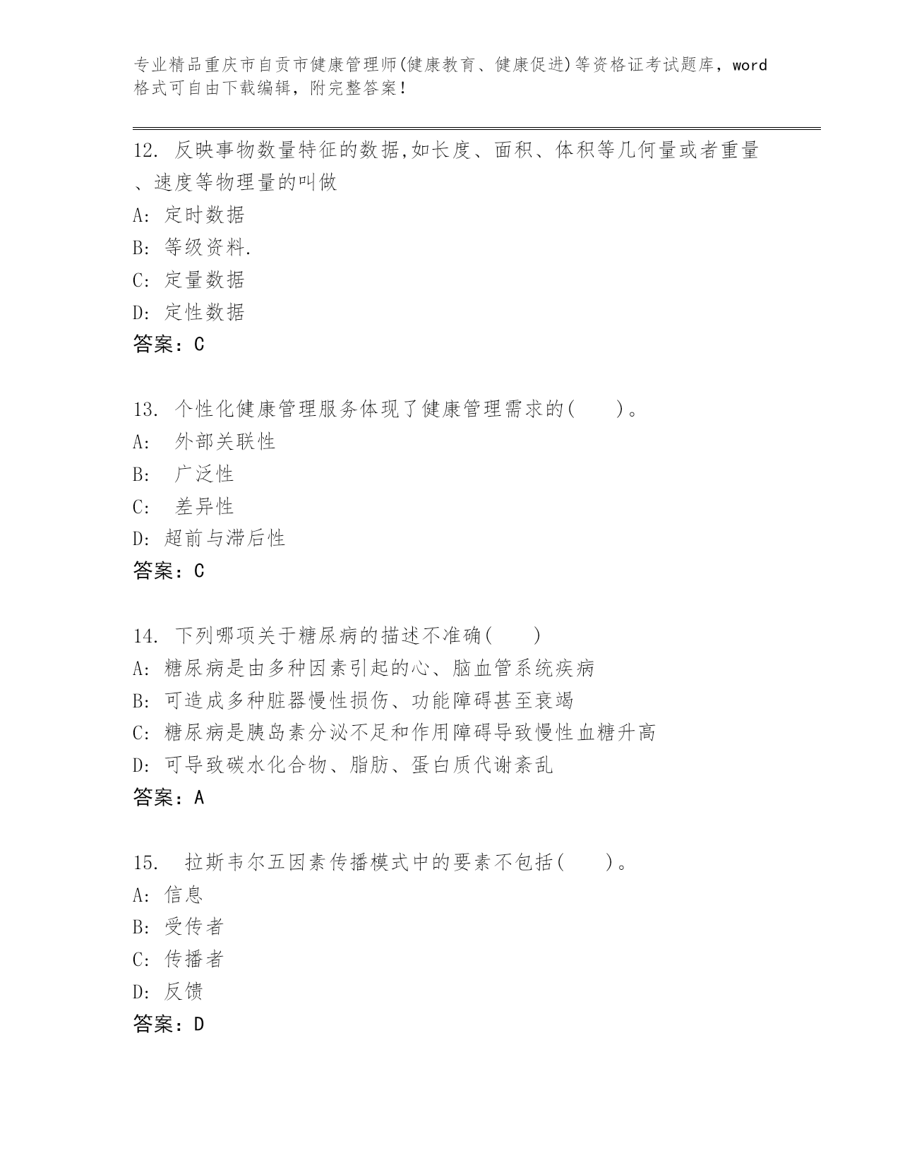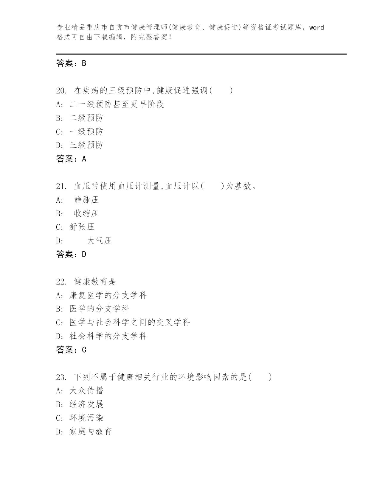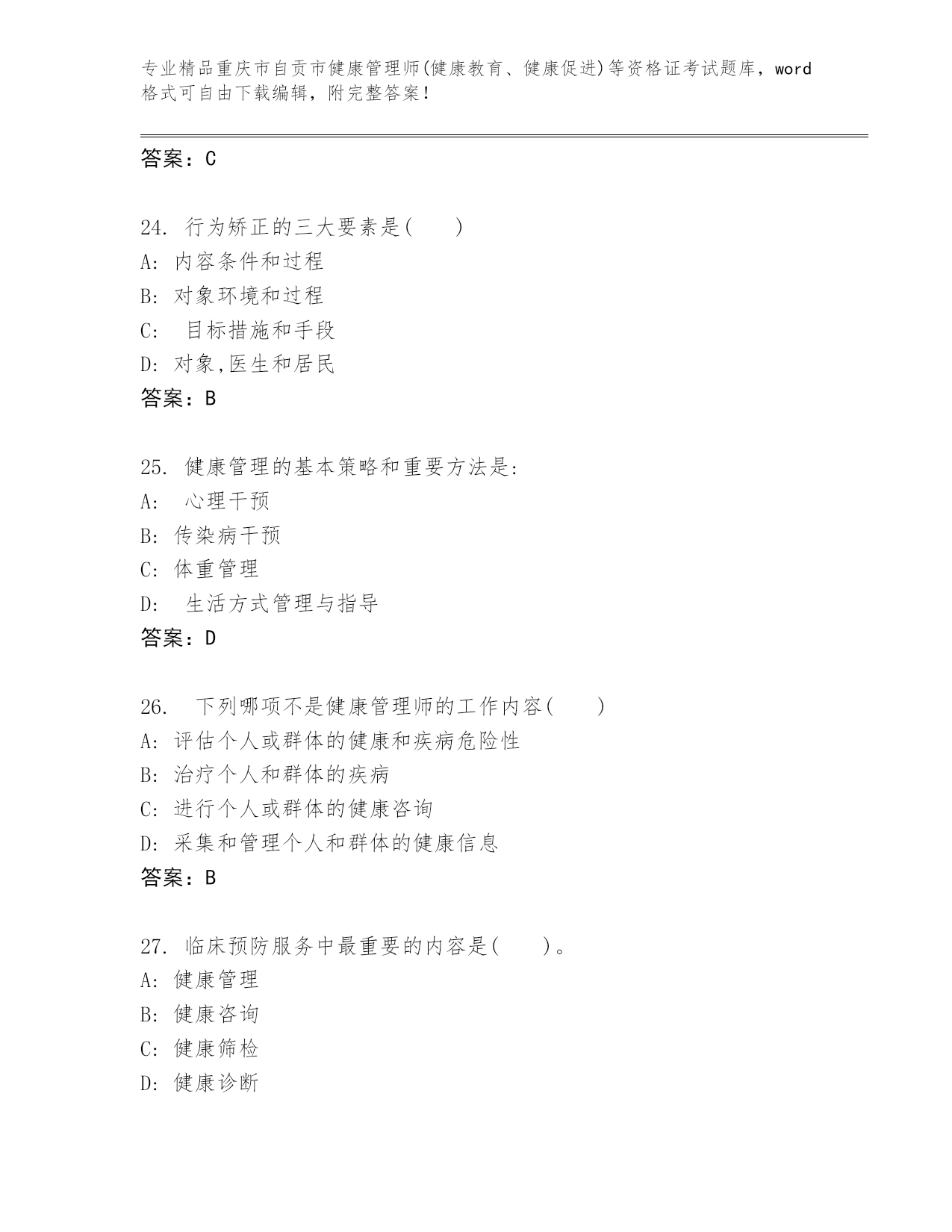 重庆市自贡市健康管理师(健康教育、健康促进)等资格证考试通用题库(精选题)
