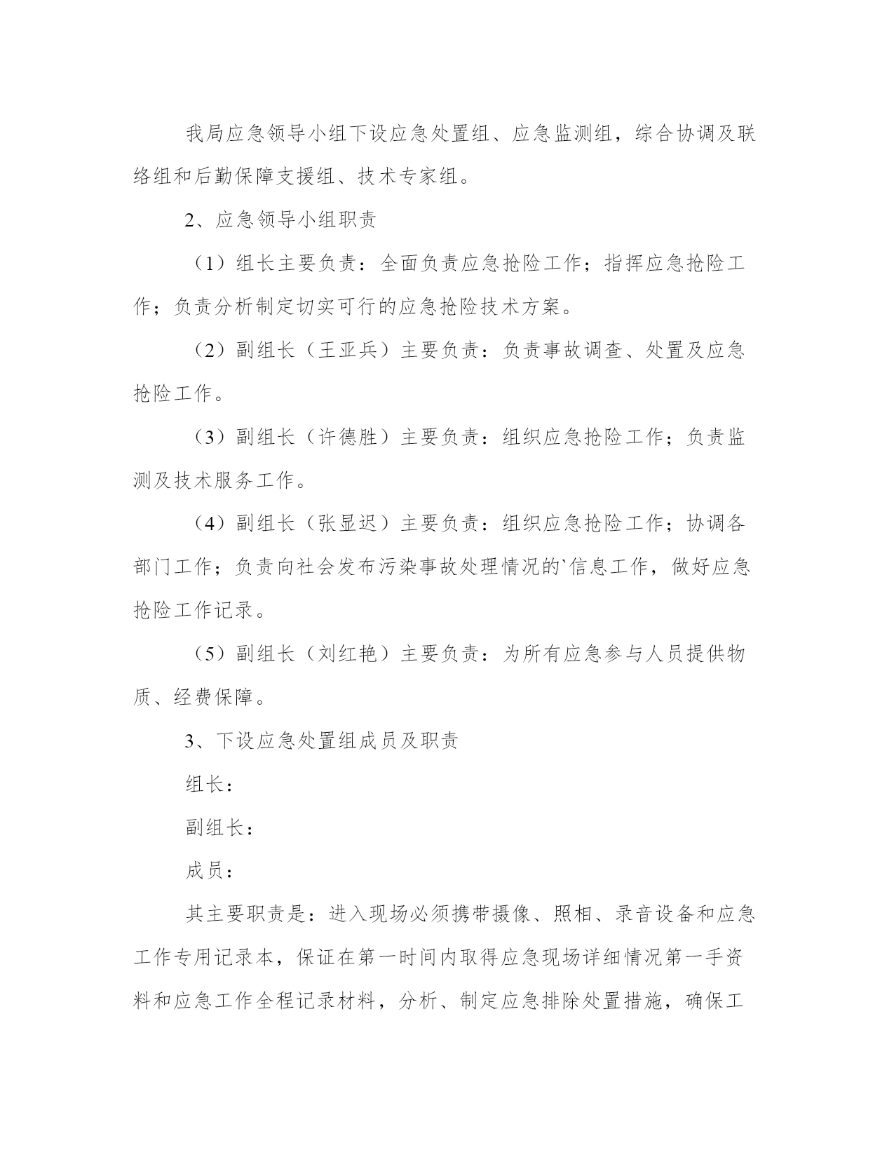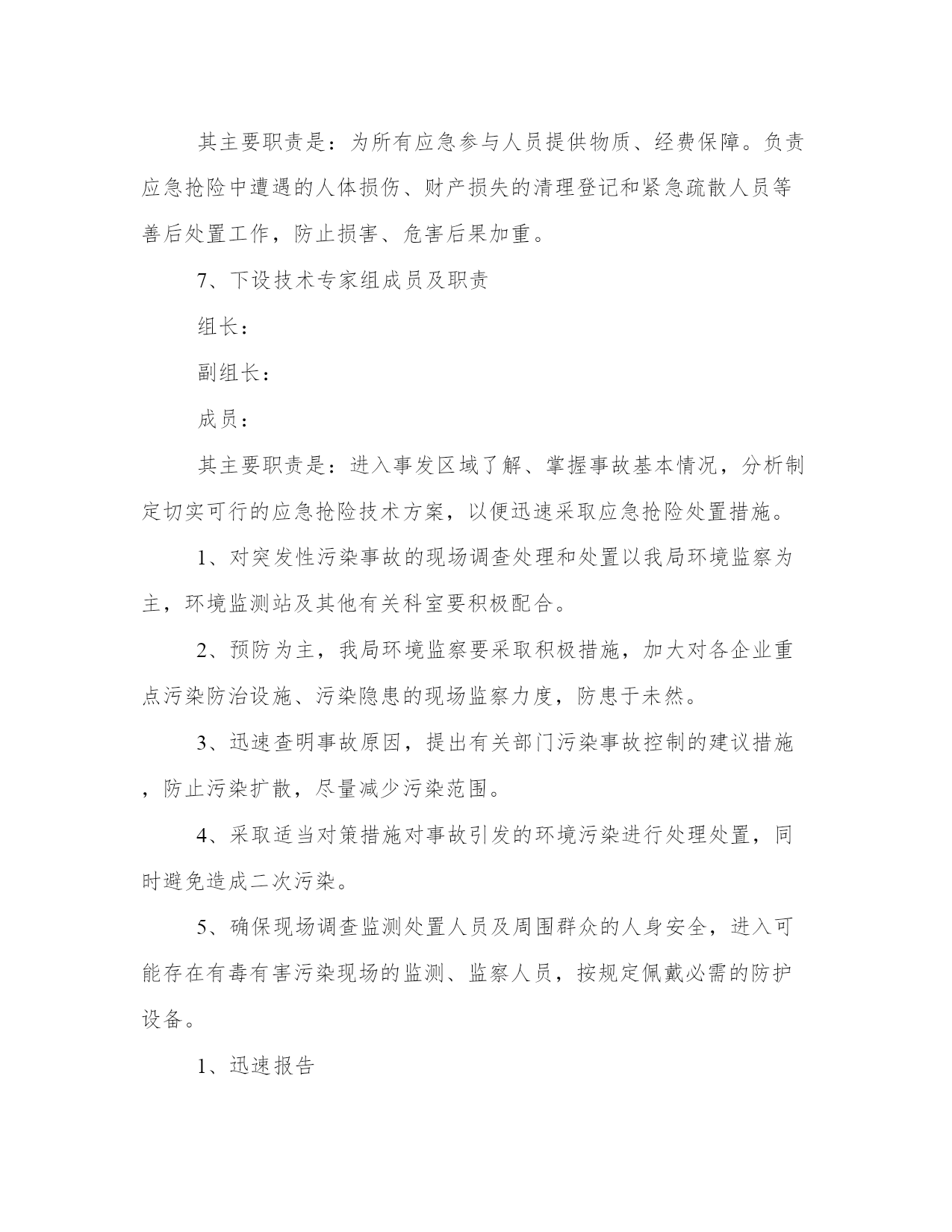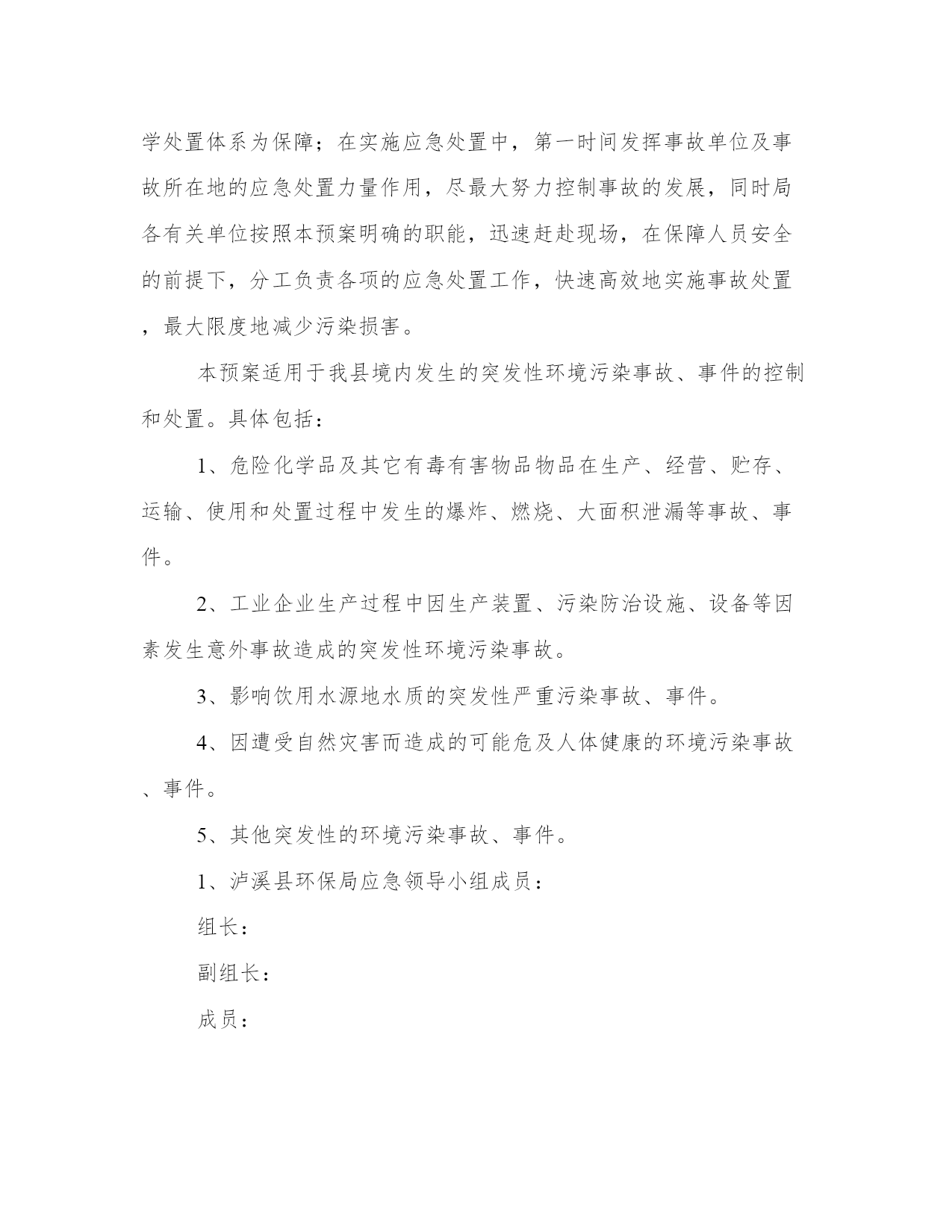 环保应急预案(汇总14篇)总结是一种思维的训练,通过不断总结经验和反思,我们可以提高自己的思考能力和判断能力。写一篇完美的总结要注意语句通顺,段落衔接自然,以提升总结的流畅度。这里有一些总结范文的例子,供大家参考写作时的思路和结构。环保应急预案篇一在平平淡淡的学习、工作、生活中,有时会出现一些意料之外的事件或事故,为了减小事故造成的危害,总不可避免地需要事先编制应急预案。那么你有了解过应急预案吗?下面是小编收集整理的厂环保应急预案范文,欢迎阅读,希望大家能够喜欢。贯彻落实“三个代表”重要思想,坚持“以人为本”、“预防为主”,规范和强化环境保护部门应对突发性污染事故、事件应急处置工作。使环境污染事故应急处置做到高起点、高标准、具有前瞻性、可操作性;建立与环境污染事故应急处置相适应的统一指挥、综合有力、规范有序、科学高效的应急救援队伍,有效地实施环境污染事故的应急处置。环境污染事故应急处置工作在政府统一领导下,贯彻以人为本、依法规范、资源共享、分工负责、快速高效、科学决策的原则。通过局应急指挥系统,整合现有污染事故应急处置资源。以机制优化、分工明确、责任到人、资源统一、优势互补、防患未然、常备不懈、科学处置体系为保障;在实施应急处置中,第一时间发挥事故单位及事故所在地的应急处置力量作用,尽最大努力控制事故的发展,同时局各有关单位按照本预案明确的职能,迅速赶赴现场,在保障人员安全的前提下,分工负责各项的应急处置工作,快速高效地实施事故处置,最大限度地减少污染损害。本预案适用于我县境内发生的突发性环境污染事故、事件的控制和处置。具体包括:1、危险化学品及其它有毒有害物品物品在生产、经营、贮存、运输、使用和处置过程中发生的爆炸、燃烧、大面积泄漏等事故、事件。2、工业企业生产过程中因生产装置、污染防治设施、设备等因素发生意外事故造成的突发性环境污染事故。3、影响饮用水源地水质的突发性严重污染事故、事件。4、因遭受自然灾害而造成的可能危及人体健康的环境污染事故、事件。5、其他突发性的环境污染事故、事件。1、泸溪县环保局应急领导小组成员:组长:副组长:成员:我局应急领导小组下设应急处置组、应急监测组,综合协调及联络组和后勤保障支援组、技术专家组。2、应急领导小组职责(1)组长主要负责:全面负责应急抢险工作;指挥应急抢险工作;负责分析制定切实可行的应急抢险技术方案。(2)副组长(王亚兵)主要负责:负责事故调查、处置及应急抢险工作。(3)副组长(许德胜)主要负责:组织应急抢险工作;负责监测及技术服务工作。(4)副组长(张显迟)主要负责:组织应急抢险工作;协调各部门工作;负责向社会发布污染事故处理情况的`信息工作,做好应急抢险工作记录。(5)副组长(刘红艳)主要负责:为所有应急参与人员提供物质、经费保障。3、下设应急处置组成员及职责组长:副组长:成员:其主要职责是:进入现场必须携带摄像、照相、录音设备和应急工作专用记录本,保证在第一时间内取得应急现场详细情况第一手资料和应急工作全程记录材料,分析、制定应急排除处置措施,确保工作准确、快速、到位,并提出对事发责任单位和责任人员的处罚、处理意见,完善环境执法监督相关手续。4、下设应急监测组成员及职责组长:副组长:成员:其主要职责是:进入现场必须携带相关采样分析设备,快速提供监测数据,并立即提供给现场最高指挥人员,以便做出应急排除正确决策;不能进行现场分析的项目,尽快派人采样、分析、确保第一时间将监测报告交现场最高指挥或应急工作职能机构负责人。5、下设综合协调及联络组成员及职责组长:副组长:成员:其主要职责是:负责向社会发布污染事故处理情况的`信息工作,负责各工作组的协调、联络工作,做好应急抢险工作记录和相关书面材料工作。6、下设后勤保障支援组成员及职责组长:副组长:成员:其主要职责是:为所有应急参与人员提供物质、经费保障。负责应急抢险中遭遇的人体损伤、财产损失的清理登记和紧急疏散人员等善后处置工作,防止损害、危害后果加重。7、下设技术专家组成员及职责组长:副组长:成员:其主要职责是:进入事发区域了解、掌握事故基本情况,分析制定切实可行的应急抢险技术方案,以便迅速采取应急抢险处置措施。1、对突发性污染事故的现场调查处理和处置以我局环境监察为主,环境监测站及其他有关科室要积极配合。2、预防为主,我局环境监察要采取积极措施,加大对各企业重点污染防治设施、污染隐患的现场监察力度,防患于未然。3、迅速查明事故原因,提出有关部门污染事故控制的建议措施,防止污染扩散,尽量减少污染范围。4、采取适当对策措施对事故引发的环境污染进行处理处置,同时避免造成二次污染。5、确保现场调查监测处置人员及周围群众的人身安全,进入
