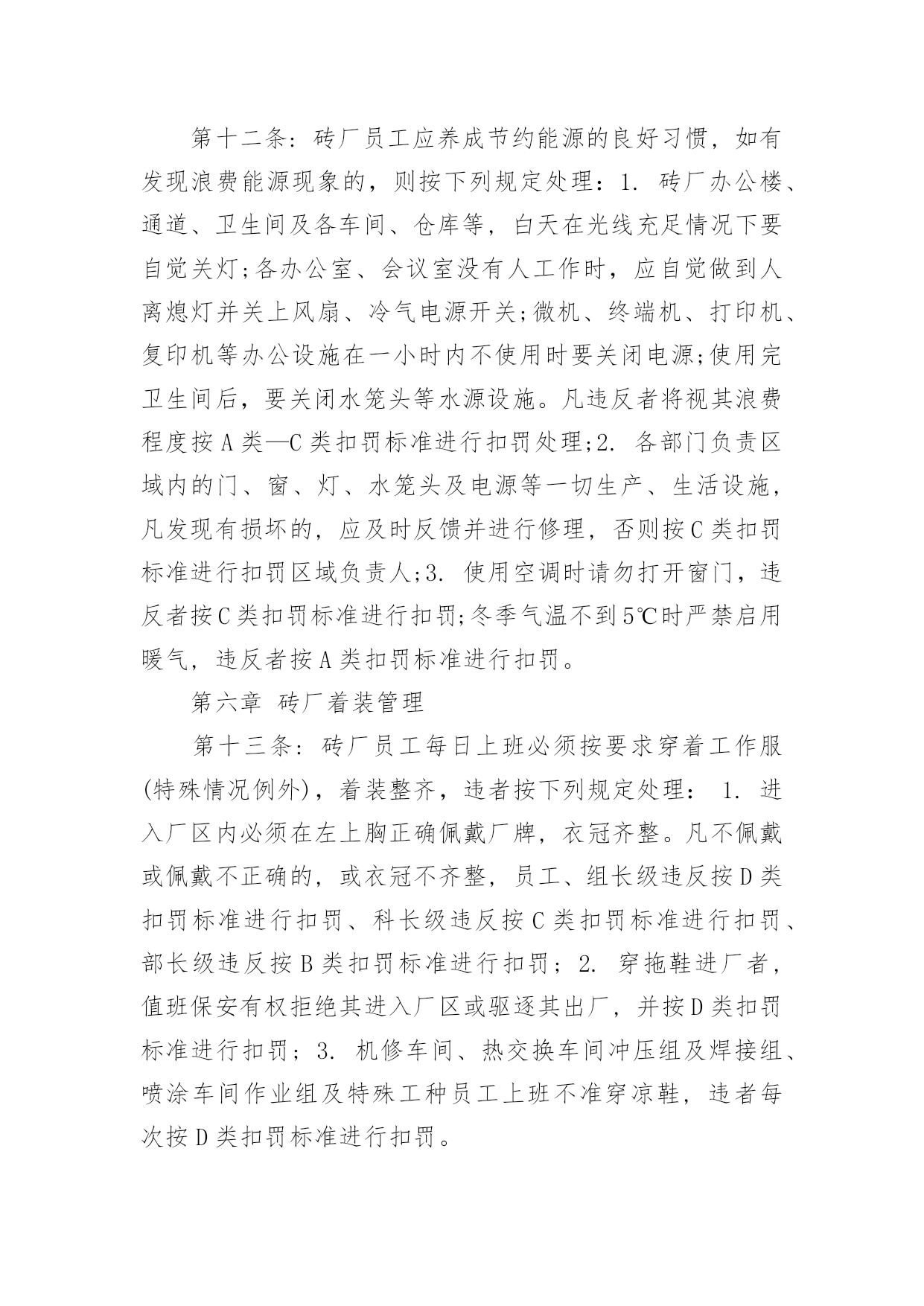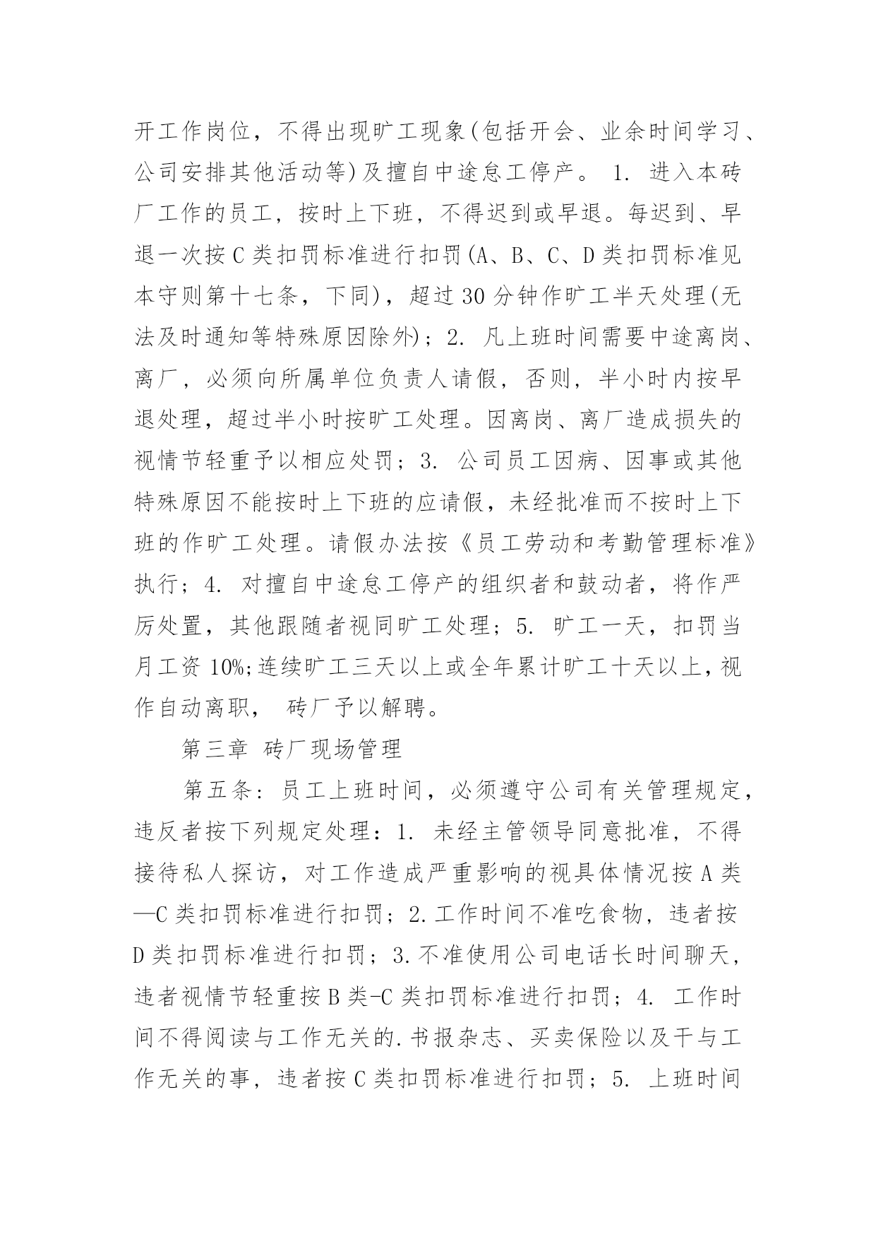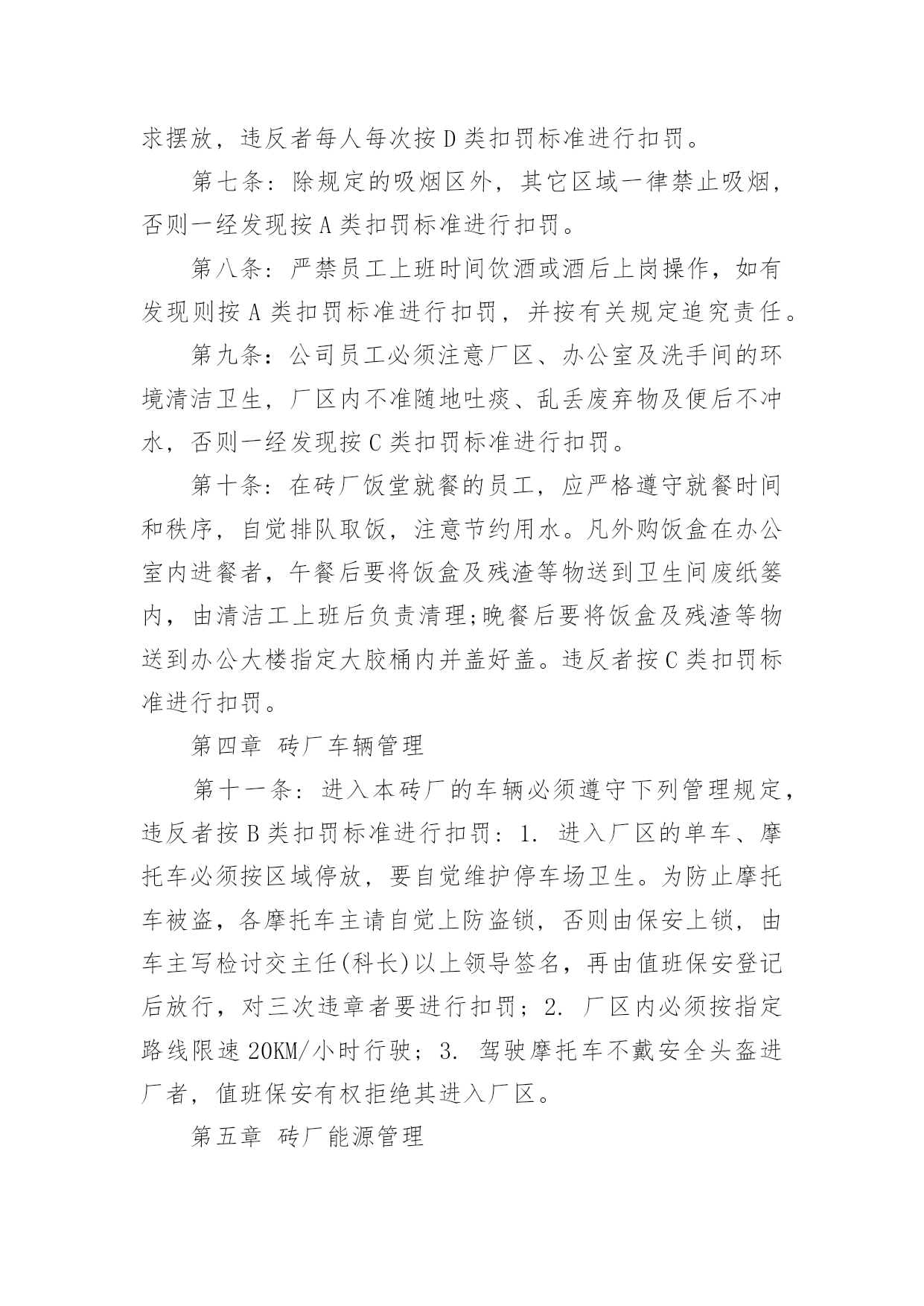 砖厂规章制度砖厂规章制度必备【6篇】现如今,制度在生活中的使用越来越广泛,制度一般指要求大家共同遵守的办事规程或行动准则,也指在一定历史条件下形成的法令、礼俗等规范或一定的规格。一般制度是怎么制定的呢?以下是小编收集整理的砖厂规章制度,仅供参考,大家一起来看看吧。砖厂规章制度1第一章总则第一条:为加强公司安全、文明生产(办公)、劳动纪律的管理,严肃公司劳动纪律,强化员工的自我约束能力,提高岗位工作效率,确保砖厂生产经营活动正常运作,树立良好的企业形象,实现各级领导和全体员工齐抓共管、人人遵守的目的,特制定本守则。第二条:本守则参照国家、省、市有关劳动法规而制订,是公司全体员工日常工作行为的一般准则,是公司对内部员工进行劳动奖惩的基本依据。公司每位员工必须严格遵守本规定,各级管理人员要起模范带头作用。第三条:本守则由本砖厂及部门负责人组织贯彻、执行,由人事行政部监督、考核,由驻公司保安协助执行。第二章砖厂考勤管理第四条:砖厂员工上班时间不得迟到、早退和不请假离开工作岗位,不得出现旷工现象(包括开会、业余时间学习、公司安排其他活动等)及擅自中途怠工停产。1.进入本砖厂工作的员工,按时上下班,不得迟到或早退。每迟到、早退一次按C类扣罚标准进行扣罚(A、B、C、D类扣罚标准见本守则第十七条,下同),超过30分钟作旷工半天处理(无法及时通知等特殊原因除外);2.凡上班时间需要中途离岗、离厂,必须向所属单位负责人请假,否则,半小时内按早退处理,超过半小时按旷工处理。因离岗、离厂造成损失的视情节轻重予以相应处罚;3.公司员工因病、因事或其他特殊原因不能按时上下班的应请假,未经批准而不按时上下班的作旷工处理。请假办法按《员工劳动和考勤管理标准》执行;4.对擅自中途怠工停产的组织者和鼓动者,将作严厉处置,其他跟随者视同旷工处理;5.旷工一天,扣罚当月工资10%;连续旷工三天以上或全年累计旷工十天以上,视作自动离职,砖厂予以解聘。第三章砖厂现场管理第五条:员工上班时间,必须遵守公司有关管理规定,违反者按下列规定处理:1.未经主管领导同意批准,不得接待私人探访,对工作造成严重影响的视具体情况按A类—C类扣罚标准进行扣罚;2.工作时间不准吃食物,违者按D类扣罚标准进行扣罚;3.不准使用公司电话长时间聊天,违者视情节轻重按B类-C类扣罚标准进行扣罚;4.工作时间不得阅读与工作无关的.书报杂志、买卖保险以及干与工作无关的事,违者按C类扣罚标准进行扣罚;5.上班时间办公室人员不得上网玩游戏,凡发现每次按A类扣罚标准进行扣罚;不得在上班时间上网从事非工作范围活动,一经发现按B类扣罚标准进行扣罚;6.上班要自觉树立企业形象,时常保持办公环境整洁,办公台面文件摆放整齐。不准躺或坐在办公台上,违反者按C类扣罚标准进行扣罚。第六条:生产车间员工工作时间必须精神饱满,积极工作,否则按下列规定处理:1.在生产一线工作的员工,一律不准在产品上坐、躺、休息,不准随意踩踏生产设备,不准打私人电话,违反规定的按C类扣罚标准进行扣罚;2.不准聚赌或违法乱纪,违反者视情节轻重进行扣罚,并送交公安机关处理;3.厂内机动专用的铲车、叉车、手推车在运输工件过程中,要安全操作限速行驶。不准站在或坐在车上,违者按B类扣罚标准进行扣罚;4.车间载货电梯不准搭乘人员上落(送货人员除外),不准用手推车碰撞电梯门及轿箱。损坏电梯安全的要负责赔偿并按A类扣罚标准进行扣罚,阻塞电梯门前走火通道的按C类扣罚标准进行扣罚;5.使用过的运输车必须按指定地点存放,不得随意乱丢弃车辆,如违反者每人次按C类扣罚标准进行扣罚;6.茶具器皿必须放在设置的茶具定置位内,不准放在岗位内或放在流水线下;消防箱及电柜内不得放其它物品,违者没收器皿并按D类扣罚标准进行扣罚;7.如因特殊情况提前下班的工人,立即收拾现场和工具后,应迅速离开,不得干扰他人工作,违反者按C类扣罚标准进行扣罚;8.员工岗位的工作箱、工具箱不放与工作无关的物品,要保持清洁,并按定置要求摆放,违反者每人每次按D类扣罚标准进行扣罚。第七条:除规定的吸烟区外,其它区域一律禁止吸烟,否则一经发现按A类扣罚标准进行扣罚。第八条:严禁员工上班时间饮酒或酒后上岗操作,如有发现则按A类扣罚标准进行扣罚,并按有关规定追究责任。第九条:公司员工必须注意厂区、办公室及洗手间的环境清洁卫生,厂区内不准随地吐痰、乱丢废弃物及便后不冲水,否则一经发现按C类扣罚标准进行扣罚。第十条:在砖厂饭堂就餐的员工,应严格遵守就餐时间和秩序,自觉排队取饭,注意节约用水。凡外购饭盒在办公室内进餐者,午餐后要将饭盒及残渣等物送到卫生间废纸篓内,由清洁工上班后负责清理;晚餐后要将饭盒及残渣等物送到办公大楼指定大胶桶内并盖好盖。违反者按C类扣罚标准进行扣罚。第四章砖厂车辆管理第十一条:进入本砖厂的车辆