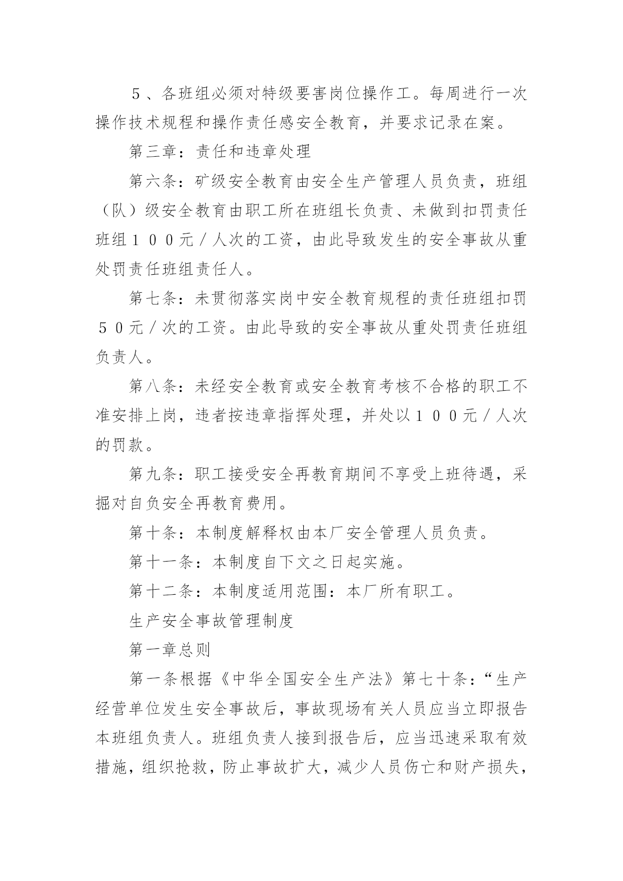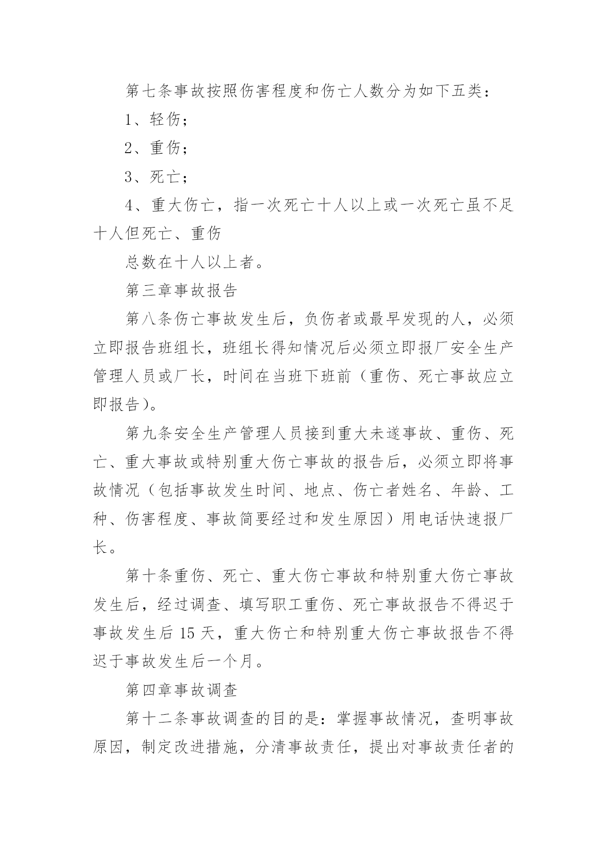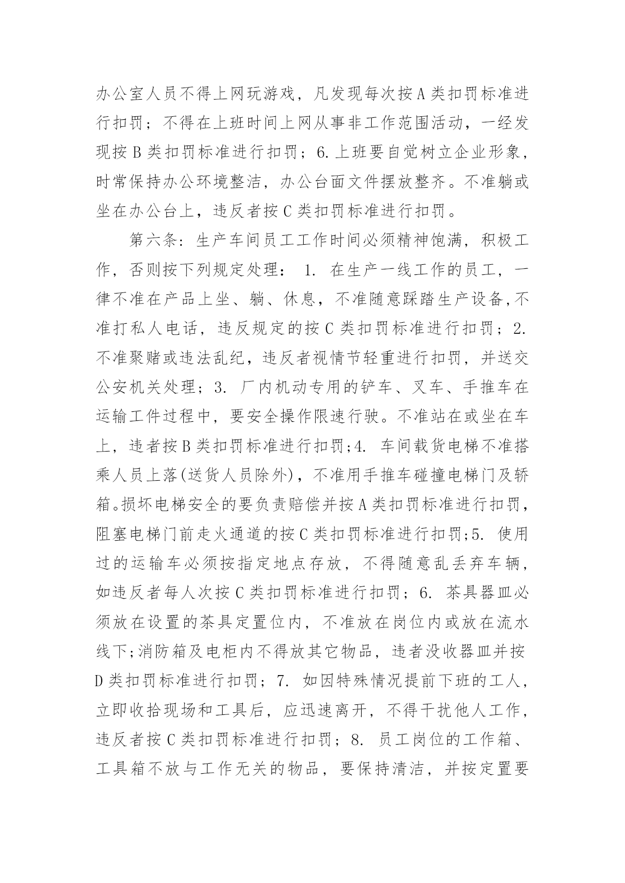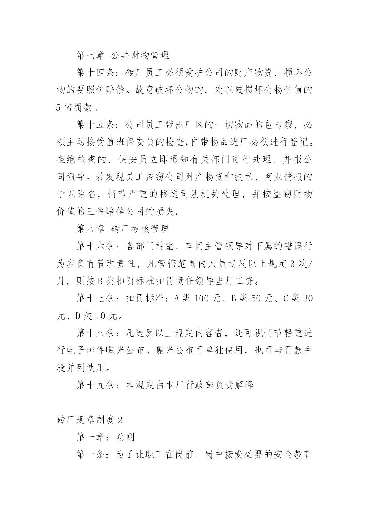 砖厂规章制度砖厂规章制度必备【6篇】现如今,制度在生活中的使用越来越广泛,制度一般指要求大家共同遵守的办事规程或行动准则,也指在一定历史条件下形成的法令、礼俗等规范或一定的规格。一般制度是怎么制定的呢?以下是小编收集整理的砖厂规章制度,仅供参考,大家一起来看看吧。砖厂规章制度1第一章总则第一条:为加强公司安全、文明生产(办公)、劳动纪律的管理,严肃公司劳动纪律,强化员工的自我约束能力,提高岗位工作效率,确保砖厂生产经营活动正常运作,树立良好的企业形象,实现各级领导和全体员工齐抓共管、人人遵守的目的,特制定本守则。第二条:本守则参照国家、省、市有关劳动法规而制订,是公司全体员工日常工作行为的一般准则,是公司对内部员工进行劳动奖惩的基本依据。公司每位员工必须严格遵守本规定,各级管理人员要起模范带头作用。第三条:本守则由本砖厂及部门负责人组织贯彻、执行,由人事行政部监督、考核,由驻公司保安协助执行。第二章砖厂考勤管理第四条:砖厂员工上班时间不得迟到、早退和不请假离开工作岗位,不得出现旷工现象(包括开会、业余时间学习、公司安排其他活动等)及擅自中途怠工停产。1.进入本砖厂工作的员工,按时上下班,不得迟到或早退。每迟到、早退一次按C类扣罚标准进行扣罚(A、B、C、D类扣罚标准见本守则第十七条,下同),超过30分钟作旷工半天处理(无法及时通知等特殊原因除外);2.凡上班时间需要中途离岗、离厂,必须向所属单位负责人请假,否则,半小时内按早退处理,超过半小时按旷工处理。因离岗、离厂造成损失的视情节轻重予以相应处罚;3.公司员工因病、因事或其他特殊原因不能按时上下班的应请假,未经批准而不按时上下班的作旷工处理。请假办法按《员工劳动和考勤管理标准》执行;4.对擅自中途怠工停产的组织者和鼓动者,将作严厉处置,其他跟随者视同旷工处理;5.旷工一天,扣罚当月工资10%;连续旷工三天以上或全年累计旷工十天以上,视作自动离职,砖厂予以解聘。第三章砖厂现场管理第五条:员工上班时间,必须遵守公司有关管理规定,违反者按下列规定处理:1.未经主管领导同意批准,不得接待私人探访,对工作造成严重影响的视具体情况按A类—C类扣罚标准进行扣罚;2.工作时间不准吃食物,违者按D类扣罚标准进行扣罚;3.不准使用公司电话长时间聊天,违者视情节轻重按B类-C类扣罚标准进行扣罚;4.工作时间不得阅读与工作无关的.书报杂志、买卖保险以及干与工作无关的事,违者按C类扣罚标准进行扣罚;5.上班时间办公室人员不得上网玩游戏,凡发现每次按A类扣罚标准进行扣罚;不得在上班时间上网从事非工作范围活动,一经发现按B类扣罚标准进行扣罚;6.上班要自觉树立企业形象,时常保持办公环境整洁,办公台面文件摆放整齐。不准躺或坐在办公台上,违反者按C类扣罚标准进行扣罚。第六条:生产车间员工工作时间必须精神饱满,积极工作,否则按下列规定处理:1.在生产一线工作的员工,一律不准在产品上坐、躺、休息,不准随意踩踏生产设备,不准打私人电话,违反规定的按C类扣罚标准进行扣罚;2.不准聚赌或违法乱纪,违反者视情节轻重进行扣罚,并送交公安机关处理;3.厂内机动专用的铲车、叉车、手推车在运输工件过程中,要安全操作限速行驶。不准站在或坐在车上,违者按B类扣罚标准进行扣罚;4.车间载货电梯不准搭乘人员上落(送货人员除外),不准用手推车碰撞电梯门及轿箱。损坏电梯安全的要负责赔偿并按A类扣罚标准进行扣罚,阻塞电梯门前走火通道的按C类扣罚标准进行扣罚;5.使用过的运输车必须按指定地点存放,不得随意乱丢弃车辆,如违反者每人次按C类扣罚标准进行扣罚;6.茶具器皿必须放在设置的茶具定置位内,不准放在岗位内或放在流水线下;消防箱及电柜内不得放其它物品,违者没收器皿并按D类扣罚标准进行扣罚;7.如因特殊情况提前下班的工人,立即收拾现场和工具后,应迅速离开,不得干扰他人工作,违反者按C类扣罚标准进行扣罚;8.员工岗位的工作箱、工具箱不放与工作无关的物品,要保持清洁,并按定置要求摆放,违反者每人每次按D类扣罚标准进行扣罚。第七条:除规定的吸烟区外,其它区域一律禁止吸烟,否则一经发现按A类扣罚标准进行扣罚。第八条:严禁员工上班时间饮酒或酒后上岗操作,如有发现则按A类扣罚标准进行扣罚,并按有关规定追究责任。第九条:公司员工必须注意厂区、办公室及洗手间的环境清洁卫生,厂区内不准随地吐痰、乱丢废弃物及便后不冲水,否则一经发现按C类扣罚标准进行扣罚。第十条:在砖厂饭堂就餐的员工,应严格遵守就餐时间和秩序,自觉排队取饭,注意节约用水。凡外购饭盒在办公室内进餐者,午餐后要将饭盒及残渣等物送到卫生间废纸篓内,由清洁工上班后负责清理;晚餐后要将饭盒及残渣等物送到办公大楼指定大胶桶内并盖好盖。违反者按C类扣罚标准进行扣罚。第四章砖厂车辆管理第十一条:进入本砖厂的车辆