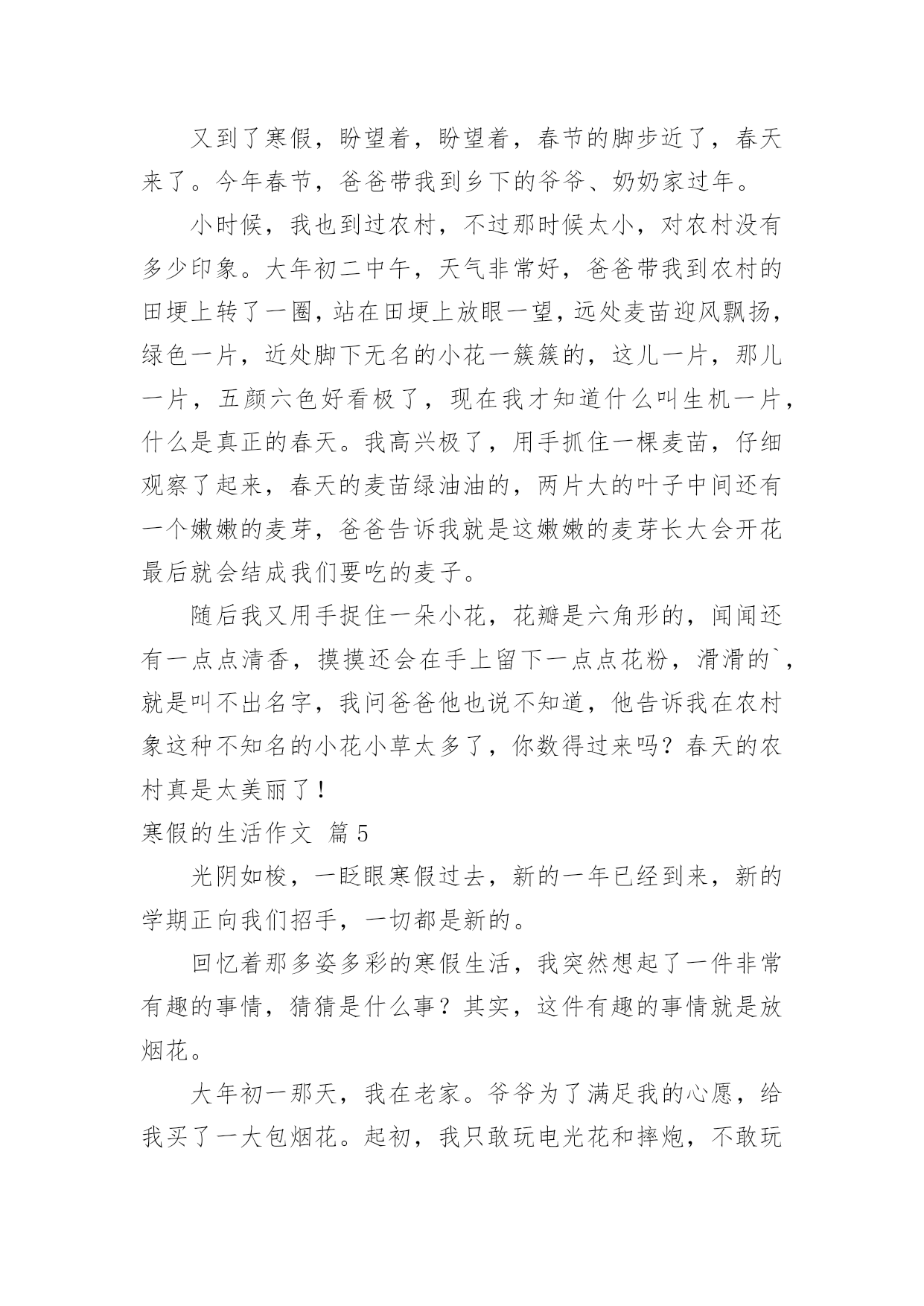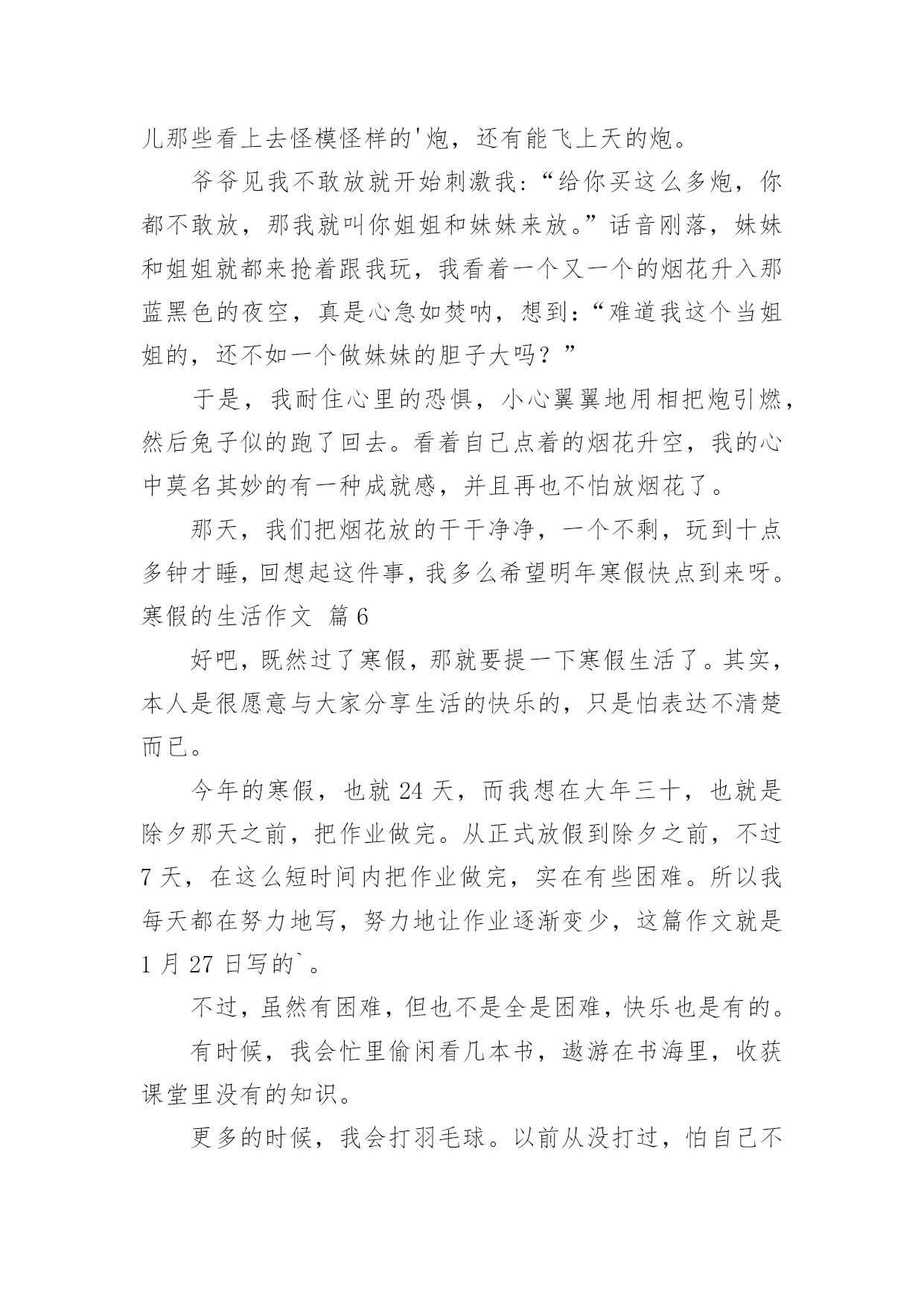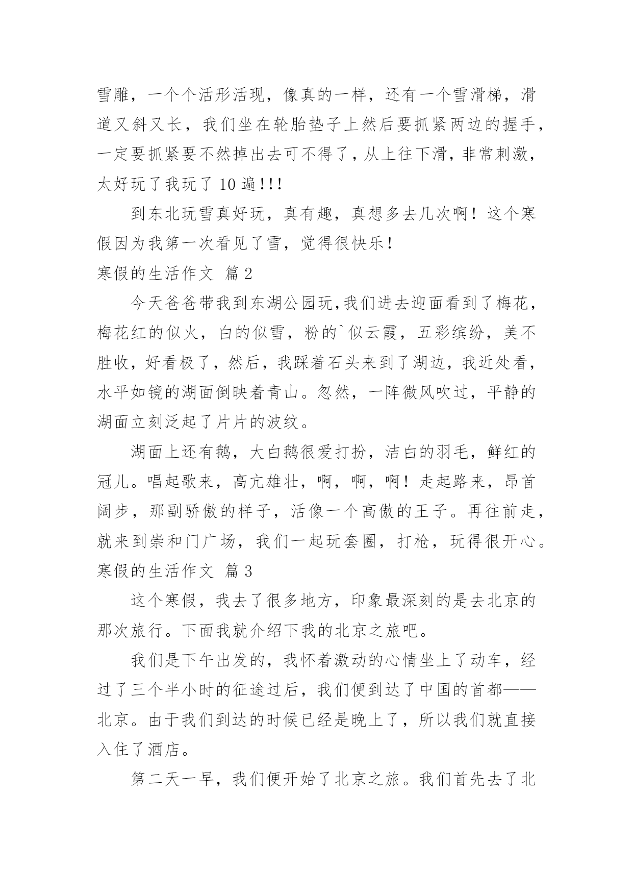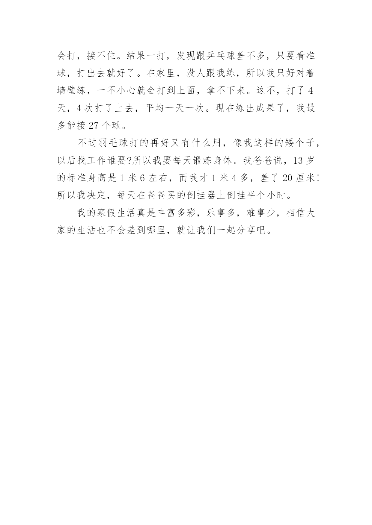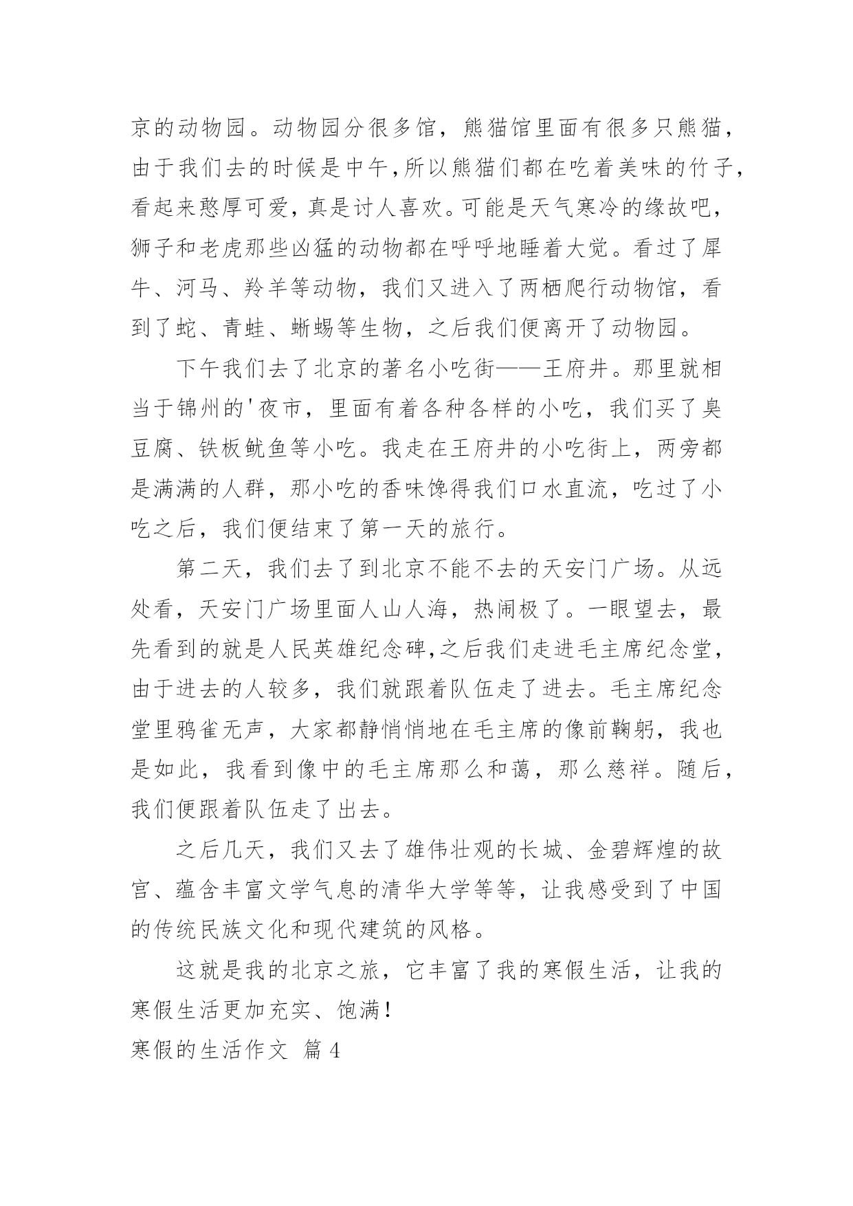 寒假的生活作文【优】寒假的生活作文6篇在生活、工作和学习中,大家都有写作文的经历,对作文很是熟悉吧,作文可分为小学作文、中学作文、大学作文(论文)。作文的注意事项有许多,你确定会写吗?以下是小编收集整理的寒假的生活作文6篇,仅供参考,希望能够帮助到大家。寒假的生活作文篇1这次寒假我终于可以见到期待已久的雪景,我和妈妈去了东北的沈阳、长春和一些小县城。到沈阳的时候,我第一次看见了雪,好兴奋,但也很冷,刚下飞机就感觉脸很干,就好像有冰贴着脸!我们在沈阳的一个叫开原的小县城住了两天,过后我们坐高铁从开原来到了长春。长春比开原冷的多,到处都是积雪,我们到宾馆的.时候我脚都冻得不行了,幸好宾馆里有暖气,我们上了房间把东西放了一下就出去吃晚饭,妈妈说这里大多都是烧烤店,最后我们在一家烧烤店吃,烧烤又咸又辣,我不怎么喜欢。到长春的第2天我和妈妈到了净月潭公园的冰雪世界玩,在公园门口就有两个超大的狮子雪雕,妈妈还以为不是雪雕成的,我用手摸了一下,发现是雪雕成的,太厉害了!冰雪世界里面有各种各样雪雕:凤凰雪雕,孙悟空雪雕,黄鹤楼雪雕,一个个活形活现,像真的一样,还有一个雪滑梯,滑道又斜又长,我们坐在轮胎垫子上然后要抓紧两边的握手,一定要抓紧要不然掉出去可不得了,从上往下滑,非常刺激,太好玩了我玩了10遍!!!到东北玩雪真好玩,真有趣,真想多去几次啊!这个寒假因为我第一次看见了雪,觉得很快乐!寒假的生活作文篇2今天爸爸带我到东湖公园玩,我们进去迎面看到了梅花,梅花红的似火,白的似雪,粉的`似云霞,五彩缤纷,美不胜收,好看极了,然后,我踩着石头来到了湖边,我近处看,水平如镜的湖面倒映着青山。忽然,一阵微风吹过,平静的湖面立刻泛起了片片的波纹。湖面上还有鹅,大白鹅很爱打扮,洁白的羽毛,鲜红的冠儿。唱起歌来,高亢雄壮,啊,啊,啊!走起路来,昂首阔步,那副骄傲的样子,活像一个高傲的王子。再往前走,就来到崇和门广场,我们一起玩套圈,打枪,玩得很开心。寒假的生活作文篇3这个寒假,我去了很多地方,印象最深刻的是去北京的那次旅行。下面我就介绍下我的北京之旅吧。我们是下午出发的,我怀着激动的心情坐上了动车,经过了三个半小时的征途过后,我们便到达了中国的首都——北京。由于我们到达的时候已经是晚上了,所以我们就直接入住了酒店。第二天一早,我们便开始了北京之旅。我们首先去了北京的动物园。动物园分很多馆,熊猫馆里面有很多只熊猫,由于我们去的时候是中午,所以熊猫们都在吃着美味的竹子,看起来憨厚可爱,真是讨人喜欢。可能是天气寒冷的缘故吧,狮子和老虎那些凶猛的动物都在呼呼地睡着大觉。看过了犀牛、河马、羚羊等动物,我们又进入了两栖爬行动物馆,看到了蛇、青蛙、蜥蜴等生物,之后我们便离开了动物园。下午我们去了北京的著名小吃街——王府井。那里就相当于锦州的'夜市,里面有着各种各样的小吃,我们买了臭豆腐、铁板鱿鱼等小吃。我走在王府井的小吃街上,两旁都是满满的人群,那小吃的香味馋得我们口水直流,吃过了小吃之后,我们便结束了第一天的旅行。第二天,我们去了到北京不能不去的天安门广场。从远处看,天安门广场里面人山人海,热闹极了。一眼望去,最先看到的就是人民英雄纪念碑,之后我们走进毛主席纪念堂,由于进去的人较多,我们就跟着队伍走了进去。毛主席纪念堂里鸦雀无声,大家都静悄悄地在毛主席的像前鞠躬,我也是如此,我看到像中的毛主席那么和蔼,那么慈祥。随后,我们便跟着队伍走了出去。之后几天,我们又去了雄伟壮观的长城、金碧辉煌的故宫、蕴含丰富文学气息的清华大学等等,让我感受到了中国的传统民族文化和现代建筑的风格。这就是我的北京之旅,它丰富了我的寒假生活,让我的寒假生活更加充实、饱满!寒假的生活作文篇4又到了寒假,盼望着,盼望着,春节的脚步近了,春天来了。今年春节,爸爸带我到乡下的爷爷、奶奶家过年。小时候,我也到过农村,不过那时候太小,对农村没有多少印象。大年初二中午,天气非常好,爸爸带我到农村的田埂上转了一圈,站在田埂上放眼一望,远处麦苗迎风飘扬,绿色一片,近处脚下无名的小花一簇簇的,这儿一片,那儿一片,五颜六色好看极了,现在我才知道什么叫生机一片,什么是真正的春天。我高兴极了,用手抓住一棵麦苗,仔细观察了起来,春天的麦苗绿油油的,两片大的叶子中间还有一个嫩嫩的麦芽,爸爸告诉我就是这嫩嫩的麦芽长大会开花最后就会结成我们要吃的麦子。随后我又用手捉住一朵小花,花瓣是六角形的,闻闻还有一点点清香,摸摸还会在手上留下一点点花粉,滑滑的`,就是叫不出名字,我问爸爸他也说不知道,他告诉我在农村象这种不知名的小花小草太多了,你数得过来吗?春天的农村真是太美丽了!寒假的生活作文篇5光阴如梭,一眨眼寒假过去,新的一年已经到来,新的学期正向我们招手,一切都是新的。回忆着那多姿多彩的寒假生活,我突然想起了一件非常有趣的事情,猜