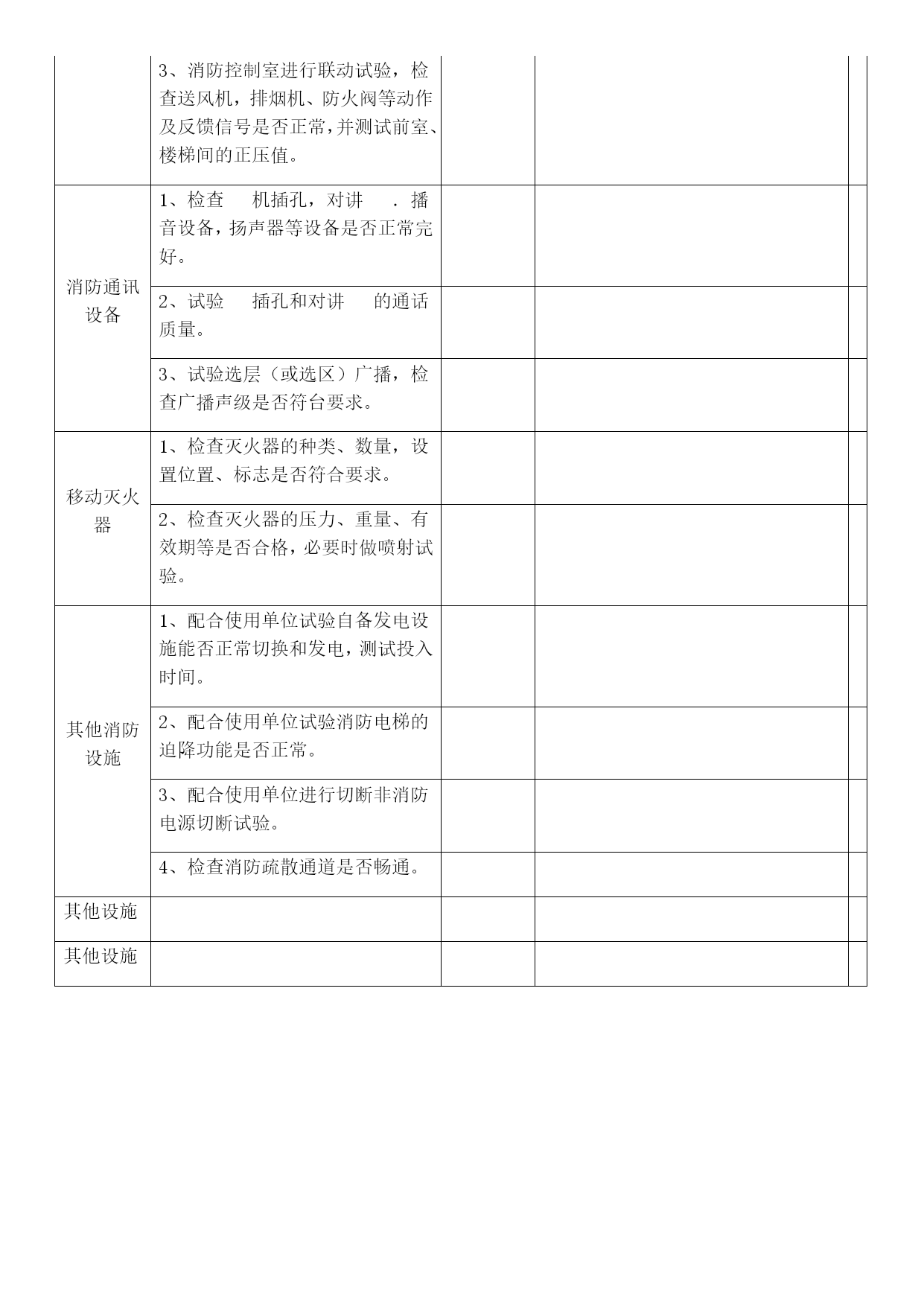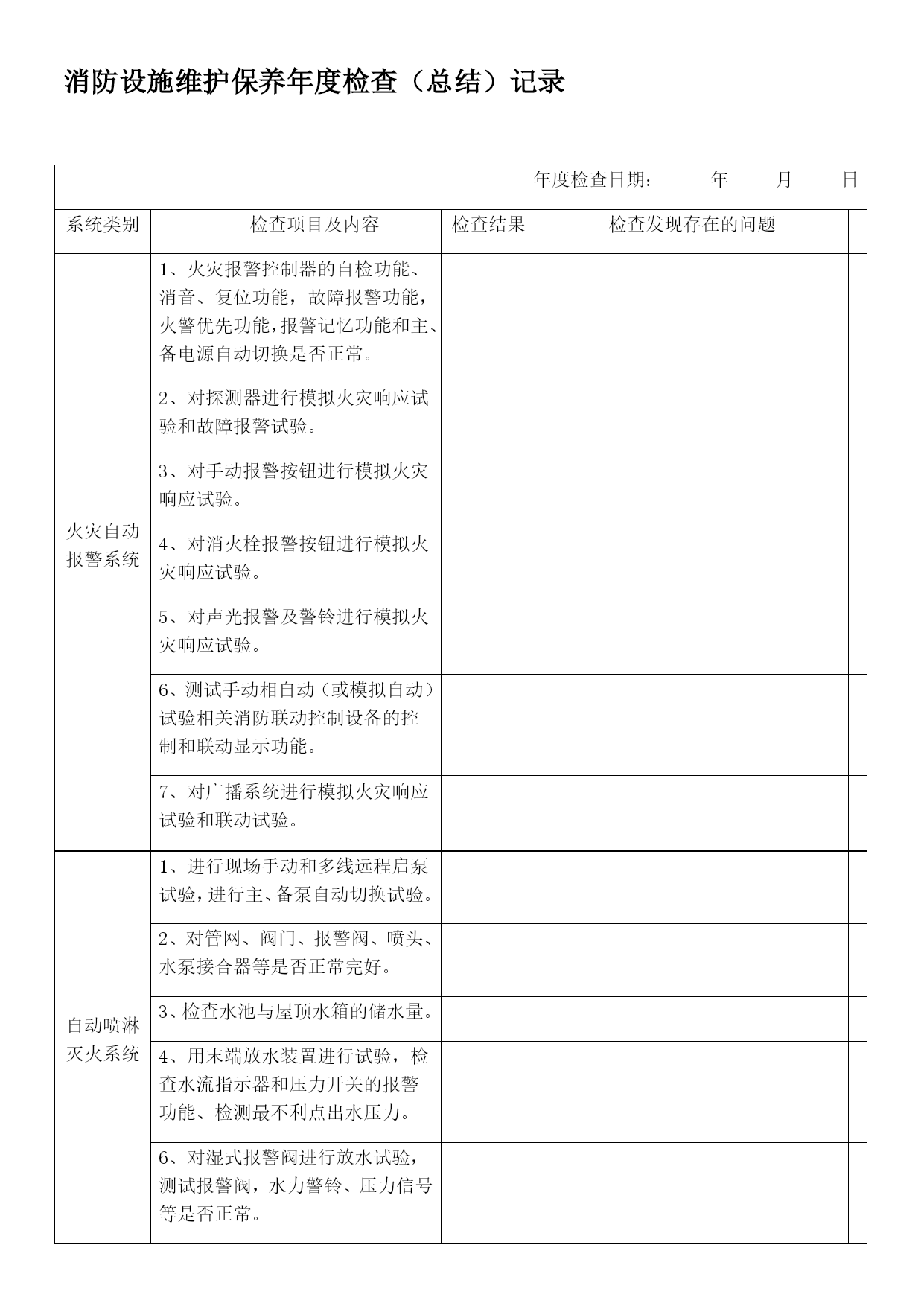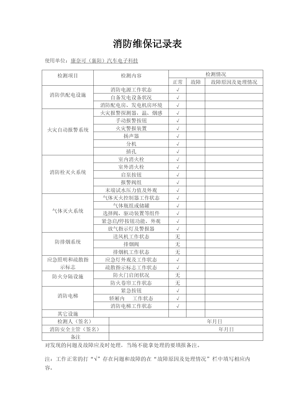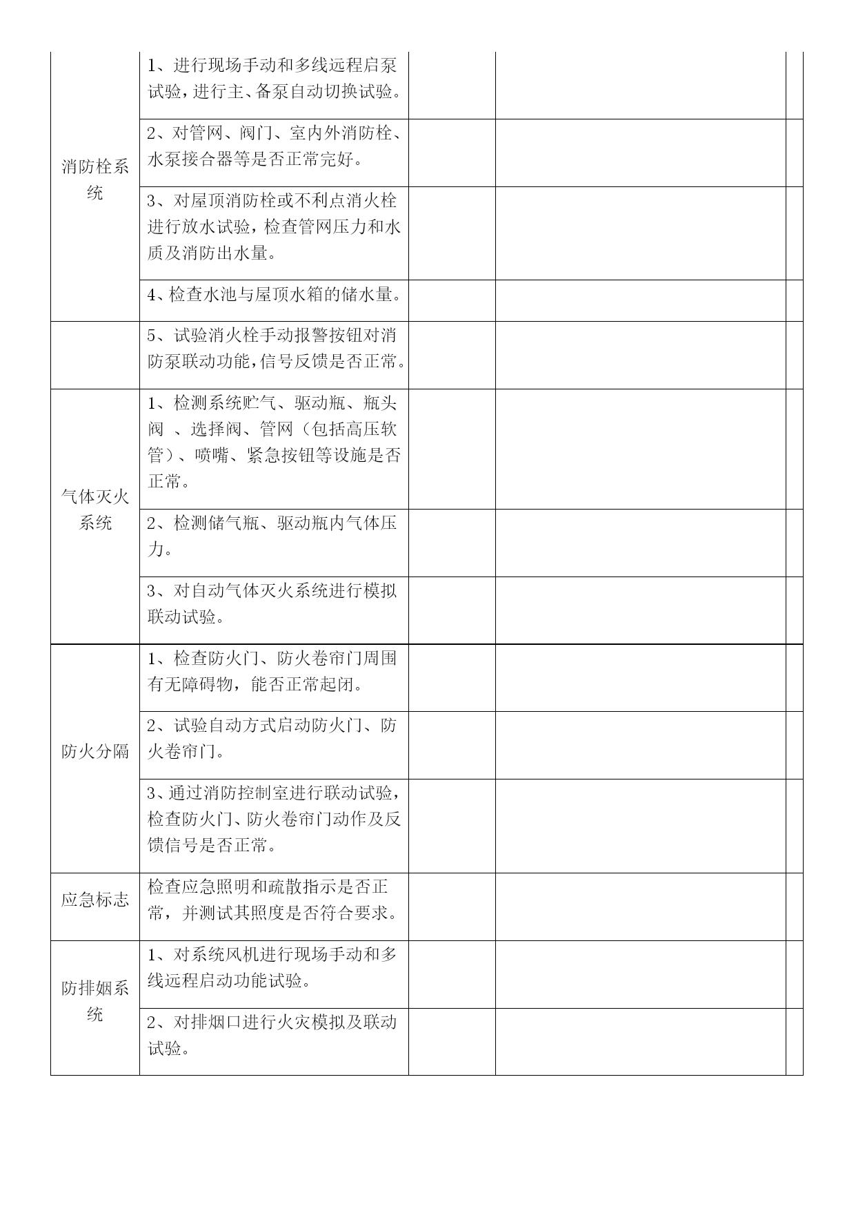消防维保记录表2优质资料(可以直接使用,可编辑优质资料,欢迎下载)消防维保记录表使用单位:康奈可(襄阳)汽车电子科技检测项目检测内容检测情况正常故障故障原因及处理情况消防供配电设施消防电源工作状态√自备发电设备状况√消防配电房、发电机房环境√火灾自动报警系统火灾报警探测器,温、烟感√手动报警按钮√火灾警报装置√扬声器√分机√插孔√消防栓灭火系统室内消火栓√室外消火栓√启泵按钮√报警阀组√末端试水压力值及外观√气体灭火系统气体灭火控制器工作状态√气体瓶组或储罐√选择阀、驱动装置等组件√紧急启/停按钮功能、外观√放气指示灯及警报器√防排烟系统送风机工作状态无排烟阀无排烟机工作状态无应急照明和疏散指示标志应急灯外观及工作状态√疏散指示标志工作状态√防火分隔设施防火门启闭状况无防火卷帘工作状态无消防电梯紧急按钮√轿厢内工作状态√消防电梯工作状态√其它设施检测人(签名)年月日消防安全主管(签名)年月日备注对发现的问题及故障应及时处理,当场不能拿处理的要填报备注。注:工作正常的打“√”存在问题和故障的在“故障原因及处理情况”栏中填写相应内容。维保单位:建筑消防设施故障处理登记表检查时间检查人(签名)检查发现问题或故障问题或故障处理结果消防安全主管人员(签名)涂装间区域控制器主机未与控制中心联网从机故障。从机故障已处理。消防广播在联动室无法启动。已处理。消防控制室报警主机显示设备存在故障,和屏蔽故障。(因配电室与空压机室报警设备拆除)现已重新安装,故障已处理。对建筑消防设施存在的问题和故障,当场有条件解决的应立即解决;当场没有条件解决的,应在24小时内解决;需要由供应商或者厂家解决的,应在5个工作日内处理、解决,恢复正常状态。对于当天无法处理、解决的故障,需要系统暂停工作的,应当上报消防安全管理人批准,并采取有效的消防安全措施加以补救。故障排除后,应由主管人员签字认可,故障处理登记表存档备查。现场签证单编号:001专业:消防至:康奈可(襄阳)汽车电子科技原因及内容内容:门卫消防控制主机,显示屏蔽的故障,因对配电室、空压机室报警系统原有设备点位及管线拆除,现需重新安装报警设备点位及管线。现我公司已对原拆除的管线、设备点位安装并调试完毕。增加的管线、设备详见预算书,请贵公司确认。发出部门发文单位:河南省海浪消防设备襄阳分公司负责人:日期:使用单位:负责人:消防设施维护保养年度检查(总结)记录年度检查日期:年月日系统类别检查项目及内容检查结果检查发现存在的问题火灾自动报警系统1、火灾报警控制器的自检功能、消音、复位功能,故障报警功能,火警优先功能,报警记忆功能和主、备电源自动切换是否正常。2、对探测器进行模拟火灾响应试验和故障报警试验。3、对手动报警按钮进行模拟火灾响应试验。4、对消火栓报警按钮进行模拟火灾响应试验。5、对声光报警及警铃进行模拟火灾响应试验。6、测试手动相自动(或模拟自动)试验相关消防联动控制设备的控制和联动显示功能。7、对广播系统进行模拟火灾响应试验和联动试验。自动喷淋灭火系统1、进行现场手动和多线远程启泵试验,进行主、备泵自动切换试验。2、对管网、阀门、报警阀、喷头、水泵接合器等是否正常完好。3、检查水池与屋顶水箱的储水量。4、用末端放水装置进行试验,检查水流指示器和压力开关的报警功能、检测最不利点出水压力。6、对湿式报警阀进行放水试验,测试报警阀,水力警铃、压力信号等是否正常。消防栓系统l、进行现场手动和多线远程启泵试验,进行主、备泵自动切换试验。2、对管网、阀门、室内外消防栓、水泵接合器等是否正常完好。3、对屋顶消防栓或不利点消火栓进行放水试验,检查管网压力和水质及消防出水量。4、检查水池与屋顶水箱的储水量。5、试验消火栓手动报警按钮对消防泵联动功能,信号反馈是否正常。气体灭火系统1、检测系统贮气、驱动瓶、瓶头阀、选择阀、管网(包括高压软管)、喷嘴、紧急按钮等设施是否正常。2、检测储气瓶、驱动瓶内气体压力。3、对自动气体灭火系统进行模拟联动试验。防火分隔1、检查防火门、防火卷帘门周围有无障碍物,能否正常起闭。2、试验自动方式启动防火门、防火卷帘门。3、通过消防控制室进行联动试验,检查防火门、防火卷帘门动作及反馈信号是否正常。应急标志检查应急照明和疏散指示是否正常,并测试其照度是否符合要求。防排姻系统1、对系统风机进行现场手动和多线远程启动功能试验。2、对排烟口进行火灾模拟及联动试验。3、消防控制室进行联动试验,检查送风机,排烟机、防火阀等动作及反馈信号是否正常,并测试前室、楼梯间的正压值。消防通讯设备1、检查机插孔,对讲.播音设备,扬声器等设备是否正常完好。2、试验插孔和对讲的通话质量。3、试验选层(或选区)广播,检查广播声级