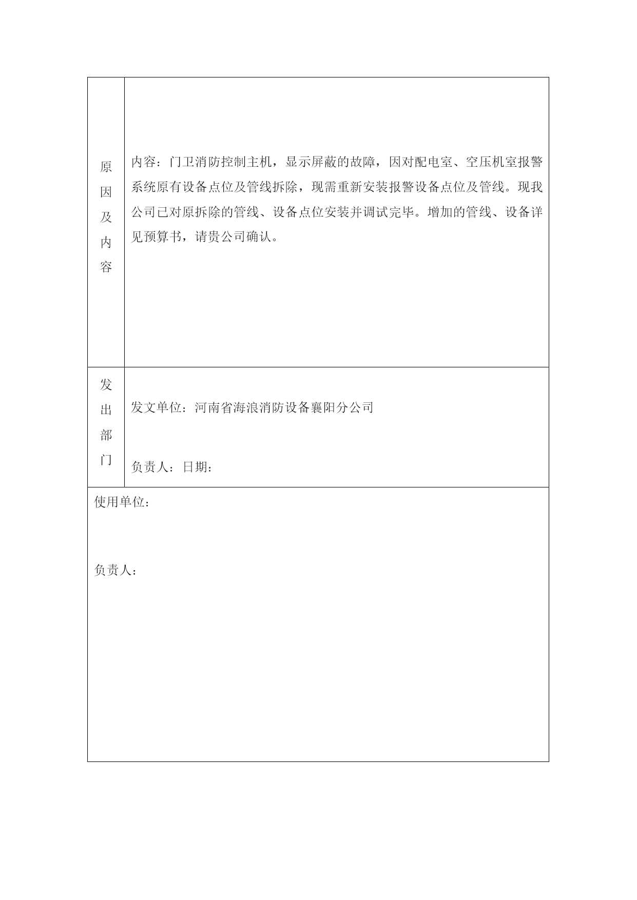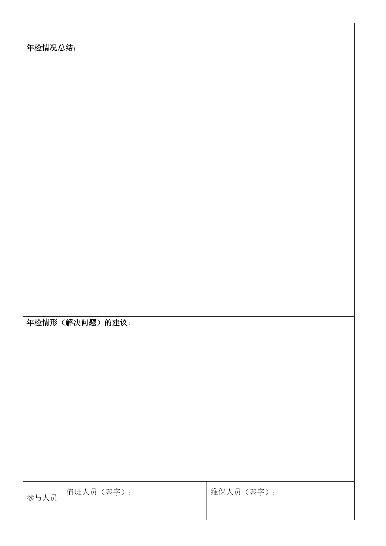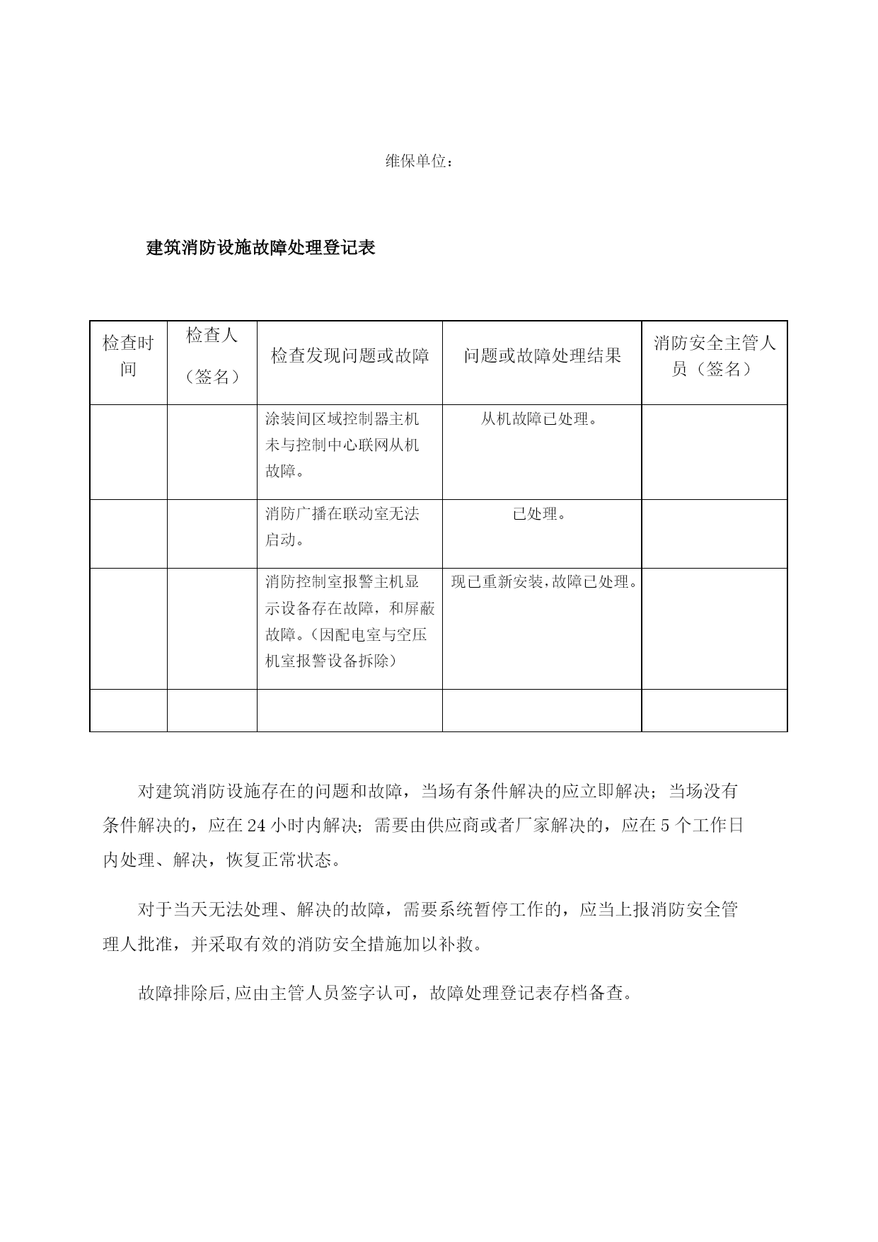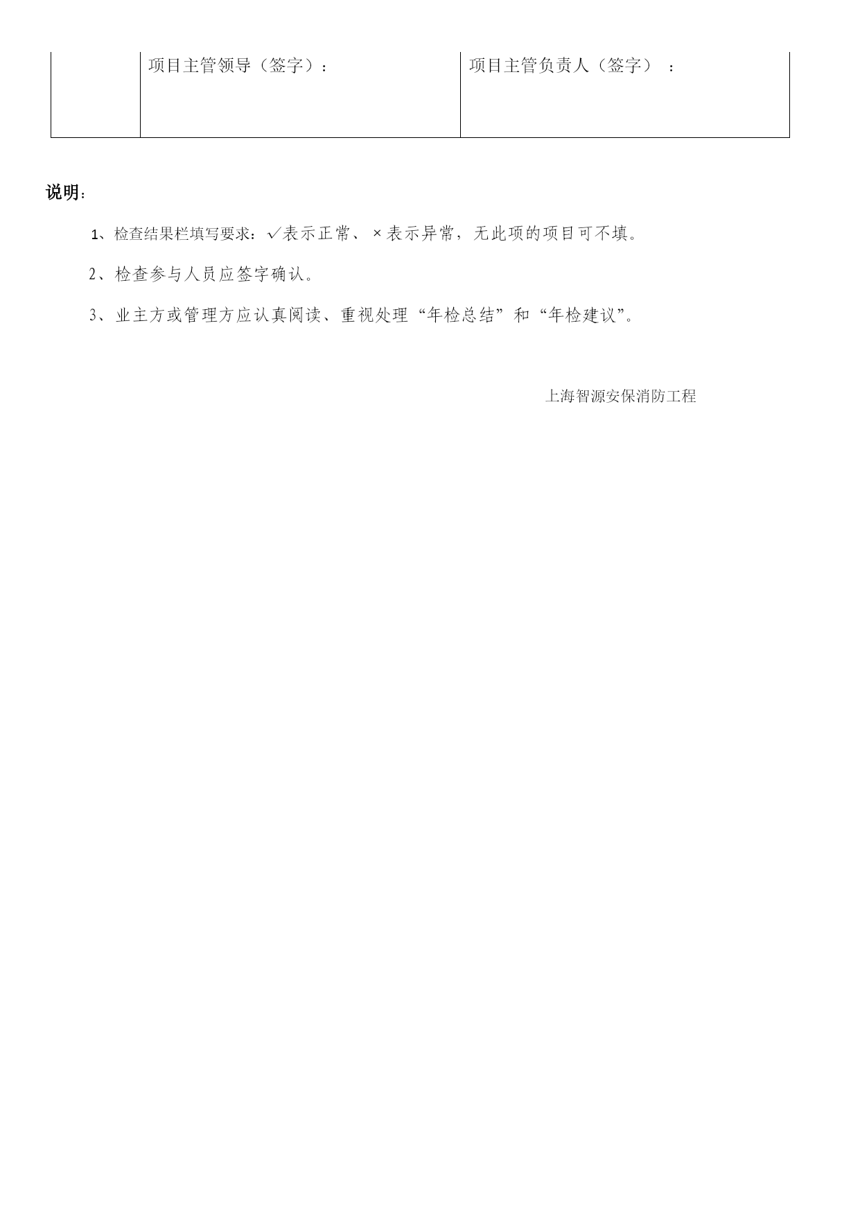 消防维保记录表2优质资料(可以直接使用,可编辑优质资料,欢迎下载)消防维保记录表使用单位:康奈可(襄阳)汽车电子科技检测项目检测内容检测情况正常故障故障原因及处理情况消防供配电设施消防电源工作状态√自备发电设备状况√消防配电房、发电机房环境√火灾自动报警系统火灾报警探测器,温、烟感√手动报警按钮√火灾警报装置√扬声器√分机√插孔√消防栓灭火系统室内消火栓√室外消火栓√启泵按钮√报警阀组√末端试水压力值及外观√气体灭火系统气体灭火控制器工作状态√气体瓶组或储罐√选择阀、驱动装置等组件√紧急启/停按钮功能、外观√放气指示灯及警报器√防排烟系统送风机工作状态无排烟阀无排烟机工作状态无应急照明和疏散指示标志应急灯外观及工作状态√疏散指示标志工作状态√防火分隔设施防火门启闭状况无防火卷帘工作状态无消防电梯紧急按钮√轿厢内工作状态√消防电梯工作状态√其它设施检测人(签名)年月日消防安全主管(签名)年月日备注对发现的问题及故障应及时处理,当场不能拿处理的要填报备注。注:工作正常的打“√”存在问题和故障的在“故障原因及处理情况”栏中填写相应内容。维保单位:建筑消防设施故障处理登记表检查时间检查人(签名)检查发现问题或故障问题或故障处理结果消防安全主管人员(签名)涂装间区域控制器主机未与控制中心联网从机故障。从机故障已处理。消防广播在联动室无法启动。已处理。消防控制室报警主机显示设备存在故障,和屏蔽故障。(因配电室与空压机室报警设备拆除)现已重新安装,故障已处理。对建筑消防设施存在的问题和故障,当场有条件解决的应立即解决;当场没有条件解决的,应在24小时内解决;需要由供应商或者厂家解决的,应在5个工作日内处理、解决,恢复正常状态。对于当天无法处理、解决的故障,需要系统暂停工作的,应当上报消防安全管理人批准,并采取有效的消防安全措施加以补救。故障排除后,应由主管人员签字认可,故障处理登记表存档备查。现场签证单编号:001专业:消防至:康奈可(襄阳)汽车电子科技原因及内容内容:门卫消防控制主机,显示屏蔽的故障,因对配电室、空压机室报警系统原有设备点位及管线拆除,现需重新安装报警设备点位及管线。现我公司已对原拆除的管线、设备点位安装并调试完毕。增加的管线、设备详见预算书,请贵公司确认。发出部门发文单位:河南省海浪消防设备襄阳分公司负责人:日期:使用单位:负责人:消防设施维护保养年度检查(总结)记录年度检查日期:年月日系统类别检查项目及内容检查结果检查发现存在的问题火灾自动报警系统1、火灾报警控制器的自检功能、消音、复位功能,故障报警功能,火警优先功能,报警记忆功能和主、备电源自动切换是否正常。2、对探测器进行模拟火灾响应试验和故障报警试验。3、对手动报警按钮进行模拟火灾响应试验。4、对消火栓报警按钮进行模拟火灾响应试验。5、对声光报警及警铃进行模拟火灾响应试验。6、测试手动相自动(或模拟自动)试验相关消防联动控制设备的控制和联动显示功能。7、对广播系统进行模拟火灾响应试验和联动试验。自动喷淋灭火系统1、进行现场手动和多线远程启泵试验,进行主、备泵自动切换试验。2、对管网、阀门、报警阀、喷头、水泵接合器等是否正常完好。3、检查水池与屋顶水箱的储水量。4、用末端放水装置进行试验,检查水流指示器和压力开关的报警功能、检测最不利点出水压力。6、对湿式报警阀进行放水试验,测试报警阀,水力警铃、压力信号等是否正常。消防栓系统l、进行现场手动和多线远程启泵试验,进行主、备泵自动切换试验。2、对管网、阀门、室内外消防栓、水泵接合器等是否正常完好。3、对屋顶消防栓或不利点消火栓进行放水试验,检查管网压力和水质及消防出水量。4、检查水池与屋顶水箱的储水量。5、试验消火栓手动报警按钮对消防泵联动功能,信号反馈是否正常。气体灭火系统1、检测系统贮气、驱动瓶、瓶头阀、选择阀、管网(包括高压软管)、喷嘴、紧急按钮等设施是否正常。2、检测储气瓶、驱动瓶内气体压力。3、对自动气体灭火系统进行模拟联动试验。防火分隔1、检查防火门、防火卷帘门周围有无障碍物,能否正常起闭。2、试验自动方式启动防火门、防火卷帘门。3、通过消防控制室进行联动试验,检查防火门、防火卷帘门动作及反馈信号是否正常。应急标志检查应急照明和疏散指示是否正常,并测试其照度是否符合要求。防排姻系统1、对系统风机进行现场手动和多线远程启动功能试验。2、对排烟口进行火灾模拟及联动试验。3、消防控制室进行联动试验,检查送风机,排烟机、防火阀等动作及反馈信号是否正常,并测试前室、楼梯间的正压值。消防通讯设备1、检查机插孔,对讲.播音设备,扬声器等设备是否正常完好。2、试验插孔和对讲的通话质量。3、试验选层(或选区)广播,检查广播声级