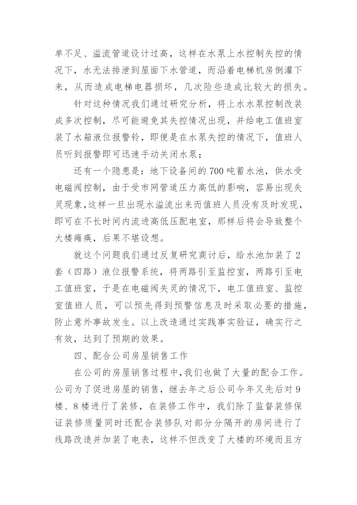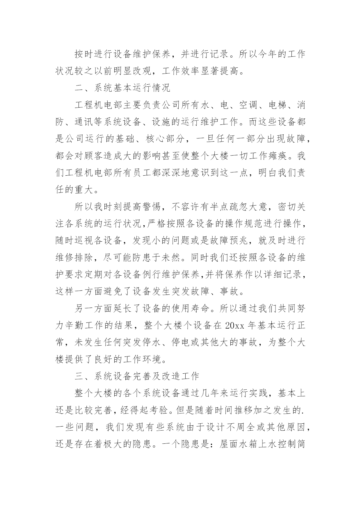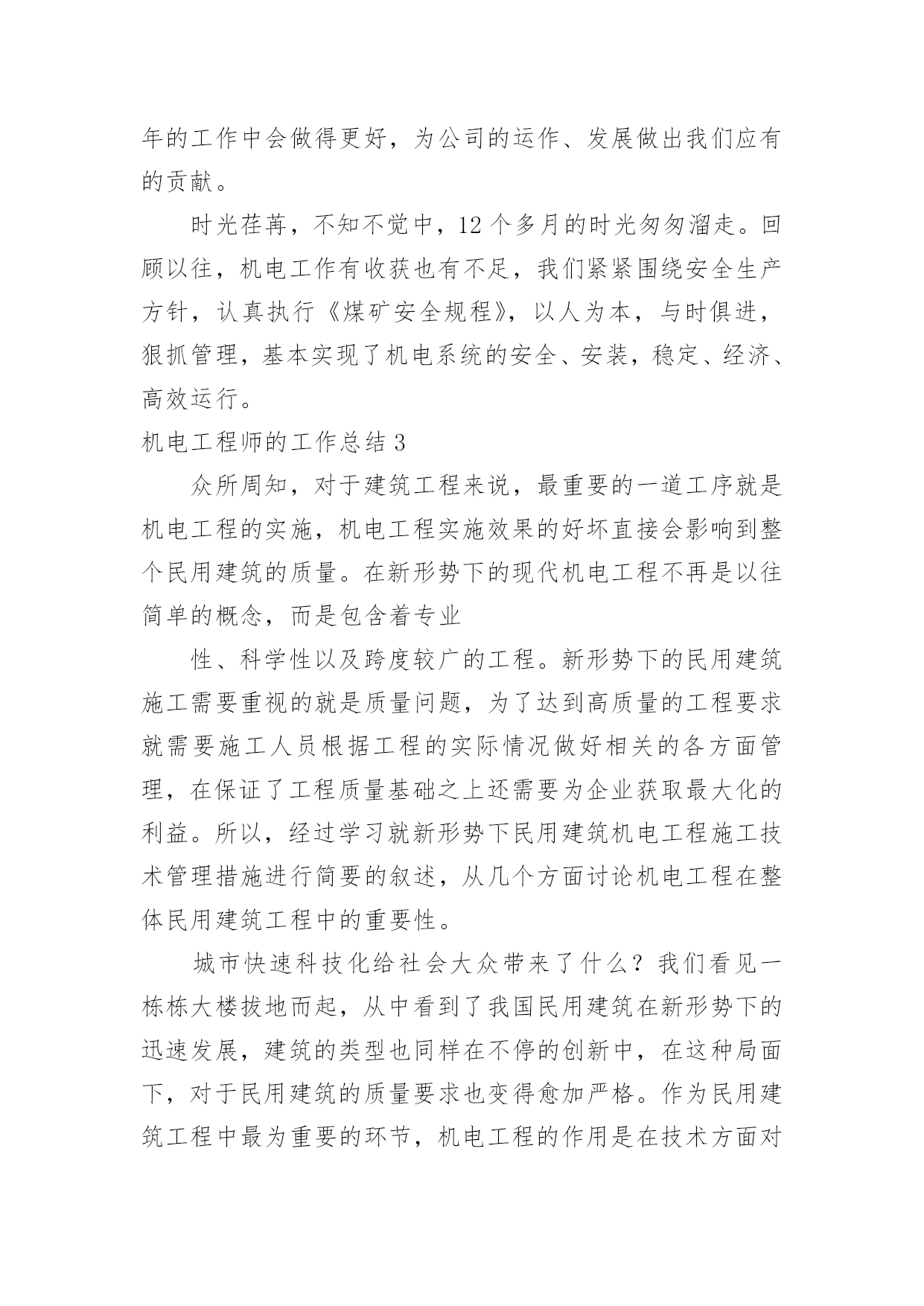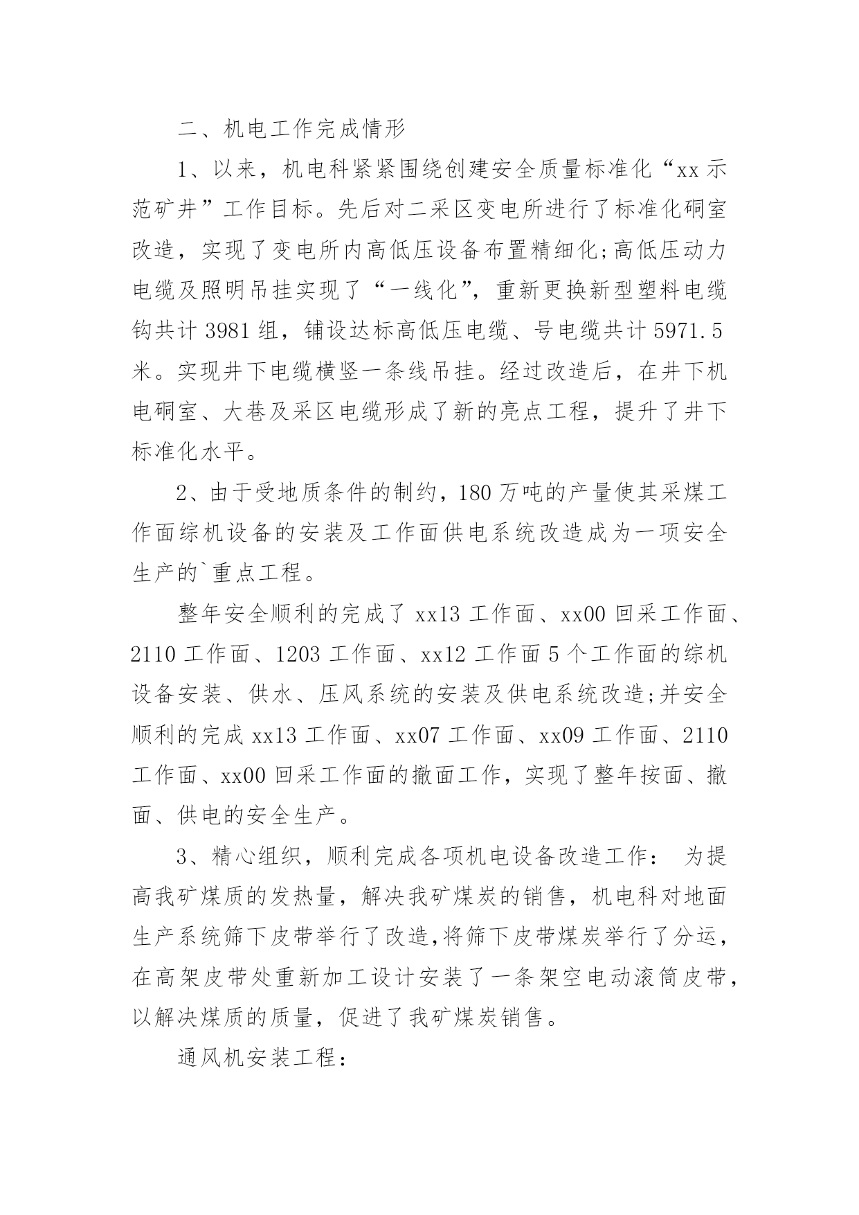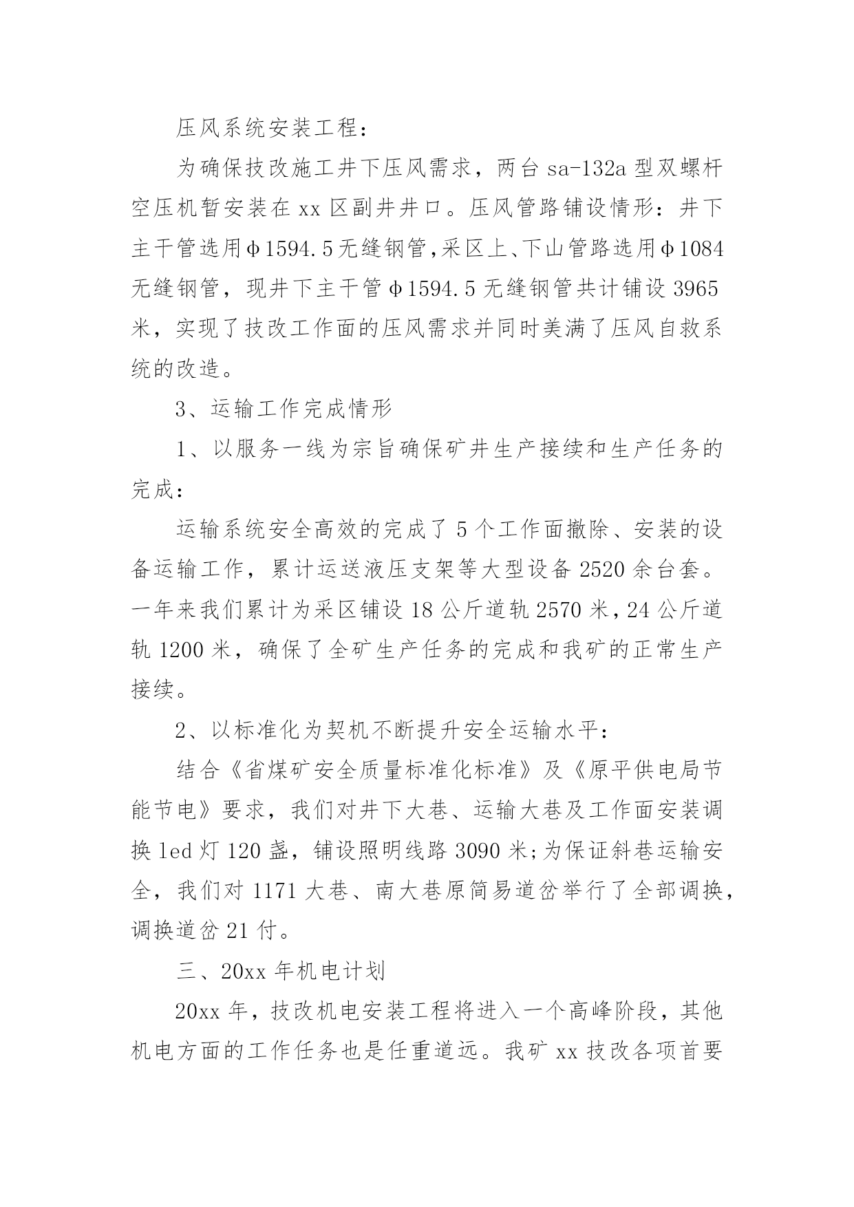 机电工程师的工作总结机电工程师的工作总结总结是事后对某一阶段的学习、工作或其完成情况加以回顾和分析的一种书面材料,它在我们的学习、工作中起到呈上启下的作用,让我们好好写一份总结吧。但是却发现不知道该写些什么,下面是小编整理的机电工程师的工作总结,欢迎阅读,希望大家能够喜欢。机电工程师的工作总结1时光荏苒,不知不觉中,12个多月的时光匆匆溜走。回顾以往,机电工作有收获也有不足,我们紧紧围绕安全生产方针,认真执行《煤矿安全规程》,以人为本,与时俱进,狠抓管理,基本实现了机电系统的安全、安装,稳定、经济、高效运行。通过这以往的工作,大家积累了大量的工作经验,各方面都得到了较大的充实和提高。现就机电工作情况作以总结汇报。一、立足安全规程,强化机电安全质量标准化安全质量标准化是煤矿提高水平、建设安全生产长效机制的根本途径,只有安全质量标准化达到并保持一定的标准,使公司处于安全生产的良好状态,才能够适应和保障员工生命安全和煤炭工业现代化建设的需要。二、机电工作完成情形1、以来,机电科紧紧围绕创建安全质量标准化“xx示范矿井”工作目标。先后对二采区变电所进行了标准化硐室改造,实现了变电所内高低压设备布置精细化;高低压动力电缆及照明吊挂实现了“一线化”,重新更换新型塑料电缆钩共计3981组,铺设达标高低压电缆、号电缆共计5971.5米。实现井下电缆横竖一条线吊挂。经过改造后,在井下机电硐室、大巷及采区电缆形成了新的亮点工程,提升了井下标准化水平。2、由于受地质条件的制约,180万吨的产量使其采煤工作面综机设备的安装及工作面供电系统改造成为一项安全生产的`重点工程。整年安全顺利的完成了xx13工作面、xx00回采工作面、2110工作面、1203工作面、xx12工作面5个工作面的综机设备安装、供水、压风系统的安装及供电系统改造;并安全顺利的完成xx13工作面、xx07工作面、xx09工作面、2110工作面、xx00回采工作面的撤面工作,实现了整年按面、撤面、供电的安全生产。3、精心组织,顺利完成各项机电设备改造工作:为提高我矿煤质的发热量,解决我矿煤炭的销售,机电科对地面生产系统筛下皮带举行了改造,将筛下皮带煤炭举行了分运,在高架皮带处重新加工设计安装了一条架空电动滚筒皮带,以解决煤质的质量,促进了我矿煤炭销售。通风机安装工程:压风系统安装工程:为确保技改施工井下压风需求,两台sa-132a型双螺杆空压机暂安装在xx区副井井口。压风管路铺设情形:井下主干管选用φ1594.5无缝钢管,采区上、下山管路选用φ1084无缝钢管,现井下主干管φ1594.5无缝钢管共计铺设3965米,实现了技改工作面的压风需求并同时美满了压风自救系统的改造。3、运输工作完成情形1、以服务一线为宗旨确保矿井生产接续和生产任务的完成:运输系统安全高效的完成了5个工作面撤除、安装的设备运输工作,累计运送液压支架等大型设备2520余台套。一年来我们累计为采区铺设18公斤道轨2570米,24公斤道轨1200米,确保了全矿生产任务的完成和我矿的正常生产接续。2、以标准化为契机不断提升安全运输水平:结合《省煤矿安全质量标准化标准》及《原平供电局节能节电》要求,我们对井下大巷、运输大巷及工作面安装调换led灯120盏,铺设照明线路3090米;为保证斜巷运输安全,我们对1171大巷、南大巷原简易道岔举行了全部调换,调换道岔21付。三、20xx年机电计划20xx年,技改机电安装工程将进入一个高峰阶段,其他机电方面的工作任务也是任重道远。我矿xx技改各项首要安装建设工程都将进入最后的安装阶段,如定量装车系统、选煤系统、排矸系统的安装和集运巷强力皮带安装、压风机安装、架空乘人装置、无极绳绞车安装等。对于我矿已有供电系统,在该年度,也将有几项大的改造工程,比如35kv变电站变压器安装、xx区10kv架空线路的安装、高豹湾原1回路10kv架空线路改造工程,井下变电所、采区变电所设备的安装及井下供电线路敷设安装,主通风机、中央水泵房、中央变电所、生产系统等等集控自动化安装改造等。机电工程师的工作总结220xx年即将过去,回顾这一年,工程机电部全体人员在主管领导的领导下,坚守岗位、努力工作,保障了各个系统设备正常运行,为公司正常工作提供了良好的环境。虽然本部门对于公司并没有什么突出的贡献,但是通过这一年的工作,大家积累了大量的工作经验,各方面都得到了相应的充实和提高。现就全年的工作情况作以总结如下:一、完善落实各项制度公司在去年已经通过了iso9000质量管理体系认证,所以今年我们的工作则严格按照质量管理体系要求办事,全面贯彻和落实公司的各项规章制度。设备的运行、操作、保养,遵守文件程序的要求:设备操作程序规范化;定期对水箱水池进行消毒清洗;定期对化粪池进行清理疏通;应该进行挂牌标识的设备进行挂牌标