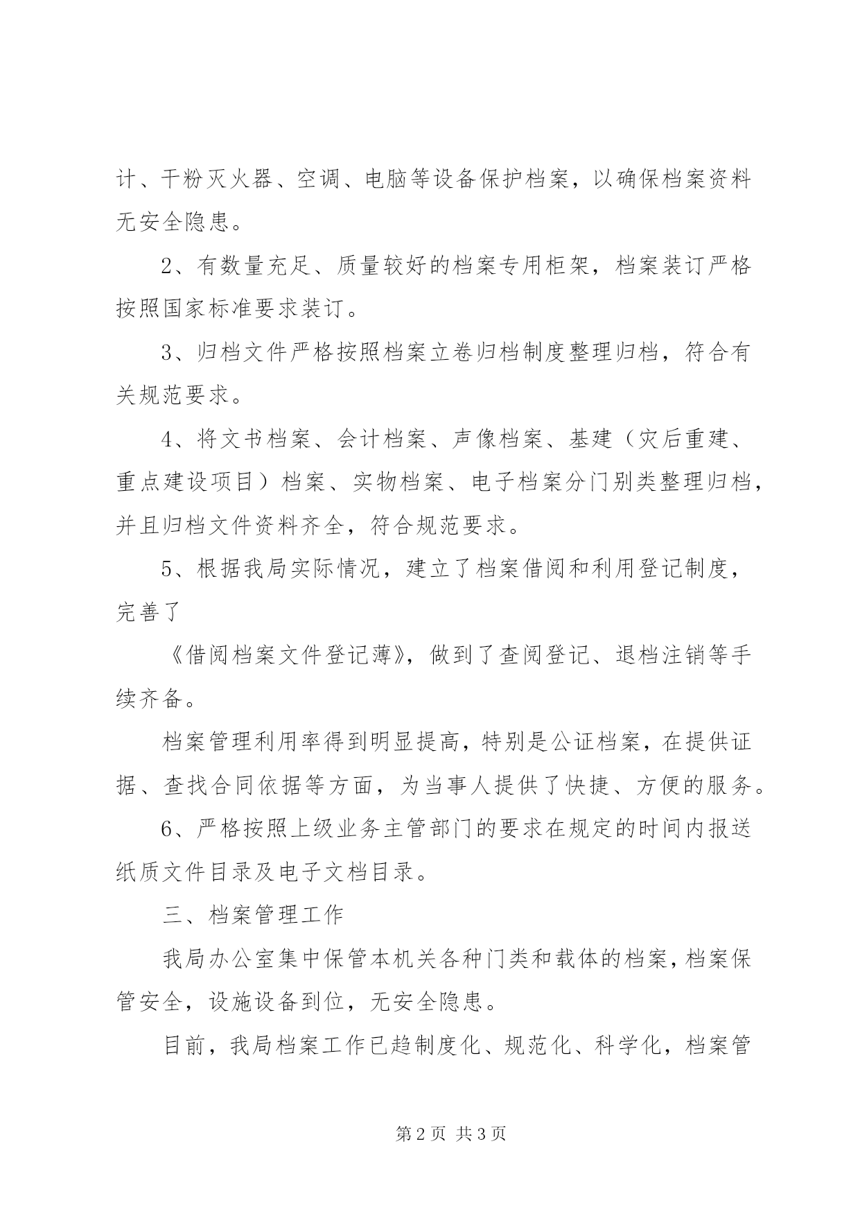 第PAGE\*Arabic\*MERGEFORMAT3页共NUMPAGES\*MERGEFORMAT3页司法局档案管理的自我总结一、组织管理1、局领导高度重视档案工作,今年重新调整了局档案管理领导小组和档案鉴定小组。明确了一名局领导分管档案工作,配备了专职档案工作人员,健全了由全局各科室兼职档案员组成的档案管理网络;同时保证了资金的投入,落实了档案业务工作所需经费。2、制定了司法局档案工作目标考核办法,将各乡镇司法所的档案工作列入目标考核内容,并要求各乡镇司法所严格执行,认真落实。3、建立健全档案管理制度,制定并落实了《文书档案综合管理办法》、《档案管理人员岗位责任制》、《档案管理制度》、《保密制度》等一系列档案管理制度,落实专人管理,明确了责任,在文件的收集、整理、立卷、归档等重要环节实现了制度化、规范化,做到收集齐全、分类合理、组卷科学、归档及时。档案形成永久1件、长期3件、短期1件。4、安排专人对电子文件进行归档管理,使我局档案管理逐步走向电子化。二、档案业务建设工作1、有适宜保管档案的专用库房,能容纳近20年来档案资料,档案专用库房门窗坚固、位置适当,不潮湿、不漏雨,备有温度计、干粉灭火器、空调、电脑等设备保护档案,以确保档案资料无安全隐患。2、有数量充足、质量较好的档案专用柜架,档案装订严格按照国家标准要求装订。3、归档文件严格按照档案立卷归档制度整理归档,符合有关规范要求。4、将文书档案、会计档案、声像档案、基建(灾后重建、重点建设项目)档案、实物档案、电子档案分门别类整理归档,并且归档文件资料齐全,符合规范要求。5、根据我局实际情况,建立了档案借阅和利用登记制度,完善了《借阅档案文件登记薄》,做到了查阅登记、退档注销等手续齐备。档案管理利用率得到明显提高,特别是公证档案,在提供证据、查找合同依据等方面,为当事人提供了快捷、方便的服务。6、严格按照上级业务主管部门的要求在规定的时间内报送纸质文件目录及电子文档目录。三、档案管理工作我局办公室集中保管本机关各种门类和载体的档案,档案保管安全,设施设备到位,无安全隐患。目前,我局档案工作已趋制度化、规范化、科学化,档案管理水平有了明显提高。在今后的工作中,我们将按照科学发展观的要求,以狠抓档案管理为契机,在巩固和发展己有成绩的基础上,继续努力,开拓进取,根据司法行政工作发展的需要,不断改进和完善档案管理手段,加快档案信息计算机输入工作,探索档案电子化管理的方式方法,争取早日实现档案管理电子化,使我局档案工作再上新台阶。