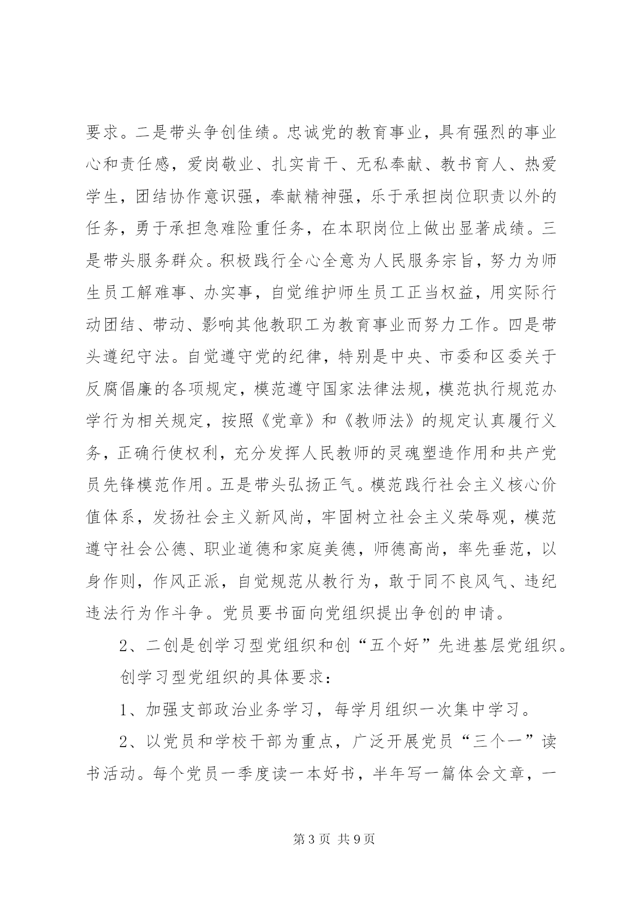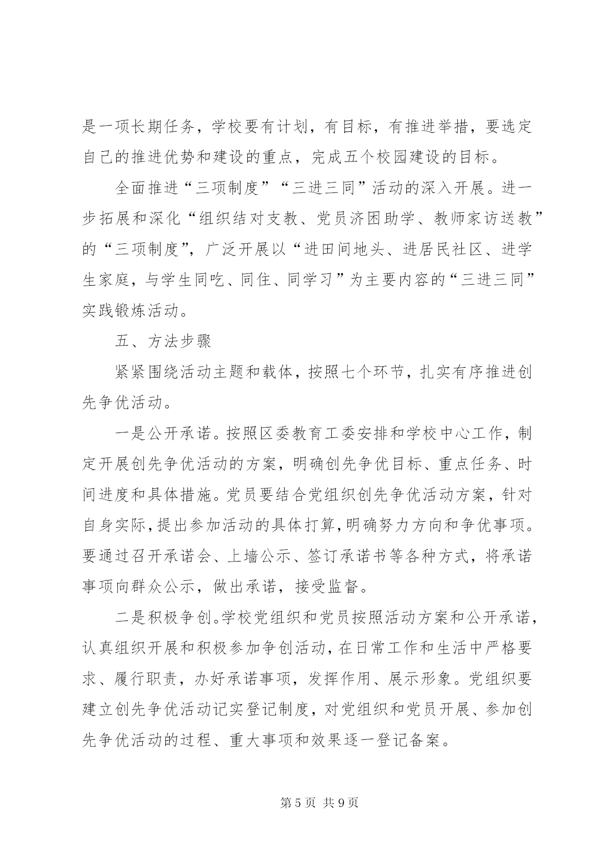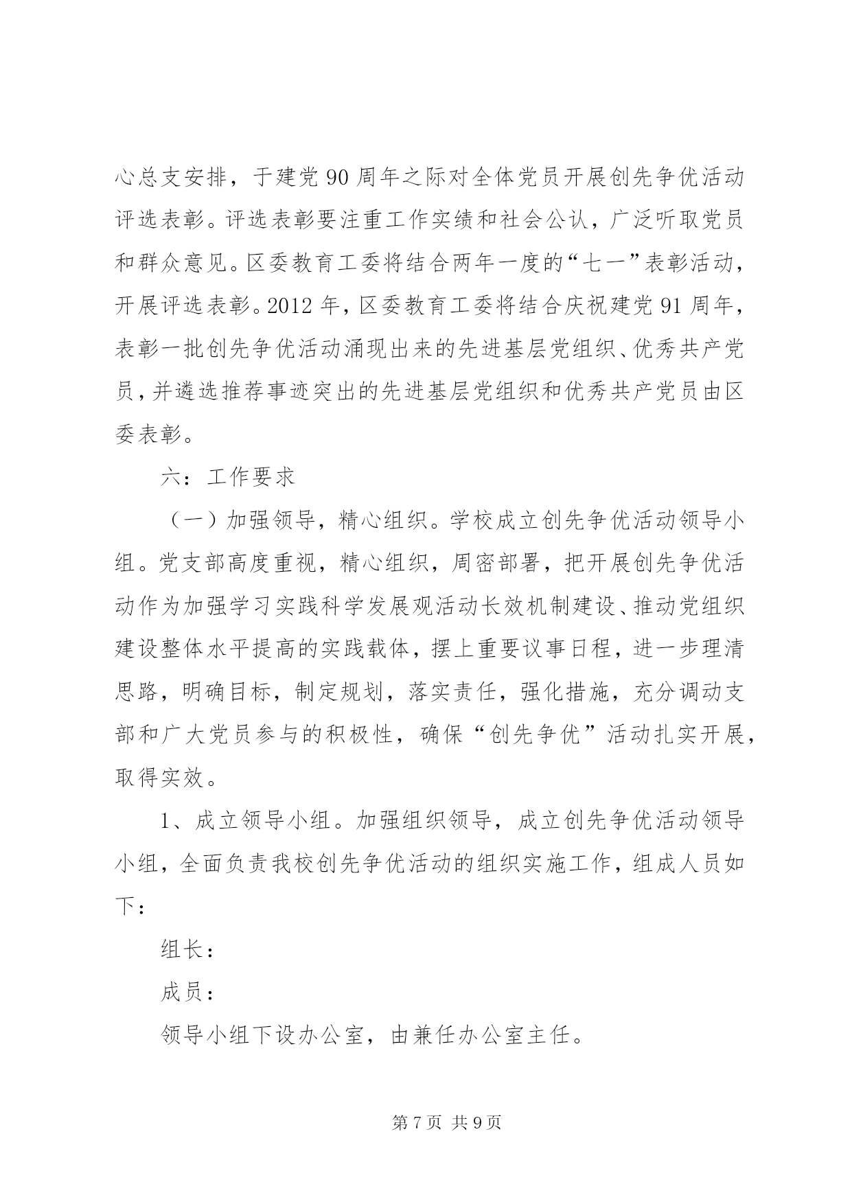 第PAGE\*Arabic\*MERGEFORMAT9页共NUMPAGES\*MERGEFORMAT9页小学创先争优活动方案为全面加强学校党支部建设,切实提高学校党支部在推进教育科学发展中的执行力,努力把学校党支部建设成为贯彻落实科学发展观的坚强堡垒,把广大党员队伍建设成为贯彻落实科学发展观的骨干力量,根据江津区委办《关于在全区党的基层组织和党员中开展创先争优活动的意见》(江津委办发〔2010〕21号)、《中共XX市江津区委组织部、中共XX市江津区委教育工作委员会印发的通知》(津委组〔2010〕50号)、《中共XX市江津区李市教育管理中心总支委员会印发的通知》(李教管总支发〔2010〕8号)要求,结合我校教育实际,制定《大桥小学校党支部深入开展创先争优活动实施方案》如下:一、指导思想以邓小平理论和“三个代表”重要思想为指导,深入学习实践科学发展观,紧紧围绕办人民满意的教育为目标,大力加强学校党支部建设和党员队伍建设,充分发挥学校党支部的战斗堡垒作用和共产党员的先锋模范作用,推进学校教育又好又快的科学发展。二、活动主题本次活动,江津区教委统一确定了主题和载体。主题是:“为师为范、倾情育人”;载体是:“培育优良‘三风’、争创一流学校”。以开展“树优良师德师风、做人民满意教师”主题实践活动为抓手,通过设立党员教师教学示范岗、党员职工服务示范岗等发挥党员作用,改善教育系统校风、教风、学风,提高教学质量,努力使教育让党放心、让人民满意。我校党支部以“做学生贴心人,育社会栋梁材”为主题,以“培育优良‘三风’、争当育人标兵”为载体,通过设立党员教师教学示范岗、党员职工服务示范岗等发挥党员作用,改善教育系统校风、教风、学风,提高教学质量,努力使教育让党放心、让人民满意。三、参加活动对象学校全体共产党员、入党积极分子。四、重点任务完成二二三工程(二争二创三推进活动)1、二争是争当优秀共产党员和争创党员示范岗。争创党员示范岗。党支部通过争创党员示范岗的系列活动的开展,对每个党员进行考核评议,对工作成绩突出的党员授予党员示范岗荣誉牌同时作为评选推荐优秀共产党员的条件。争创优秀共产党员。优秀共产党员的基本条件是,模范履行党章规定的义务,努力做到“五带头”:一是带头学习提高。认真学习实践科学发展观,自觉坚定理想信念;认真学习科学文化知识,成为本职工作的行家里手,成为学校工作的骨干;按照教育部的要求,树立终身学习思想,广泛阅读,把阅读变成悦读,让阅读成为一种习惯。具体学习要求见创学习型党组织对党员的要求。二是带头争创佳绩。忠诚党的教育事业,具有强烈的事业心和责任感,爱岗敬业、扎实肯干、无私奉献、教书育人、热爱学生,团结协作意识强,奉献精神强,乐于承担岗位职责以外的任务,勇于承担急难险重任务,在本职岗位上做出显著成绩。三是带头服务群众。积极践行全心全意为人民服务宗旨,努力为师生员工解难事、办实事,自觉维护师生员工正当权益,用实际行动团结、带动、影响其他教职工为教育事业而努力工作。四是带头遵纪守法。自觉遵守党的纪律,特别是中央、市委和区委关于反腐倡廉的各项规定,模范遵守国家法律法规,模范执行规范办学行为相关规定,按照《党章》和《教师法》的规定认真履行义务,正确行使权利,充分发挥人民教师的灵魂塑造作用和共产党员先锋模范作用。五是带头弘扬正气。模范践行社会主义核心价值体系,发扬社会主义新风尚,牢固树立社会主义荣辱观,模范遵守社会公德、职业道德和家庭美德,师德高尚,率先垂范,以身作则,作风正派,自觉规范从教行为,敢于同不良风气、违纪违法行为作斗争。党员要书面向党组织提出争创的申请。2、二创是创学习型党组织和创“五个好”先进基层党组织。创学习型党组织的具体要求:1、加强支部政治业务学习,每学月组织一次集中学习。2、以党员和学校干部为重点,广泛开展党员“三个一”读书活动。每个党员一季度读一本好书,半年写一篇体会文章,一年参加一次交流研讨和考评。把学习作为党员队伍建设的主要特征、组织活动的重要内容、提高战斗力的重要途径,坚持理论学习与有关政策和业务学习相结合。3、把学习任务细化到每个党小组、每个党员。每个党员每年订出读书计划、开出阅读书目、记好学习笔记。4、对党员学习情况要进行记载和公示,把党员学习情况纳入党员民主评议、年度考核、评先评优。“五个好”的基本要求。一是领导班子好。领导班子能深入学习实践科学发展观,认真贯彻党的路线方针政策,依法治校,坚持民主集中制,决策科学民主,有较强的凝聚力和战斗力;班子成员团结协作,求真务实,模范遵守党风廉政建设若干规定,无违纪违规行为。二是党员队伍好。党员素质优良,有较强的党员意识,能够充分发挥先锋模范作用。三是工作机制好。规章制度完善,管理措施到位,工作运行顺畅有序。四是工作业绩好。本单位各项工作成绩显著,