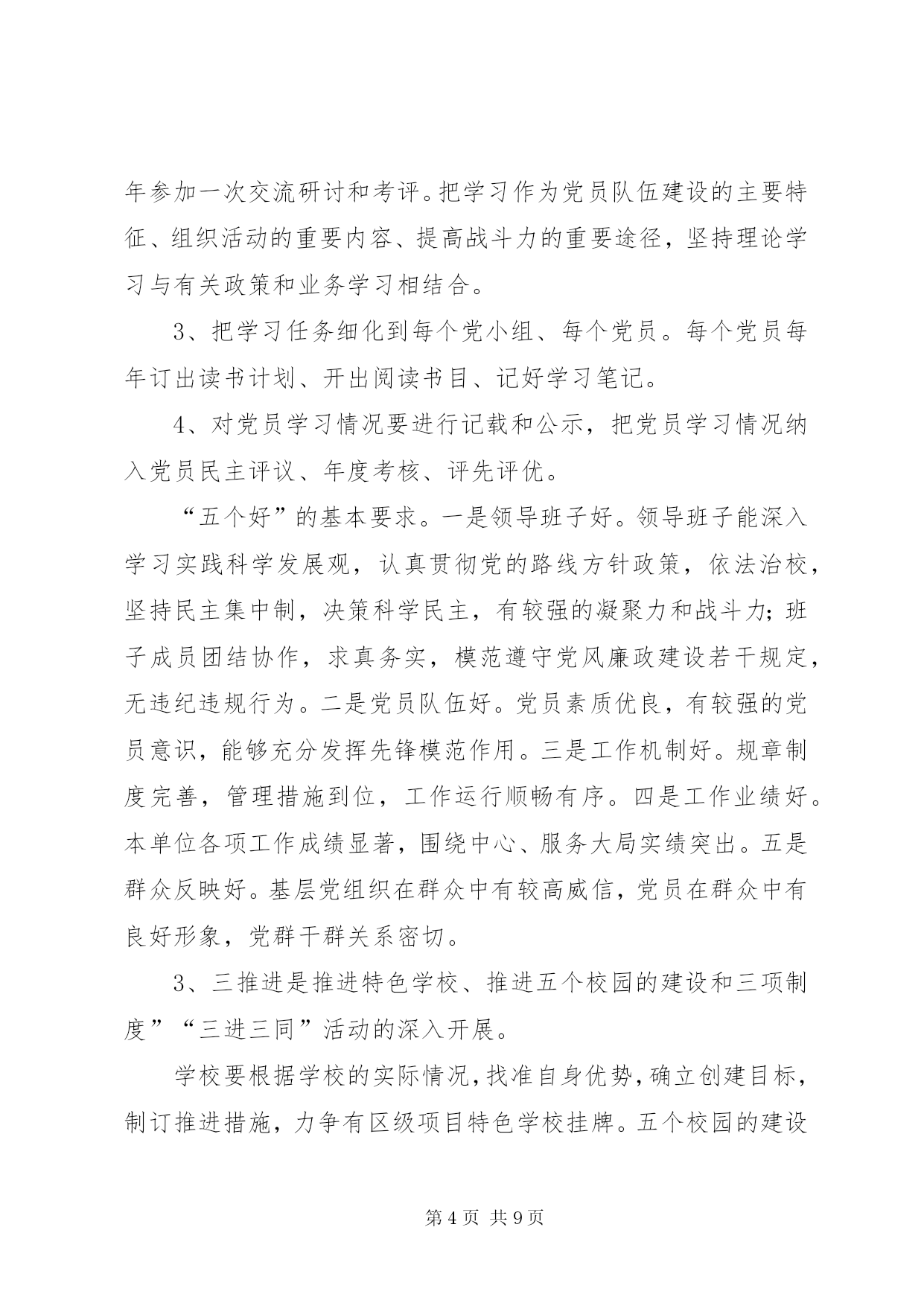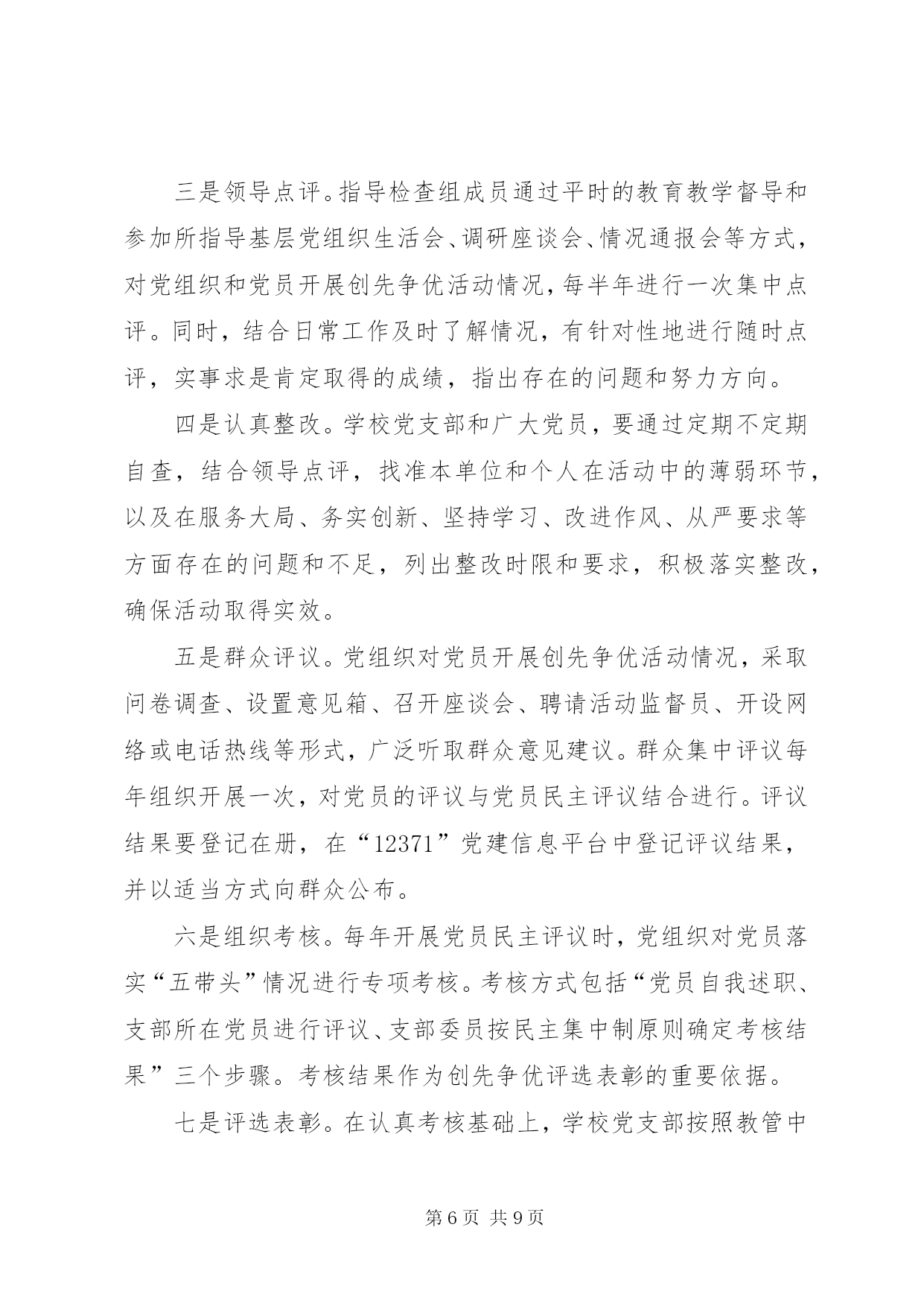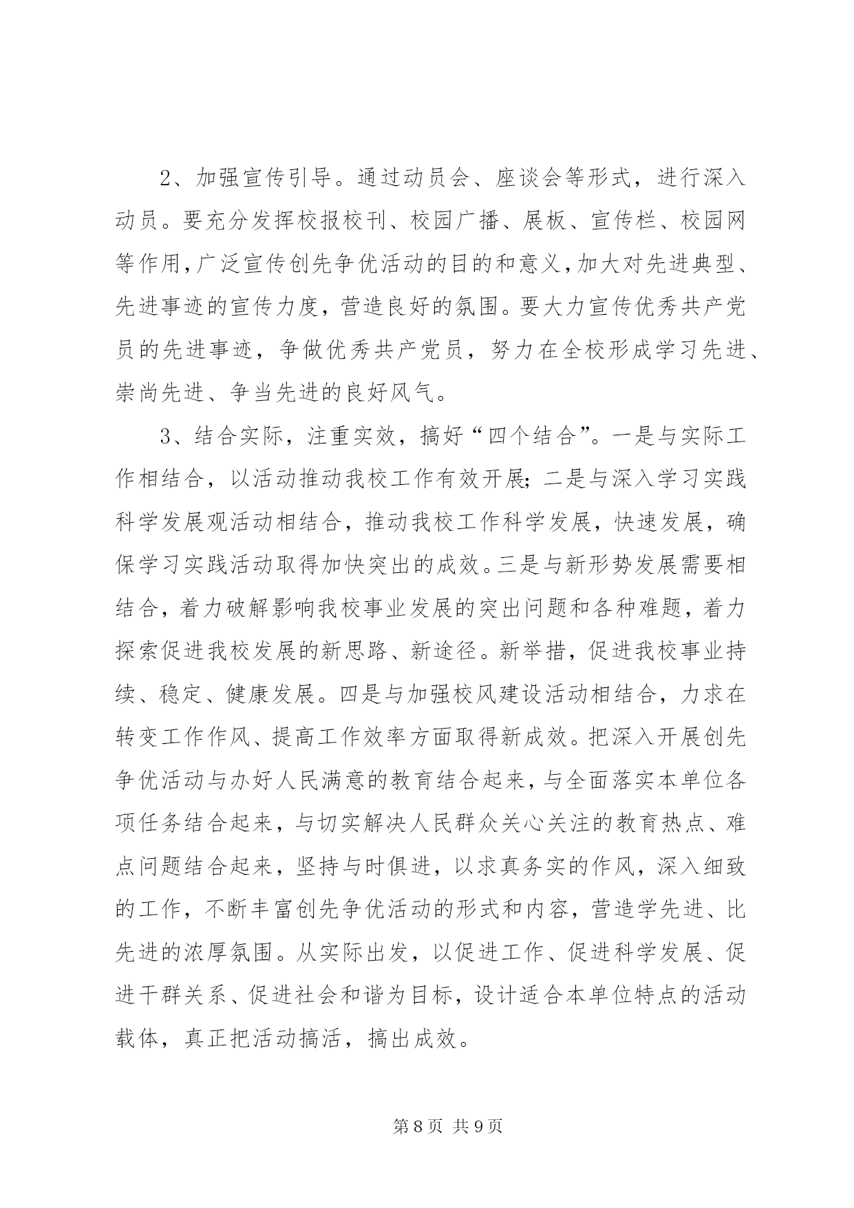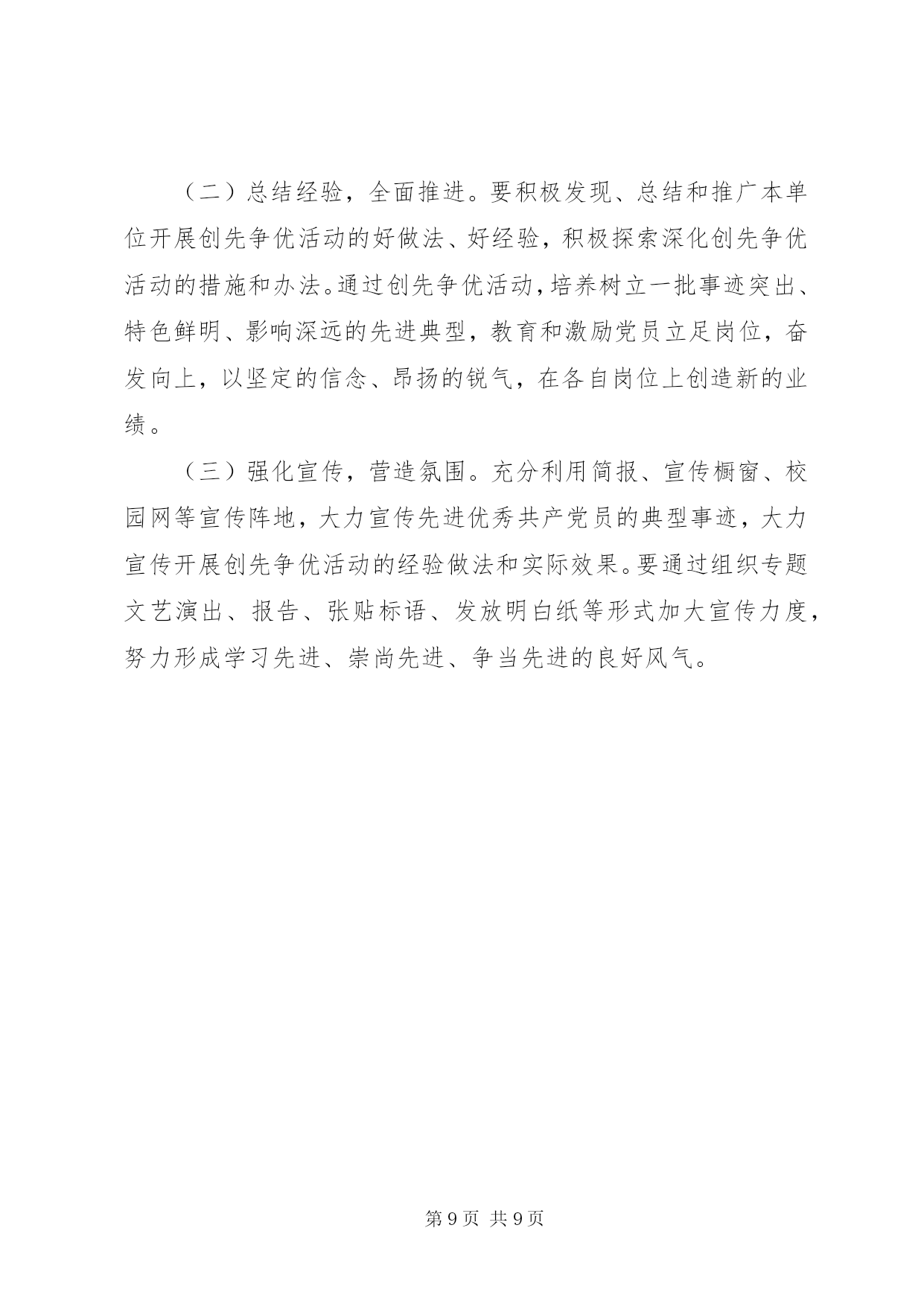 第PAGE\*Arabic\*MERGEFORMAT9页共NUMPAGES\*MERGEFORMAT9页小学创先争优活动方案为全面加强学校党支部建设,切实提高学校党支部在推进教育科学发展中的执行力,努力把学校党支部建设成为贯彻落实科学发展观的坚强堡垒,把广大党员队伍建设成为贯彻落实科学发展观的骨干力量,根据江津区委办《关于在全区党的基层组织和党员中开展创先争优活动的意见》(江津委办发〔2010〕21号)、《中共XX市江津区委组织部、中共XX市江津区委教育工作委员会印发的通知》(津委组〔2010〕50号)、《中共XX市江津区李市教育管理中心总支委员会印发的通知》(李教管总支发〔2010〕8号)要求,结合我校教育实际,制定《大桥小学校党支部深入开展创先争优活动实施方案》如下:一、指导思想以邓小平理论和“三个代表”重要思想为指导,深入学习实践科学发展观,紧紧围绕办人民满意的教育为目标,大力加强学校党支部建设和党员队伍建设,充分发挥学校党支部的战斗堡垒作用和共产党员的先锋模范作用,推进学校教育又好又快的科学发展。二、活动主题本次活动,江津区教委统一确定了主题和载体。主题是:“为师为范、倾情育人”;载体是:“培育优良‘三风’、争创一流学校”。以开展“树优良师德师风、做人民满意教师”主题实践活动为抓手,通过设立党员教师教学示范岗、党员职工服务示范岗等发挥党员作用,改善教育系统校风、教风、学风,提高教学质量,努力使教育让党放心、让人民满意。我校党支部以“做学生贴心人,育社会栋梁材”为主题,以“培育优良‘三风’、争当育人标兵”为载体,通过设立党员教师教学示范岗、党员职工服务示范岗等发挥党员作用,改善教育系统校风、教风、学风,提高教学质量,努力使教育让党放心、让人民满意。三、参加活动对象学校全体共产党员、入党积极分子。四、重点任务完成二二三工程(二争二创三推进活动)1、二争是争当优秀共产党员和争创党员示范岗。争创党员示范岗。党支部通过争创党员示范岗的系列活动的开展,对每个党员进行考核评议,对工作成绩突出的党员授予党员示范岗荣誉牌同时作为评选推荐优秀共产党员的条件。争创优秀共产党员。优秀共产党员的基本条件是,模范履行党章规定的义务,努力做到“五带头”:一是带头学习提高。认真学习实践科学发展观,自觉坚定理想信念;认真学习科学文化知识,成为本职工作的行家里手,成为学校工作的骨干;按照教育部的要求,树立终身学习思想,广泛阅读,把阅读变成悦读,让阅读成为一种习惯。具体学习要求见创学习型党组织对党员的要求。二是带头争创佳绩。忠诚党的教育事业,具有强烈的事业心和责任感,爱岗敬业、扎实肯干、无私奉献、教书育人、热爱学生,团结协作意识强,奉献精神强,乐于承担岗位职责以外的任务,勇于承担急难险重任务,在本职岗位上做出显著成绩。三是带头服务群众。积极践行全心全意为人民服务宗旨,努力为师生员工解难事、办实事,自觉维护师生员工正当权益,用实际行动团结、带动、影响其他教职工为教育事业而努力工作。四是带头遵纪守法。自觉遵守党的纪律,特别是中央、市委和区委关于反腐倡廉的各项规定,模范遵守国家法律法规,模范执行规范办学行为相关规定,按照《党章》和《教师法》的规定认真履行义务,正确行使权利,充分发挥人民教师的灵魂塑造作用和共产党员先锋模范作用。五是带头弘扬正气。模范践行社会主义核心价值体系,发扬社会主义新风尚,牢固树立社会主义荣辱观,模范遵守社会公德、职业道德和家庭美德,师德高尚,率先垂范,以身作则,作风正派,自觉规范从教行为,敢于同不良风气、违纪违法行为作斗争。党员要书面向党组织提出争创的申请。2、二创是创学习型党组织和创“五个好”先进基层党组织。创学习型党组织的具体要求:1、加强支部政治业务学习,每学月组织一次集中学习。2、以党员和学校干部为重点,广泛开展党员“三个一”读书活动。每个党员一季度读一本好书,半年写一篇体会文章,一年参加一次交流研讨和考评。把学习作为党员队伍建设的主要特征、组织活动的重要内容、提高战斗力的重要途径,坚持理论学习与有关政策和业务学习相结合。3、把学习任务细化到每个党小组、每个党员。每个党员每年订出读书计划、开出阅读书目、记好学习笔记。4、对党员学习情况要进行记载和公示,把党员学习情况纳入党员民主评议、年度考核、评先评优。“五个好”的基本要求。一是领导班子好。领导班子能深入学习实践科学发展观,认真贯彻党的路线方针政策,依法治校,坚持民主集中制,决策科学民主,有较强的凝聚力和战斗力;班子成员团结协作,求真务实,模范遵守党风廉政建设若干规定,无违纪违规行为。二是党员队伍好。党员素质优良,有较强的党员意识,能够充分发挥先锋模范作用。三是工作机制好。规章制度完善,管理措施到位,工作运行顺畅有序。四是工作业绩好。本单位各项工作成绩显著,