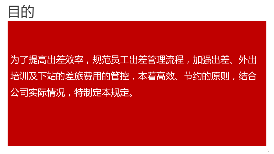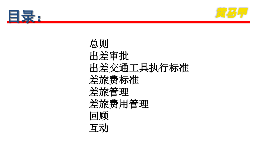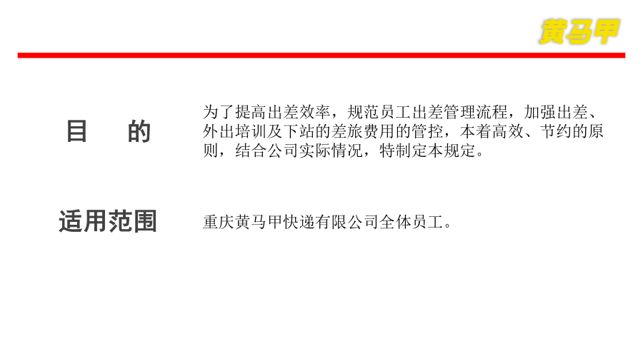 重庆黄马甲出差管理制度出差管理制度目录:目录第一章、总则第一章、总则为了提高出差效率,规范员工出差管理流程,加强出差、外出培训及下站的差旅费用的管控,本着高效、节约的原则,结合公司实际情况,特制定本规定。目的适用范围第二章、出差审批审批事项与附加文件审批权限及流程出差期限出差期限审核第三章出差交通工具执行标准交通工具选择标准第四章差旅费标准省内差旅费标准第五章、差旅管理工具出差申请表培训需求申请表下站登记表第六章、差旅费用管理费用管理预借现金费用报销补充说明补充:回顾谢谢支持再见