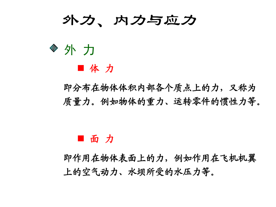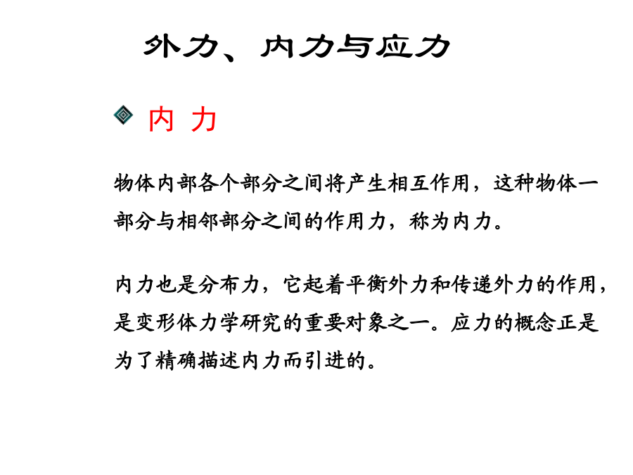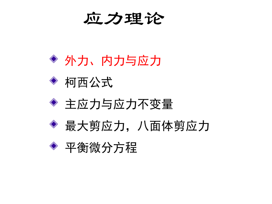 弹性力学应力理论应力理论外力、内力与应力外力、内力与应力外力、内力与应力外力、内力与应力外力、内力与应力外力、内力与应力外力、内力与应力外力、内力与应力外力、内力与应力外力、内力与应力外力、内力与应力外力、内力与应力外力、内力与应力外力、内力与应力外力、内力与应力外力、内力与应力外力、内力与应力外力、内力与应力外力、内力与应力外力、内力与应力应力理论Chapter3.2Chapter3.2Chapter3.2Chapter3.2Chapter3.2Chapter3.2Chapter3.2这就是著名的柯西公式,又称斜面应力公式。Chapter3.2Chapter3.2Chapter3.2Chapter3.2Chapter3.2应力理论Chapter3.3Chapter3.3Chapter3.3Chapter3.3Chapter3.3Chapter3.3Chapter3.3Chapter3.3Chapter3.3Chapter3.3Chapter3.3Chapter3.3Chapter3.3Chapter3.3Chapter3.3Chapter3.3例:已知受力物体中某点的应力分量为(单位:MPa)试求主应力分量及主方向余弦。解:此点的应力状态张量的矩阵形式为:首先,求出应力不变量为于是,特征方程为求解此特征方程,得三个主应力分别为将三个主应力值依次分别代入上式中的任意两式,并利用关系式,联立求解即可得到三个主方向的方向余弦。例如为求1的方向余弦,l1、m1、n1,将1=214.6代入上式的前两式得同样可得其余两组方向余弦为:主应力:主方向方向余弦:Chapter3.3Chapter3.3应力理论Chapter3.4Chapter3.4Chapter3.4Chapter3.4Chapter3.4Chapter3.4Chapter3.4Chapter3.4应力理论Chapter3.5Chapter3.5OChapter3.5xChapter3.5Chapter3.5Chapter3.5Chapter3.5Chapter3.5Chapter3.5Chapter3.5Chapter3.5