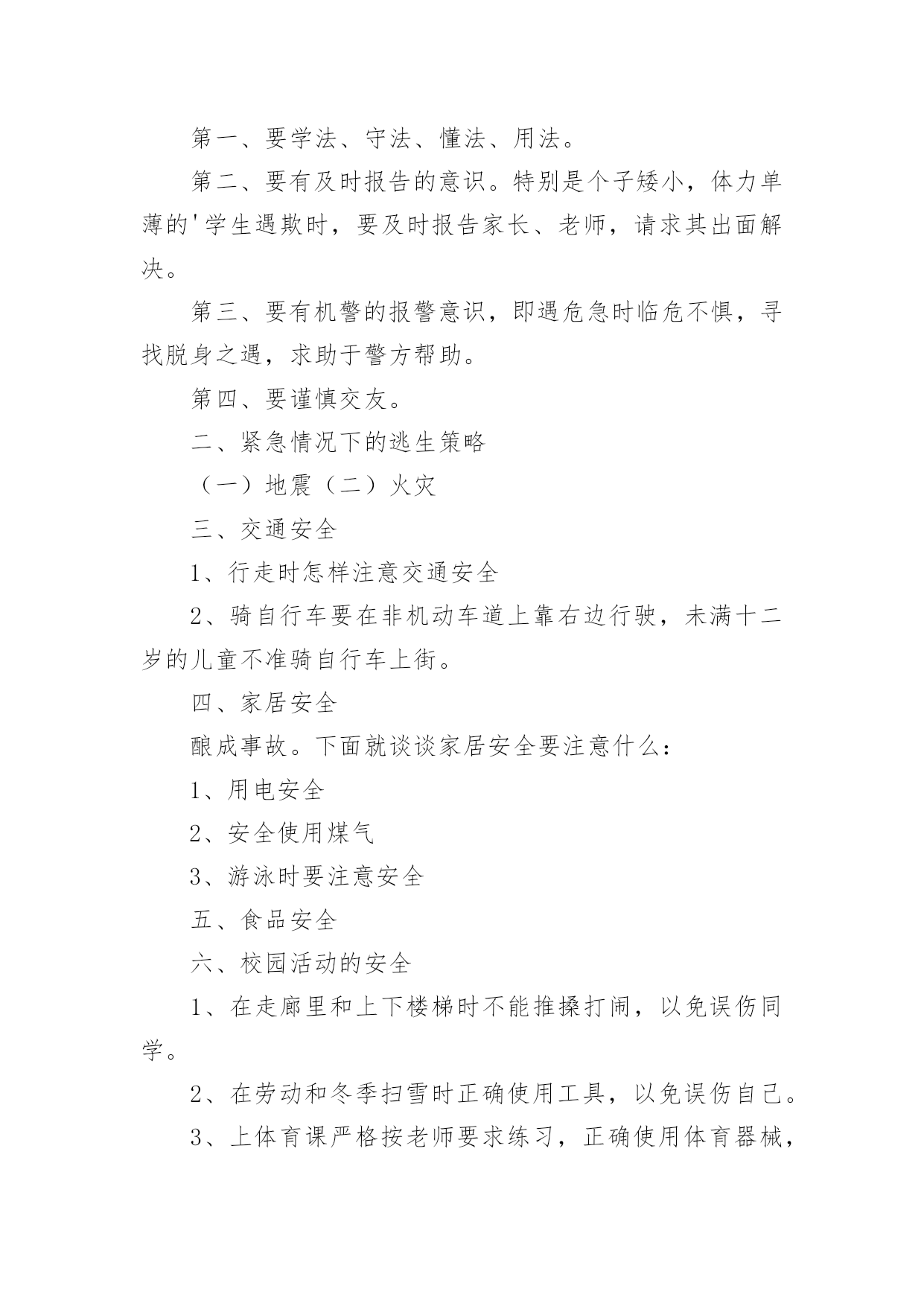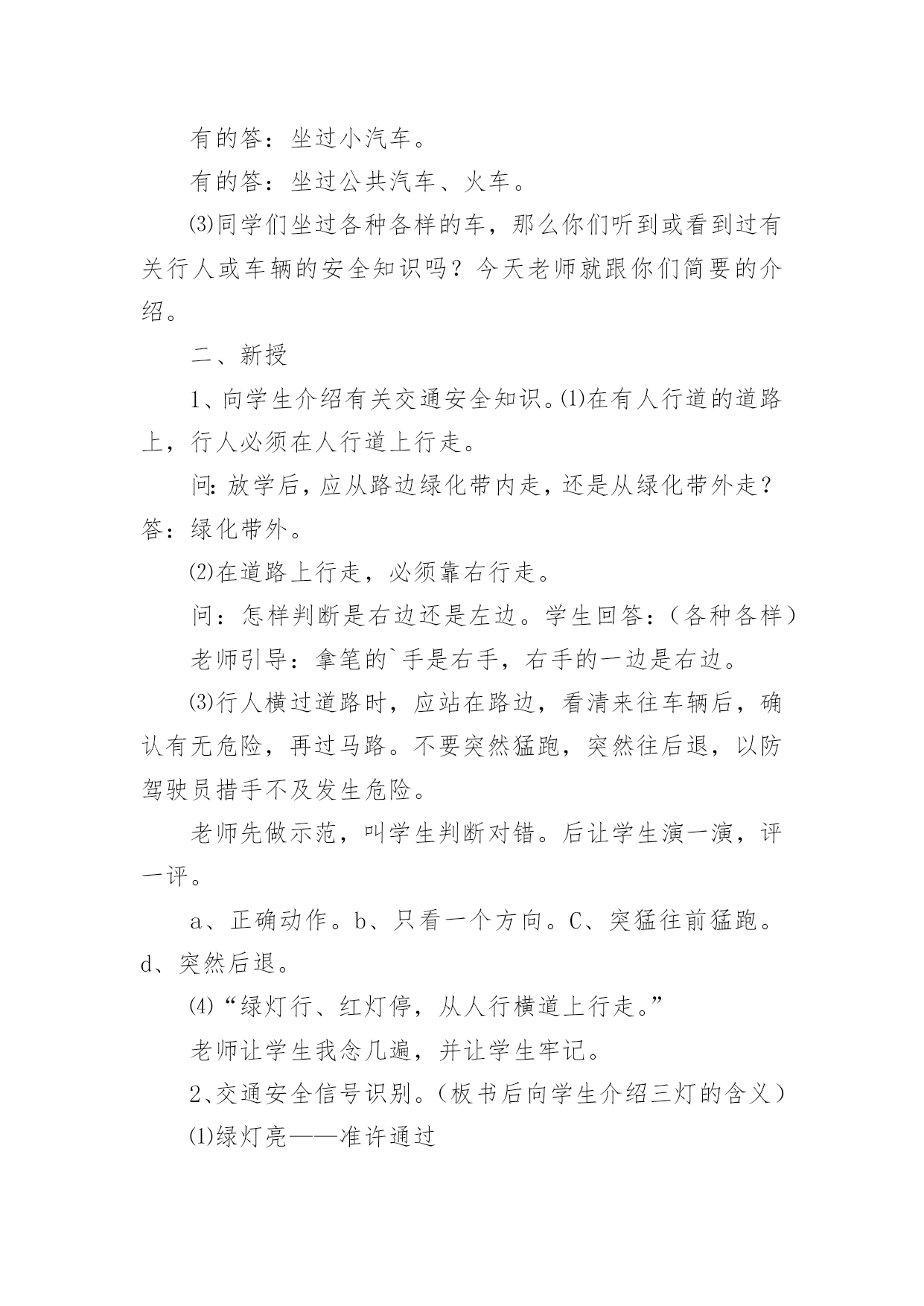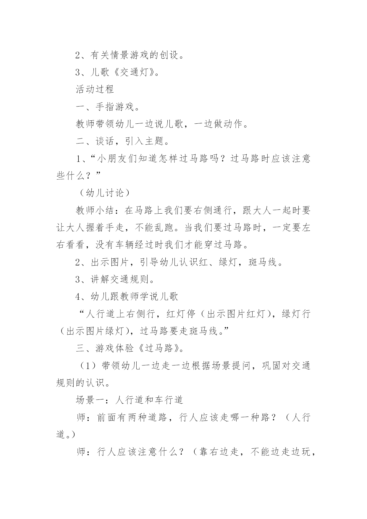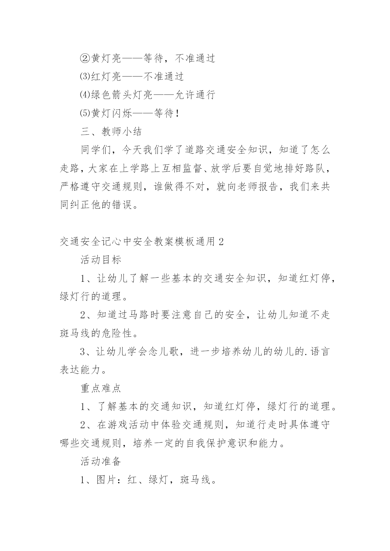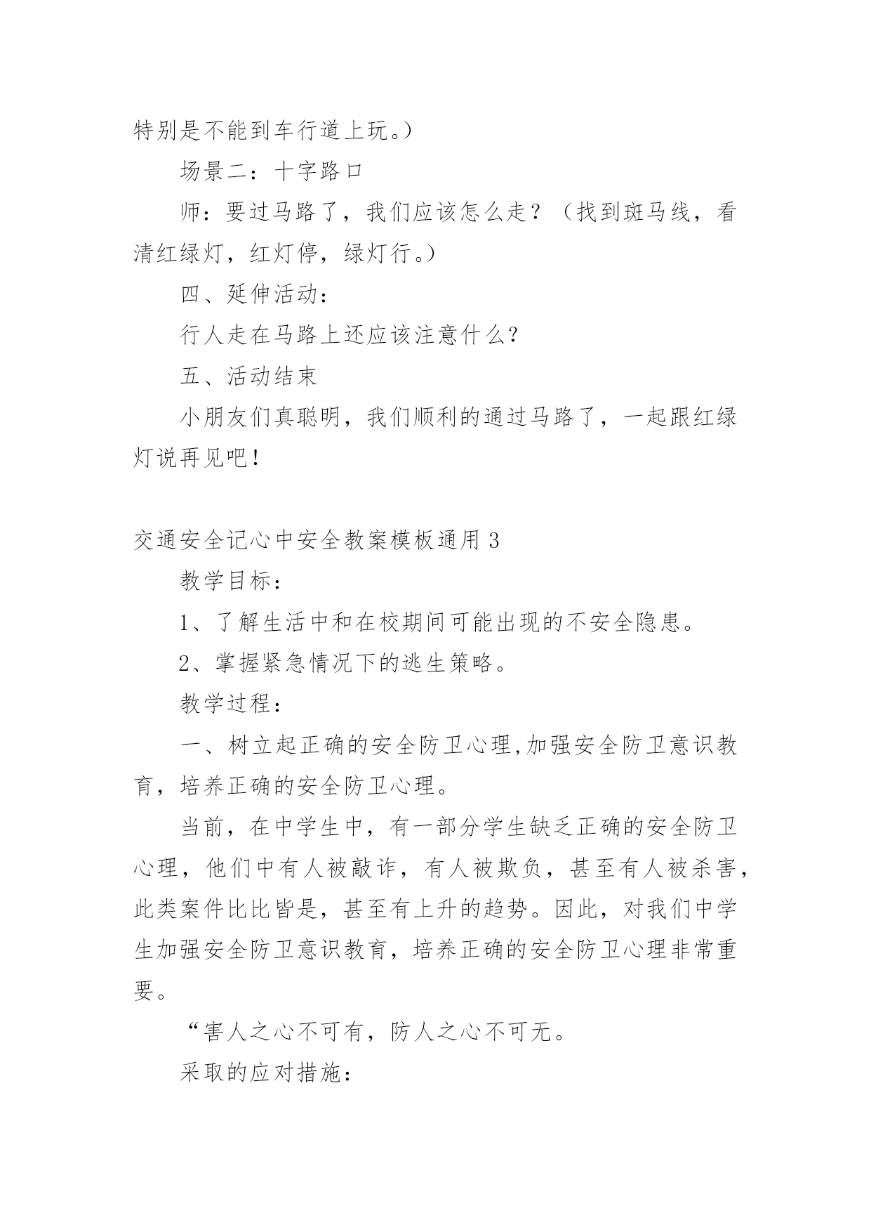 交通安全记心中安全教案交通安全记心中安全教案模板通用作为一名辛苦耕耘的教育工作者,通常会被要求编写教案,编写教案有利于我们准确把握教材的重点与难点,进而选择恰当的教学方法。那么大家知道正规的教案是怎么写的吗?下面是小编精心整理的交通安全记心中安全教案模板通用,欢迎大家分享。交通安全记心中安全教案模板通用1班会目的:1、教育学生在单独行走时应注意的安全。2、对学生坐车时应注意的安全进行教育。班会重点:让学生懂得交通安全方面的知识班会时间:11月4日下午第二节教学过程:一、导入老师向学生提问:⑴同学们,你们坐过车吗?学生回答:坐过。⑵那么你们坐的是什么样的车呢?有的答:坐过摩托车。有的答;坐过自行车。有的答:坐过小汽车。有的答:坐过公共汽车、火车。⑶同学们坐过各种各样的车,那么你们听到或看到过有关行人或车辆的安全知识吗?今天老师就跟你们简要的介绍。二、新授1、向学生介绍有关交通安全知识。⑴在有人行道的道路上,行人必须在人行道上行走。问:放学后,应从路边绿化带内走,还是从绿化带外走?答:绿化带外。⑵在道路上行走,必须靠右行走。问:怎样判断是右边还是左边。学生回答:(各种各样)老师引导:拿笔的`手是右手,右手的一边是右边。⑶行人横过道路时,应站在路边,看清来往车辆后,确认有无危险,再过马路。不要突然猛跑,突然往后退,以防驾驶员措手不及发生危险。老师先做示范,叫学生判断对错。后让学生演一演,评一评。a、正确动作。b、只看一个方向。C、突猛往前猛跑。d、突然后退。⑷“绿灯行、红灯停,从人行横道上行走。”老师让学生我念几遍,并让学生牢记。2、交通安全信号识别。(板书后向学生介绍三灯的含义)⑴绿灯亮——准许通过②黄灯亮——等待,不准通过⑶红灯亮——不准通过⑷绿色箭头灯亮——允许通行⑸黄灯闪烁——等待!三、教师小结同学们,今天我们学了道路交通安全知识,知道了怎么走路,大家在上学路上互相监督、放学后要自觉地排好路队,严格遵守交通规则,谁做得不对,就向老师报告,我们来共同纠正他的错误。交通安全记心中安全教案模板通用2活动目标1、让幼儿了解一些基本的交通安全知识,知道红灯停,绿灯行的道理。2、知道过马路时要注意自己的安全,让幼儿知道不走斑马线的危险性。3、让幼儿学会念儿歌,进一步培养幼儿的幼儿的.语言表达能力。重点难点1、了解基本的交通知识,知道红灯停,绿灯行的道理。2、在游戏活动中体验交通规则,知道行走时具体遵守哪些交通规则,培养一定的自我保护意识和能力。活动准备1、图片:红、绿灯,斑马线。2、有关情景游戏的创设。3、儿歌《交通灯》。活动过程一、手指游戏。教师带领幼儿一边说儿歌,一边做动作。二、谈话,引入主题。1、“小朋友们知道怎样过马路吗?过马路时应该注意些什么?”(幼儿讨论)教师小结:在马路上我们要右侧通行,跟大人一起时要让大人握着手走,不能乱跑。当我们要过马路时,一定要左右看看,没有车辆经过时我们才能穿过马路。2、出示图片,引导幼儿认识红、绿灯,斑马线。3、讲解交通规则。4、幼儿跟教师学说儿歌“人行道上右侧行,红灯停(出示图片红灯),绿灯行(出示图片绿灯),过马路要走斑马线。”三、游戏体验《过马路》。(1)带领幼儿一边走一边根据场景提问,巩固对交通规则的认识。场景一:人行道和车行道师:前面有两种道路,行人应该走哪一种路?(人行道。)师:行人应该注意什么?(靠右边走,不能边走边玩,特别是不能到车行道上玩。)场景二:十字路口师:要过马路了,我们应该怎么走?(找到斑马线,看清红绿灯,红灯停,绿灯行。)四、延伸活动:行人走在马路上还应该注意什么?五、活动结束小朋友们真聪明,我们顺利的通过马路了,一起跟红绿灯说再见吧!交通安全记心中安全教案模板通用3教学目标:1、了解生活中和在校期间可能出现的不安全隐患。2、掌握紧急情况下的逃生策略。教学过程:一、树立起正确的安全防卫心理,加强安全防卫意识教育,培养正确的安全防卫心理。当前,在中学生中,有一部分学生缺乏正确的安全防卫心理,他们中有人被敲诈,有人被欺负,甚至有人被杀害,此类案件比比皆是,甚至有上升的趋势。因此,对我们中学生加强安全防卫意识教育,培养正确的安全防卫心理非常重要。“害人之心不可有,防人之心不可无。采取的应对措施:第一、要学法、守法、懂法、用法。第二、要有及时报告的意识。特别是个子矮小,体力单薄的'学生遇欺时,要及时报告家长、老师,请求其出面解决。第三、要有机警的报警意识,即遇危急时临危不惧,寻找脱身之遇,求助于警方帮助。第四、要谨慎交友。二、紧急情况下的逃生策略(一)地震(二)火灾三、交通安全1、行走时怎样注意交通安全2、骑自行车要在非机动车道上靠右边行驶,未满十二岁的儿童不准骑自行车上街。四、家居安全酿成事故。下面就谈谈家居安全要注意什么:1、用电安全2、安全使用煤气3、游泳时要注意安全