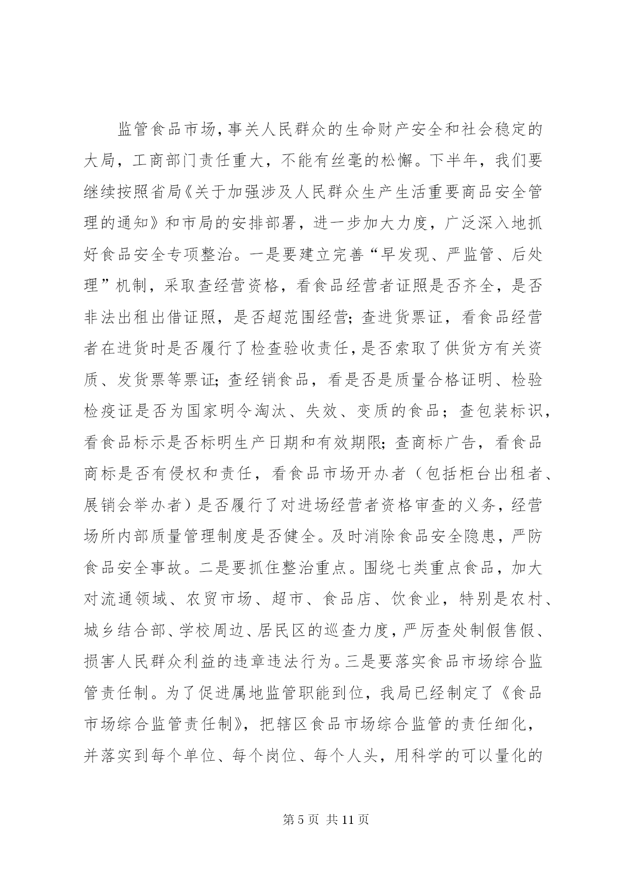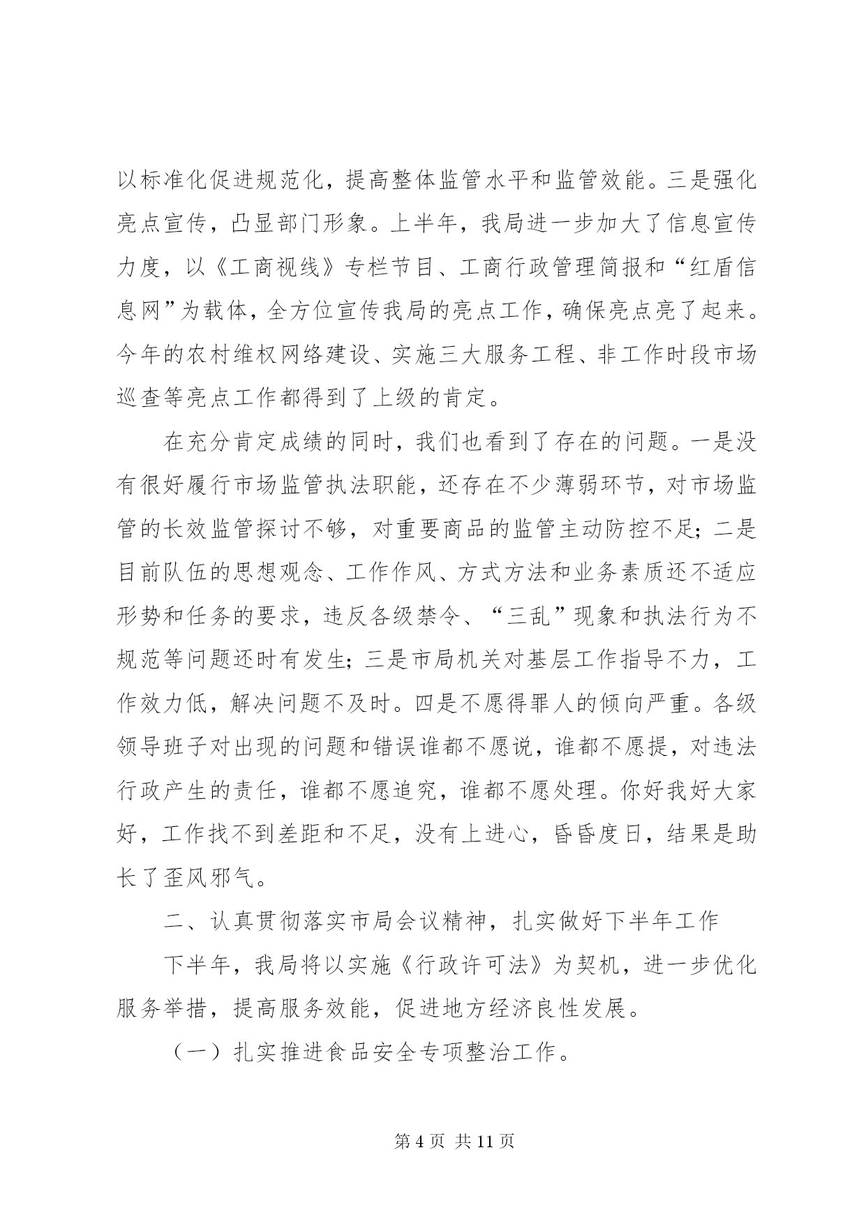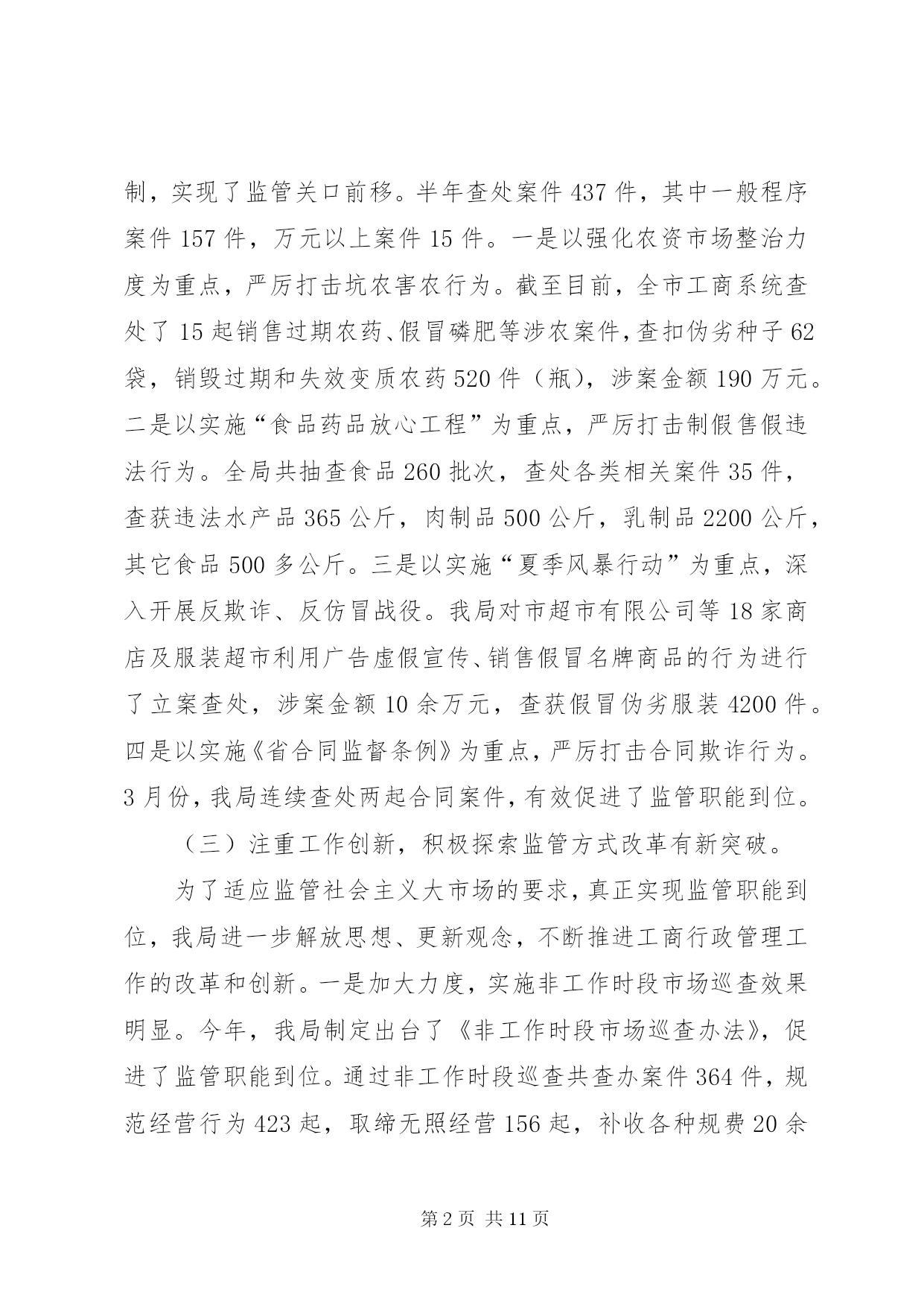 第PAGE\*Arabic\*MERGEFORMAT11页共NUMPAGES\*MERGEFORMAT11页市工商系统半年总结会议讲话同志们:这次会议主要是传达贯彻省、市工商局长会议精神,总结上半年的工作,安排部署下半年工作任务。下面,我讲几个方面的意见:一、充分肯定上半年工作成绩,认识存在的主要问题上半年,我局按照年初市局工作会议、3月份财务工作会议、4月份党风廉政建设工作会议的部署,紧紧围绕服务中心工作、拓宽监管领域、人事制度改革等主题,全面推进了各项工作,截至6月底,实现行政性收费314.5万元,完成全年预算480万元的66%;罚没款完成87.8万元,完成全年预算86万元的102%。(一)注重发展主题,服务地方经济发展有新思路。今年以来,我局凸显服务发展主题,在优化登记服务、延展商标服务、拓宽消费维权、积极培育市场上进一步优化服务举措,大力实施市场主体“踏进门槛”时的亲情服务工程、市场主体成长初期时的引导服务工程和市场主体发展壮大时的提升服务工程等“三大服务工程”,有力地促进了地方经济的发展,得到了市及两级政府的充分肯定。(二)注重工商职能,营造良好市场秩序有新举措。今年以来,我局进一步加强市场整治力度,探索长效监管机制,实现了监管关口前移。半年查处案件437件,其中一般程序案件157件,万元以上案件15件。一是以强化农资市场整治力度为重点,严厉打击坑农害农行为。截至目前,全市工商系统查处了15起销售过期农药、假冒磷肥等涉农案件,查扣伪劣种子62袋,销毁过期和失效变质农药520件(瓶),涉案金额190万元。二是以实施“食品药品放心工程”为重点,严厉打击制假售假违法行为。全局共抽查食品260批次,查处各类相关案件35件,查获违法水产品365公斤,肉制品500公斤,乳制品2200公斤,其它食品500多公斤。三是以实施“夏季风暴行动”为重点,深入开展反欺诈、反仿冒战役。我局对市超市有限公司等18家商店及服装超市利用广告虚假宣传、销售假冒名牌商品的行为进行了立案查处,涉案金额10余万元,查获假冒伪劣服装4200件。四是以实施《省合同监督条例》为重点,严厉打击合同欺诈行为。3月份,我局连续查处两起合同案件,有效促进了监管职能到位。(三)注重工作创新,积极探索监管方式改革有新突破。为了适应监管社会主义大市场的要求,真正实现监管职能到位,我局进一步解放思想、更新观念,不断推进工商行政管理工作的改革和创新。一是加大力度,实施非工作时段市场巡查效果明显。今年,我局制定出台了《非工作时段市场巡查办法》,促进了监管职能到位。通过非工作时段巡查共查办案件364件,规范经营行为423起,取缔无照经营156起,补收各种规费20余万元,现场调处消费者投诉215件,查处虚假广告182件。二是创新举措,农村维权网络延伸到田间地头。今年,我局加大了农村维权工作的力度,启动了农村维权网络,把12315维权工作延伸到了田间地头。目前,全市已建起了77个村级维权站,聘请了77名12315农村维权员,培训乡镇干部、村民200多人次。农村维权网络启动以来,已受理农村消费者投诉68件,为农民消费者挽回经济损失26.8万元。三是积极探索,推行退出市场主体后延监管。今年以来,我局以推行退出市场主体相关单位告知制、信息提示制、回查制、法定代表人及投资人备案制、网上公示制“五项制度”为抓手,强化对市场主体的全过程监管。目前,已建立1800个退出市场主体的电子档案,对退出市场的51家主体进行了回查,查处15家违法经营主体,对其中1541个退出的市场主体名单进行了公示。(四)注重自身建设,队伍素质执法形象有新提升。今年,我局坚持抓党风廉政、抓禁令执行、抓执法监察、抓行为规范、抓业务培训、抓正反典型,促进了干部队伍的思想作风转变和业务素质的提高。一是围绕创建“服务零投诉、群众百满意”队伍的要求,推行“红、黄”牌管理制度,狠抓队伍素质的建设,提升了服务和监管工作的水平。二是量化人员责级考核,推进人事制度改革。通过完善原有岗位职责、制度规范、办事程序、政务公开等管理文件,从各个工作细节的标准化建设入手,以标准化促进规范化,提高整体监管水平和监管效能。三是强化亮点宣传,凸显部门形象。上半年,我局进一步加大了信息宣传力度,以《工商视线》专栏节目、工商行政管理简报和“红盾信息网”为载体,全方位宣传我局的亮点工作,确保亮点亮了起来。今年的农村维权网络建设、实施三大服务工程、非工作时段市场巡查等亮点工作都得到了上级的肯定。在充分肯定成绩的同时,我们也看到了存在的问题。一是没有很好履行市场监管执法职能,还存在不少薄弱环节,对市场监管的长效监管探讨不够,对重要商品的监管主动防控不足;二是目前队伍的思想观念、工作作风、方式方法和业务素质还不适应形势和任务的要求,违反各级禁令、