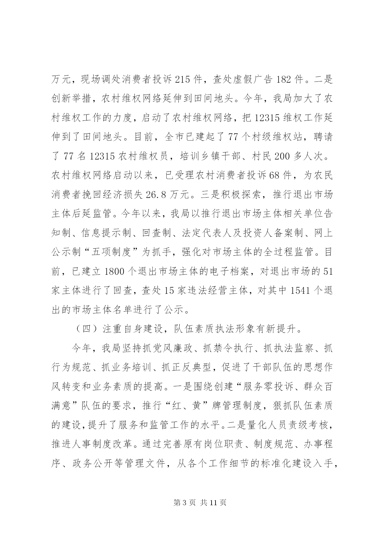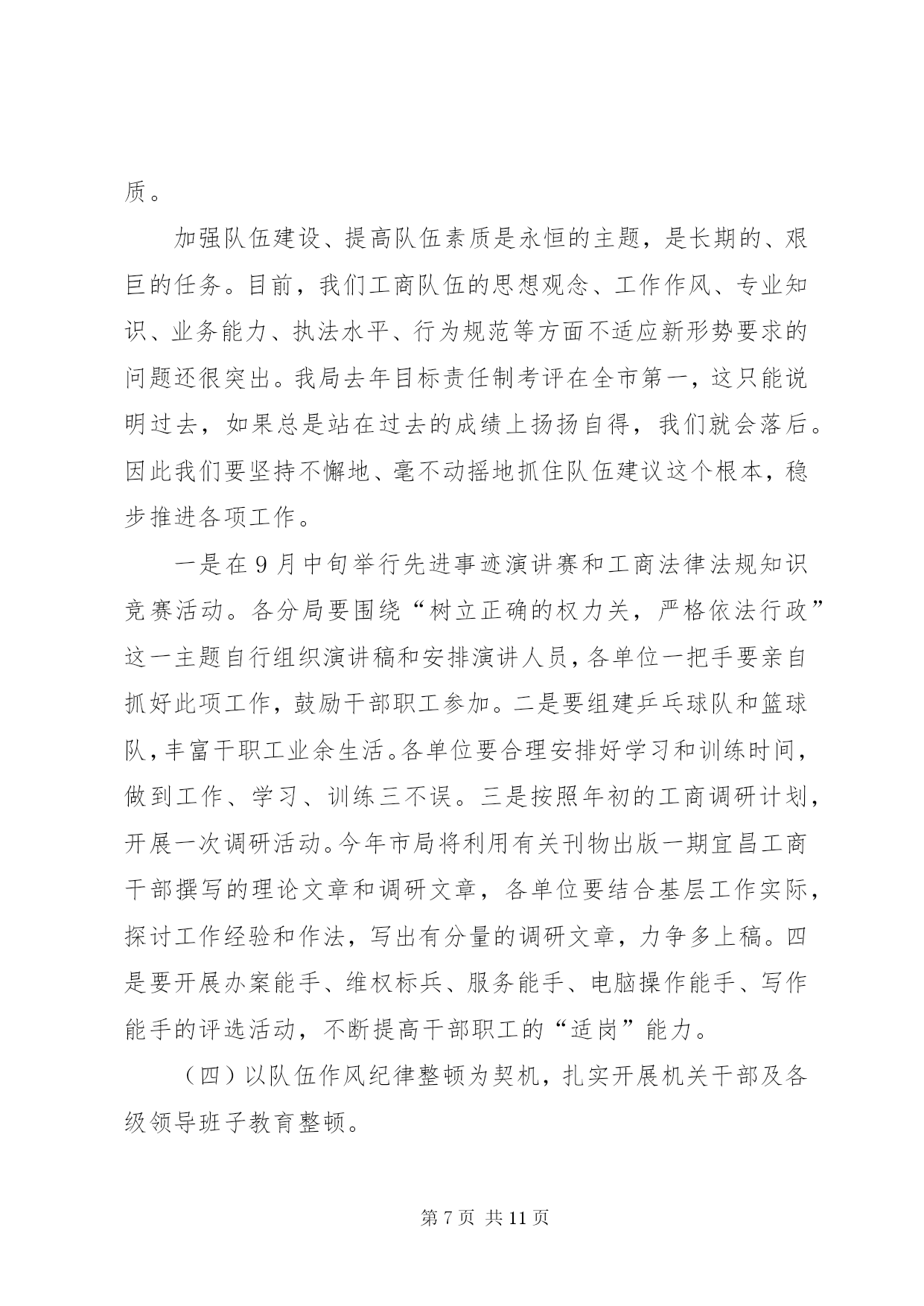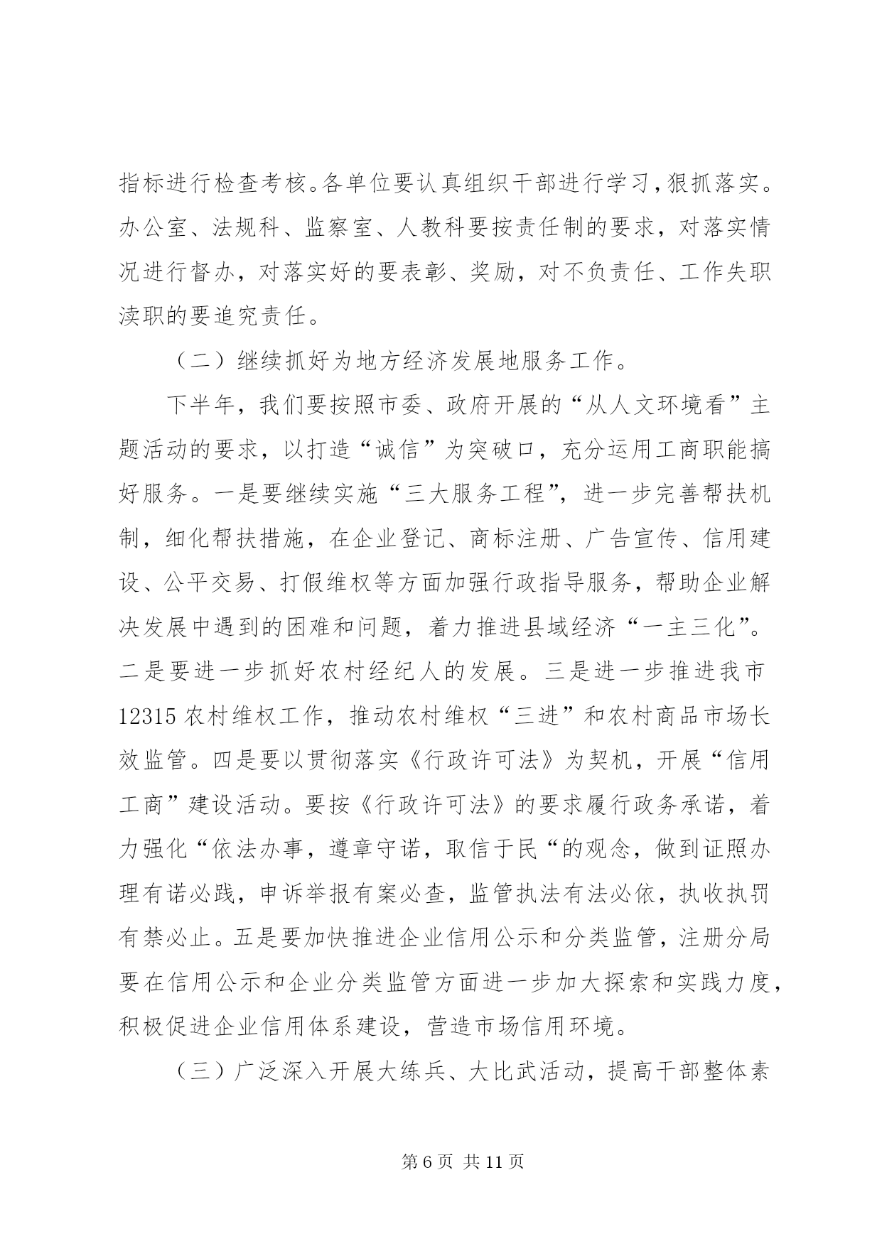 第PAGE\*Arabic\*MERGEFORMAT11页共NUMPAGES\*MERGEFORMAT11页市工商系统半年总结会议讲话同志们:这次会议主要是传达贯彻省、市工商局长会议精神,总结上半年的工作,安排部署下半年工作任务。下面,我讲几个方面的意见:一、充分肯定上半年工作成绩,认识存在的主要问题上半年,我局按照年初市局工作会议、3月份财务工作会议、4月份党风廉政建设工作会议的部署,紧紧围绕服务中心工作、拓宽监管领域、人事制度改革等主题,全面推进了各项工作,截至6月底,实现行政性收费314.5万元,完成全年预算480万元的66%;罚没款完成87.8万元,完成全年预算86万元的102%。(一)注重发展主题,服务地方经济发展有新思路。今年以来,我局凸显服务发展主题,在优化登记服务、延展商标服务、拓宽消费维权、积极培育市场上进一步优化服务举措,大力实施市场主体“踏进门槛”时的亲情服务工程、市场主体成长初期时的引导服务工程和市场主体发展壮大时的提升服务工程等“三大服务工程”,有力地促进了地方经济的发展,得到了市及两级政府的充分肯定。(二)注重工商职能,营造良好市场秩序有新举措。今年以来,我局进一步加强市场整治力度,探索长效监管机制,实现了监管关口前移。半年查处案件437件,其中一般程序案件157件,万元以上案件15件。一是以强化农资市场整治力度为重点,严厉打击坑农害农行为。截至目前,全市工商系统查处了15起销售过期农药、假冒磷肥等涉农案件,查扣伪劣种子62袋,销毁过期和失效变质农药520件(瓶),涉案金额190万元。二是以实施“食品药品放心工程”为重点,严厉打击制假售假违法行为。全局共抽查食品260批次,查处各类相关案件35件,查获违法水产品365公斤,肉制品500公斤,乳制品2200公斤,其它食品500多公斤。三是以实施“夏季风暴行动”为重点,深入开展反欺诈、反仿冒战役。我局对市超市有限公司等18家商店及服装超市利用广告虚假宣传、销售假冒名牌商品的行为进行了立案查处,涉案金额10余万元,查获假冒伪劣服装4200件。四是以实施《省合同监督条例》为重点,严厉打击合同欺诈行为。3月份,我局连续查处两起合同案件,有效促进了监管职能到位。(三)注重工作创新,积极探索监管方式改革有新突破。为了适应监管社会主义大市场的要求,真正实现监管职能到位,我局进一步解放思想、更新观念,不断推进工商行政管理工作的改革和创新。一是加大力度,实施非工作时段市场巡查效果明显。今年,我局制定出台了《非工作时段市场巡查办法》,促进了监管职能到位。通过非工作时段巡查共查办案件364件,规范经营行为423起,取缔无照经营156起,补收各种规费20余万元,现场调处消费者投诉215件,查处虚假广告182件。二是创新举措,农村维权网络延伸到田间地头。今年,我局加大了农村维权工作的力度,启动了农村维权网络,把12315维权工作延伸到了田间地头。目前,全市已建起了77个村级维权站,聘请了77名12315农村维权员,培训乡镇干部、村民200多人次。农村维权网络启动以来,已受理农村消费者投诉68件,为农民消费者挽回经济损失26.8万元。三是积极探索,推行退出市场主体后延监管。今年以来,我局以推行退出市场主体相关单位告知制、信息提示制、回查制、法定代表人及投资人备案制、网上公示制“五项制度”为抓手,强化对市场主体的全过程监管。目前,已建立1800个退出市场主体的电子档案,对退出市场的51家主体进行了回查,查处15家违法经营主体,对其中1541个退出的市场主体名单进行了公示。(四)注重自身建设,队伍素质执法形象有新提升。今年,我局坚持抓党风廉政、抓禁令执行、抓执法监察、抓行为规范、抓业务培训、抓正反典型,促进了干部队伍的思想作风转变和业务素质的提高。一是围绕创建“服务零投诉、群众百满意”队伍的要求,推行“红、黄”牌管理制度,狠抓队伍素质的建设,提升了服务和监管工作的水平。二是量化人员责级考核,推进人事制度改革。通过完善原有岗位职责、制度规范、办事程序、政务公开等管理文件,从各个工作细节的标准化建设入手,以标准化促进规范化,提高整体监管水平和监管效能。三是强化亮点宣传,凸显部门形象。上半年,我局进一步加大了信息宣传力度,以《工商视线》专栏节目、工商行政管理简报和“红盾信息网”为载体,全方位宣传我局的亮点工作,确保亮点亮了起来。今年的农村维权网络建设、实施三大服务工程、非工作时段市场巡查等亮点工作都得到了上级的肯定。在充分肯定成绩的同时,我们也看到了存在的问题。一是没有很好履行市场监管执法职能,还存在不少薄弱环节,对市场监管的长效监管探讨不够,对重要商品的监管主动防控不足;二是目前队伍的思想观念、工作作风、方式方法和业务素质还不适应形势和任务的要求,违反各级禁令、