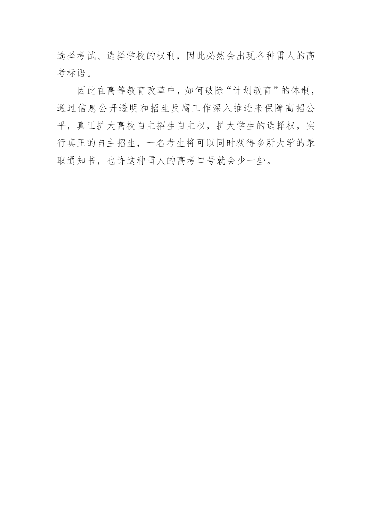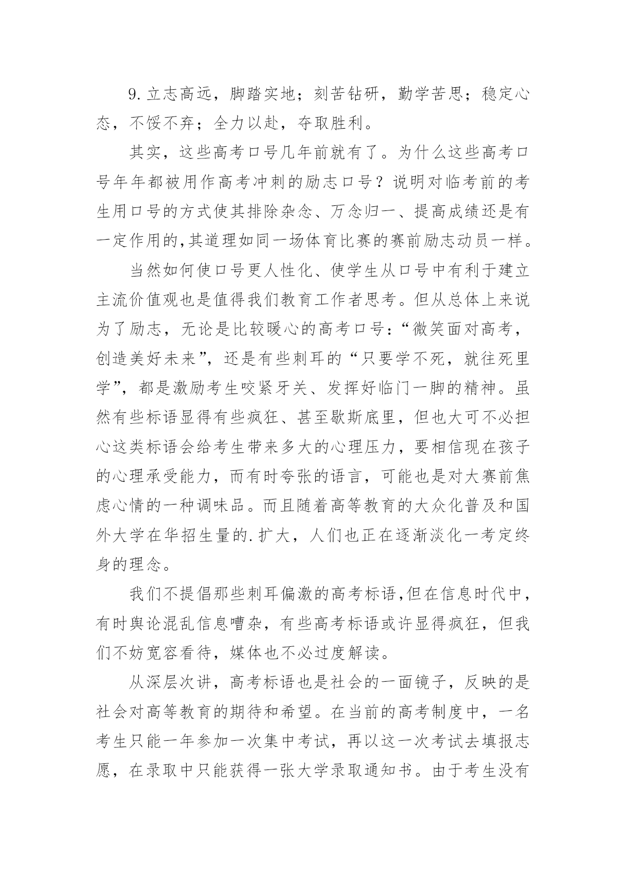 送给学生的高考励志标语送给学生的高考励志标语送给我班学生的高考标语广西霸气高考标语xx高考励志标语口号最牛xx高考励志标语高考考点宣传标语最狠高考标语xx高考在即,高考标语也成为了媒体的热点讨论对象。据5月24日新华网说,一些高三教室的“冲刺广告”,简直就可以用“疯狂”二字来形容,如广西桂北的高三教室里“励志”高考标语:“进清华,与主席总理称兄道弟;入北大,同大家巨匠论道谈经”,“怕吃苦莫入此门”,“扛得住给我扛,扛不住,给我死扛”,“就算撞得头破血流,也要冲进一本线大楼”,“不比智力比努力,不比起点比进步”,等等。1.严守考纪沉着镇静上考场,认真细致满怀信心创佳绩。2.审清题目准确规范超常发挥,珍惜机遇成竹在胸金榜题名。3.我自信,故我成功;我行,我一定能行。4.对待试题:冷静、乐观,对待考试:认真、自信。5.十年寒暑搏激流,千回万转争上游;龙门一跃天地宽,翱翔蓝天呈自由。6.十年一剑、征战在即;正中勇士、拼搏雄起;沉着冷静、万勿大意;厚积薄发、创造神奇!7.今朝我以正中为荣,明日正中以我为耀。8.坚持平常心,营造好环境,扬起常笑脸,轻松迎高考。9.立志高远,脚踏实地;刻苦钻研,勤学苦思;稳定心态,不馁不弃;全力以赴,夺取胜利。其实,这些高考口号几年前就有了。为什么这些高考口号年年都被用作高考冲刺的励志口号?说明对临考前的考生用口号的方式使其排除杂念、万念归一、提高成绩还是有一定作用的,其道理如同一场体育比赛的赛前励志动员一样。当然如何使口号更人性化、使学生从口号中有利于建立主流价值观也是值得我们教育工作者思考。但从总体上来说为了励志,无论是比较暖心的高考口号:“微笑面对高考,创造美好未来”,还是有些刺耳的“只要学不死,就往死里学”,都是激励考生咬紧牙关、发挥好临门一脚的精神。虽然有些标语显得有些疯狂、甚至歇斯底里,但也大可不必担心这类标语会给考生带来多大的心理压力,要相信现在孩子的心理承受能力,而有时夸张的语言,可能也是对大赛前焦虑心情的一种调味品。而且随着高等教育的大众化普及和国外大学在华招生量的.扩大,人们也正在逐渐淡化一考定终身的理念。我们不提倡那些刺耳偏激的高考标语,但在信息时代中,有时舆论混乱信息嘈杂,有些高考标语或许显得疯狂,但我们不妨宽容看待,媒体也不必过度解读。从深层次讲,高考标语也是社会的一面镜子,反映的是社会对高等教育的期待和希望。在当前的高考制度中,一名考生只能一年参加一次集中考试,再以这一次考试去填报志愿,在录取中只能获得一张大学录取通知书。由于考生没有选择考试、选择学校的权利,因此必然会出现各种雷人的高考标语。因此在高等教育改革中,如何破除“计划教育”的体制,通过信息公开透明和招生反腐工作深入推进来保障高招公平,真正扩大高校自主招生自主权,扩大学生的选择权,实行真正的自主招生,一名考生将可以同时获得多所大学的录取通知书,也许这种雷人的高考口号就会少一些。