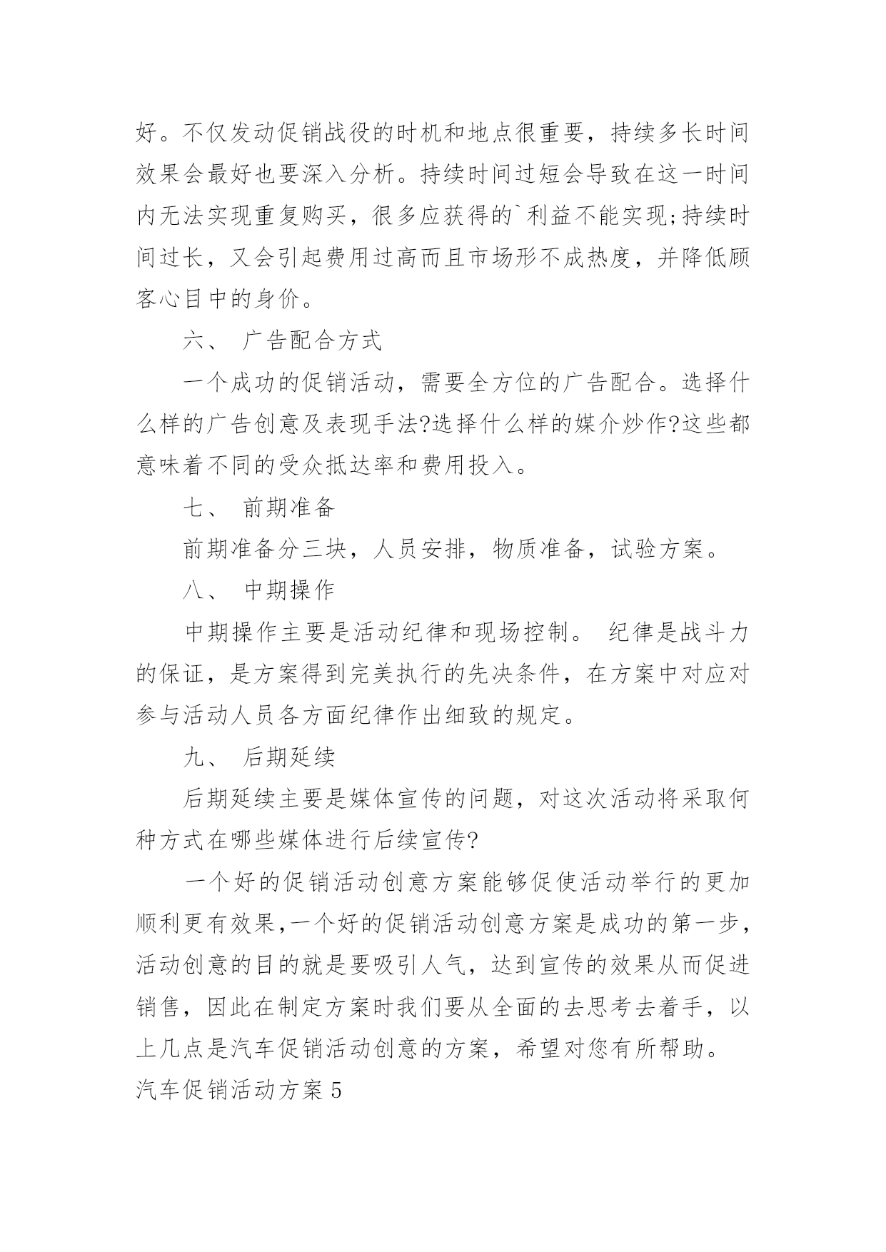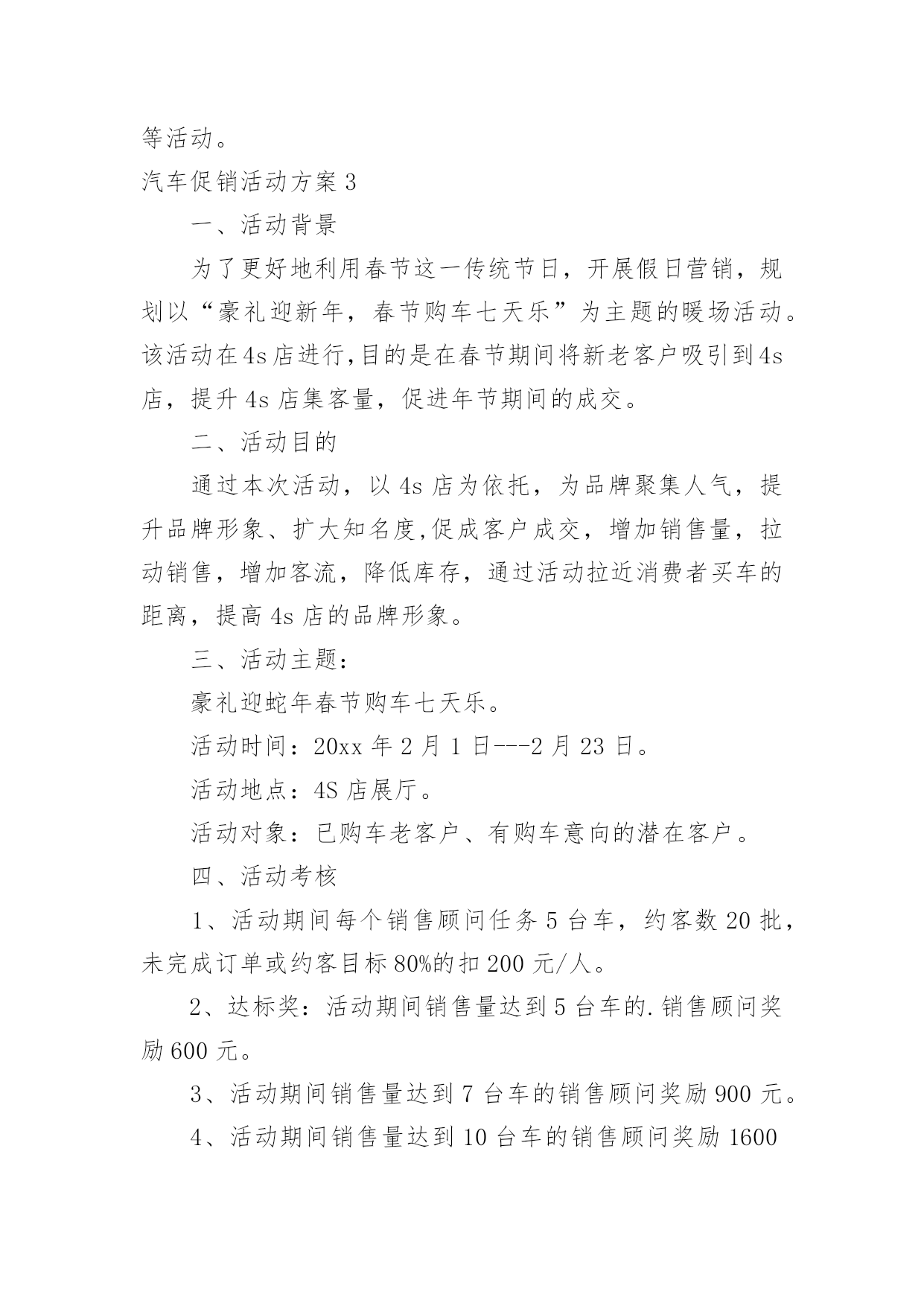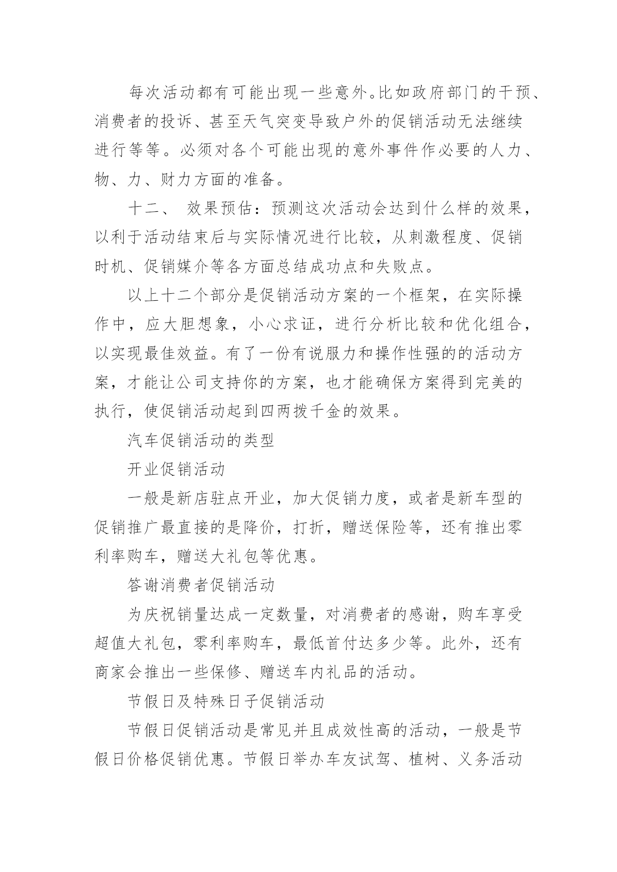 汽车促销活动方案汽车促销活动方案15篇为了保障事情或工作顺利、圆满进行,时常需要预先开展方案准备工作,方案可以对一个行动明确一个大概的方向。怎样写方案才更能起到其作用呢?以下是小编帮大家整理的汽车促销活动方案,希望对大家有所帮助。汽车促销活动方案1活动主题:龙年买车,尊享保险一条龙服务活动地点:公司各点活动时间:年4至8月份活动对象:凡活动期间在我公司各点购车并在我公司购买保险的`客户活动内容:1.凡购买荣光、之光、新之光系列车型(除特价车外)的客户,在我公司购买保险的客户,购交强险立减元;购商业险,低于4000元,送驾驶员意外险一份;购商业险,高于4000元,送驾驶员意外险和玻璃单独破碎险各一份。2.凡购买宏光商务车(除特价车外)的客户,在我公司购买保险的客户,购交强险费用全免;购商业险,低于4000元,送驾驶员意外险一份;购商业险,高于4000元,送驾驶员意外险和玻璃单独破碎险各一份。汽车促销活动方案2一:活动目的:开展活动的目的是处理库存产品?是提高销售?还是宣传推广?只有明确了明的,才能使活动有的放矢。二、活动对象:活动针对的是目标市场的每一个人还是某一特定群体?活动控制在范围多大内?哪些人是促销的主要目标?哪些人是促销的次要目标?这些选择的正确与否会直接影响到促销的最终效果。三、活动主题:主要是为促销?宣传?还是答谢消费者?四、活动方式:这一部分主要阐述活动开展的具体方式。有两个问题要重点考虑:确定人群和确定刺激程度。五、活动时间和地点:促销活动的时间和地点选择得当会事半功倍,选择不当则会费力不讨好。在时间上尽量让消费者有空闲参与,在地点上也要让消费者方便,而且要事前与城管、工商等部门沟通好。不仅发动促销战役的时机和地点很重要,持续多长时间效果会最好也要深入分析。持续时间过短会导致在这一时间内无法实现重复购买,很多应获得的利益不能实现;持续时间过长,又会引起费用过高而且市场形不成热度,并降低顾客心目中的身价。六、广告配合方式:一个成功的促销活动,需要全方位的广告配合。选择什么样的广告创意及表现手法?选择什么样的.媒介炒作?这些都意味着不同的受众抵达率和费用投入。七、前期准备:前期准备分三块,人员安排,物质准备,试验方案。八、中期操作:中期操作主要是活动纪律和现场控制。纪律是战斗力的保证,是方案得到完美执行的先决条件,在方案中对应对参与活动人员各方面纪律作出细致的规定。九、后期延续:后期延续主要是媒体宣传的问题,对这次活动将采取何种方式在哪些媒体进行后续宣传?脑白金在这方面是高手,即使一个不怎么样成功的促销活动也会在媒体上炒得盛况空前。十、费用预算:没有利益就没有存在的意义。对促销活动的费用投入和产出应作出预算。当年爱多VCD的“阳光行动B计划”以失败告终的原因就在于没有在费用方面进行预算,直到活动开展后,才发现这个计划公司根本没有财力支撑。一个好的促销活动,仅靠一个好的点子是不够的。十一、意外防范:每次活动都有可能出现一些意外。比如政府部门的干预、消费者的投诉、甚至天气突变导致户外的促销活动无法继续进行等等。必须对各个可能出现的意外事件作必要的人力、物、力、财力方面的准备。十二、效果预估:预测这次活动会达到什么样的效果,以利于活动结束后与实际情况进行比较,从刺激程度、促销时机、促销媒介等各方面总结成功点和失败点。以上十二个部分是促销活动方案的一个框架,在实际操作中,应大胆想象,小心求证,进行分析比较和优化组合,以实现最佳效益。有了一份有说服力和操作性强的的活动方案,才能让公司支持你的方案,也才能确保方案得到完美的执行,使促销活动起到四两拨千金的效果。汽车促销活动的类型开业促销活动一般是新店驻点开业,加大促销力度,或者是新车型的促销推广最直接的是降价,打折,赠送保险等,还有推出零利率购车,赠送大礼包等优惠。答谢消费者促销活动为庆祝销量达成一定数量,对消费者的感谢,购车享受超值大礼包,零利率购车,最低首付达多少等。此外,还有商家会推出一些保修、赠送车内礼品的活动。节假日及特殊日子促销活动节假日促销活动是常见并且成效性高的活动,一般是节假日价格促销优惠。节假日举办车友试驾、植树、义务活动等活动。汽车促销活动方案3一、活动背景为了更好地利用春节这一传统节日,开展假日营销,规划以“豪礼迎新年,春节购车七天乐”为主题的暖场活动。该活动在4s店进行,目的是在春节期间将新老客户吸引到4s店,提升4s店集客量,促进年节期间的成交。二、活动目的通过本次活动,以4s店为依托,为品牌聚集人气,提升品牌形象、扩大知名度,促成客户成交,增加销售量,拉动销售,增加客流,降低库存,通过活动拉近消费者买车的距离,提高4s店的品牌形象。三、活动主题:豪礼迎蛇年春节购车七天乐。活动时间:20xx年2月1日---2月23日。活动地点:4S店展厅。活动对