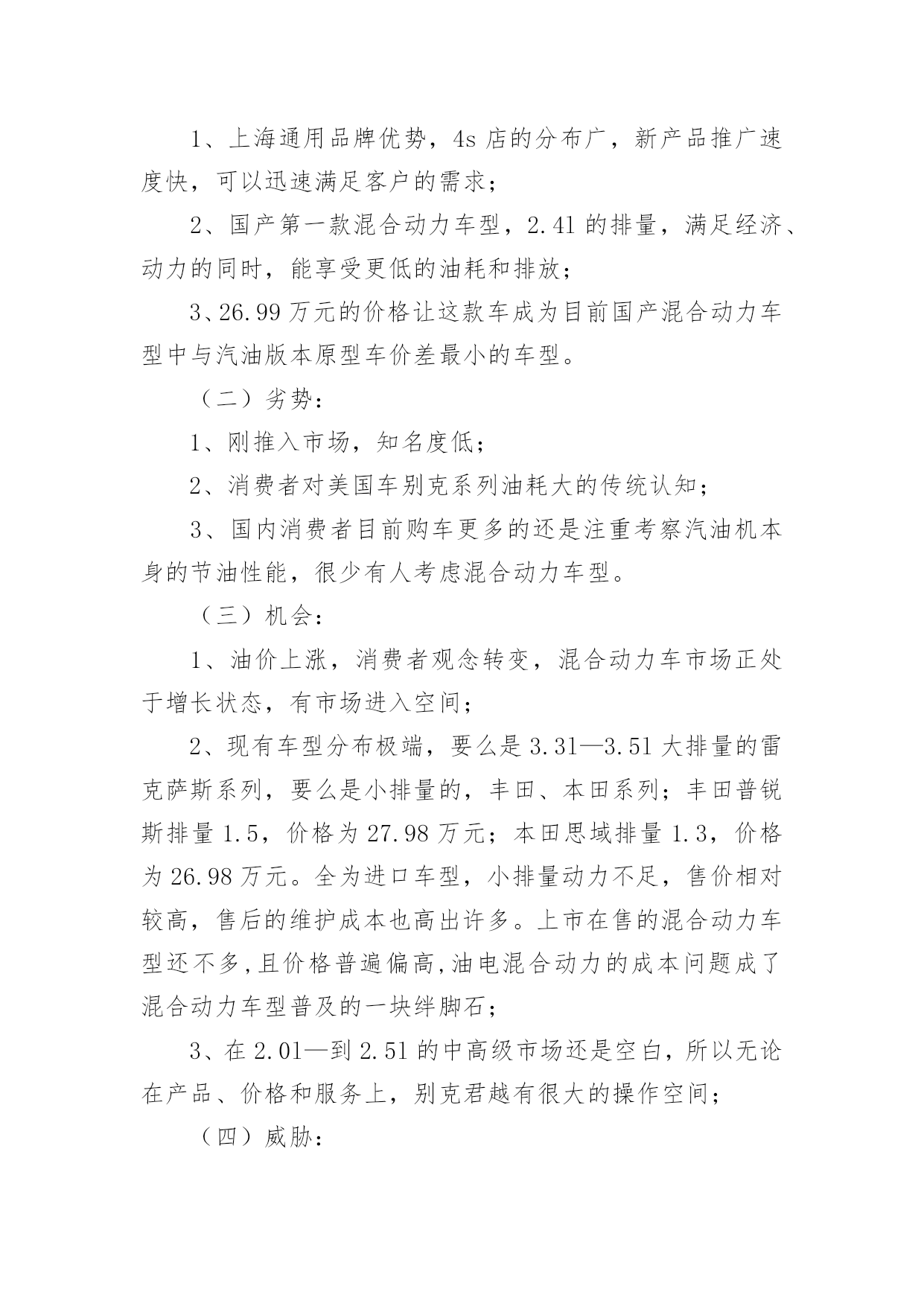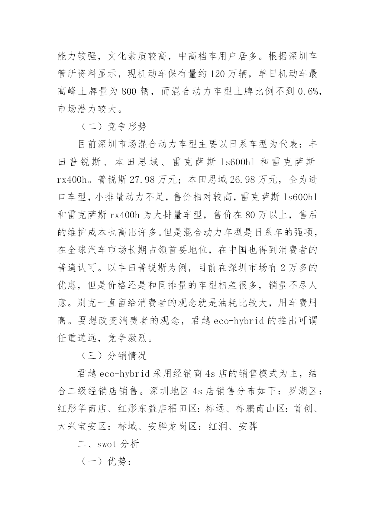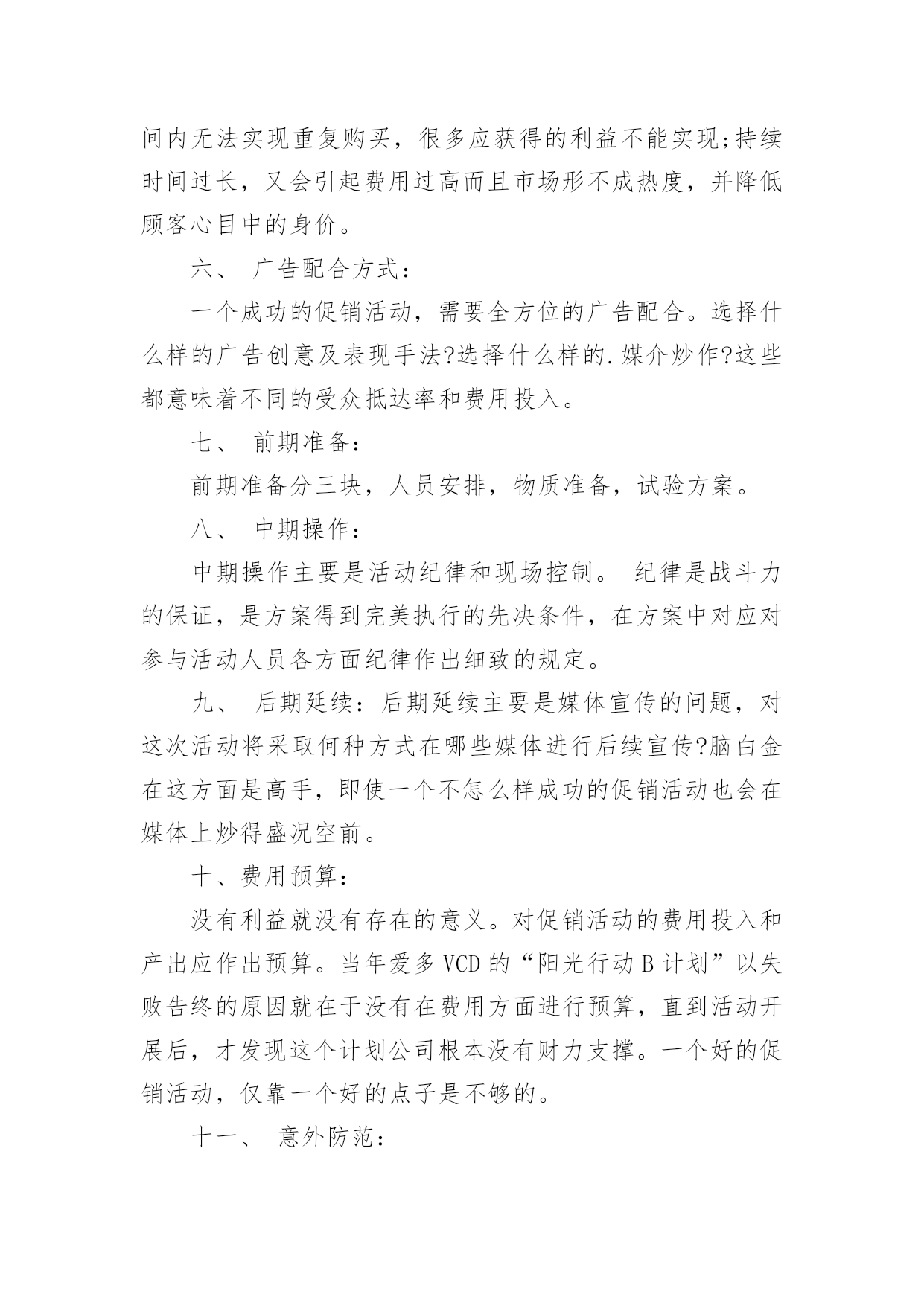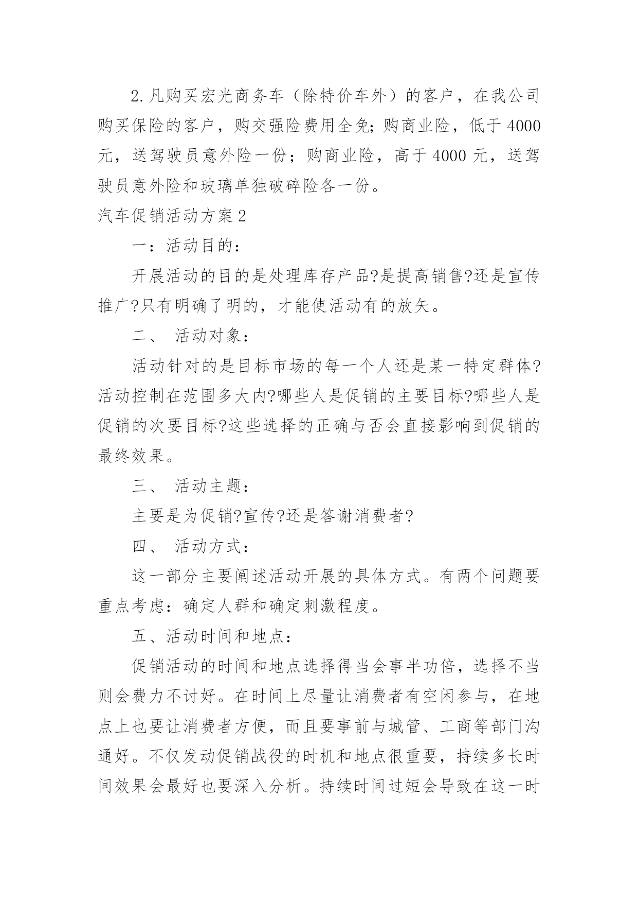 汽车促销活动方案汽车促销活动方案15篇为了保障事情或工作顺利、圆满进行,时常需要预先开展方案准备工作,方案可以对一个行动明确一个大概的方向。怎样写方案才更能起到其作用呢?以下是小编帮大家整理的汽车促销活动方案,希望对大家有所帮助。汽车促销活动方案1活动主题:龙年买车,尊享保险一条龙服务活动地点:公司各点活动时间:年4至8月份活动对象:凡活动期间在我公司各点购车并在我公司购买保险的`客户活动内容:1.凡购买荣光、之光、新之光系列车型(除特价车外)的客户,在我公司购买保险的客户,购交强险立减元;购商业险,低于4000元,送驾驶员意外险一份;购商业险,高于4000元,送驾驶员意外险和玻璃单独破碎险各一份。2.凡购买宏光商务车(除特价车外)的客户,在我公司购买保险的客户,购交强险费用全免;购商业险,低于4000元,送驾驶员意外险一份;购商业险,高于4000元,送驾驶员意外险和玻璃单独破碎险各一份。汽车促销活动方案2一:活动目的:开展活动的目的是处理库存产品?是提高销售?还是宣传推广?只有明确了明的,才能使活动有的放矢。二、活动对象:活动针对的是目标市场的每一个人还是某一特定群体?活动控制在范围多大内?哪些人是促销的主要目标?哪些人是促销的次要目标?这些选择的正确与否会直接影响到促销的最终效果。三、活动主题:主要是为促销?宣传?还是答谢消费者?四、活动方式:这一部分主要阐述活动开展的具体方式。有两个问题要重点考虑:确定人群和确定刺激程度。五、活动时间和地点:促销活动的时间和地点选择得当会事半功倍,选择不当则会费力不讨好。在时间上尽量让消费者有空闲参与,在地点上也要让消费者方便,而且要事前与城管、工商等部门沟通好。不仅发动促销战役的时机和地点很重要,持续多长时间效果会最好也要深入分析。持续时间过短会导致在这一时间内无法实现重复购买,很多应获得的利益不能实现;持续时间过长,又会引起费用过高而且市场形不成热度,并降低顾客心目中的身价。六、广告配合方式:一个成功的促销活动,需要全方位的广告配合。选择什么样的广告创意及表现手法?选择什么样的.媒介炒作?这些都意味着不同的受众抵达率和费用投入。七、前期准备:前期准备分三块,人员安排,物质准备,试验方案。八、中期操作:中期操作主要是活动纪律和现场控制。纪律是战斗力的保证,是方案得到完美执行的先决条件,在方案中对应对参与活动人员各方面纪律作出细致的规定。九、后期延续:后期延续主要是媒体宣传的问题,对这次活动将采取何种方式在哪些媒体进行后续宣传?脑白金在这方面是高手,即使一个不怎么样成功的促销活动也会在媒体上炒得盛况空前。十、费用预算:没有利益就没有存在的意义。对促销活动的费用投入和产出应作出预算。当年爱多VCD的“阳光行动B计划”以失败告终的原因就在于没有在费用方面进行预算,直到活动开展后,才发现这个计划公司根本没有财力支撑。一个好的促销活动,仅靠一个好的点子是不够的。十一、意外防范:每次活动都有可能出现一些意外。比如政府部门的干预、消费者的投诉、甚至天气突变导致户外的促销活动无法继续进行等等。必须对各个可能出现的意外事件作必要的人力、物、力、财力方面的准备。十二、效果预估:预测这次活动会达到什么样的效果,以利于活动结束后与实际情况进行比较,从刺激程度、促销时机、促销媒介等各方面总结成功点和失败点。以上十二个部分是促销活动方案的一个框架,在实际操作中,应大胆想象,小心求证,进行分析比较和优化组合,以实现最佳效益。有了一份有说服力和操作性强的的活动方案,才能让公司支持你的方案,也才能确保方案得到完美的执行,使促销活动起到四两拨千金的效果。汽车促销活动的类型开业促销活动一般是新店驻点开业,加大促销力度,或者是新车型的促销推广最直接的是降价,打折,赠送保险等,还有推出零利率购车,赠送大礼包等优惠。答谢消费者促销活动为庆祝销量达成一定数量,对消费者的感谢,购车享受超值大礼包,零利率购车,最低首付达多少等。此外,还有商家会推出一些保修、赠送车内礼品的活动。节假日及特殊日子促销活动节假日促销活动是常见并且成效性高的活动,一般是节假日价格促销优惠。节假日举办车友试驾、植树、义务活动等活动。汽车促销活动方案3一、活动背景为了更好地利用春节这一传统节日,开展假日营销,规划以“豪礼迎新年,春节购车七天乐”为主题的暖场活动。该活动在4s店进行,目的是在春节期间将新老客户吸引到4s店,提升4s店集客量,促进年节期间的成交。二、活动目的通过本次活动,以4s店为依托,为品牌聚集人气,提升品牌形象、扩大知名度,促成客户成交,增加销售量,拉动销售,增加客流,降低库存,通过活动拉近消费者买车的距离,提高4s店的品牌形象。三、活动主题:豪礼迎蛇年春节购车七天乐。活动时间:20xx年2月1日---2月23日。活动地点:4S店展厅。活动对