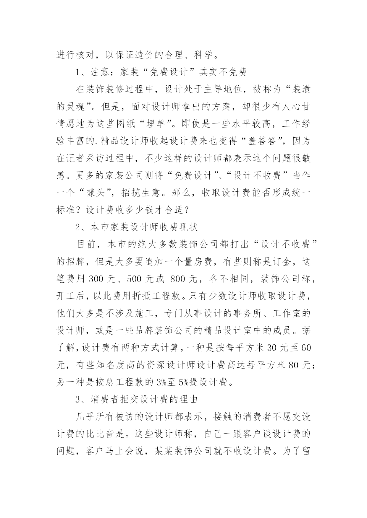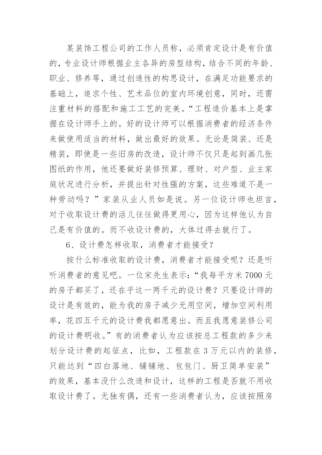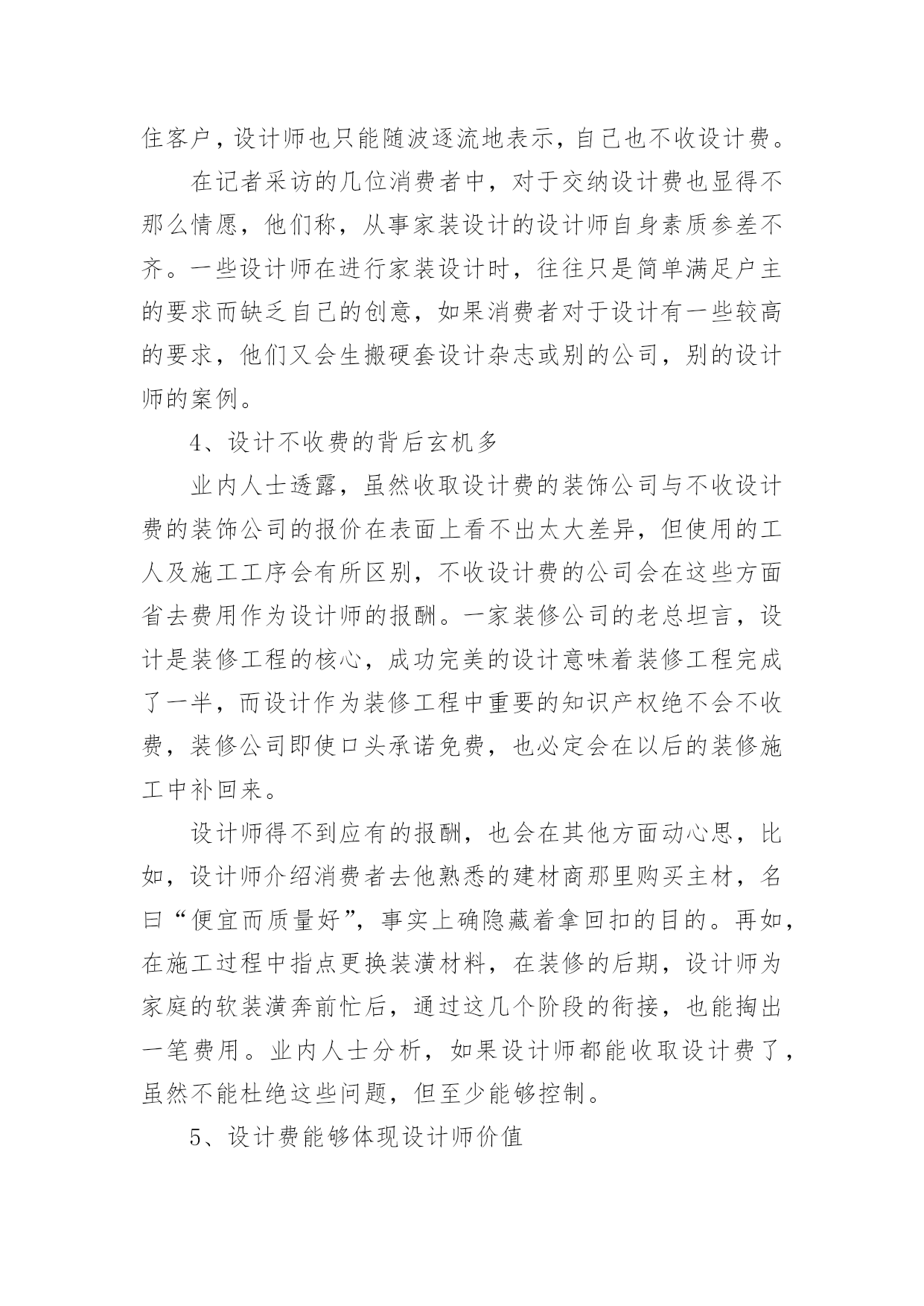 装修设计方案【精选】装修设计方案3篇为了确保事情或工作安全顺利进行,常常需要预先制定方案,方案是书面计划,是具体行动实施办法细则,步骤等。我们应该怎么制定方案呢?下面是小编为大家整理的装修设计方案3篇,欢迎大家借鉴与参考,希望对大家有所帮助。装修设计方案篇1"家庭装修设计要以方案设计的形式,形成一整套的设计文件。家庭装修房主通过对方案设计的审查,最后确定家庭装修的用材、施工方法及达到的标准。因此,家庭装修方案设计重点审查以下内容:(1)图纸的审查:除审核平面设计图外,还应重点审核施工图,考察其设计尺寸及作法是否符合家庭房间的尺寸,各立面的装修是否符合家庭的要求,各装饰工程子项目的设计是否规范,并符合家庭的要求,如有出入,应做进一步的修改。(2)作法说明的审查:这是方案设计的重点,也是审查的主要内容。应就各装饰部位的用材用料的规格、型号、品牌、材质、质量标准等进行审核。对各装饰面的装修作法、构造、紧固方式等是否符合国家有关的施工规范,应参照国家有关标准逐项进行审核。(3)工程造价的审查:这也是家庭装饰方案设计的重点,应该对每项子项目所用材料的数量、单价、人工费用等进行核对,以保证造价的合理、科学。1、注意:家装“免费设计”其实不免费在装饰装修过程中,设计处于主导地位,被称为“装潢的灵魂”。但是,面对设计师拿出的方案,却很少有人心甘情愿地为这些图纸“埋单”。即使是一些水平较高,工作经验丰富的.精品设计师收起设计费来也变得“羞答答”,因为在记者采访过程中,不少这样的设计师都表示这个问题很敏感。更多的家装公司则将“免费设计”、“设计不收费”当作一个“噱头”,招揽生意。那么,收取设计费能否形成统一标准?设计费收多少钱才合适?2、本市家装设计师收费现状目前,本市的绝大多数装饰公司都打出“设计不收费”的招牌,但是大多要追加一个量房费,有些则称是订金,这笔费用300元、500元或800元,各不相同,装饰公司称,开工后,以此费用折抵工程款。只有少数设计师收取设计费,他们大多是不涉及施工,专门从事设计的事务所、工作室的设计师,或是一些品牌装饰公司的精品设计室中的成员。据了解,设计费有两种方式计算,一种是按每平方米30元至60元,有些知名度高的资深设计师设计费高达每平方米80元;另一种是按总工程款的3%至5%提设计费。3、消费者拒交设计费的理由几乎所有被访的设计师都表示,接触的消费者不愿交设计费的比比皆是。这些设计师称,自己一跟客户谈设计费的问题,客户马上会说,某某装饰公司就不收设计费。为了留住客户,设计师也只能随波逐流地表示,自己也不收设计费。在记者采访的几位消费者中,对于交纳设计费也显得不那么情愿,他们称,从事家装设计的设计师自身素质参差不齐。一些设计师在进行家装设计时,往往只是简单满足户主的要求而缺乏自己的创意,如果消费者对于设计有一些较高的要求,他们又会生搬硬套设计杂志或别的公司,别的设计师的案例。4、设计不收费的背后玄机多业内人士透露,虽然收取设计费的装饰公司与不收设计费的装饰公司的报价在表面上看不出太大差异,但使用的工人及施工工序会有所区别,不收设计费的公司会在这些方面省去费用作为设计师的报酬。一家装修公司的老总坦言,设计是装修工程的核心,成功完美的设计意味着装修工程完成了一半,而设计作为装修工程中重要的知识产权绝不会不收费,装修公司即使口头承诺免费,也必定会在以后的装修施工中补回来。设计师得不到应有的报酬,也会在其他方面动心思,比如,设计师介绍消费者去他熟悉的建材商那里购买主材,名曰“便宜而质量好”,事实上确隐藏着拿回扣的目的。再如,在施工过程中指点更换装潢材料,在装修的后期,设计师为家庭的软装潢奔前忙后,通过这几个阶段的衔接,也能掏出一笔费用。业内人士分析,如果设计师都能收取设计费了,虽然不能杜绝这些问题,但至少能够控制。5、设计费能够体现设计师价值某装饰工程公司的工作人员称,必须肯定设计是有价值的,专业设计师根据业主各异的房型结构,结合不同的年龄、职业、修养等,通过创造性的构思设计,在满足功能要求的基础上,追求个性、艺术品位的室内环境创意,同时,还需注重材料的搭配和施工工艺的完美。“工程造价基本上是掌握在设计师手上的。好的设计师可以根据消费者的经济条件来做使用适当的材料,做出最好的效果。无论是简装、还是精装,即使是一些旧房的改造,设计师不仅只是起到画几张图纸的作用,他还要做好装修预算、理财、对户型、业主家庭状况进行分析,并提出针对性强的方案,这些难道不是一种劳动吗?”家装从业人员如是说。另一位设计师也坦言,对于收取设计费的活儿往往做得更用心,因为这样他认为自己是有价值的。而不收设计费的,大体过得去就行了。6、设计费怎样收取,消费者才能接受?按什么标准收取的设计费,消费者才能接受呢?还是听听消费者的意见吧。一位宋先生表示:“我每