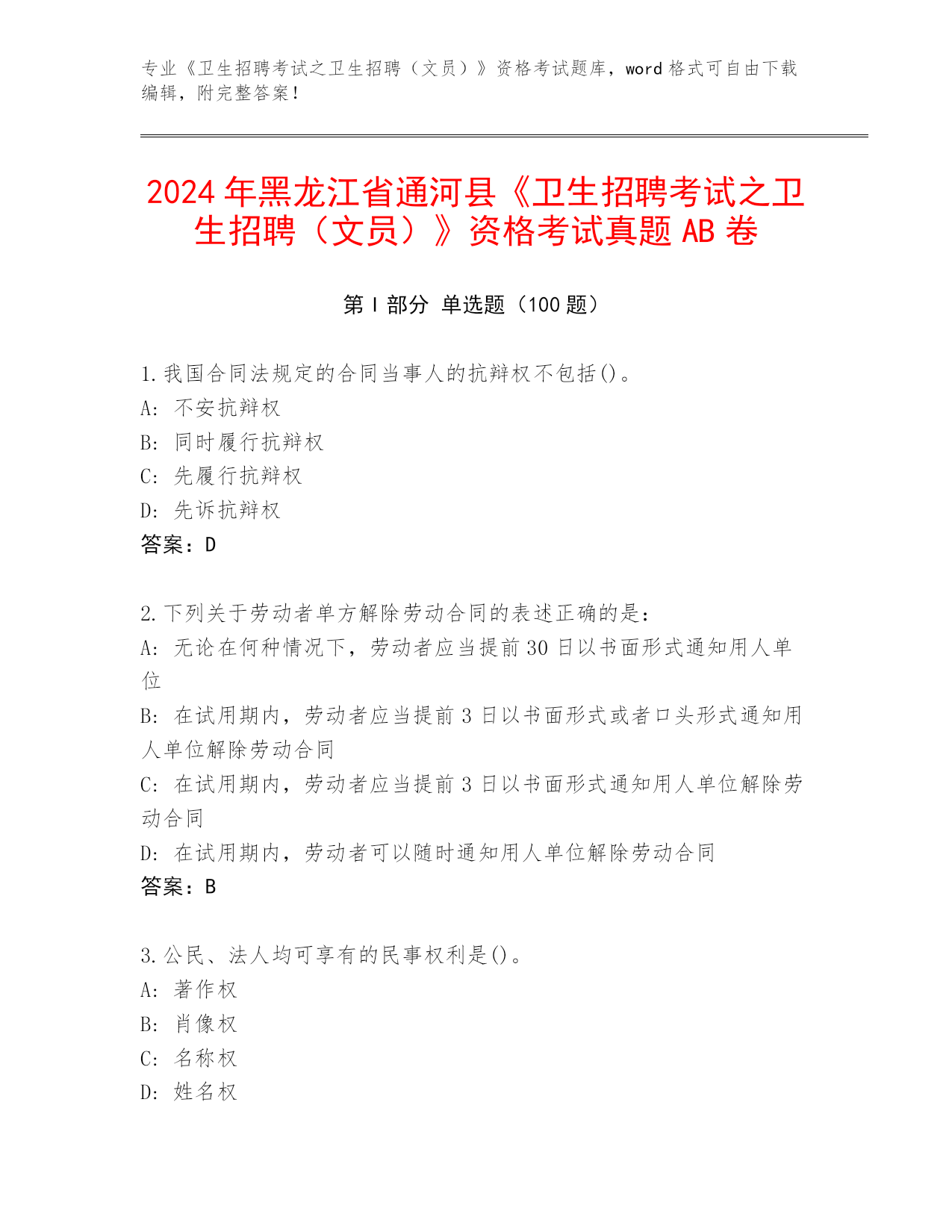 2024年黑龙江省通河县《卫生招聘考试之卫生招聘(文员)》资格考试真题AB卷