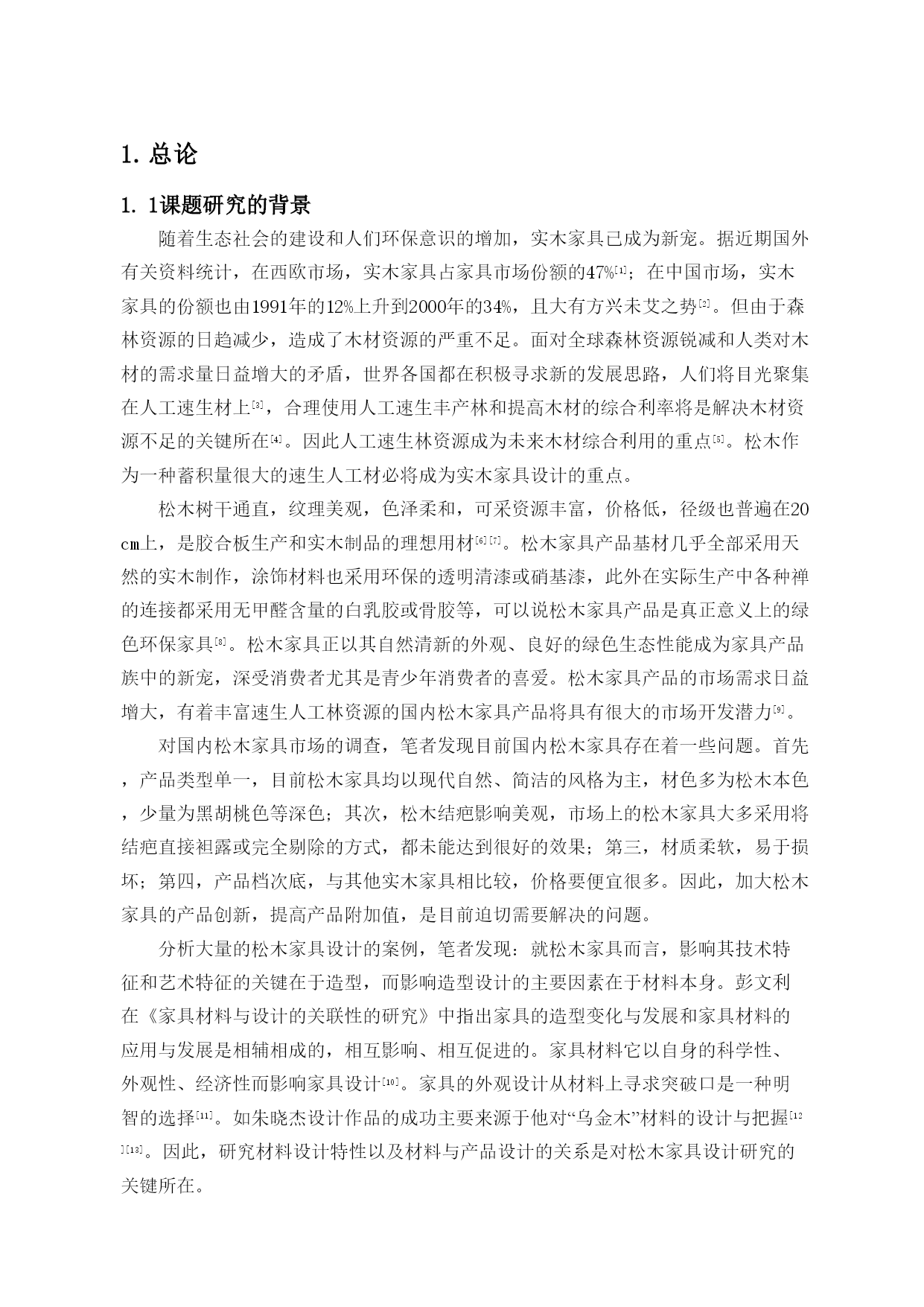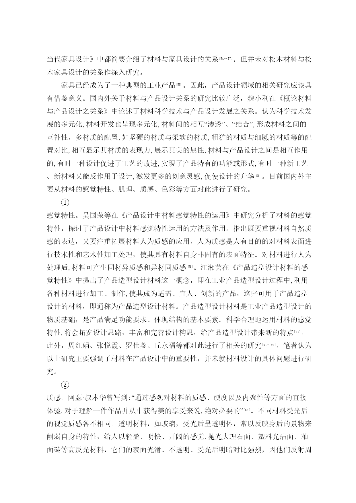 中南大学研究生学位论文文献综述研究课题基于材料外观属性的松木家具造型设计研究研究生姓名年级2006级学科、专业木材科学与技术攻读学位硕士导师姓名学院环境艺术设计学院论文工作的起止时间2008年3月至2009年6月2008年04月26日总论1课题研究的背景随着生态社会的建设和人们环保意识的增加,实木家具已成为新宠。据近期国外有关资料统计,在西欧市场,实木家具占家具市场份额的47%[1];在中国市场,实木家具的份额也由1991年的12%上升到2000年的34%,且大有方兴未艾之势[2]。但由于森林资源的日趋减少,造成了木材资源的严重不足。面对全球森林资源锐减和人类对木材的需求量日益增大的矛盾,世界各国都在积极寻求新的发展思路,人们将目光聚集在人工速生材上[3],合理使用人工速生丰产林和提高木材的综合利率将是解决木材资源不足的关键所在[4]。因此人工速生林资源成为未来木材综合利用的重点[5]。松木作为一种蓄积量很大的速生人工材必将成为实木家具设计的重点。松木树干通直,纹理美观,色泽柔和,可采资源丰富,价格低,径级也普遍在20cm上,是胶合板生产和实木制品的理想用材[6][7]。松木家具产品基材几乎全部采用天然的实木制作,涂饰材料也采用环保的透明清漆或硝基漆,此外在实际生产中各种禅的连接都采用无甲醛含量的白乳胶或骨胶等,可以说松木家具产品是真正意义上的绿色环保家具[8]。松木家具正以其自然清新的外观、良好的绿色生态性能成为家具产品族中的新宠,深受消费者尤其是青少年消费者的喜爱。松木家具产品的市场需求日益增大,有着丰富速生人工林资源的国内松木家具产品将具有很大的市场开发潜力[9]。对国内松木家具市场的调查,笔者发现目前国内松木家具存在着一些问题。首先,产品类型单一,目前松木家具均以现代自然、简洁的风格为主,材色多为松木本色,少量为黑胡桃色等深色;其次,松木结疤影响美观,市场上的松木家具大多采用将结疤直接袒露或完全剔除的方式,都未能达到很好的效果;第三,材质柔软,易于损坏;第四,产品档次底,与其他实木家具相比较,价格要便宜很多。因此,加大松木家具的产品创新,提高产品附加值,是目前迫切需要解决的问题。分析大量的松木家具设计的案例,笔者发现:就松木家具而言,影响其技术特征和艺术特征的关键在于造型,而影响造型设计的主要因素在于材料本身。彭文利在《HYPERLINK家具材料与设计的关联性的研究》中指出家具的造型变化与发展和家具材料的应用与发展是相辅相成的,相互影响、相互促进的。家具材料它以自身的科学性、外观性、经济性而影响家具设计[10]。家具的外观设计从材料上寻求突破口是一种明智的选择[11]。如朱晓杰设计作品的成功主要来源于他对“乌金木”材料的设计与把握[12][13]。因此,研究材料设计特性以及材料与产品设计的关系是对松木家具设计研究的关键所在。目前,国内外关于松木家具设计进行了一些研究,其中刘文金《松木家具产品设计技术》和《松木家具制造中的几项关键工艺技术》,李素瑕等《国内松木家具市场研究》,柳献忠《松木家具硝基漆涂饰工艺分析》,苟文元《浅谈松木家具的涂装》,李素瑕《松木家具框架节点接合强度性能研究》等。这些研究多是集中在松木家具的生产技术上,且没有将这些研究与实际的产品相结合,更没有从材料的外观属性上特别是肌理特性上来探讨松木家具设计。本课题正是基于目前松木家具的市场前景以及所面临的问题而提出来的。从松木家具材料的特性出发,探讨材料与产品设计的关系,并结合已有的材料基础知识,对材料的外观属性进行研究,以求设计出具有高附加值的和高品质的松木家具。这对于提高松木的综合利用率,开发松木家具产品新类型,提升松木家具的附加值和市场前景都具有重要的意义。本课题将以马尾松为研究对象,从材料外观属性出发,结合相关的基础理论知识,分析目前松木家具设计现状,探讨松木家具造型设计的新方法。具体研究内容如下:分析松木材料的外观属性,总结目前松木家具设计中运用外观属性进行设计的规律和存在的主要问题。包括:目前松木家具中材料色彩的处理方法和存在的问题;目前松木家具中材料肌理的处理方法和存在的问题;目前松木家具中材料质感的处理方法和存在的问题;目前松木家具中材料纹理的处理方法和存在的问题。分析松木材料的外观属性(包括色彩、质感、肌理等),从提高产品附加值入手,探讨改变松木材料外观属性的方法。包括:分析松木的色彩特性,探讨改变色彩的方法;分析松木的肌理特性,探讨改变肌理的方法;分析松木的质感特性,探讨改变质感的方法;分析松木的纹理特性,探讨改变纹理的方法。通过实验,设计和验证改变松木材料外观属性的具体方法。包括:采用天然染料进行染色的实验;对材料表面进行刮筋处理的实验;将松木与